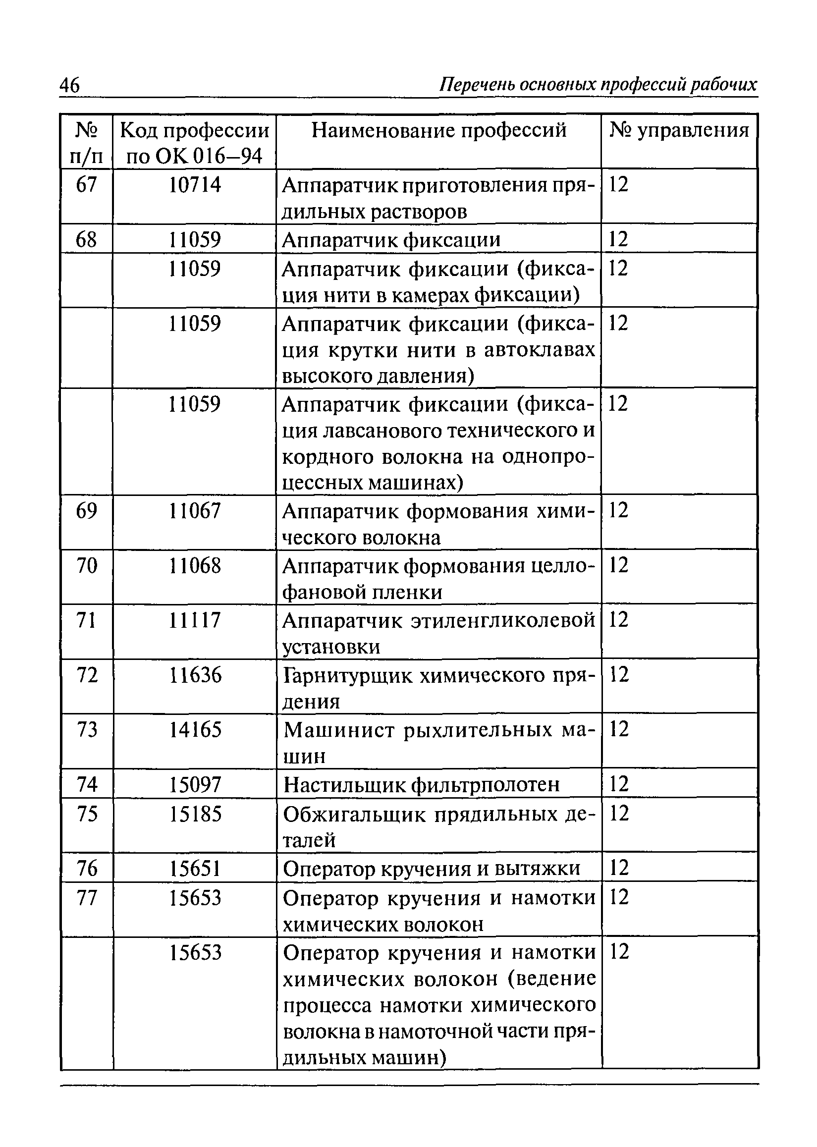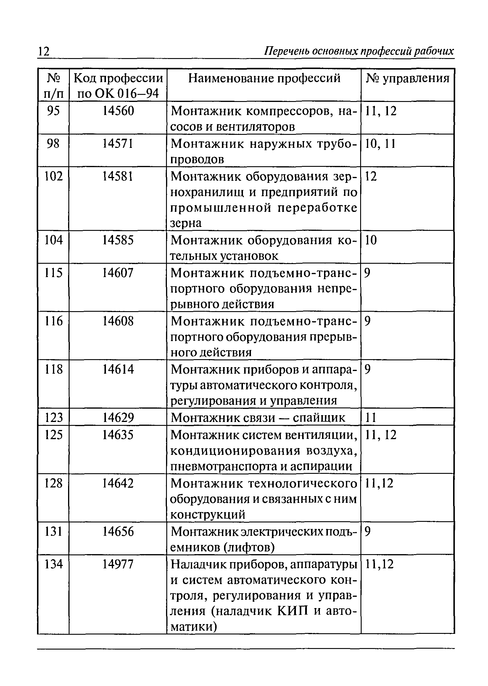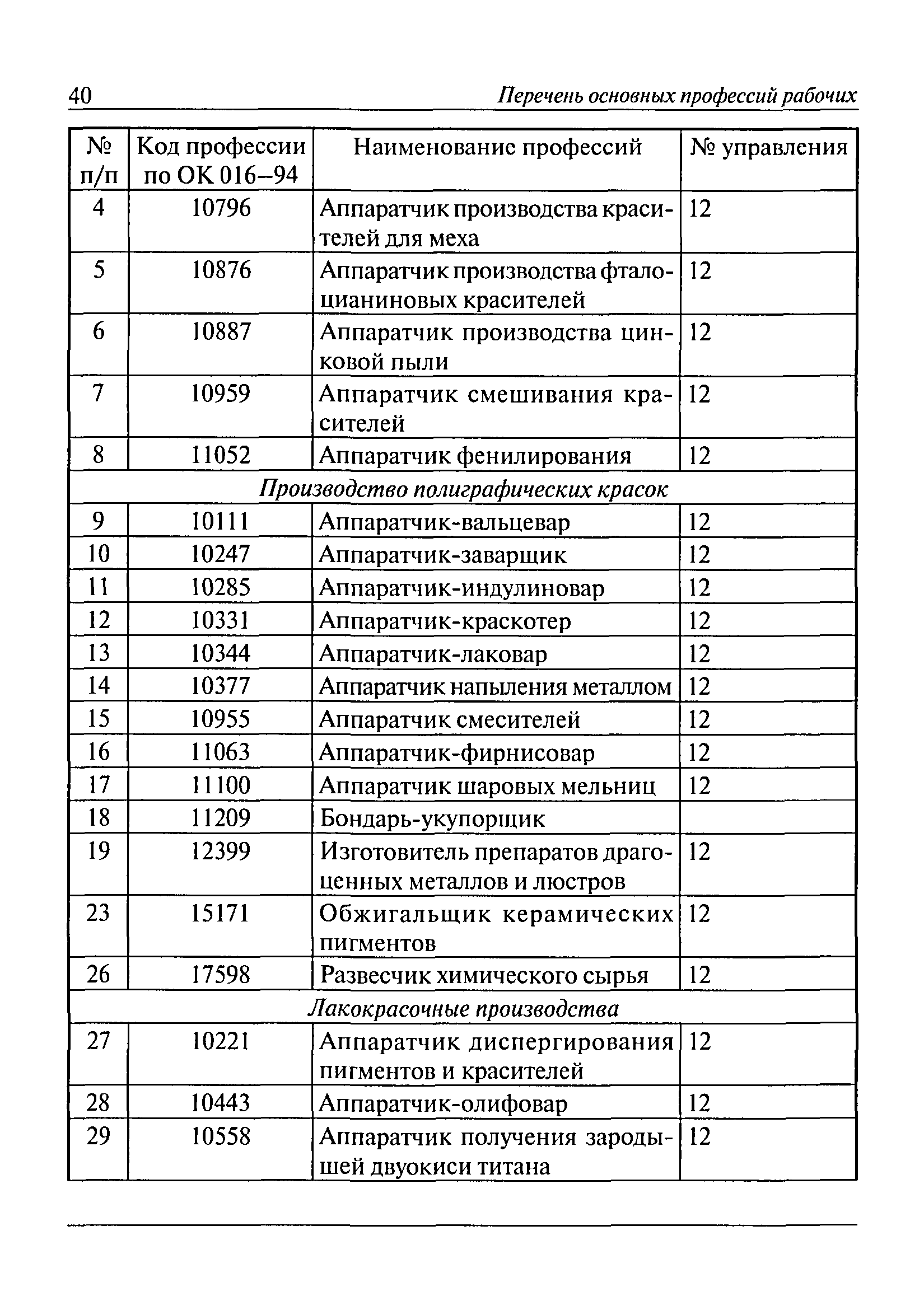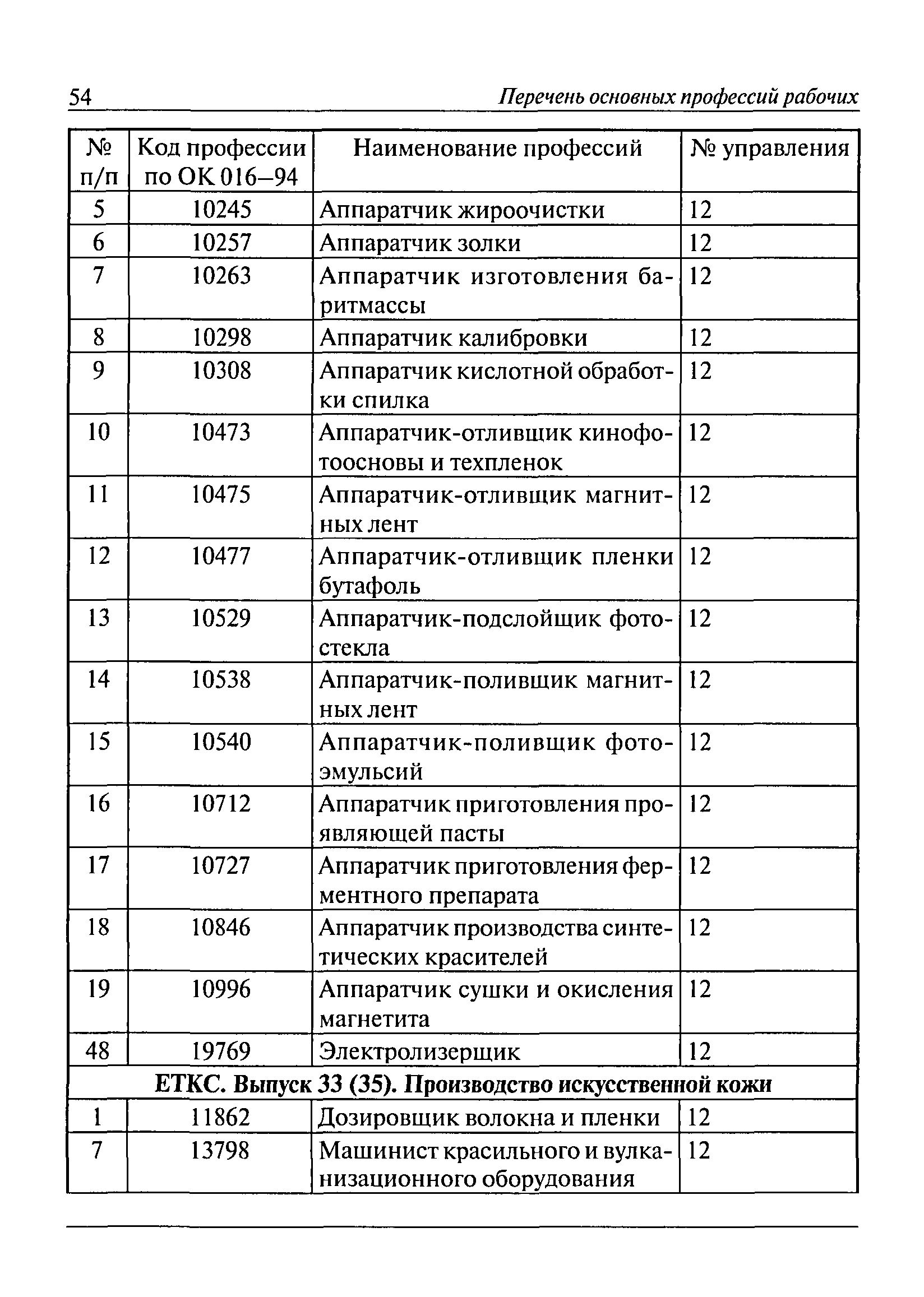Перечень основных профессий рабочих промышленных производств (объектов), программы обучения которых должны согласовываться с органами федеральной службы по экологическому, технологическому и атомному надзору| Статус: | утратил силу | | Название рус.: | Перечень основных профессий рабочих промышленных производств (объектов), программы обучения которых должны согласовываться с органами федеральной службы по экологическому, технологическому и атомному надзору | | Дата добавления в базу: | 01.09.2013 | | Дата актуализации: | 01.01.2021 | | Дата введения: | 29.12.2006 | | Дата окончания срока действия: | 19.08.2015 | | Область применения: | Перечень разработан в целях систематизации деятельности в области профессионального обучения. Перечень приведен в соответствии с действующими нормативными правовыми актами, определяющими сферу деятельности Федеральной службы по экологическому, технологическому и атомному надзору. | | Оглавление: | ЕТКС. Выпуск 01. Профессии рабочих, общие для всех отраслей экономики ЕТКС. Выпуск 02. ЕТКС. Выпуск 03. Строительные, монтажные и ремонтно-строительные работы ЕТКС. Выпуск 04. Горные работы ЕТКС. Выпуск 06. Добыча нефти и газа ЕТКС. Выпуск 07. Черная металлургия ЕТКС. Выпуск 08. Цветная металлургия ЕТКС. Выпуск 09. Эксплуатация оборудования электростанций и сетей и др. ЕТКС. Выпуск 17. Производство абразивов ЕТКС. Выпуск 19. Электротехническое производство ЕТКС. Выпуск 22. Производство и ремонт летательных аппаратов ЕТКС. Выпуск 23. Судостроение ЕТКС. Выпуск 24. Химическое производство ЕТКС. Выпуск 25. Азотное производство ЕТКС. Выпуск 26. Анилинокрасочное производство ЕТКС. Выпуск 27. Производство синтетических смол и др. ЕТКС. Выпуск 28 (28, 29). Производство стекловолокон и др. ЕТКС. Выпуск 29. (30, 31). Гидролизное производство ЕТКС. Выпуск 30. (32). Производство синтетических каучуков и др. ЕТКС. Выпуск 31. (33). Производство резиновых изделий ЕТКС. Выпуск 32 (34). Химико-фотографическое производство ЕТКС. Выпуск 33 (35). Производство искусственной кожи ЕТКС. Выпуск 34 (36). Переработка нефти ЕТКС. Выпуск 36 (38). Производство асбестовых технических изделий ЕТКС. Выпуск 37 (39). Лесозаготовительные работы ЕТКС. Выпуск 39 (41). Производство целлюлозы и др. ЕТКС. Выпуск 40 (42, 43). Производство строительных материалов ЕТКС. Выпуск 41 (44). Производство стекла стеклоизделий ЕТКС. Выпуск 42 (45). Производство керамических, фарфоровых и других изделий ЕТКС. Выпуск 44 (47). Производство текстиля ЕТКС. Выпуск 45 (48). Легкая промышленность ЕТКС. Выпуск 48 (51). Производство пищевой продукции ЕТКС. Выпуск 49 (52). Производства мясных, молочных и других продуктов ЕТКС. Выпуск 51 (53, 55). Производства: алкогольной и безалкогольной продукции; хлебопекарно-макаронное; сахара; табака; эфирномасляничное; чая; консервов; парфюмерно-косметическое; поваренной соли; общественное питание и торговля и др. ЕТКС. Выпуск 52 (56). Транспорт (железнодорожный, автомобильный, городской, морской, речной, метрополитен) ЕТКС. Выпуск 54 (58). Связь ЕТКС. Выпуск 63 (69). Газовое, водопроводно-канализационное и зеленое хозяйства Категория 73 Наименования управлений | | Утверждён: | 29.12.2006 Федеральная служба по экологическому, технологическому и атомному надзору (1154)