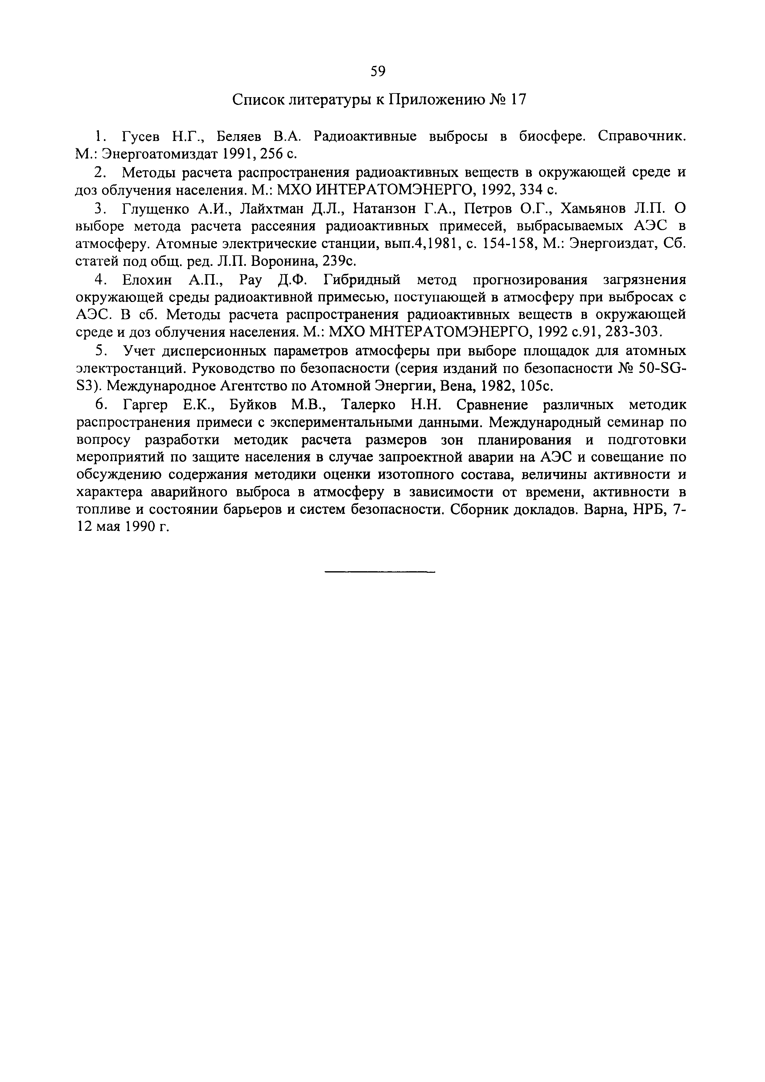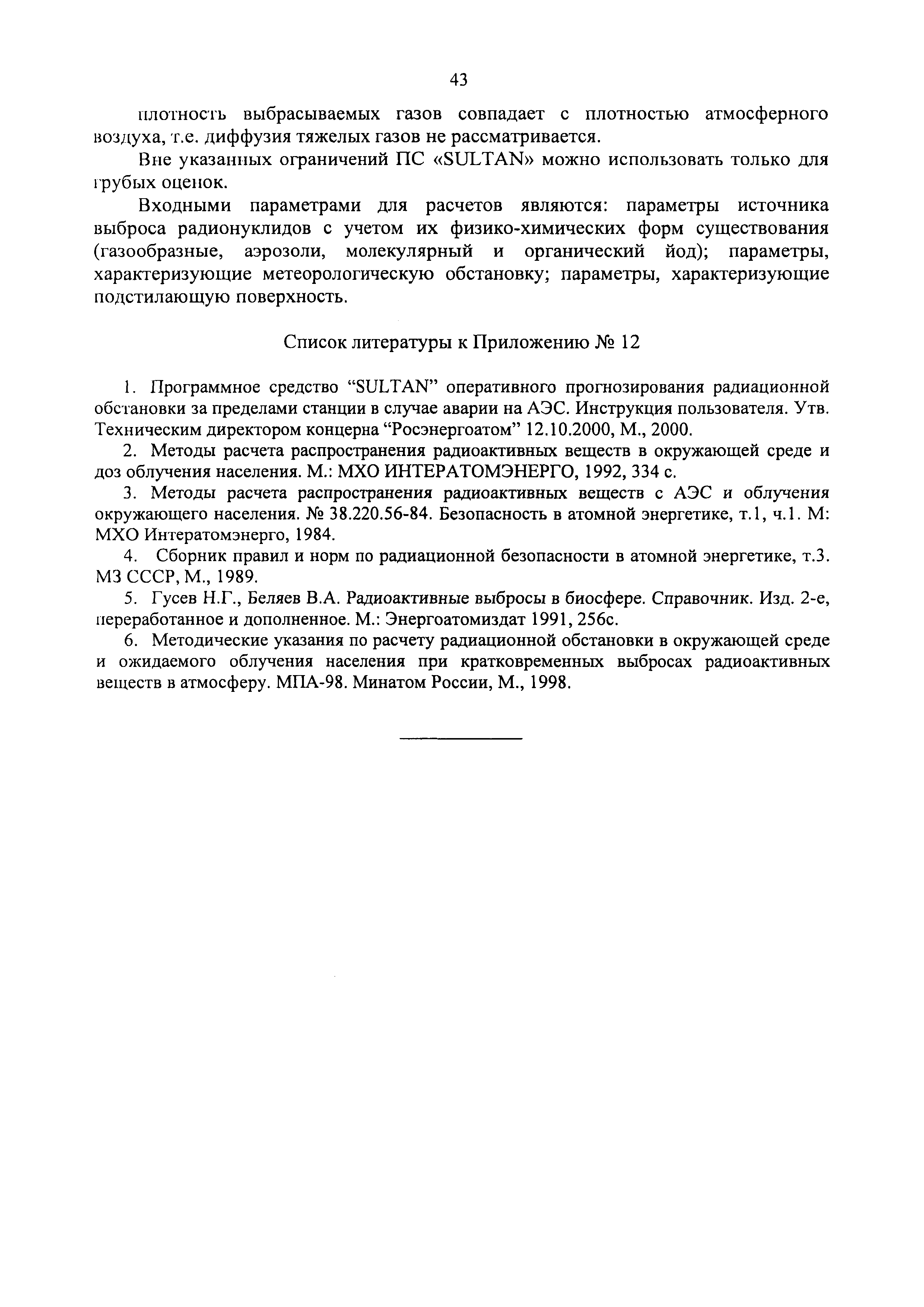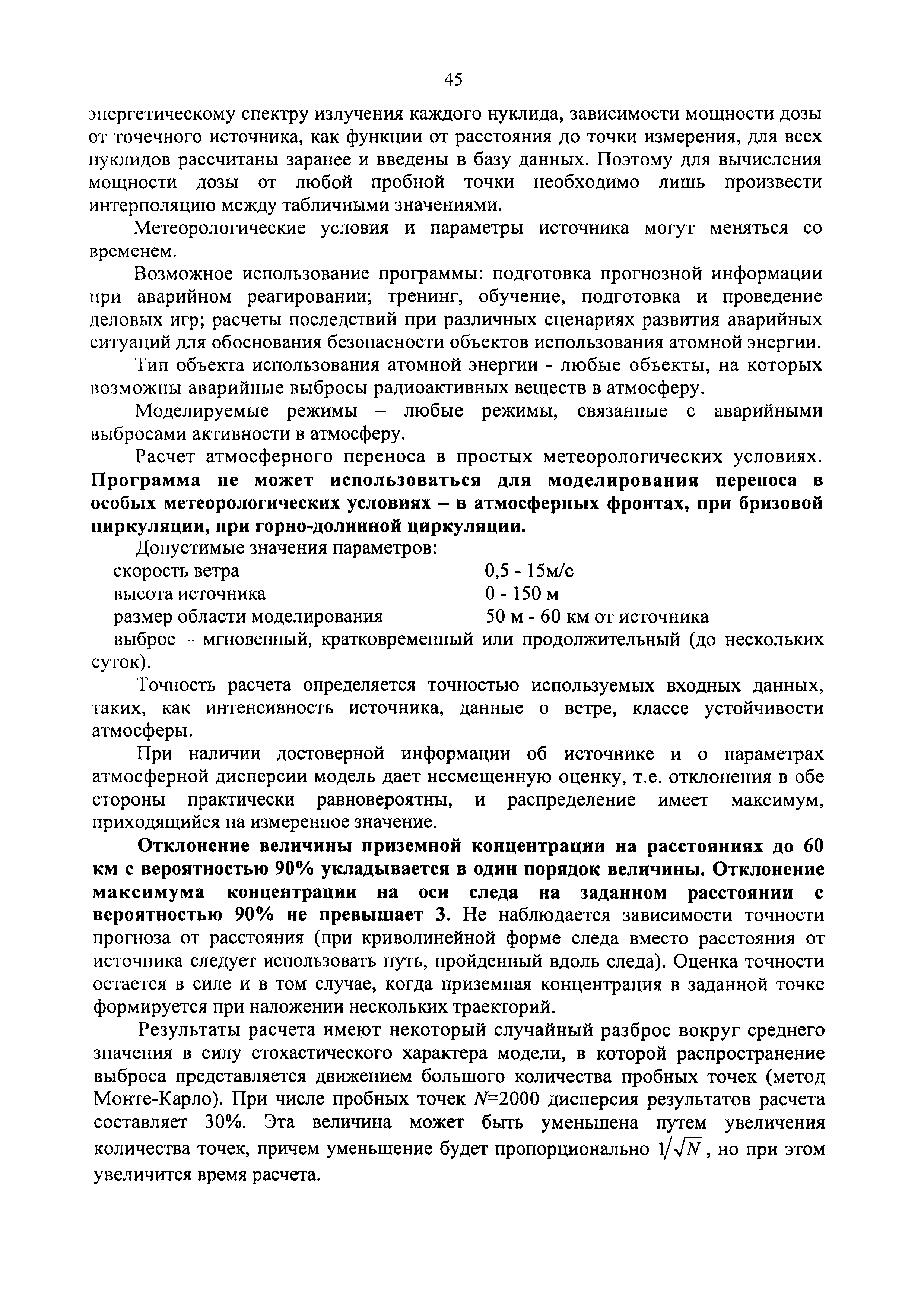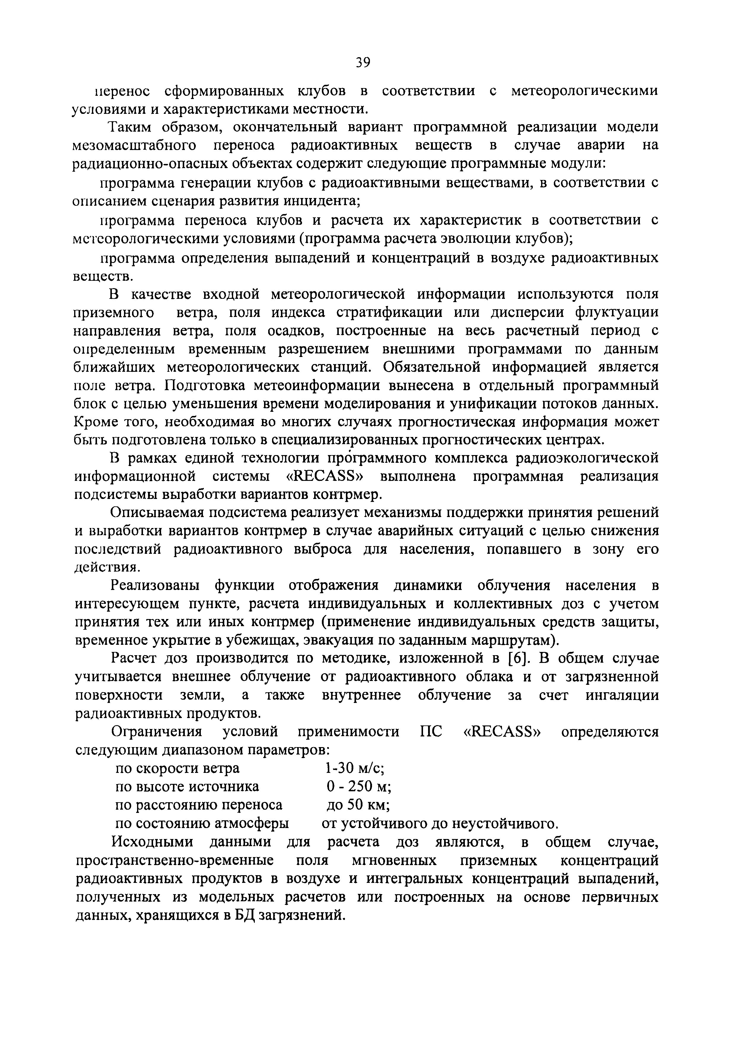 | Оглавление: | 1. Назначение и область применения 2. Рекомендации к составу и условиям работы АСКРО 3. Определение метеорологических параметров для оценки условий формирования радиационной обстановки на местности 4. Рекомендации по использованию моделей переноса радиоактивной примеси в атмосфере 5. Параметры модели 6. Методы прогнозирования 7. Условия необходимого и достаточного количества датчиков АСКРО, размещаемых на промплощадке и в СЗЗ ОИАЭ 8. Принцип размещения детекторов фотонного излучения АСКРО на промплощадке ив СЗЗ ОИАЭ 9. Уточнение величины Pв 10. Выбор датчика для уточнения величины Pв Приложение 1. Шероховатость подстилающей поверхности Приложение 2. Структурная схема состав АСКРО Приложение 3. Критерии, отвечающие условиям размещения постов радиационного контроля на промплощадке и в СЭЭ ОИАЭ Приложение 4. Методика обработки градиентных наблюдений Приложение 5. Модель пограничного слоя атмосферы Приложение 6. Скорость сухого осаждения Приложение 7. Постоянная вымывания осадками радиоактивной примеси Приложение 8. Постоянная распада радиоактивной примеси Приложение 9. Скорость гравитационного осаждения Приложение 10. Требования, предъявляемые к датчикам метеопараметров Приложение 11. ПС "RECASS" Приложение 12. ПС "SULTAN" Приложение 13. ПС "НОСТРАДАМУС" Приложение 14. ПС "ДОЗА" Приложение 15. ПС "GENGAUS" Приложение 16. Физические основы переноса примеси в атмосфере Приложение 17. Анализ математических моделей переноса примеси в атмосфере Приложение 18. Дифференциальная модель распространения радионуклидов в атмосфере Приложение 19. Нетрадиционные методы оценки радиоактивного загрязнения окружающей среды Приложение 20. Метод определения необходимого и достаточного количества датчиков АСКРО, размещаемых на промплощадке и в СЗЗ ОИАЭ Приложение 21. Принцип размещения детекторов фотонного излучения АСКРО на промплощадке и в СЗЗ ОИАЭ Приложение 22. Метод уточнения величины мощности выброса Приложение 23. Метод выбора наиболее оптимального датчика для нормировки |