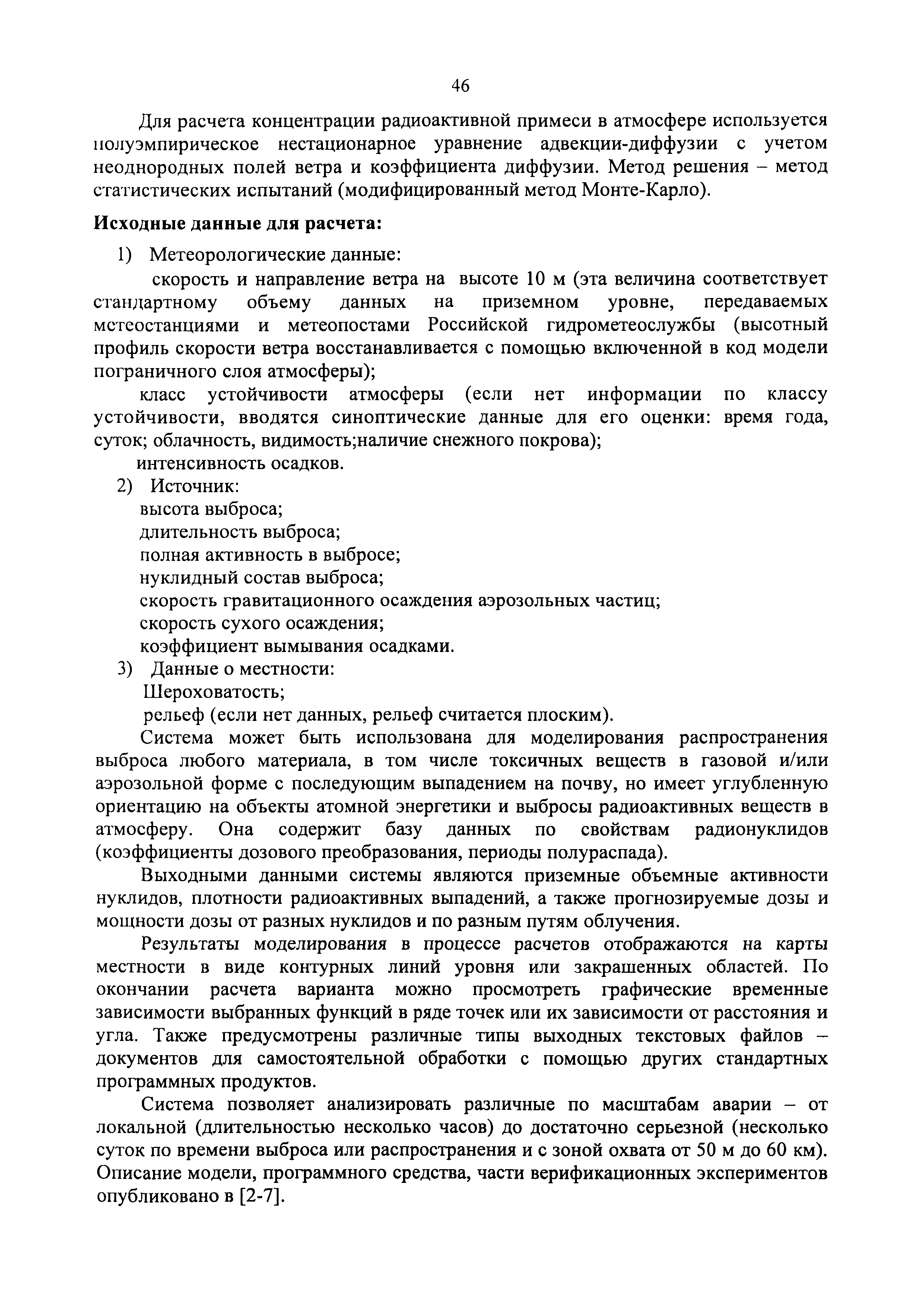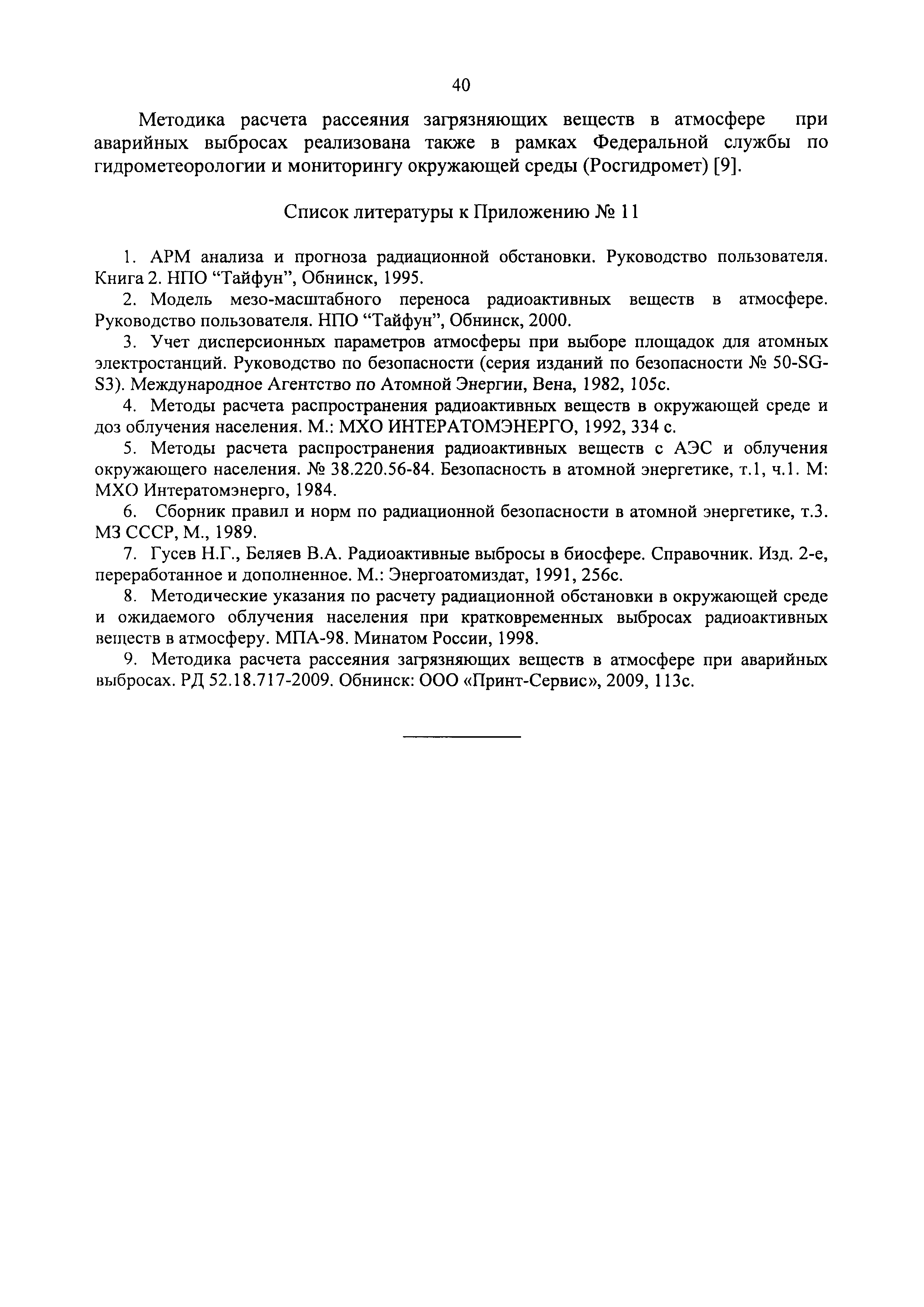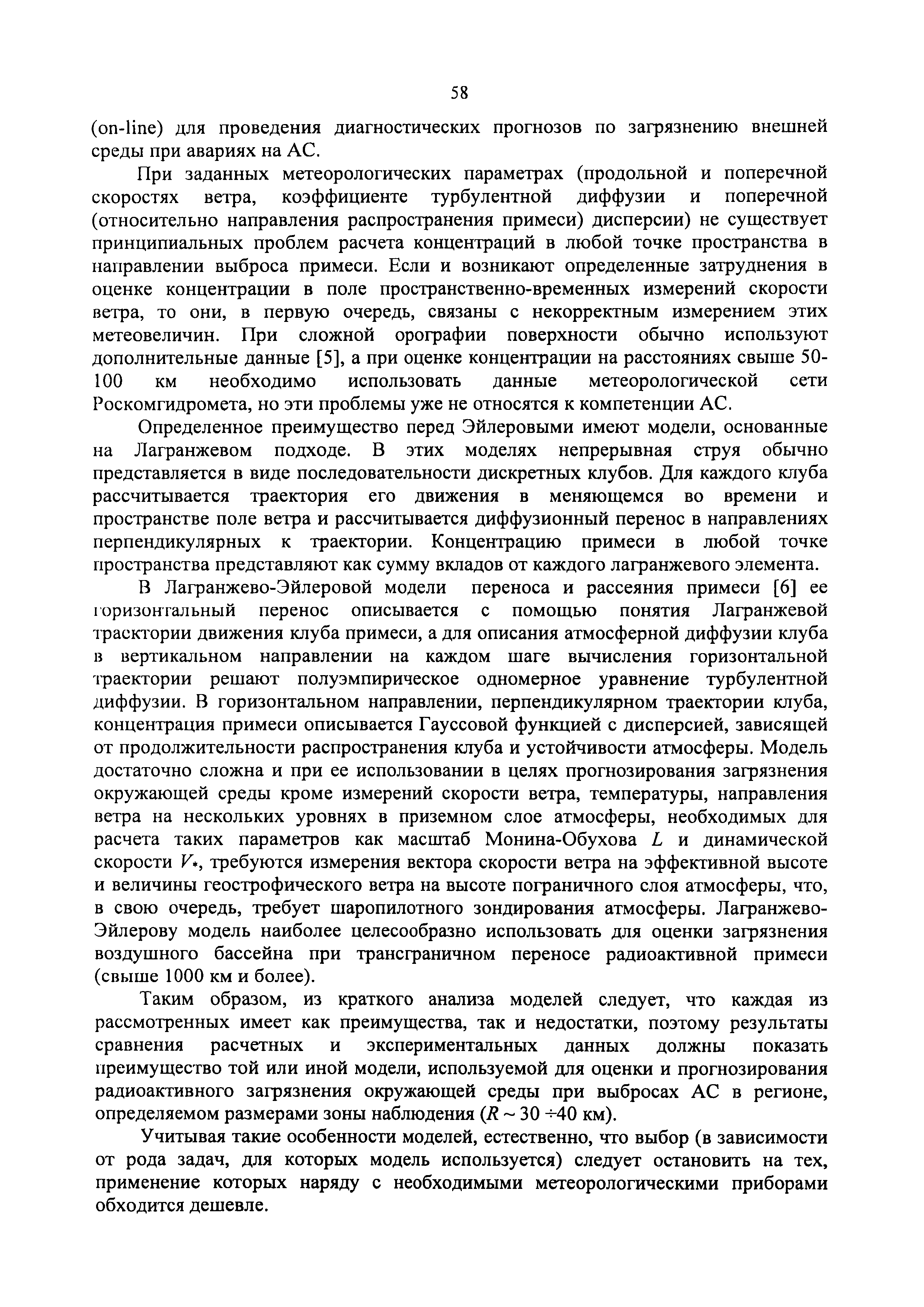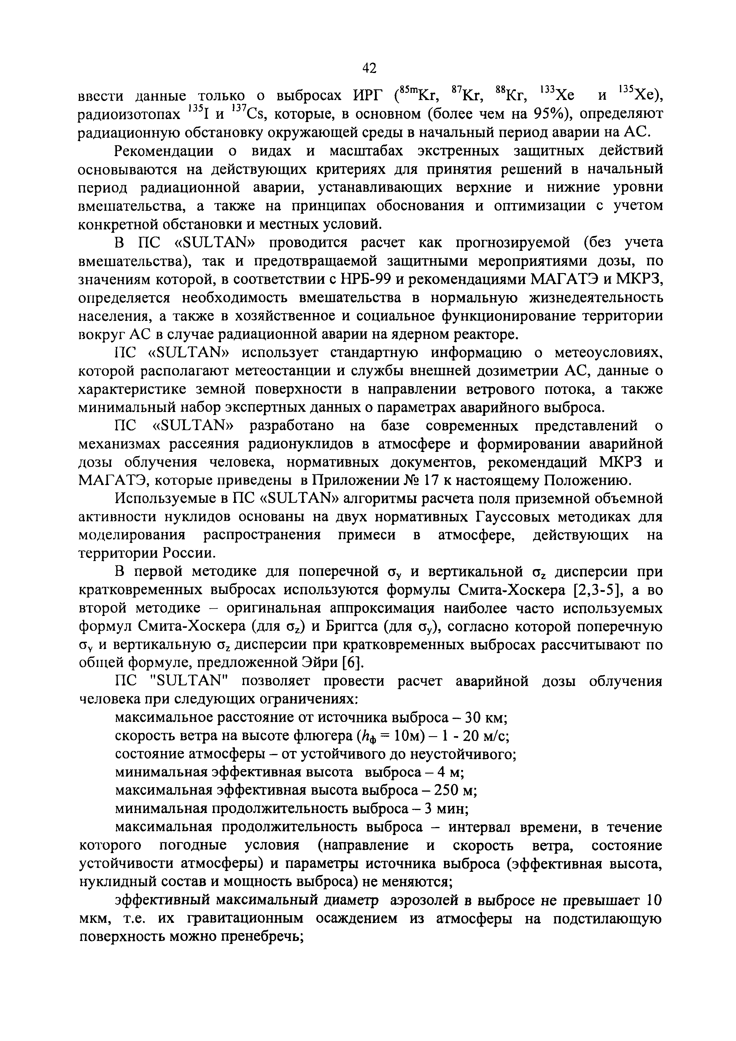 | Оглавление: | 1. Назначение и область применения 2. Рекомендации к составу и условиям работы АСКРО 3. Определение метеорологических параметров для оценки условий формирования радиационной обстановки на местности 4. Рекомендации по использованию моделей переноса радиоактивной примеси в атмосфере 5. Параметры модели 6. Методы прогнозирования 7. Условия необходимого и достаточного количества датчиков АСКРО, размещаемых на промплощадке и в СЗЗ ОИАЭ 8. Принцип размещения детекторов фотонного излучения АСКРО на промплощадке ив СЗЗ ОИАЭ 9. Уточнение величины Pв 10. Выбор датчика для уточнения величины Pв Приложение 1. Шероховатость подстилающей поверхности Приложение 2. Структурная схема состав АСКРО Приложение 3. Критерии, отвечающие условиям размещения постов радиационного контроля на промплощадке и в СЭЭ ОИАЭ Приложение 4. Методика обработки градиентных наблюдений Приложение 5. Модель пограничного слоя атмосферы Приложение 6. Скорость сухого осаждения Приложение 7. Постоянная вымывания осадками радиоактивной примеси Приложение 8. Постоянная распада радиоактивной примеси Приложение 9. Скорость гравитационного осаждения Приложение 10. Требования, предъявляемые к датчикам метеопараметров Приложение 11. ПС "RECASS" Приложение 12. ПС "SULTAN" Приложение 13. ПС "НОСТРАДАМУС" Приложение 14. ПС "ДОЗА" Приложение 15. ПС "GENGAUS" Приложение 16. Физические основы переноса примеси в атмосфере Приложение 17. Анализ математических моделей переноса примеси в атмосфере Приложение 18. Дифференциальная модель распространения радионуклидов в атмосфере Приложение 19. Нетрадиционные методы оценки радиоактивного загрязнения окружающей среды Приложение 20. Метод определения необходимого и достаточного количества датчиков АСКРО, размещаемых на промплощадке и в СЗЗ ОИАЭ Приложение 21. Принцип размещения детекторов фотонного излучения АСКРО на промплощадке и в СЗЗ ОИАЭ Приложение 22. Метод уточнения величины мощности выброса Приложение 23. Метод выбора наиболее оптимального датчика для нормировки |