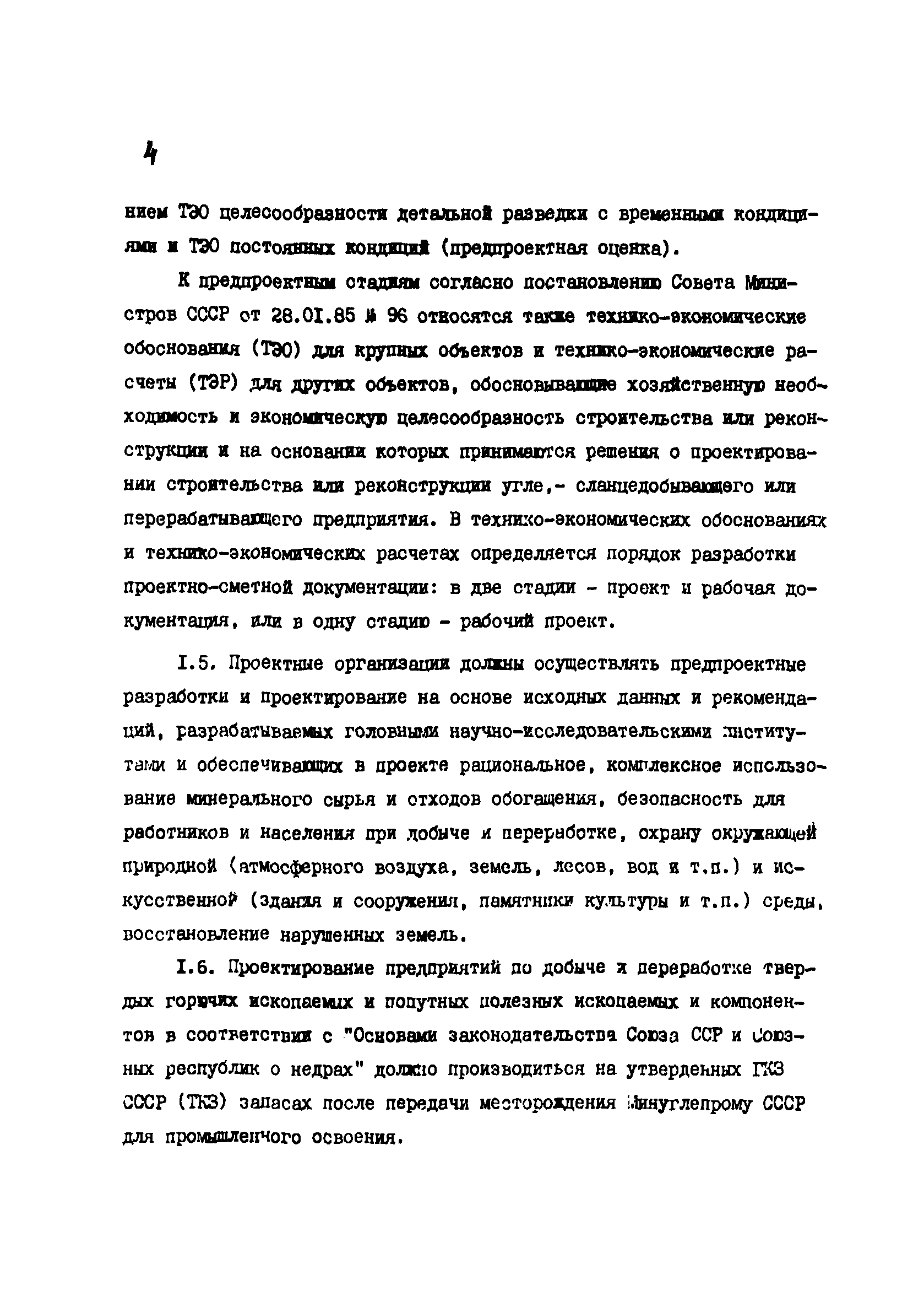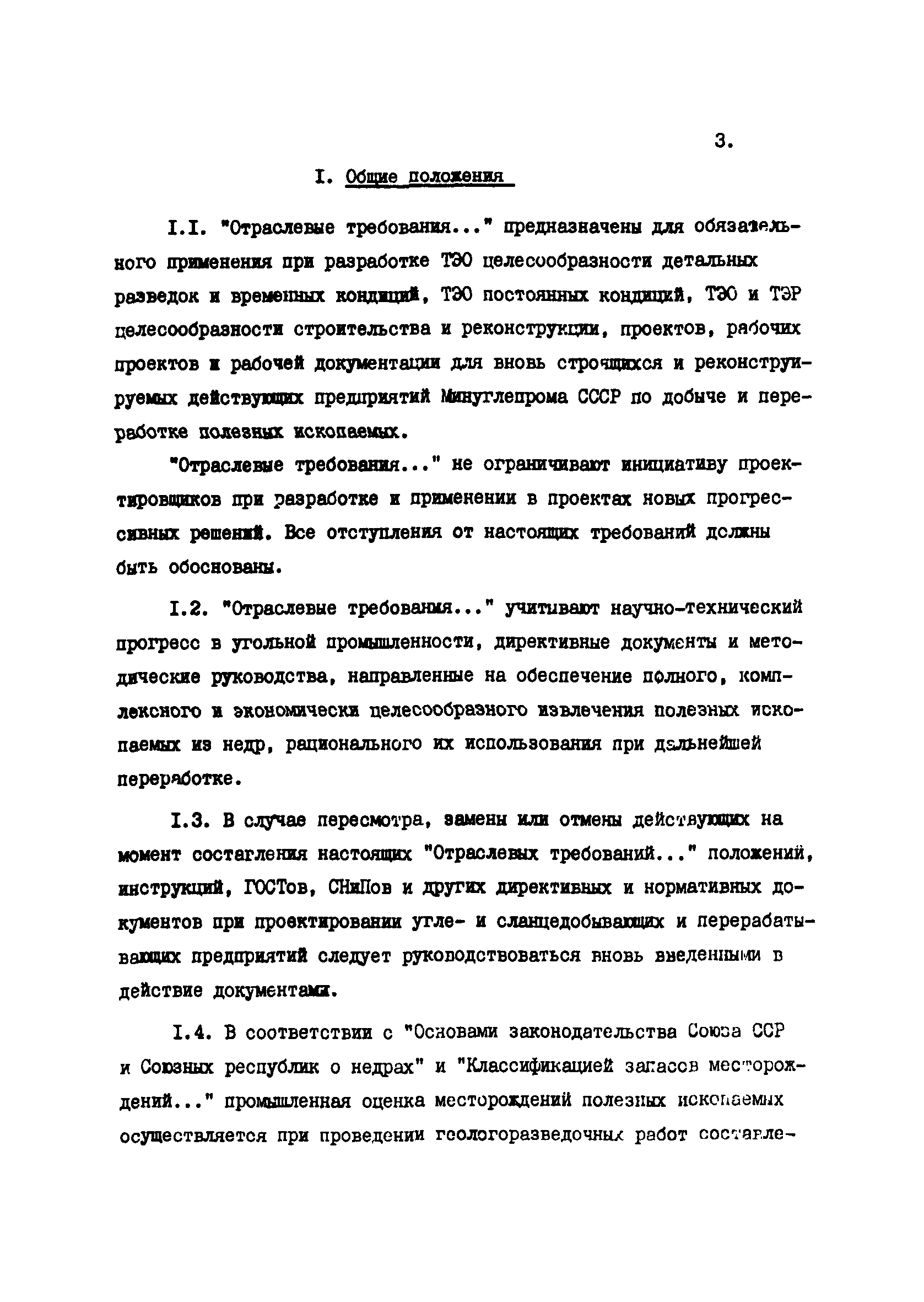 | Область применения: | "Основные требования…" предназначены для обязательного применения при разработке ТЭО целесообразности детальных разведок и временных кондиций, ТЭО постоянных кондиций, ТЭО и ТЭР целесообразности строительства и реконструкции, проектов, рабочих проектов и рабочей документации для вновь строящихся и реконструируемых действующих предприятий Минуглепрома СССР по добыче и переработке полезных ископаемых. |