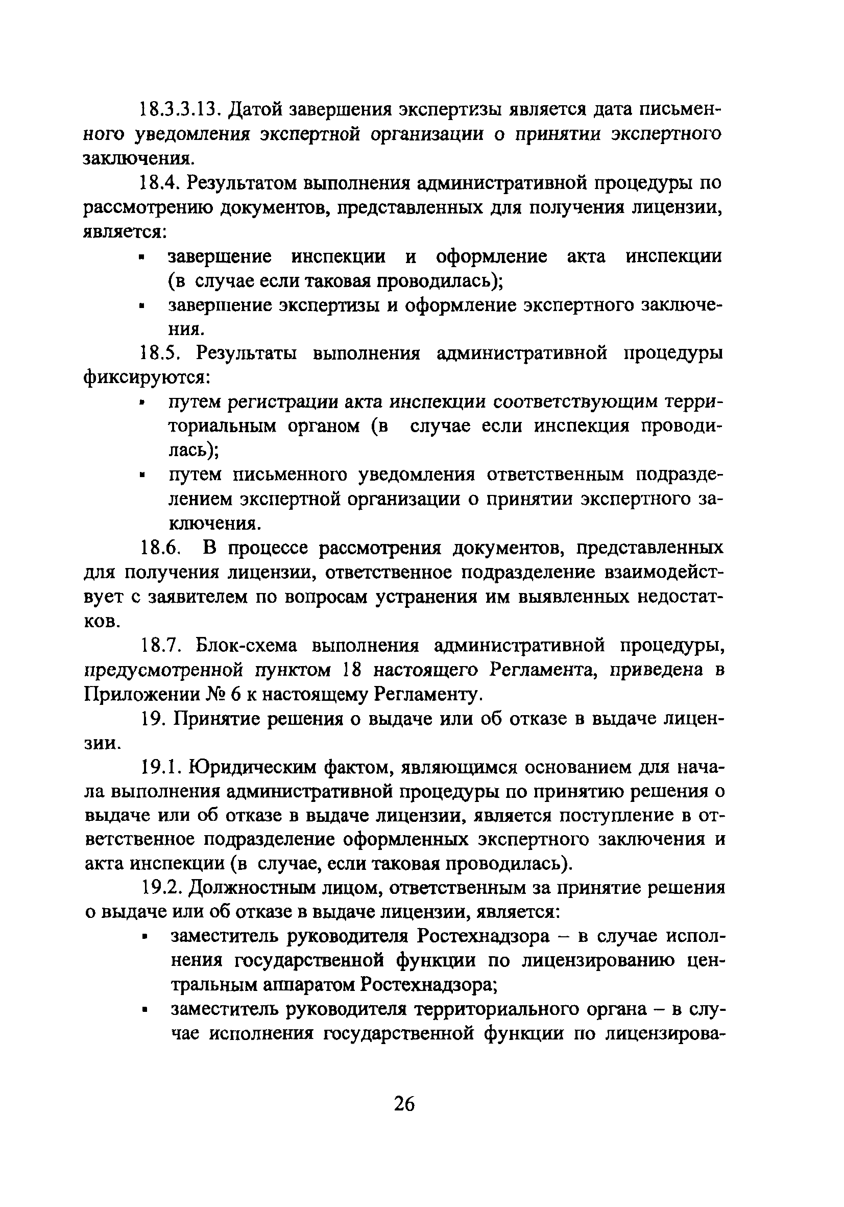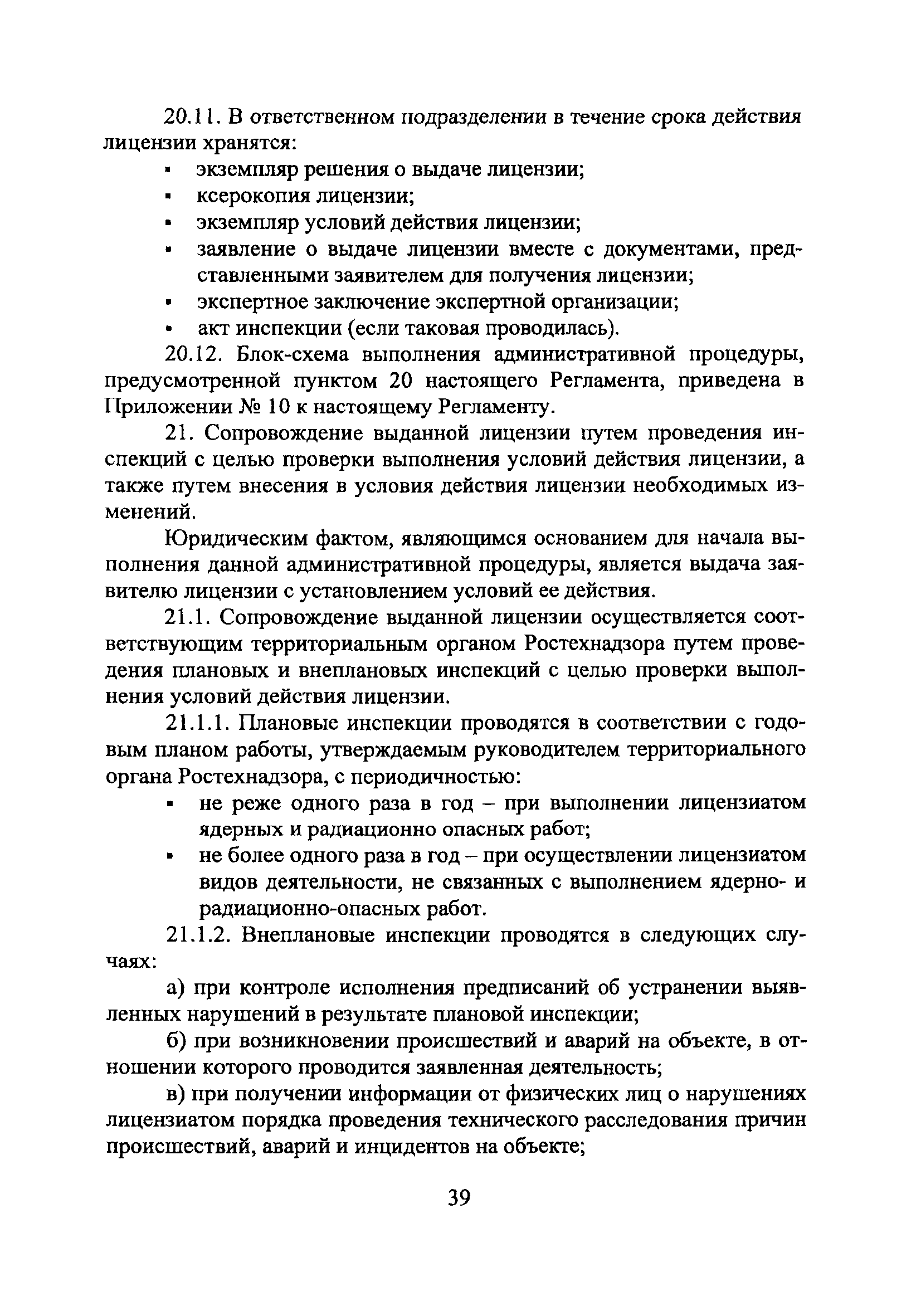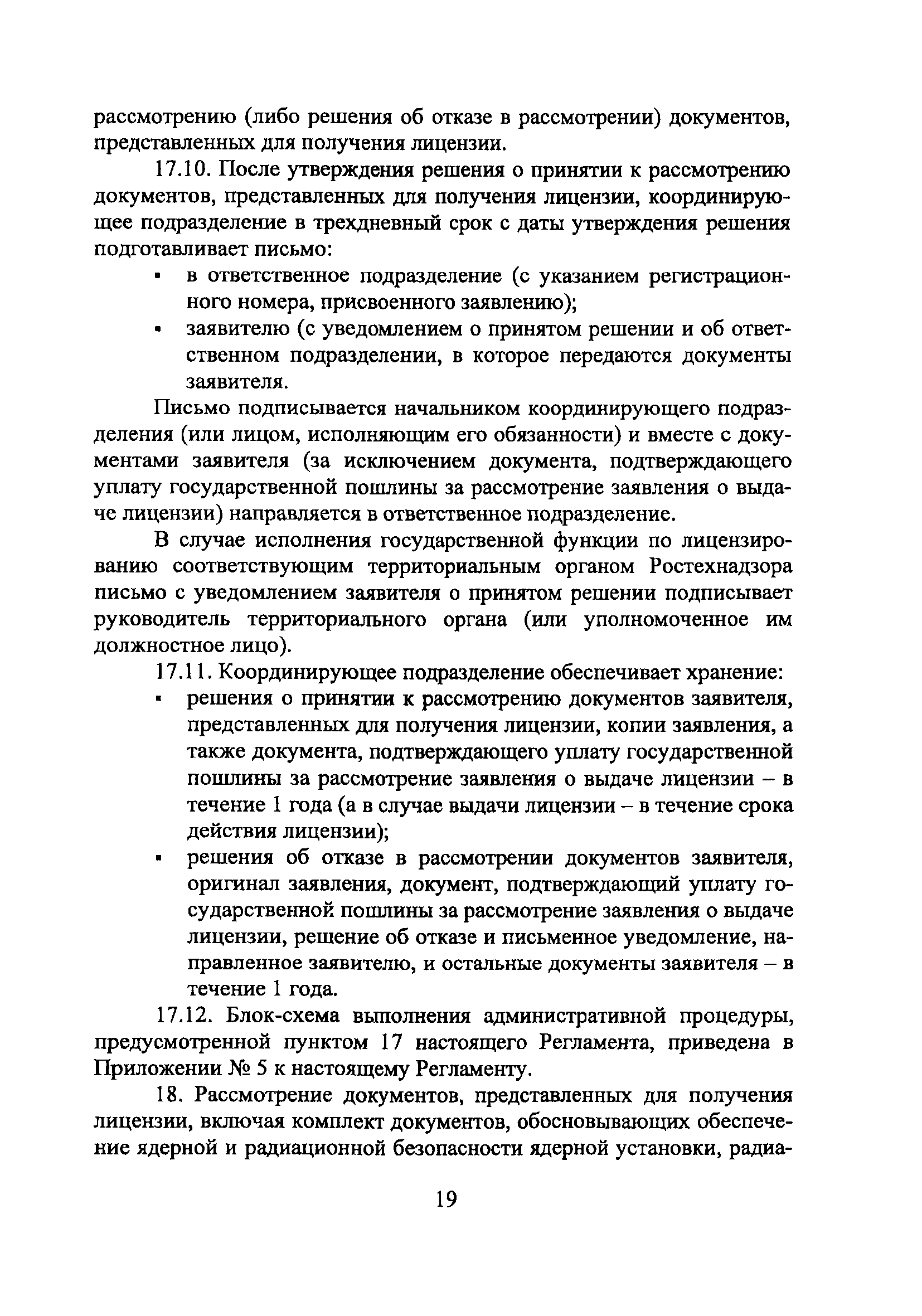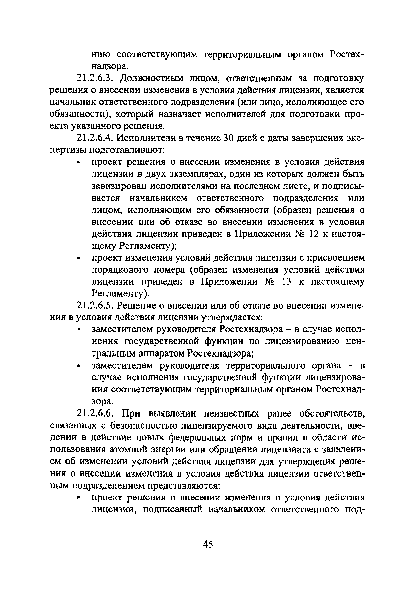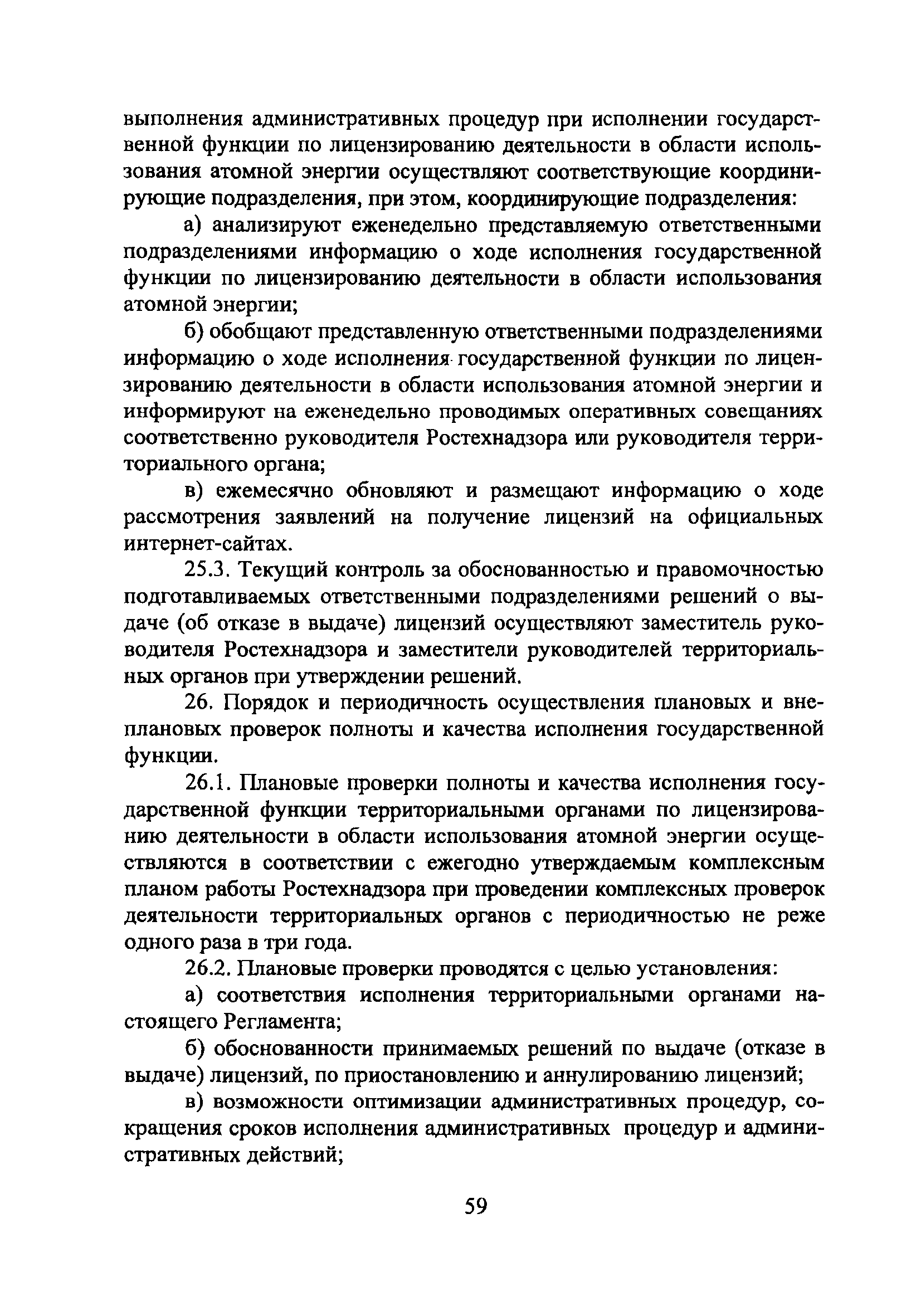 | Оглавление: | I. Общие положения II. Требования к порядку исполнения государственной функции по лицензированию деятельности в области использования атомной энергии III. Административные процедуры IV. Порядок и формы контроля за исполнением государственной функции V. Порядок обжалования действий (бездействия) должностного лица, а также принимаемого им решения при исполнении государственной функции по лицензированию деятельности в области использования атомной энергии Приложение № 1 Разграничение полномочий между центральным аппаратом Ростехнадзора и его территориальными органами при исполнении государственной функции по лицензированию деятельности в области использования атомной энергии и максимальные сроки проведения экспертизы документов, представленных для получения лицензии Приложение № 2 Перечень субъектов Российской Федерации, на территории которых территориальные органы Ростехнадзора исполняют государственную функцию по лицензированию деятельности в области использования атомной энергии Приложение № 3 Обобщенная информация о ходе рассмотрения заявлений на получение лицензий Приложение № 4 Требования к составу комплекта документов, обосновывающих обеспечение ядерной и радиационной безопасности ядерной установки, радиационного источника, пункта хранения и (или) заявленной деятельности, определенные Федеральной службой по экологическому, технологическому и атомному надзору в соответствии с п. 11 ж) Положения о лицензировании деятельности в области использования атомной энергии Приложение № 5 Блок-схема выполнения административной процедуры по рассмотрению заявления о выдаче лицензии и проведению предварительной проверки документов Приложение № 6 Блок-схема выполнения административной процедуры по рассмотрению документов, представленных для получения лицензии Приложение № 7 Образец решения о выдаче лицензии (об отказе в выдаче лицензии) Приложение № 8 Образец лицензии Приложение № 9 Блок-схема выполнения административной процедуры по принятию решения о выдаче или отказе в выдаче лицензии Приложение № 10 Блок-схема выполнения административной процедуры по выдаче лицензии с установлением условий ее действия Приложение № 11 Блок-схема выполнения административной процедуры по сопровождению выданной лицензии путем проведения инспекции с целью проверки выполнения условий действия лицензии Приложение № 12 Образец решения о внесении или об отказе во внесении изменения в условия действия лицензии Приложение № 13 Образец изменения условий действия лицензии Приложение № 14 Блок-схема выполнения административной процедуры по изменению условий действия лицензии Приложение № 15 Образец решения о приостановлении или прекращении действия (аннулировании) лицензии Приложение № 16 Блок-схема выполнения административной процедуры по приостановлению или прекращению действия (аннулированию) лицензии Приложение № 17 Образец решения о возобновлении лицензии Приложение № 18 Блок-схема выполнения административной процедуры по возобновлению действия лицензии Приложение № 19 Блок-схема выполнения административной процедуры по выдаче дубликата лицензии Справочная информация (не является составной частью вышеприведенного Административного регламента) |