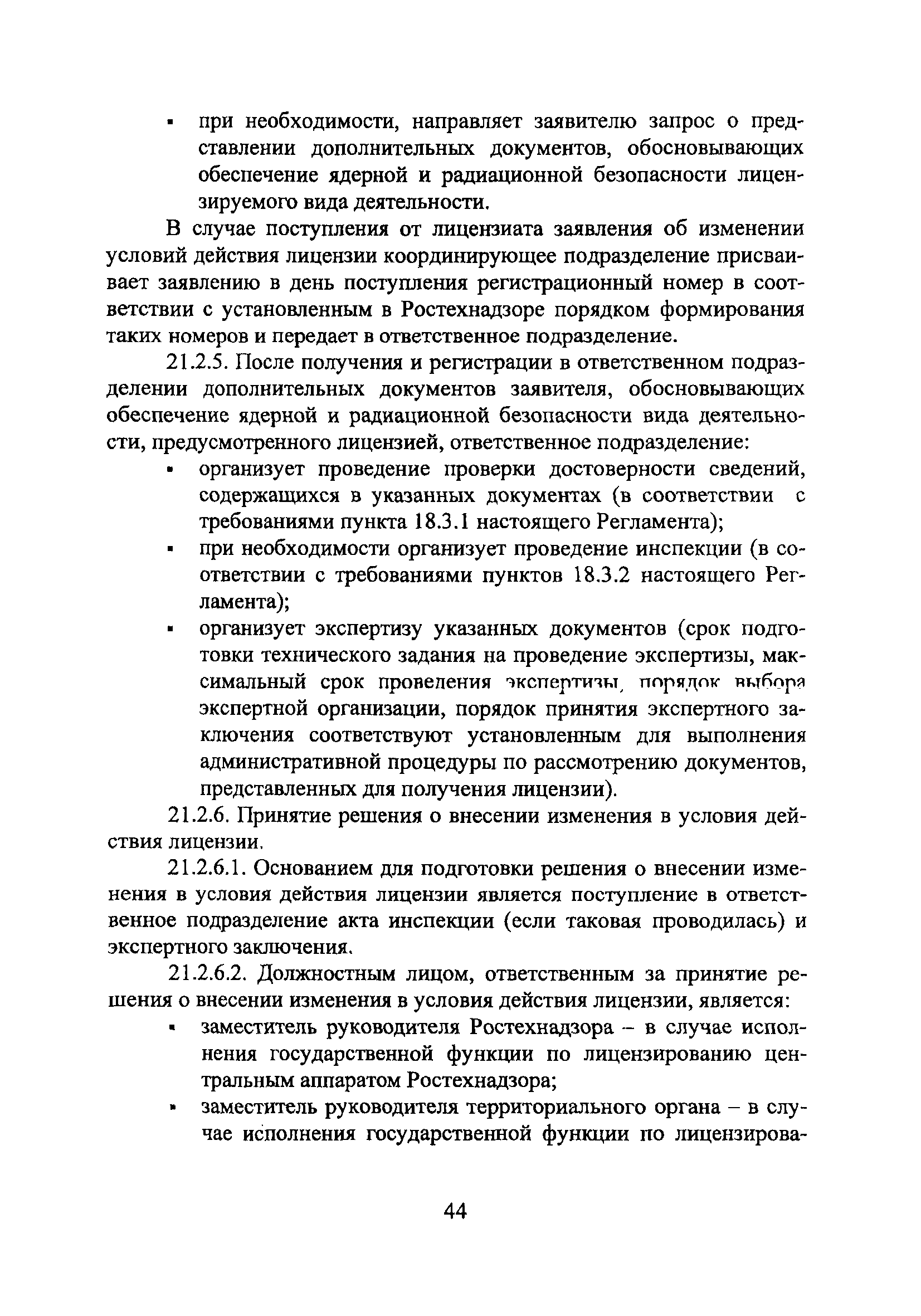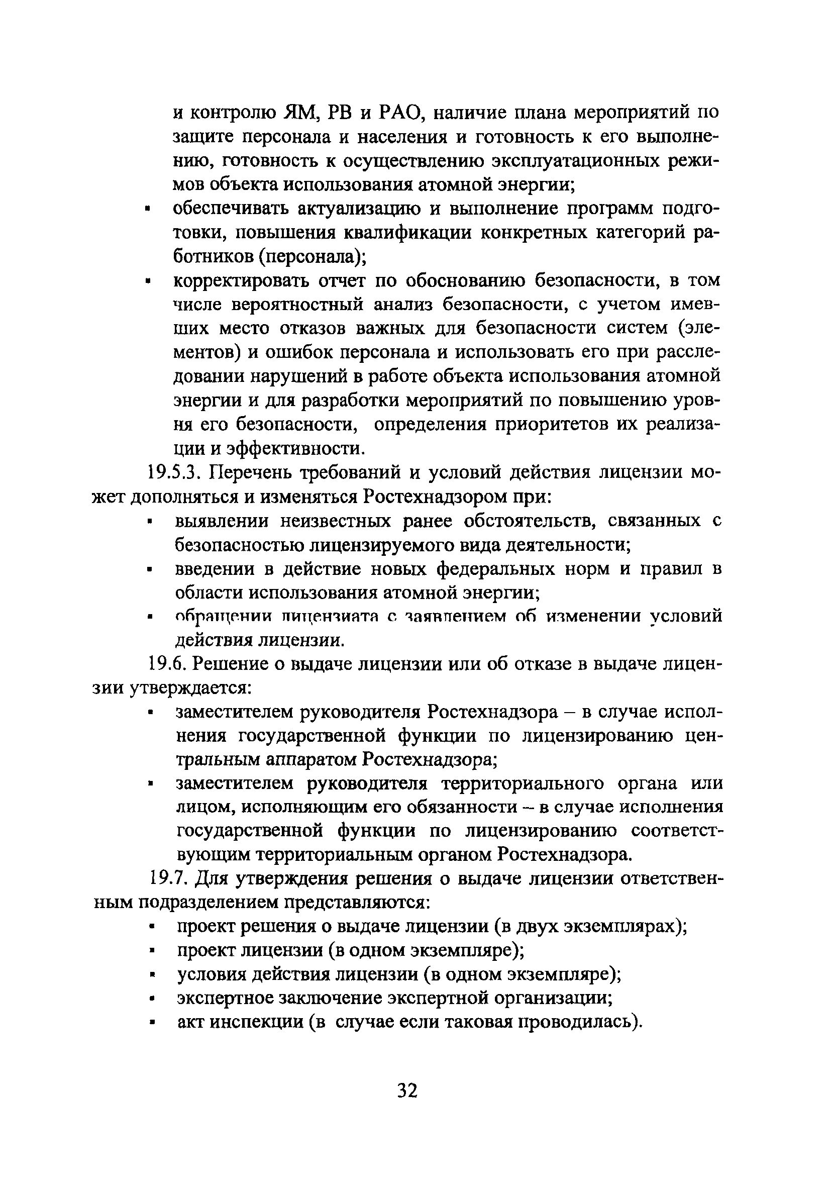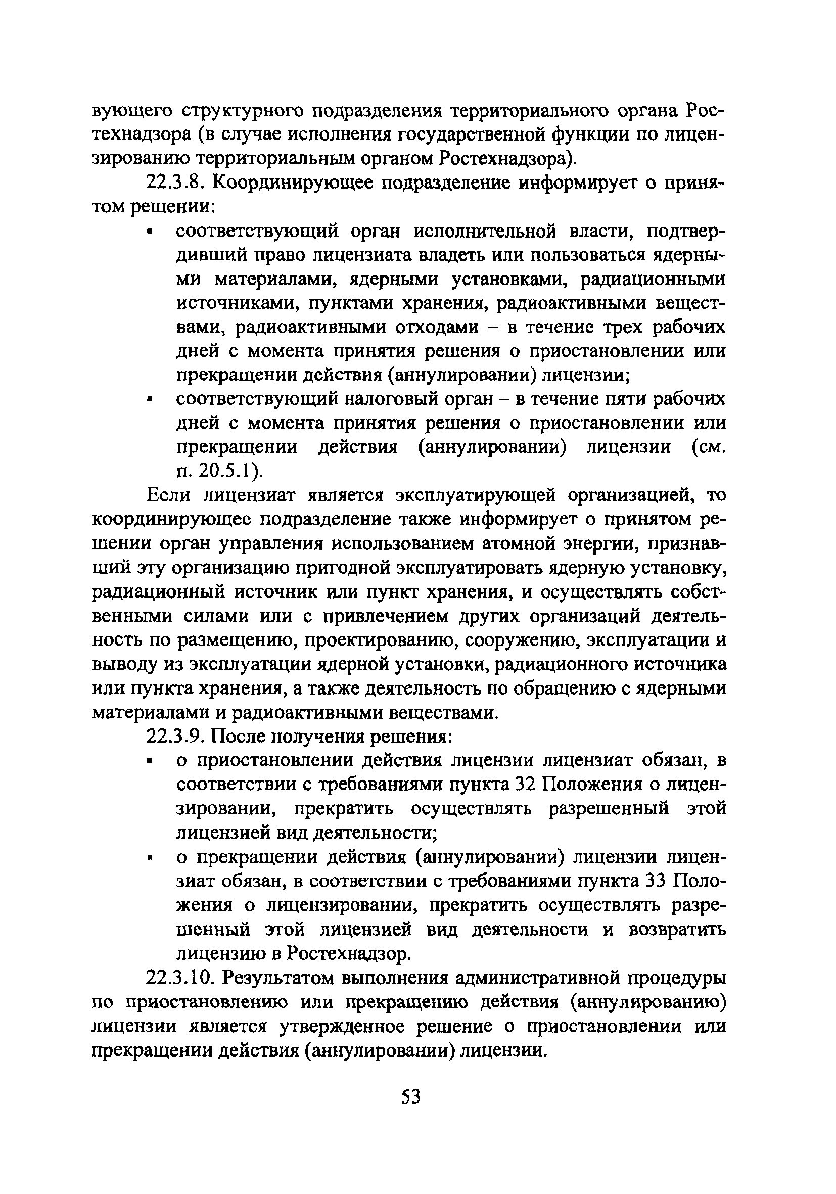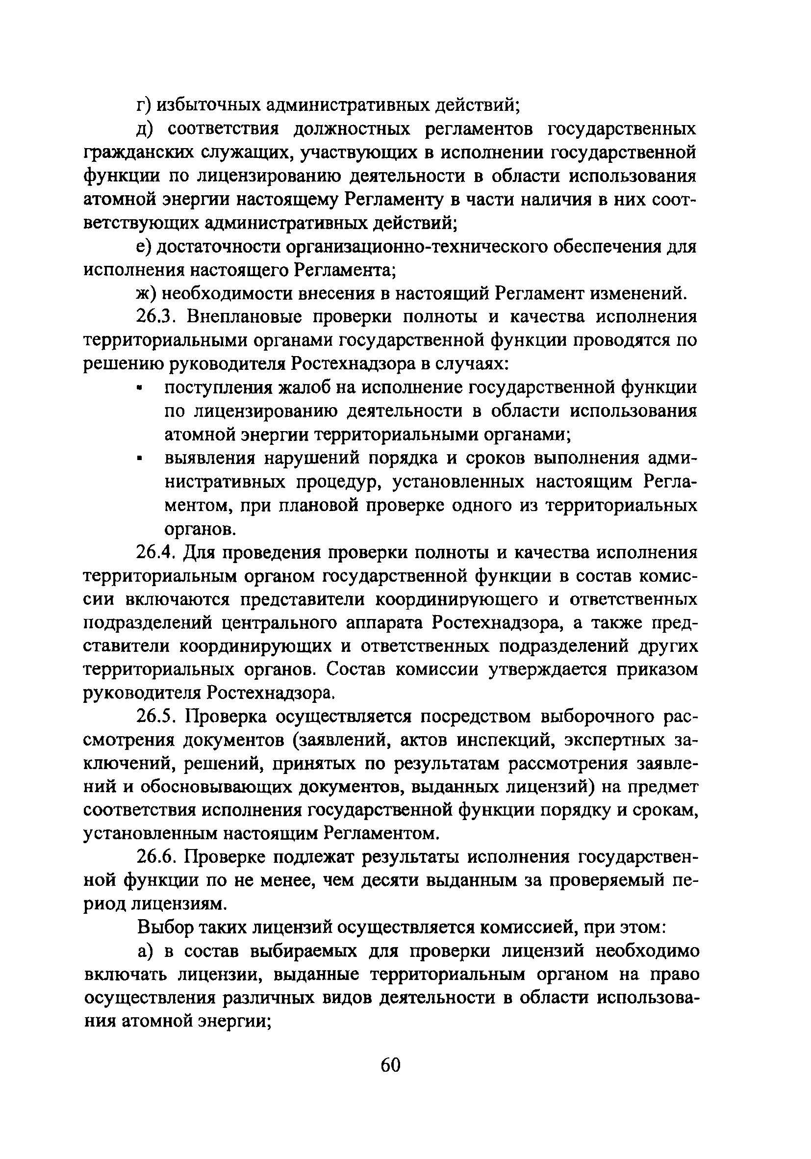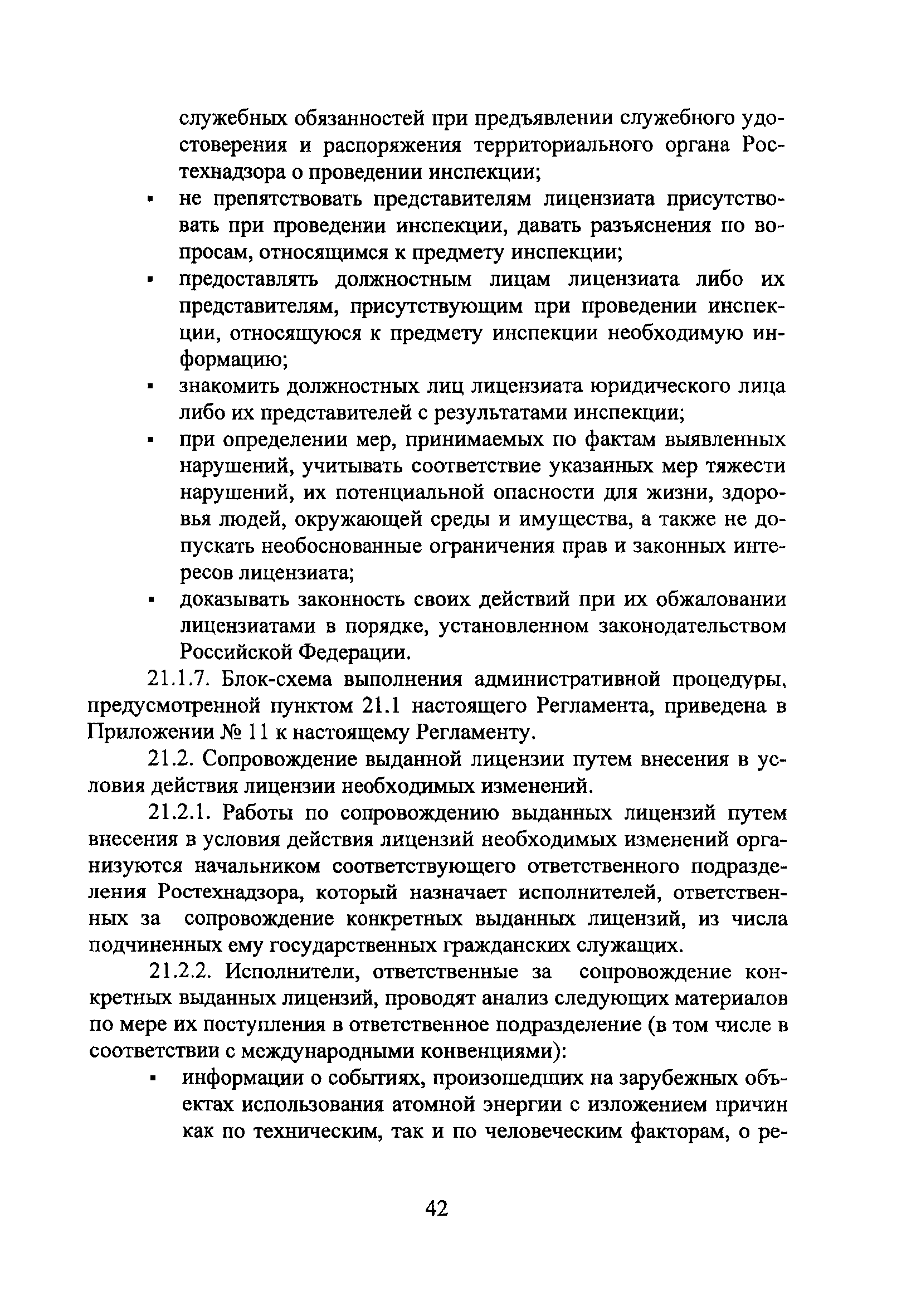 | Оглавление: | I. Общие положения II. Требования к порядку исполнения государственной функции по лицензированию деятельности в области использования атомной энергии III. Административные процедуры IV. Порядок и формы контроля за исполнением государственной функции V. Порядок обжалования действий (бездействия) должностного лица, а также принимаемого им решения при исполнении государственной функции по лицензированию деятельности в области использования атомной энергии Приложение № 1 Разграничение полномочий между центральным аппаратом Ростехнадзора и его территориальными органами при исполнении государственной функции по лицензированию деятельности в области использования атомной энергии и максимальные сроки проведения экспертизы документов, представленных для получения лицензии Приложение № 2 Перечень субъектов Российской Федерации, на территории которых территориальные органы Ростехнадзора исполняют государственную функцию по лицензированию деятельности в области использования атомной энергии Приложение № 3 Обобщенная информация о ходе рассмотрения заявлений на получение лицензий Приложение № 4 Требования к составу комплекта документов, обосновывающих обеспечение ядерной и радиационной безопасности ядерной установки, радиационного источника, пункта хранения и (или) заявленной деятельности, определенные Федеральной службой по экологическому, технологическому и атомному надзору в соответствии с п. 11 ж) Положения о лицензировании деятельности в области использования атомной энергии Приложение № 5 Блок-схема выполнения административной процедуры по рассмотрению заявления о выдаче лицензии и проведению предварительной проверки документов Приложение № 6 Блок-схема выполнения административной процедуры по рассмотрению документов, представленных для получения лицензии Приложение № 7 Образец решения о выдаче лицензии (об отказе в выдаче лицензии) Приложение № 8 Образец лицензии Приложение № 9 Блок-схема выполнения административной процедуры по принятию решения о выдаче или отказе в выдаче лицензии Приложение № 10 Блок-схема выполнения административной процедуры по выдаче лицензии с установлением условий ее действия Приложение № 11 Блок-схема выполнения административной процедуры по сопровождению выданной лицензии путем проведения инспекции с целью проверки выполнения условий действия лицензии Приложение № 12 Образец решения о внесении или об отказе во внесении изменения в условия действия лицензии Приложение № 13 Образец изменения условий действия лицензии Приложение № 14 Блок-схема выполнения административной процедуры по изменению условий действия лицензии Приложение № 15 Образец решения о приостановлении или прекращении действия (аннулировании) лицензии Приложение № 16 Блок-схема выполнения административной процедуры по приостановлению или прекращению действия (аннулированию) лицензии Приложение № 17 Образец решения о возобновлении лицензии Приложение № 18 Блок-схема выполнения административной процедуры по возобновлению действия лицензии Приложение № 19 Блок-схема выполнения административной процедуры по выдаче дубликата лицензии Справочная информация (не является составной частью вышеприведенного Административного регламента) |