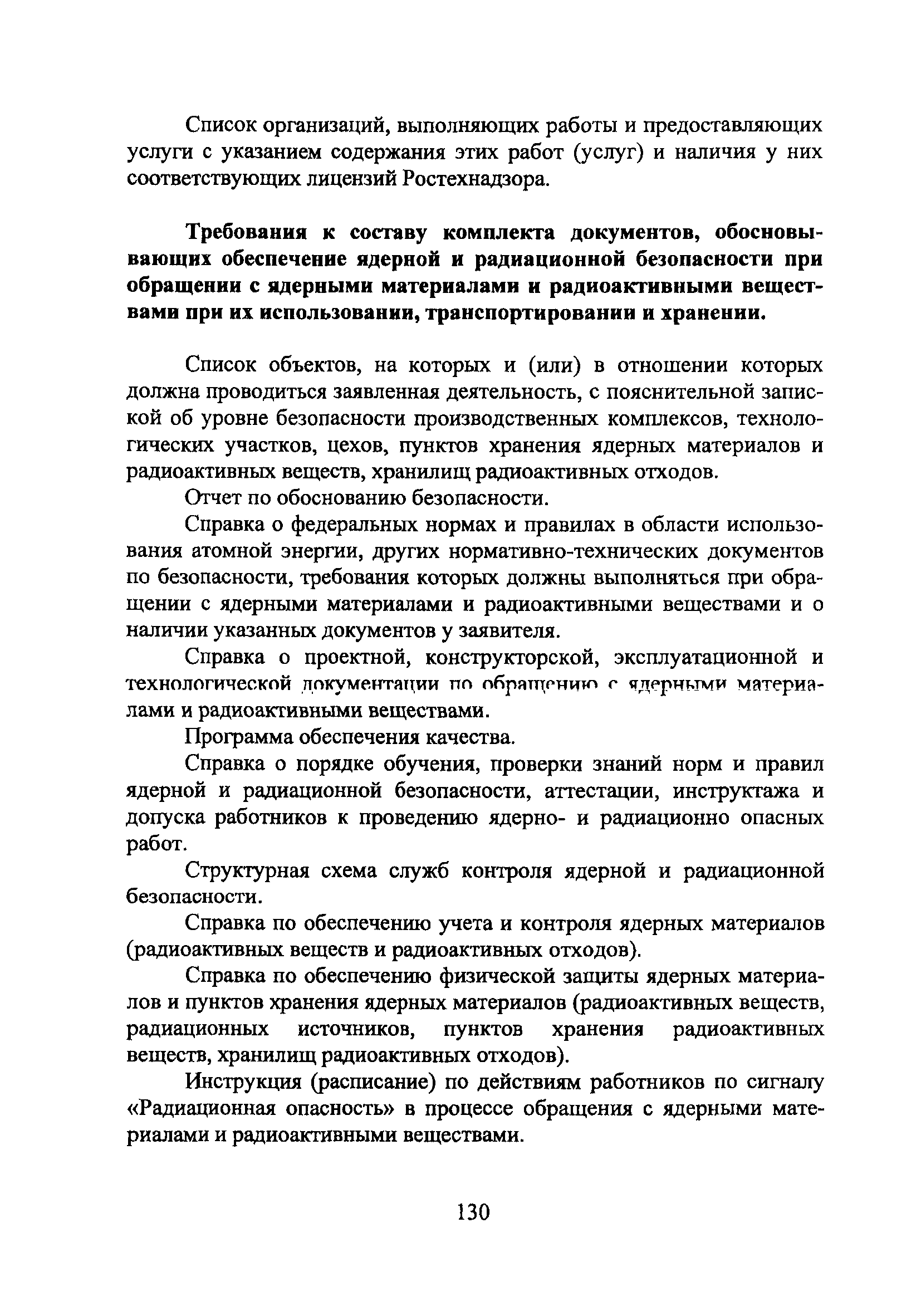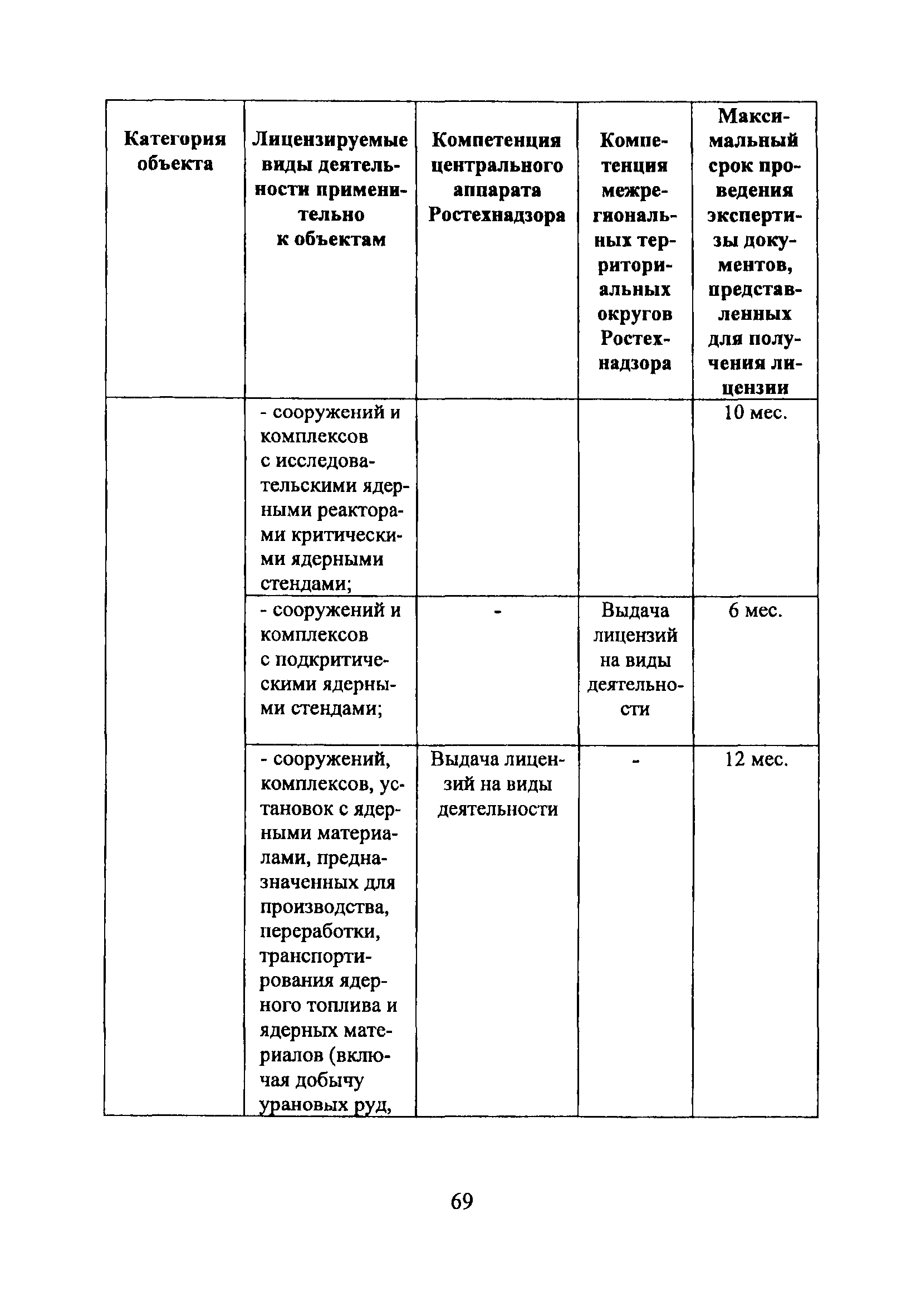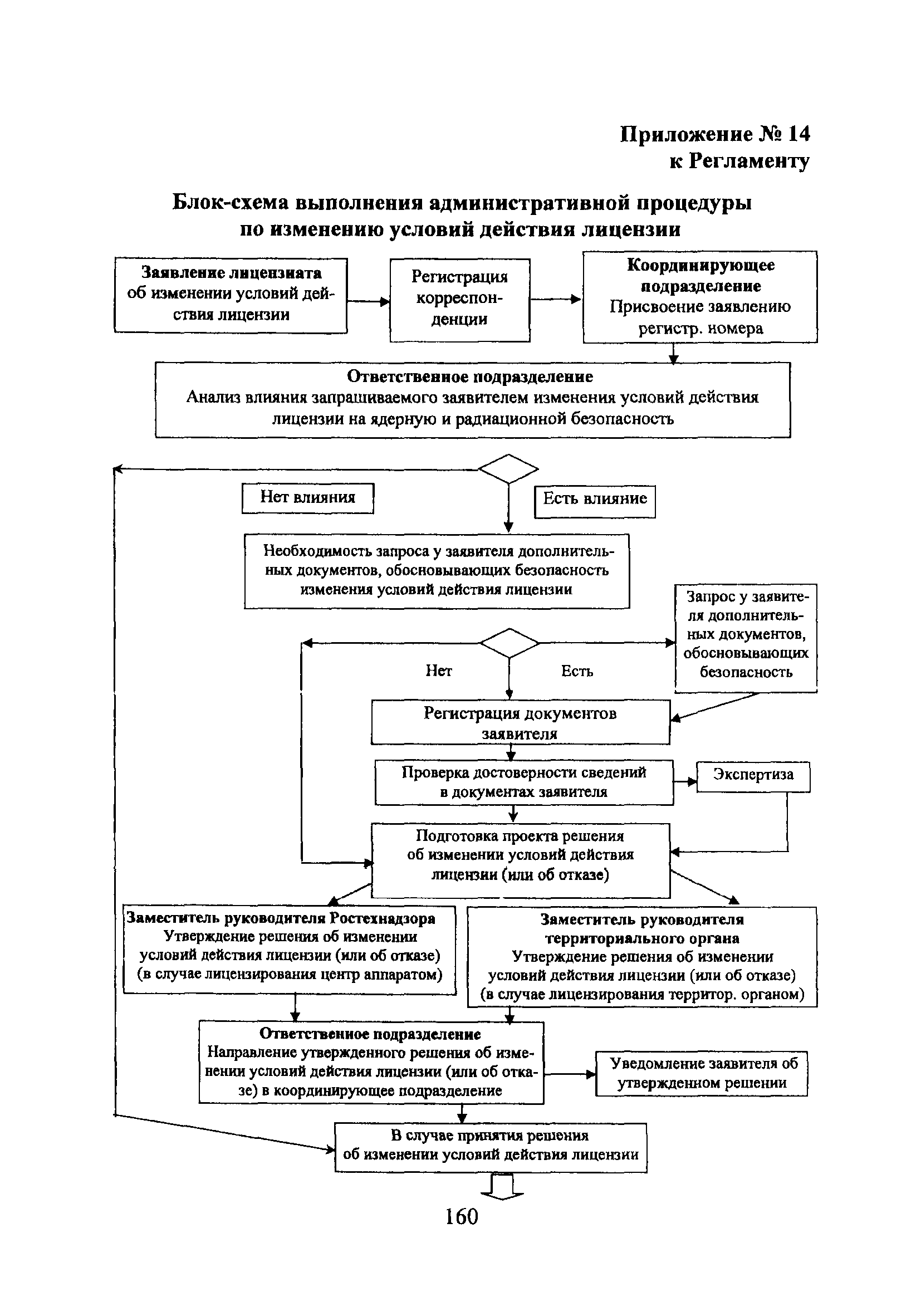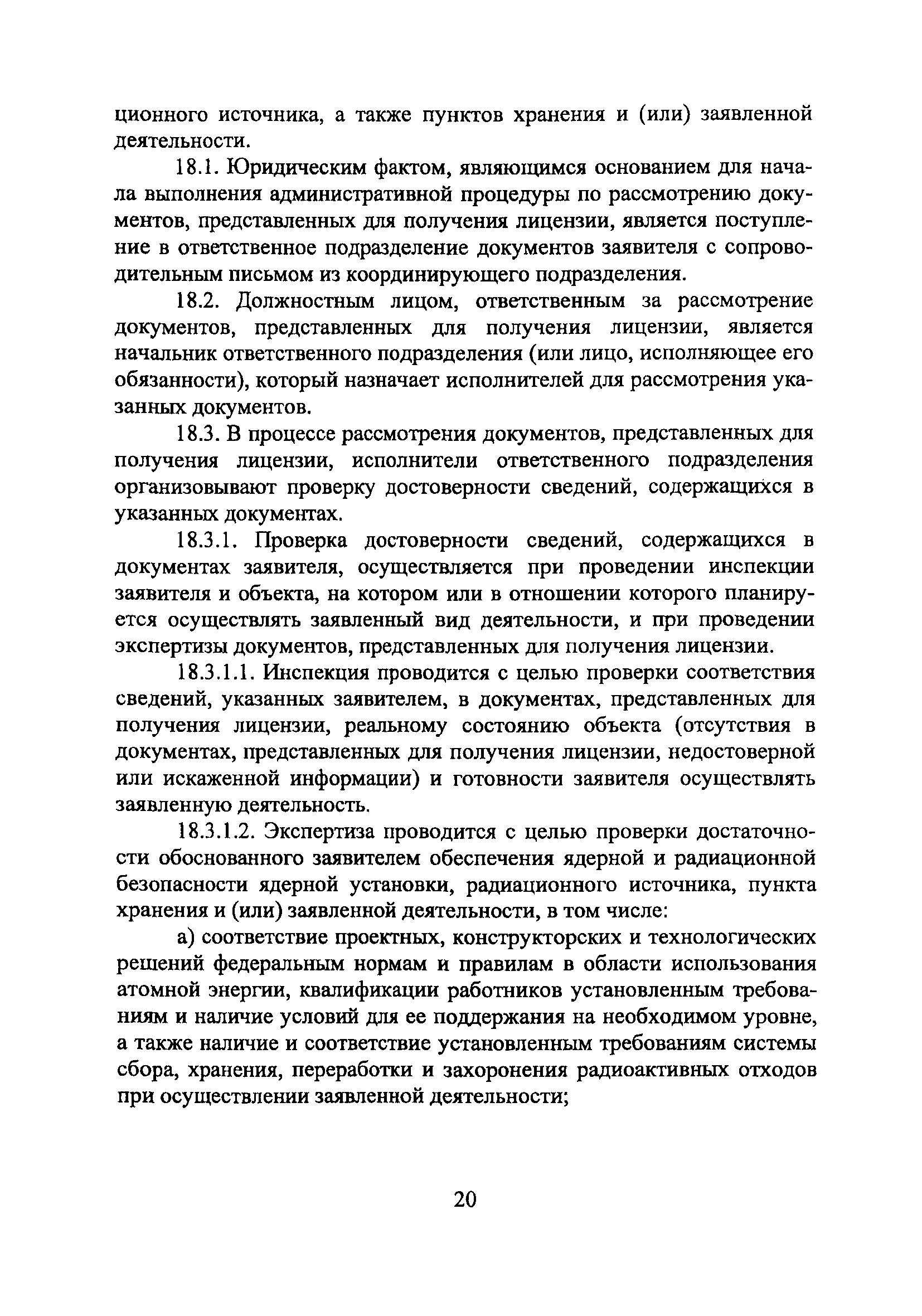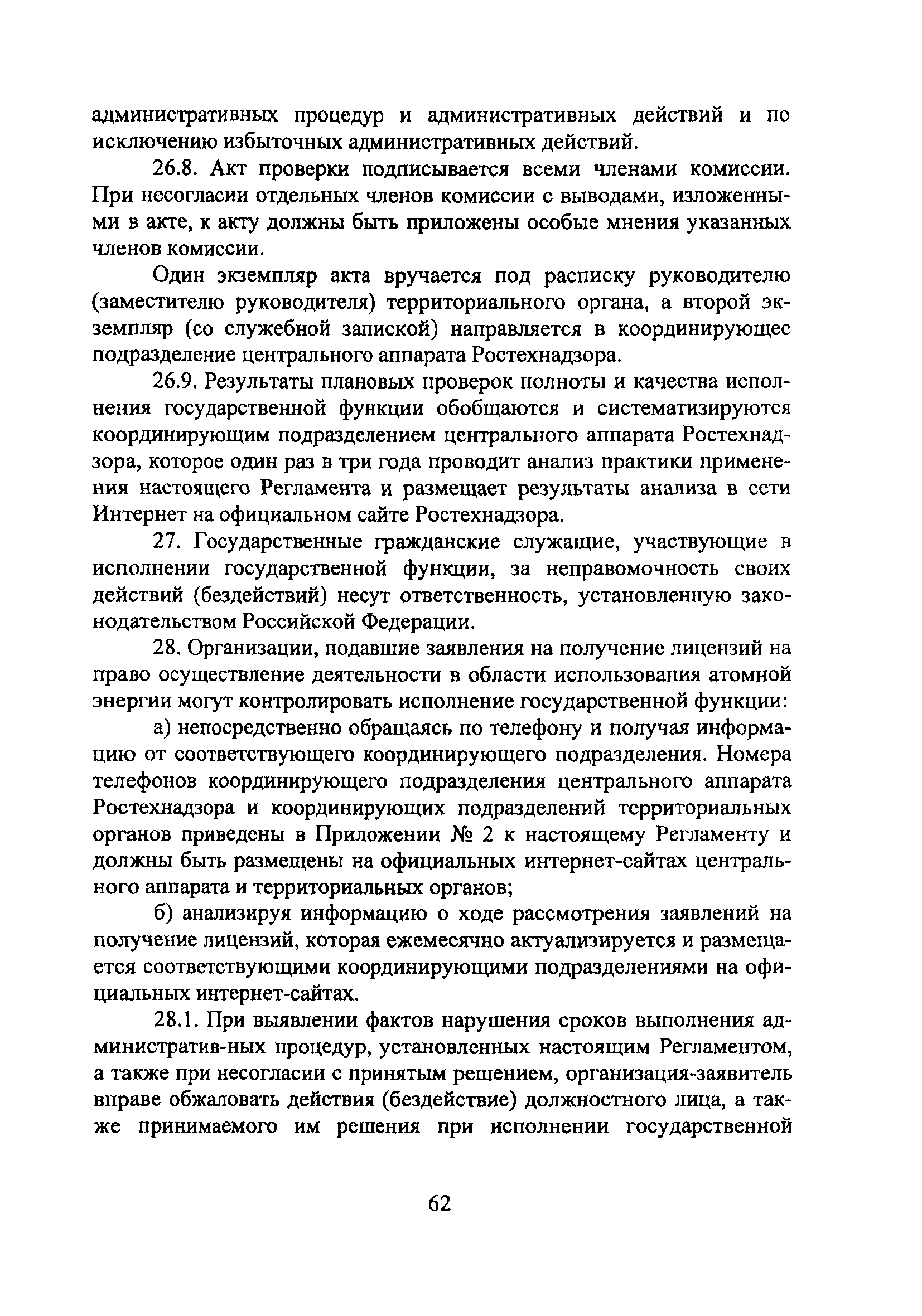 | Оглавление: | I. Общие положения II. Требования к порядку исполнения государственной функции по лицензированию деятельности в области использования атомной энергии III. Административные процедуры IV. Порядок и формы контроля за исполнением государственной функции V. Порядок обжалования действий (бездействия) должностного лица, а также принимаемого им решения при исполнении государственной функции по лицензированию деятельности в области использования атомной энергии Приложение № 1 Разграничение полномочий между центральным аппаратом Ростехнадзора и его территориальными органами при исполнении государственной функции по лицензированию деятельности в области использования атомной энергии и максимальные сроки проведения экспертизы документов, представленных для получения лицензии Приложение № 2 Перечень субъектов Российской Федерации, на территории которых территориальные органы Ростехнадзора исполняют государственную функцию по лицензированию деятельности в области использования атомной энергии Приложение № 3 Обобщенная информация о ходе рассмотрения заявлений на получение лицензий Приложение № 4 Требования к составу комплекта документов, обосновывающих обеспечение ядерной и радиационной безопасности ядерной установки, радиационного источника, пункта хранения и (или) заявленной деятельности, определенные Федеральной службой по экологическому, технологическому и атомному надзору в соответствии с п. 11 ж) Положения о лицензировании деятельности в области использования атомной энергии Приложение № 5 Блок-схема выполнения административной процедуры по рассмотрению заявления о выдаче лицензии и проведению предварительной проверки документов Приложение № 6 Блок-схема выполнения административной процедуры по рассмотрению документов, представленных для получения лицензии Приложение № 7 Образец решения о выдаче лицензии (об отказе в выдаче лицензии) Приложение № 8 Образец лицензии Приложение № 9 Блок-схема выполнения административной процедуры по принятию решения о выдаче или отказе в выдаче лицензии Приложение № 10 Блок-схема выполнения административной процедуры по выдаче лицензии с установлением условий ее действия Приложение № 11 Блок-схема выполнения административной процедуры по сопровождению выданной лицензии путем проведения инспекции с целью проверки выполнения условий действия лицензии Приложение № 12 Образец решения о внесении или об отказе во внесении изменения в условия действия лицензии Приложение № 13 Образец изменения условий действия лицензии Приложение № 14 Блок-схема выполнения административной процедуры по изменению условий действия лицензии Приложение № 15 Образец решения о приостановлении или прекращении действия (аннулировании) лицензии Приложение № 16 Блок-схема выполнения административной процедуры по приостановлению или прекращению действия (аннулированию) лицензии Приложение № 17 Образец решения о возобновлении лицензии Приложение № 18 Блок-схема выполнения административной процедуры по возобновлению действия лицензии Приложение № 19 Блок-схема выполнения административной процедуры по выдаче дубликата лицензии Справочная информация (не является составной частью вышеприведенного Административного регламента) |