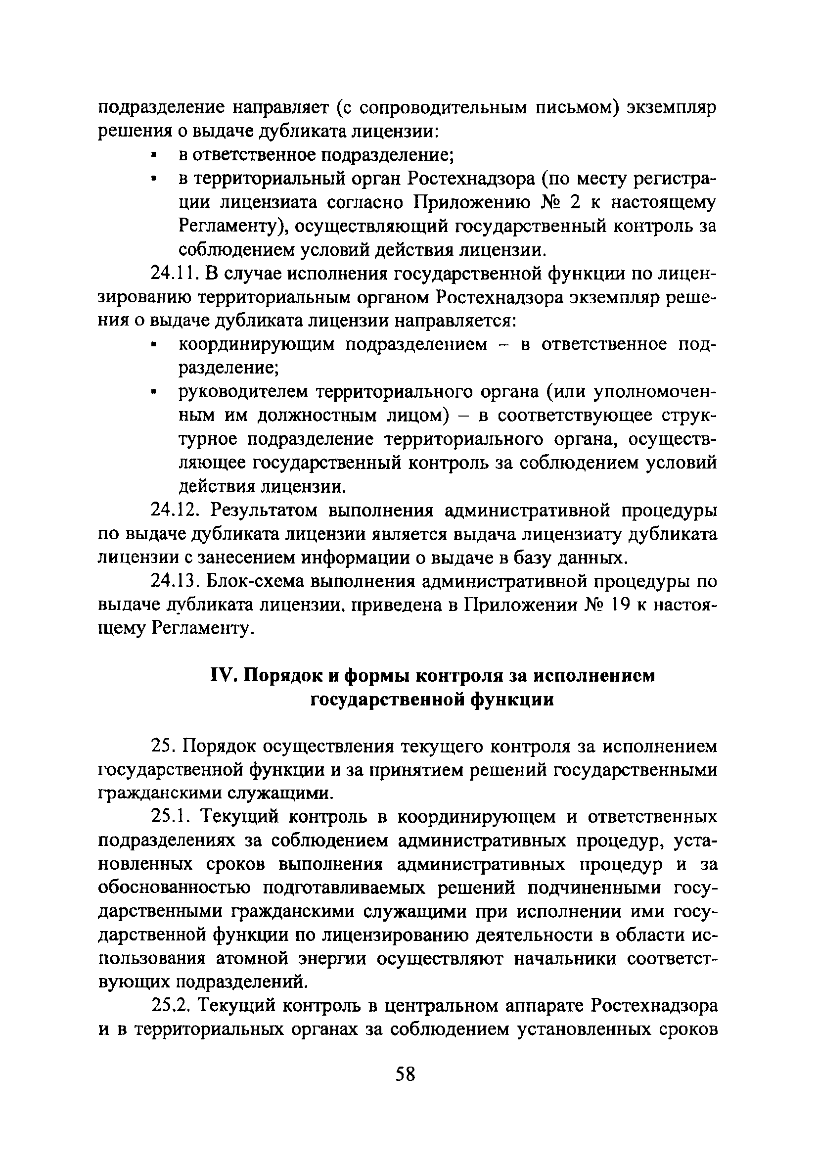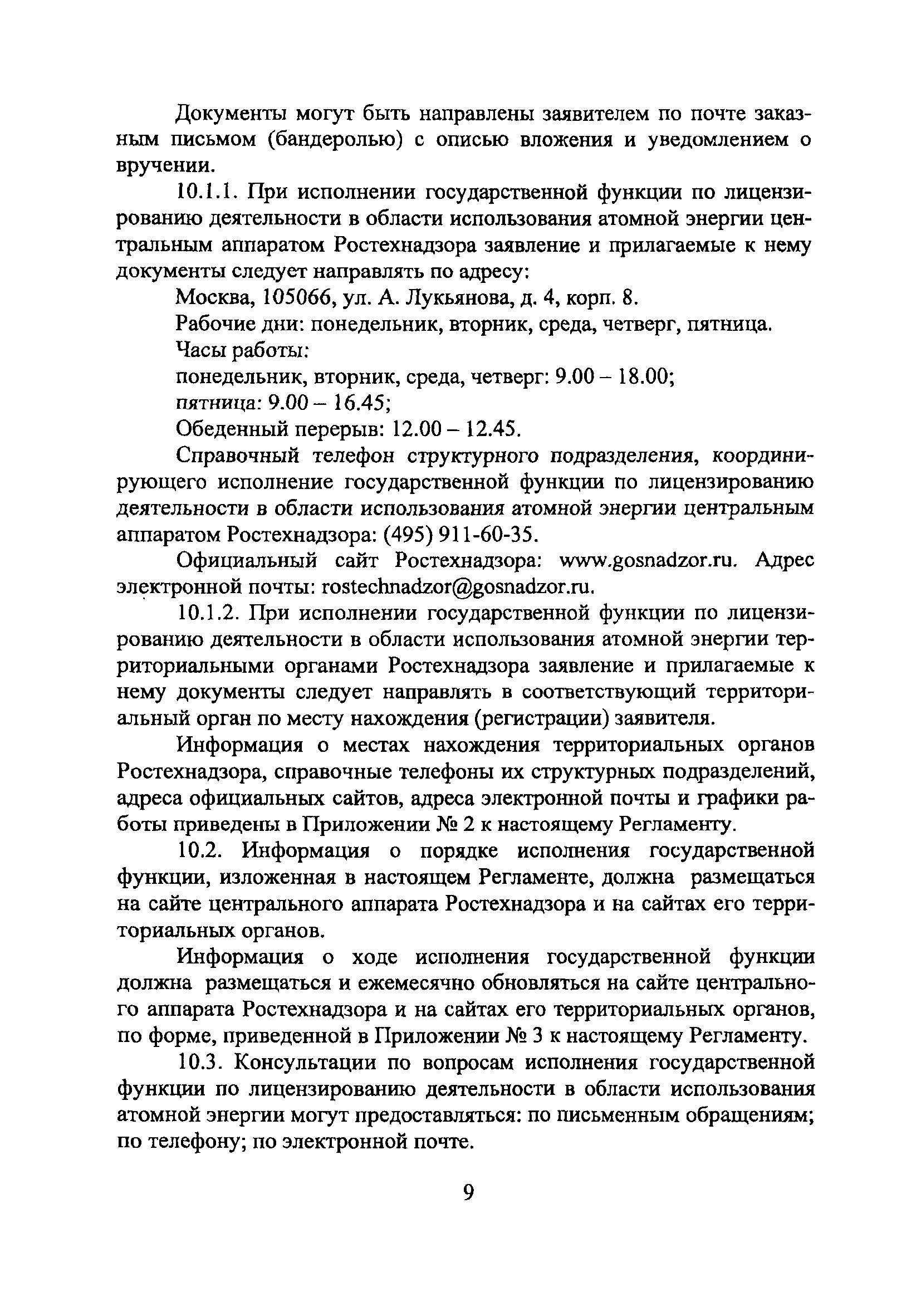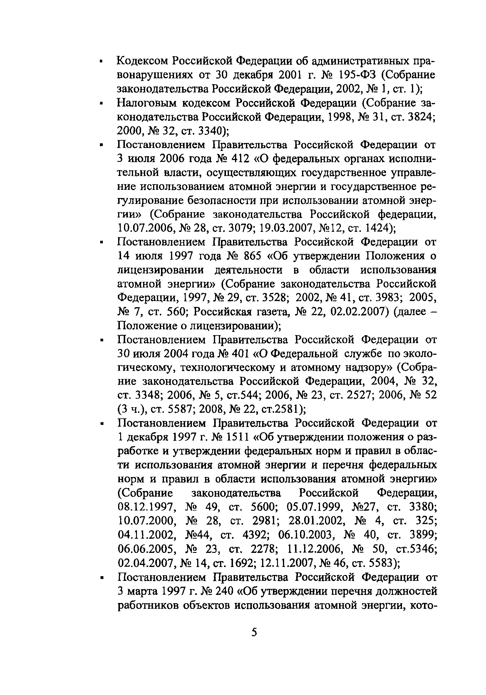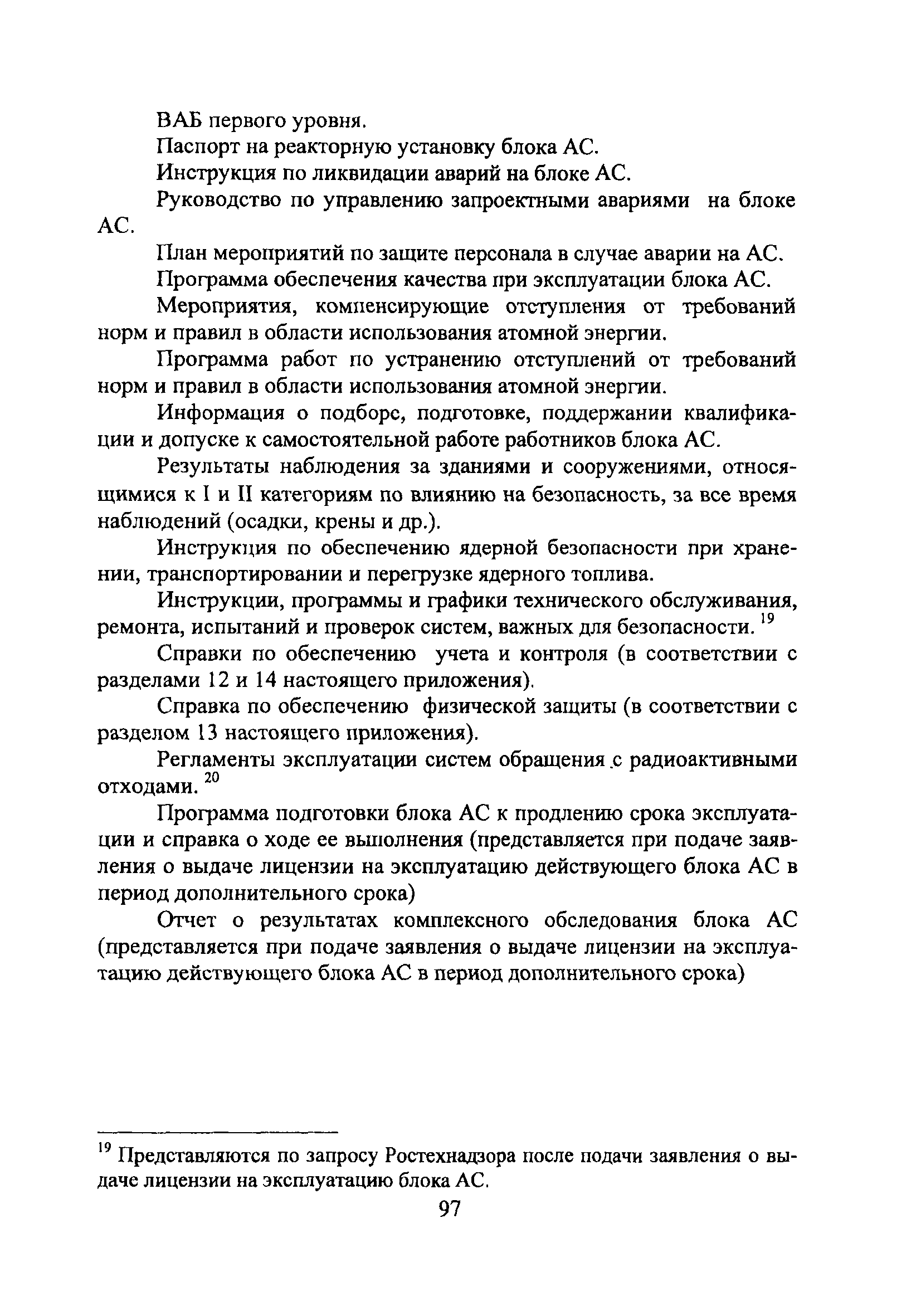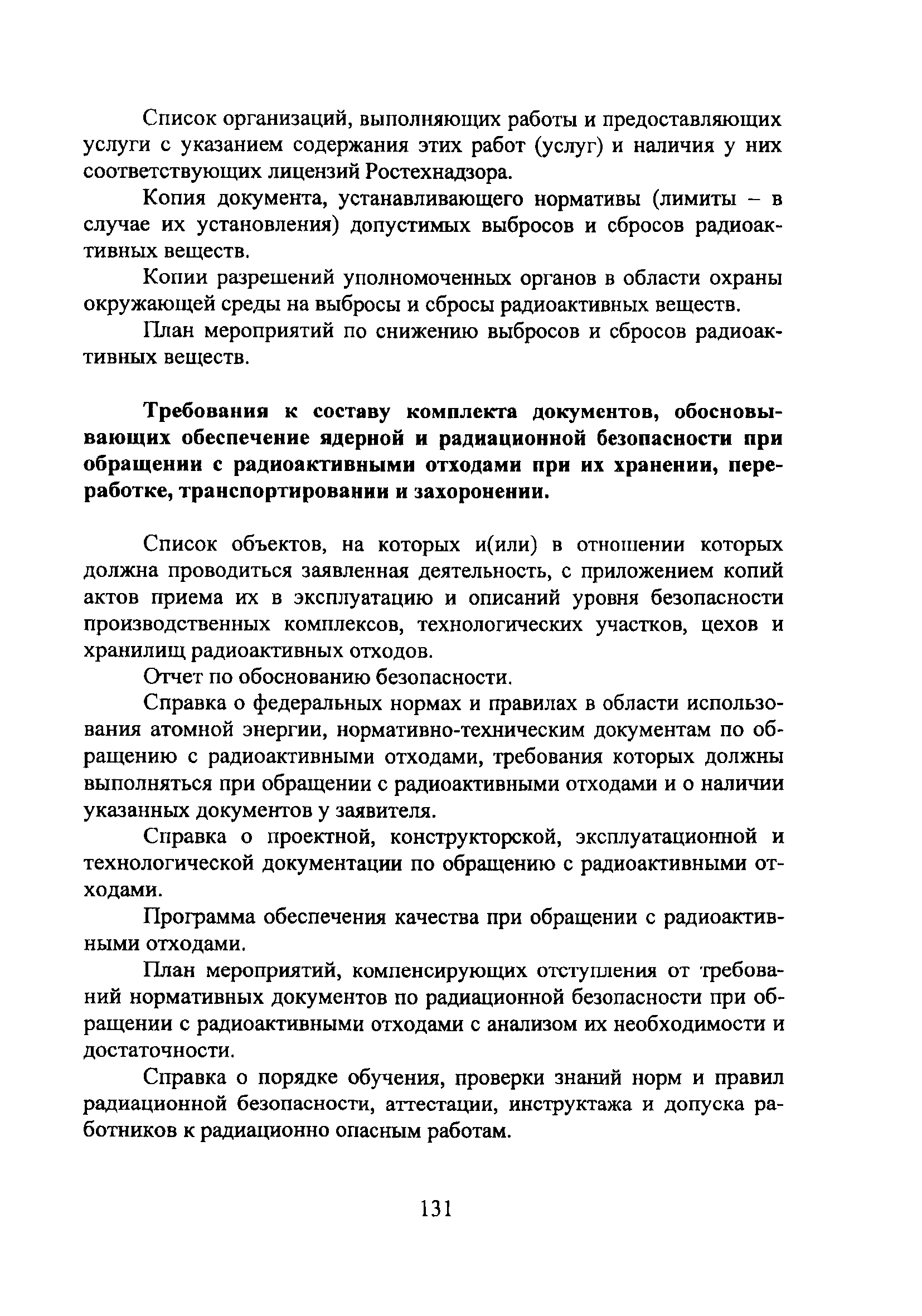 | Оглавление: | I. Общие положения II. Требования к порядку исполнения государственной функции по лицензированию деятельности в области использования атомной энергии III. Административные процедуры IV. Порядок и формы контроля за исполнением государственной функции V. Порядок обжалования действий (бездействия) должностного лица, а также принимаемого им решения при исполнении государственной функции по лицензированию деятельности в области использования атомной энергии Приложение № 1 Разграничение полномочий между центральным аппаратом Ростехнадзора и его территориальными органами при исполнении государственной функции по лицензированию деятельности в области использования атомной энергии и максимальные сроки проведения экспертизы документов, представленных для получения лицензии Приложение № 2 Перечень субъектов Российской Федерации, на территории которых территориальные органы Ростехнадзора исполняют государственную функцию по лицензированию деятельности в области использования атомной энергии Приложение № 3 Обобщенная информация о ходе рассмотрения заявлений на получение лицензий Приложение № 4 Требования к составу комплекта документов, обосновывающих обеспечение ядерной и радиационной безопасности ядерной установки, радиационного источника, пункта хранения и (или) заявленной деятельности, определенные Федеральной службой по экологическому, технологическому и атомному надзору в соответствии с п. 11 ж) Положения о лицензировании деятельности в области использования атомной энергии Приложение № 5 Блок-схема выполнения административной процедуры по рассмотрению заявления о выдаче лицензии и проведению предварительной проверки документов Приложение № 6 Блок-схема выполнения административной процедуры по рассмотрению документов, представленных для получения лицензии Приложение № 7 Образец решения о выдаче лицензии (об отказе в выдаче лицензии) Приложение № 8 Образец лицензии Приложение № 9 Блок-схема выполнения административной процедуры по принятию решения о выдаче или отказе в выдаче лицензии Приложение № 10 Блок-схема выполнения административной процедуры по выдаче лицензии с установлением условий ее действия Приложение № 11 Блок-схема выполнения административной процедуры по сопровождению выданной лицензии путем проведения инспекции с целью проверки выполнения условий действия лицензии Приложение № 12 Образец решения о внесении или об отказе во внесении изменения в условия действия лицензии Приложение № 13 Образец изменения условий действия лицензии Приложение № 14 Блок-схема выполнения административной процедуры по изменению условий действия лицензии Приложение № 15 Образец решения о приостановлении или прекращении действия (аннулировании) лицензии Приложение № 16 Блок-схема выполнения административной процедуры по приостановлению или прекращению действия (аннулированию) лицензии Приложение № 17 Образец решения о возобновлении лицензии Приложение № 18 Блок-схема выполнения административной процедуры по возобновлению действия лицензии Приложение № 19 Блок-схема выполнения административной процедуры по выдаче дубликата лицензии Справочная информация (не является составной частью вышеприведенного Административного регламента) |