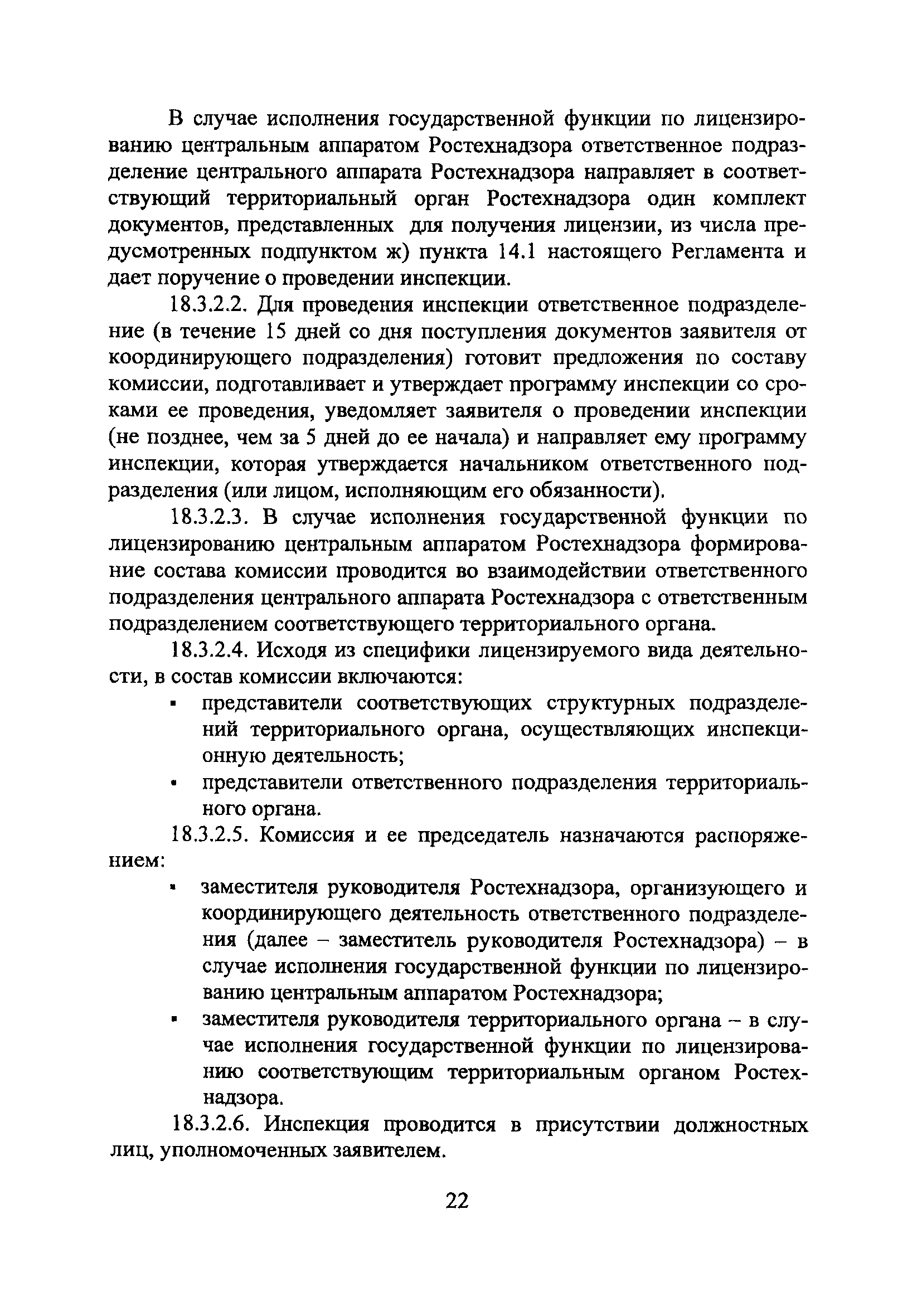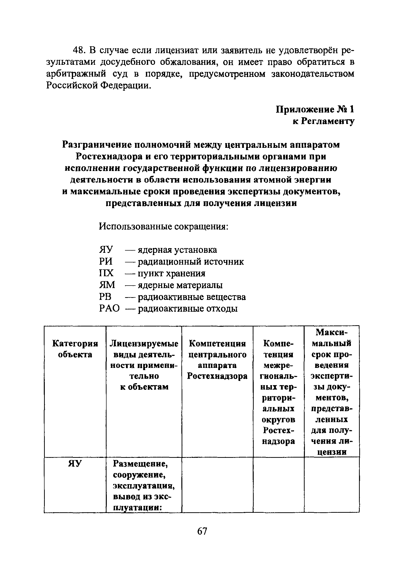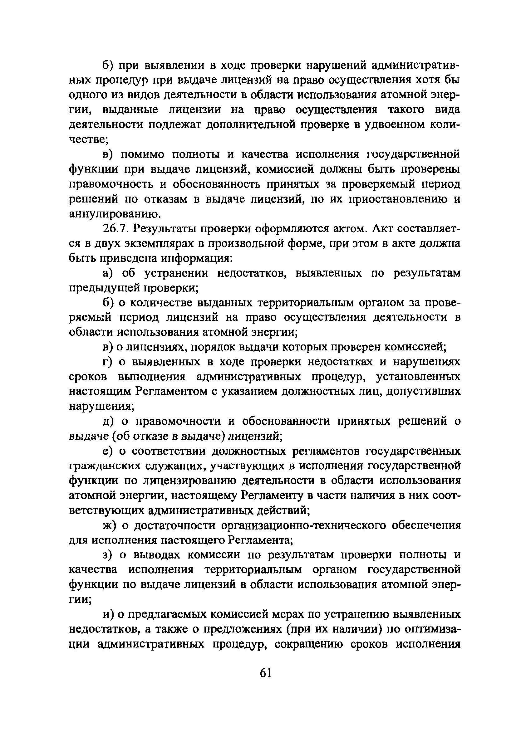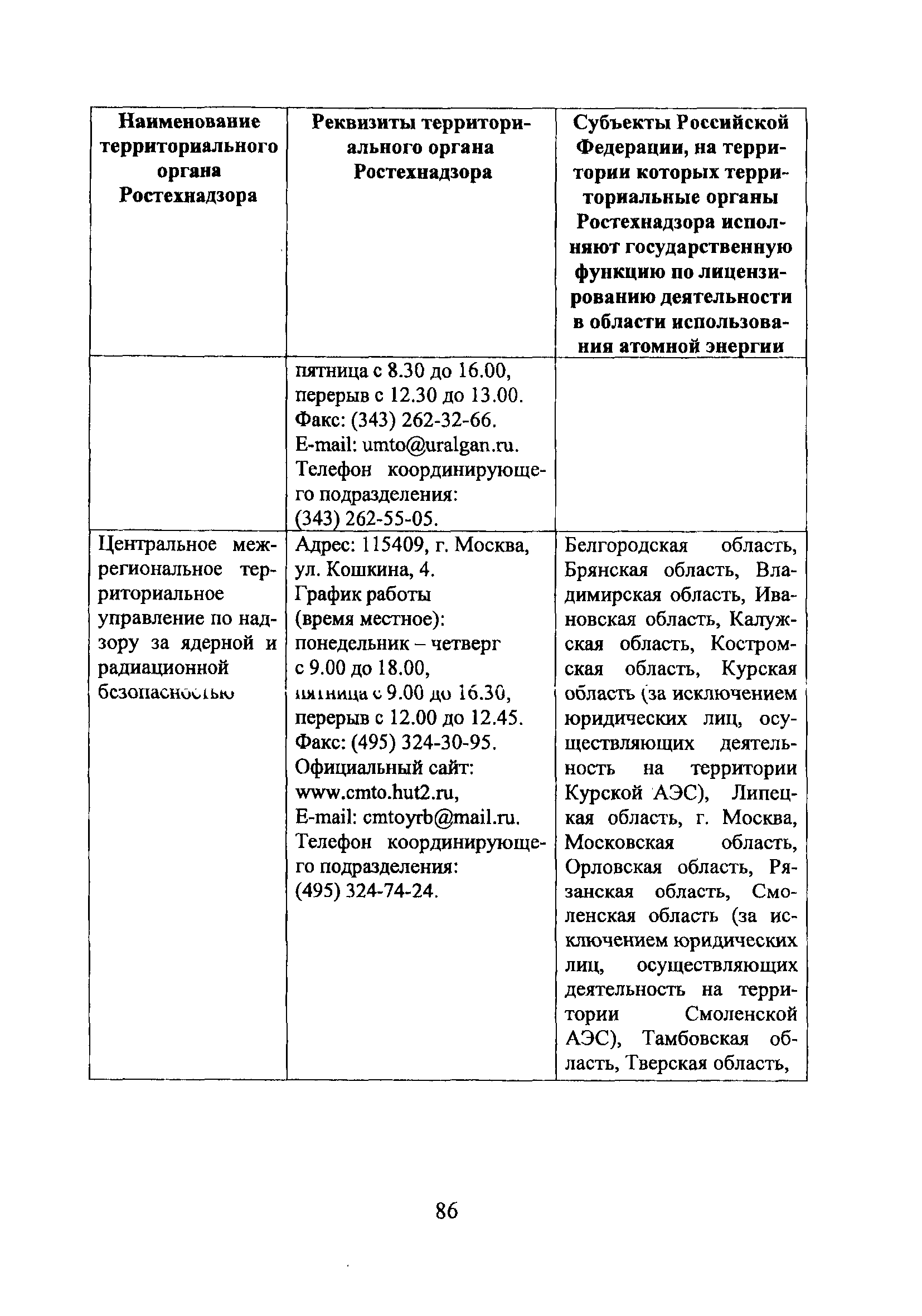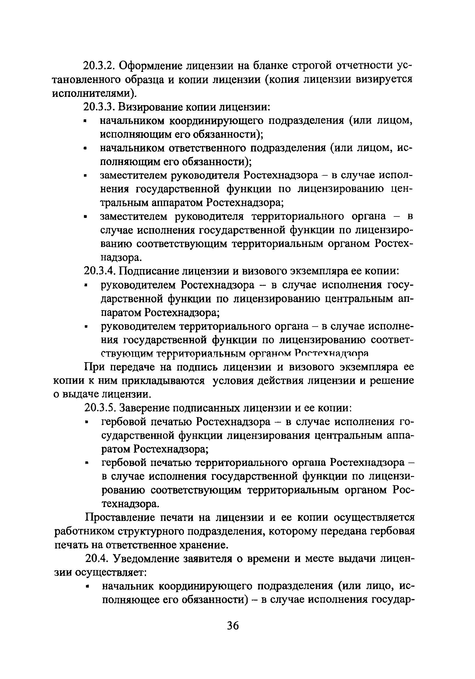 | Оглавление: | I. Общие положения II. Требования к порядку исполнения государственной функции по лицензированию деятельности в области использования атомной энергии III. Административные процедуры IV. Порядок и формы контроля за исполнением государственной функции V. Порядок обжалования действий (бездействия) должностного лица, а также принимаемого им решения при исполнении государственной функции по лицензированию деятельности в области использования атомной энергии Приложение № 1 Разграничение полномочий между центральным аппаратом Ростехнадзора и его территориальными органами при исполнении государственной функции по лицензированию деятельности в области использования атомной энергии и максимальные сроки проведения экспертизы документов, представленных для получения лицензии Приложение № 2 Перечень субъектов Российской Федерации, на территории которых территориальные органы Ростехнадзора исполняют государственную функцию по лицензированию деятельности в области использования атомной энергии Приложение № 3 Обобщенная информация о ходе рассмотрения заявлений на получение лицензий Приложение № 4 Требования к составу комплекта документов, обосновывающих обеспечение ядерной и радиационной безопасности ядерной установки, радиационного источника, пункта хранения и (или) заявленной деятельности, определенные Федеральной службой по экологическому, технологическому и атомному надзору в соответствии с п. 11 ж) Положения о лицензировании деятельности в области использования атомной энергии Приложение № 5 Блок-схема выполнения административной процедуры по рассмотрению заявления о выдаче лицензии и проведению предварительной проверки документов Приложение № 6 Блок-схема выполнения административной процедуры по рассмотрению документов, представленных для получения лицензии Приложение № 7 Образец решения о выдаче лицензии (об отказе в выдаче лицензии) Приложение № 8 Образец лицензии Приложение № 9 Блок-схема выполнения административной процедуры по принятию решения о выдаче или отказе в выдаче лицензии Приложение № 10 Блок-схема выполнения административной процедуры по выдаче лицензии с установлением условий ее действия Приложение № 11 Блок-схема выполнения административной процедуры по сопровождению выданной лицензии путем проведения инспекции с целью проверки выполнения условий действия лицензии Приложение № 12 Образец решения о внесении или об отказе во внесении изменения в условия действия лицензии Приложение № 13 Образец изменения условий действия лицензии Приложение № 14 Блок-схема выполнения административной процедуры по изменению условий действия лицензии Приложение № 15 Образец решения о приостановлении или прекращении действия (аннулировании) лицензии Приложение № 16 Блок-схема выполнения административной процедуры по приостановлению или прекращению действия (аннулированию) лицензии Приложение № 17 Образец решения о возобновлении лицензии Приложение № 18 Блок-схема выполнения административной процедуры по возобновлению действия лицензии Приложение № 19 Блок-схема выполнения административной процедуры по выдаче дубликата лицензии Справочная информация (не является составной частью вышеприведенного Административного регламента) |