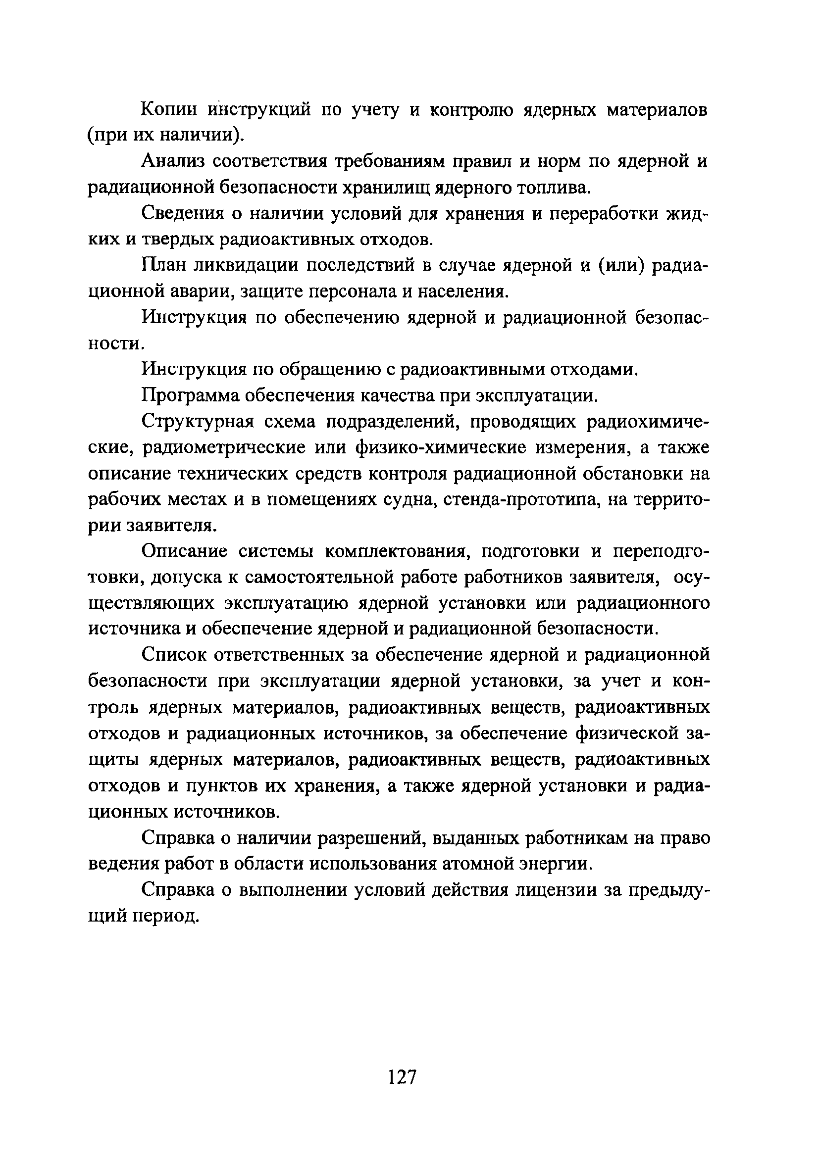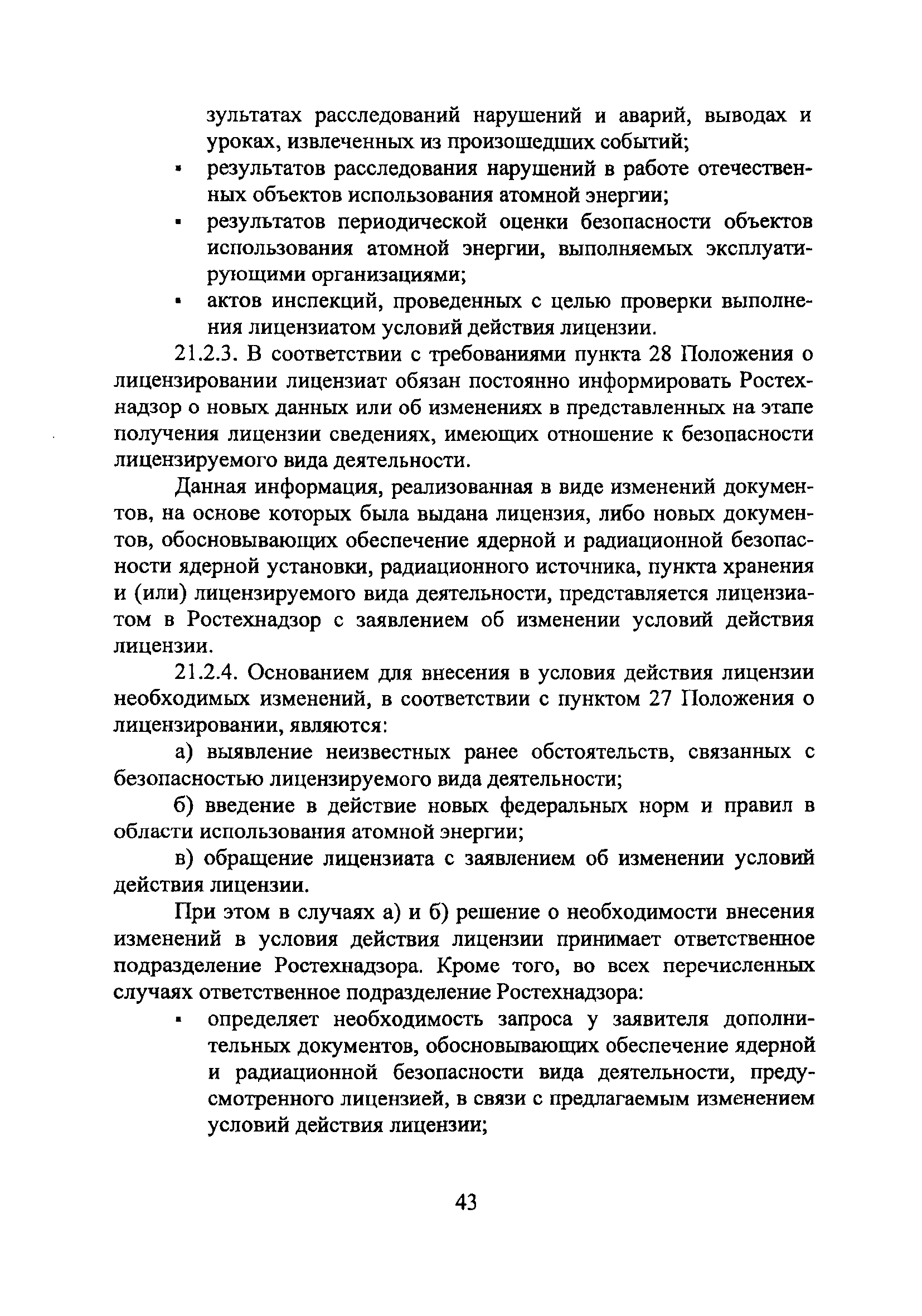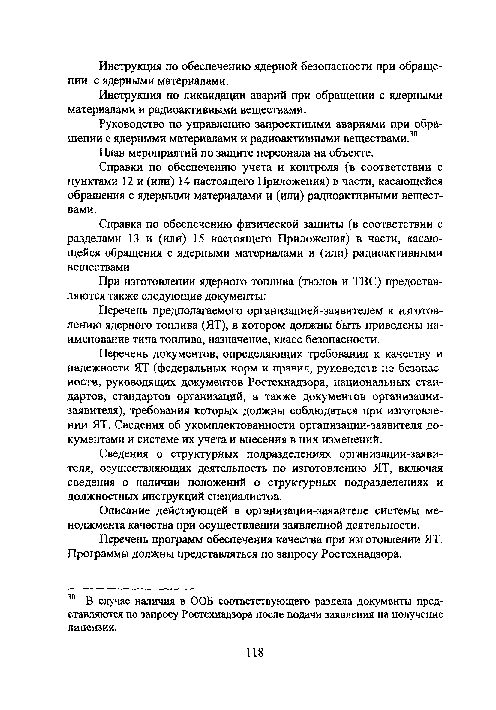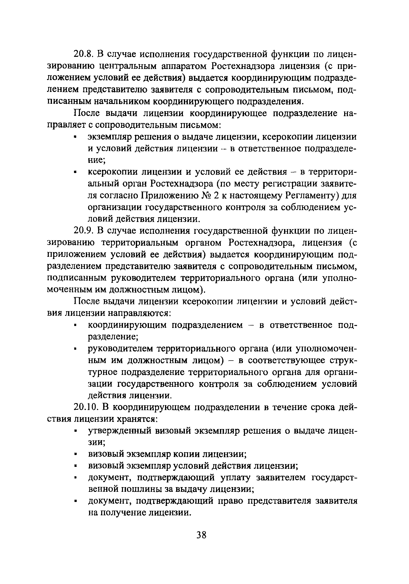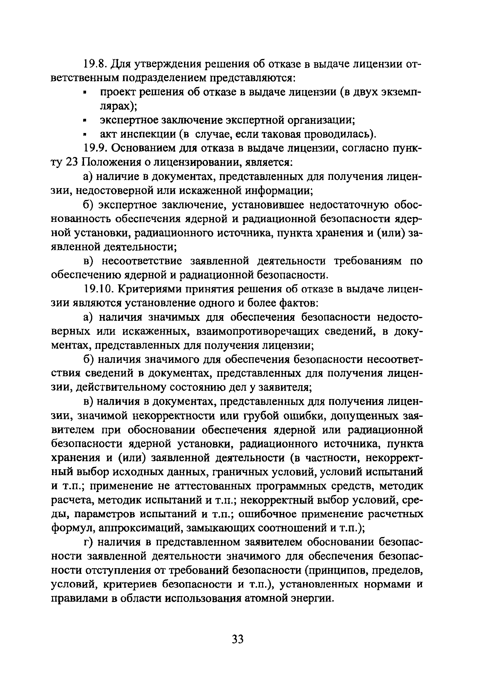 | Оглавление: | I. Общие положения II. Требования к порядку исполнения государственной функции по лицензированию деятельности в области использования атомной энергии III. Административные процедуры IV. Порядок и формы контроля за исполнением государственной функции V. Порядок обжалования действий (бездействия) должностного лица, а также принимаемого им решения при исполнении государственной функции по лицензированию деятельности в области использования атомной энергии Приложение № 1 Разграничение полномочий между центральным аппаратом Ростехнадзора и его территориальными органами при исполнении государственной функции по лицензированию деятельности в области использования атомной энергии и максимальные сроки проведения экспертизы документов, представленных для получения лицензии Приложение № 2 Перечень субъектов Российской Федерации, на территории которых территориальные органы Ростехнадзора исполняют государственную функцию по лицензированию деятельности в области использования атомной энергии Приложение № 3 Обобщенная информация о ходе рассмотрения заявлений на получение лицензий Приложение № 4 Требования к составу комплекта документов, обосновывающих обеспечение ядерной и радиационной безопасности ядерной установки, радиационного источника, пункта хранения и (или) заявленной деятельности, определенные Федеральной службой по экологическому, технологическому и атомному надзору в соответствии с п. 11 ж) Положения о лицензировании деятельности в области использования атомной энергии Приложение № 5 Блок-схема выполнения административной процедуры по рассмотрению заявления о выдаче лицензии и проведению предварительной проверки документов Приложение № 6 Блок-схема выполнения административной процедуры по рассмотрению документов, представленных для получения лицензии Приложение № 7 Образец решения о выдаче лицензии (об отказе в выдаче лицензии) Приложение № 8 Образец лицензии Приложение № 9 Блок-схема выполнения административной процедуры по принятию решения о выдаче или отказе в выдаче лицензии Приложение № 10 Блок-схема выполнения административной процедуры по выдаче лицензии с установлением условий ее действия Приложение № 11 Блок-схема выполнения административной процедуры по сопровождению выданной лицензии путем проведения инспекции с целью проверки выполнения условий действия лицензии Приложение № 12 Образец решения о внесении или об отказе во внесении изменения в условия действия лицензии Приложение № 13 Образец изменения условий действия лицензии Приложение № 14 Блок-схема выполнения административной процедуры по изменению условий действия лицензии Приложение № 15 Образец решения о приостановлении или прекращении действия (аннулировании) лицензии Приложение № 16 Блок-схема выполнения административной процедуры по приостановлению или прекращению действия (аннулированию) лицензии Приложение № 17 Образец решения о возобновлении лицензии Приложение № 18 Блок-схема выполнения административной процедуры по возобновлению действия лицензии Приложение № 19 Блок-схема выполнения административной процедуры по выдаче дубликата лицензии Справочная информация (не является составной частью вышеприведенного Административного регламента) |