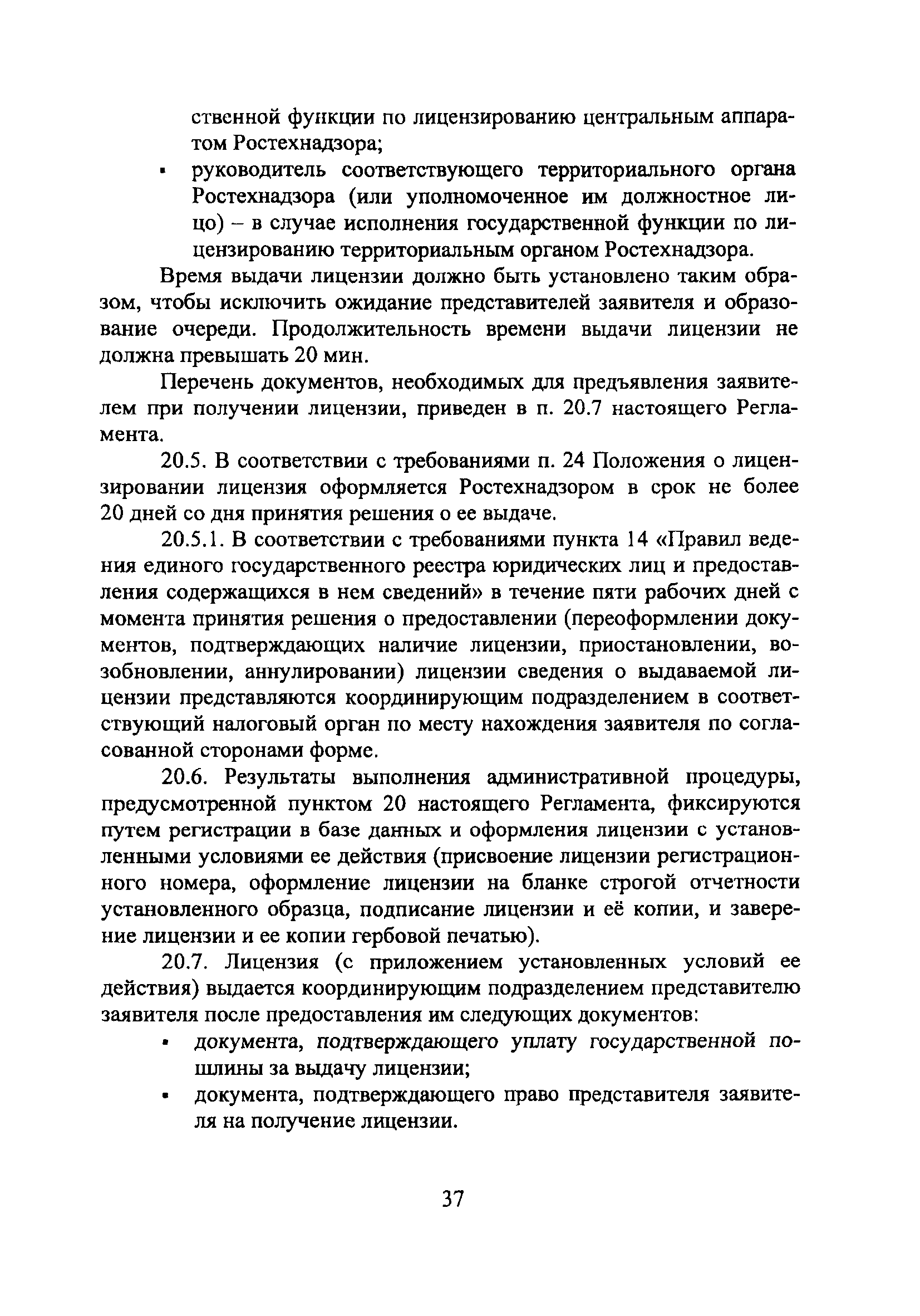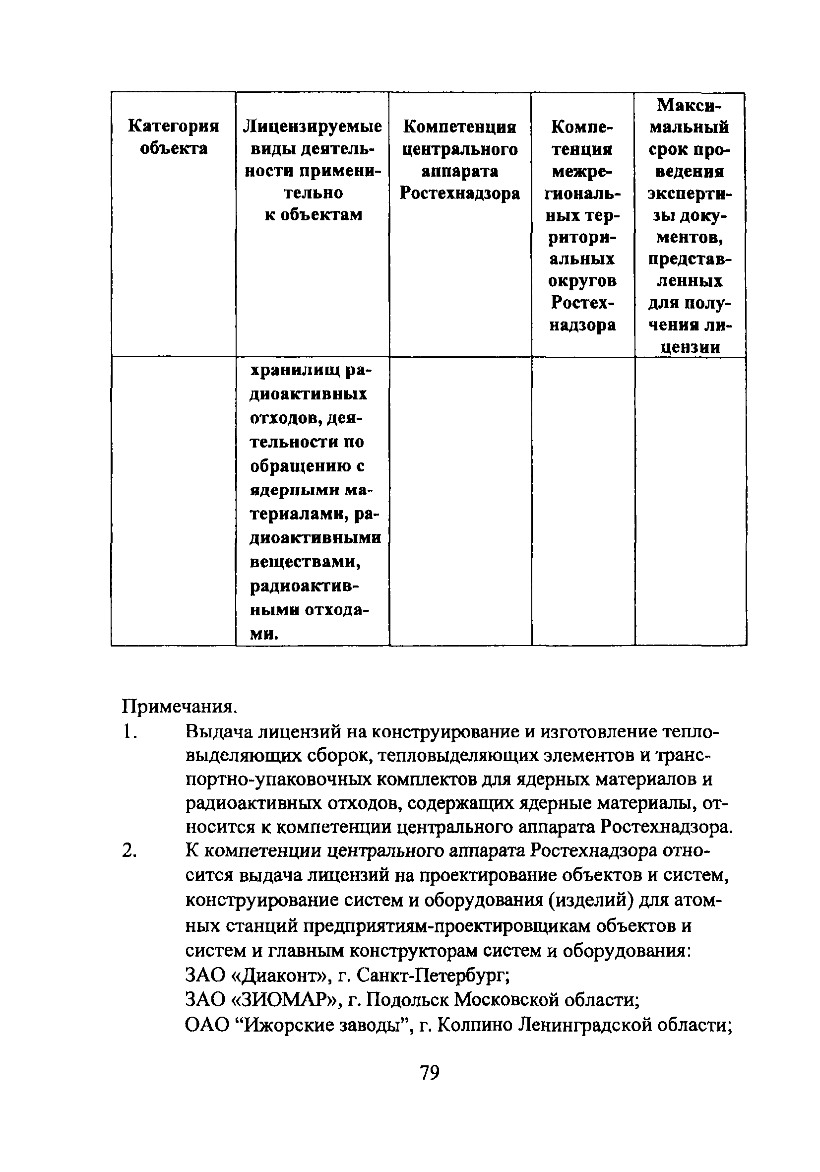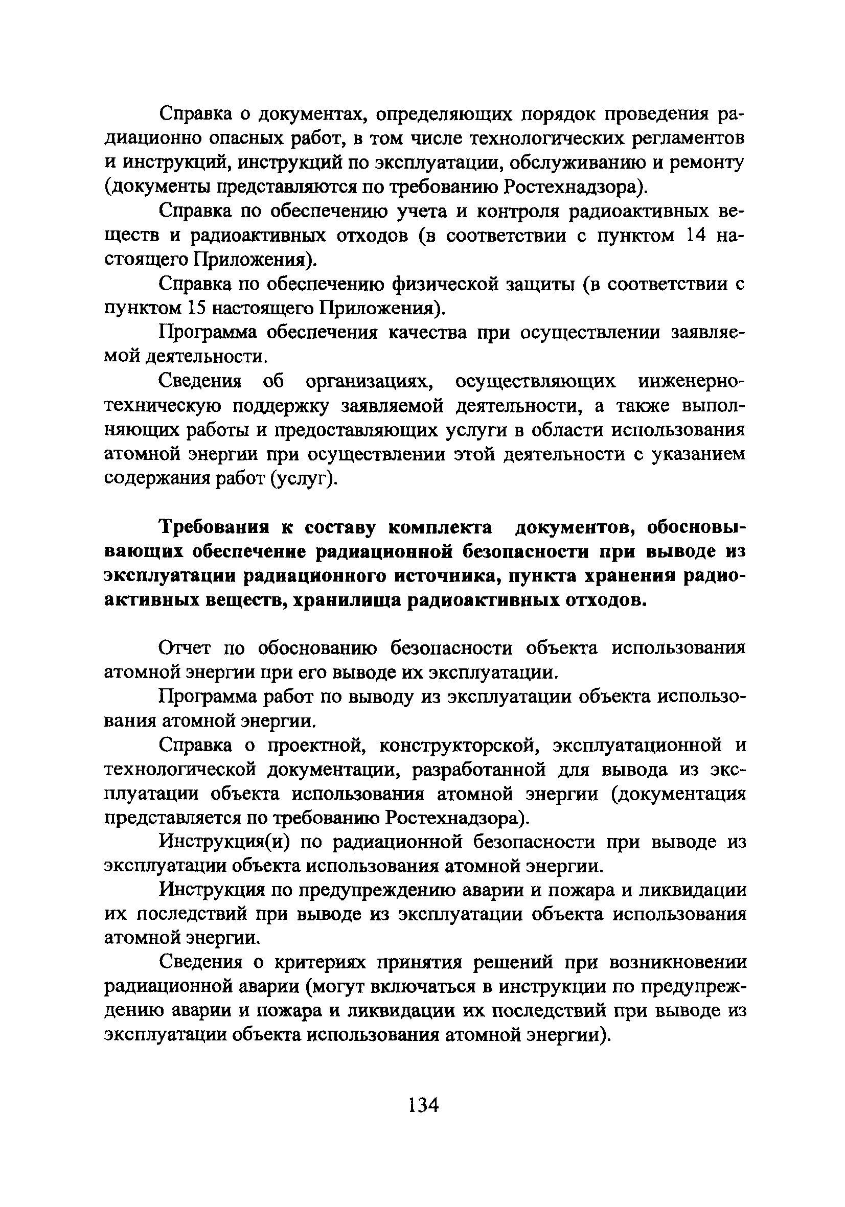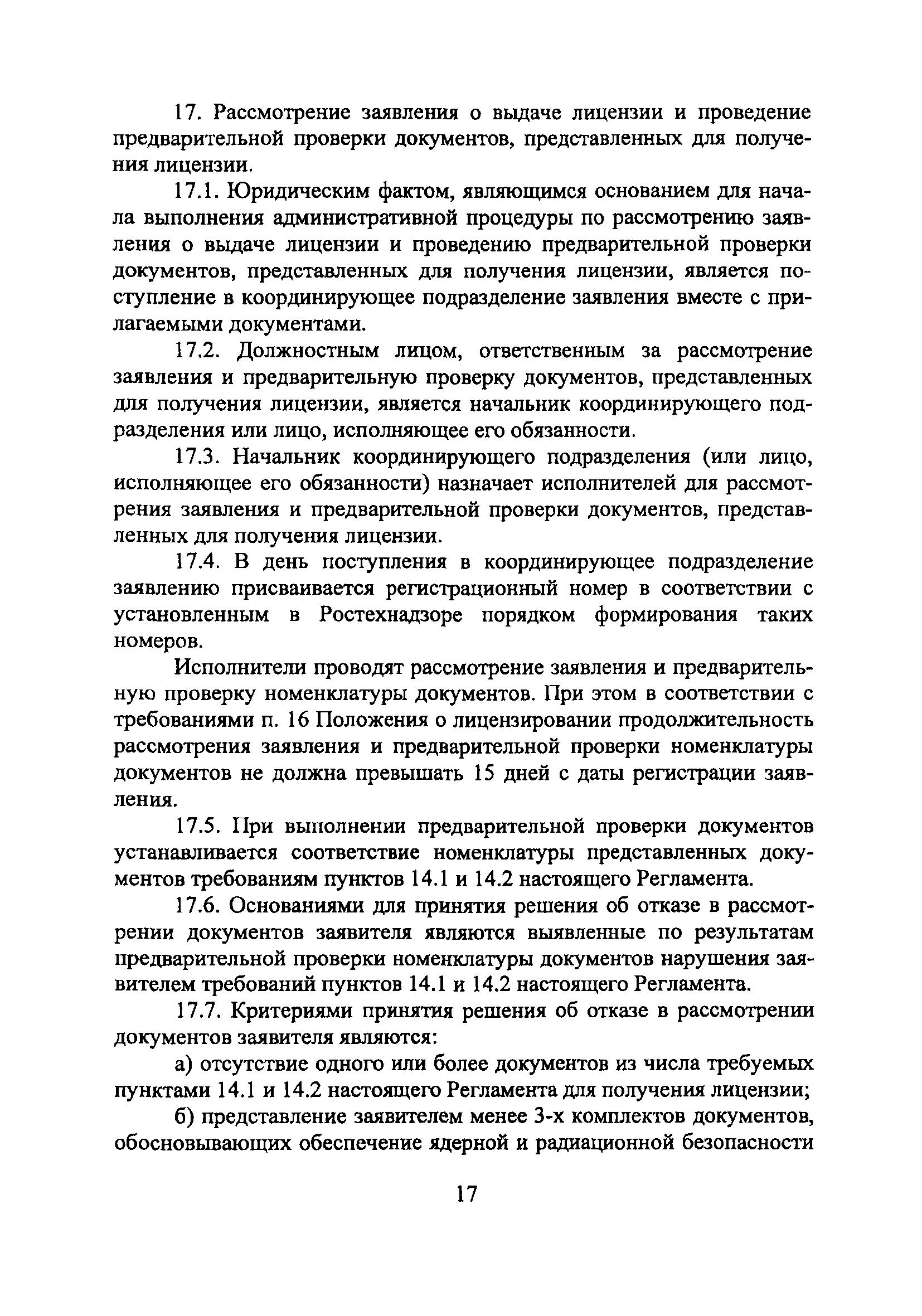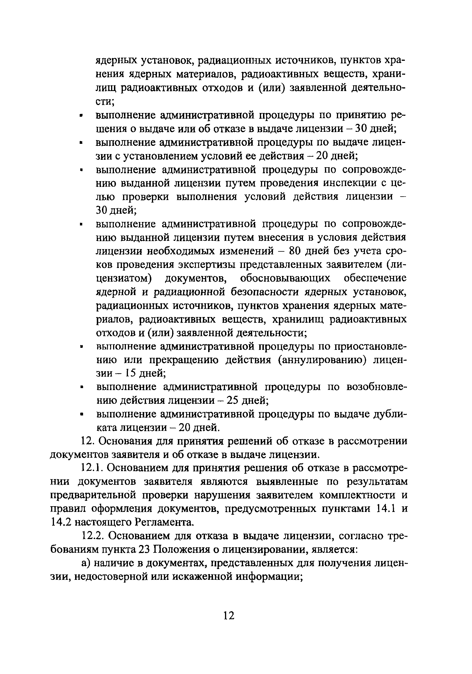 | Оглавление: | I. Общие положения II. Требования к порядку исполнения государственной функции по лицензированию деятельности в области использования атомной энергии III. Административные процедуры IV. Порядок и формы контроля за исполнением государственной функции V. Порядок обжалования действий (бездействия) должностного лица, а также принимаемого им решения при исполнении государственной функции по лицензированию деятельности в области использования атомной энергии Приложение № 1 Разграничение полномочий между центральным аппаратом Ростехнадзора и его территориальными органами при исполнении государственной функции по лицензированию деятельности в области использования атомной энергии и максимальные сроки проведения экспертизы документов, представленных для получения лицензии Приложение № 2 Перечень субъектов Российской Федерации, на территории которых территориальные органы Ростехнадзора исполняют государственную функцию по лицензированию деятельности в области использования атомной энергии Приложение № 3 Обобщенная информация о ходе рассмотрения заявлений на получение лицензий Приложение № 4 Требования к составу комплекта документов, обосновывающих обеспечение ядерной и радиационной безопасности ядерной установки, радиационного источника, пункта хранения и (или) заявленной деятельности, определенные Федеральной службой по экологическому, технологическому и атомному надзору в соответствии с п. 11 ж) Положения о лицензировании деятельности в области использования атомной энергии Приложение № 5 Блок-схема выполнения административной процедуры по рассмотрению заявления о выдаче лицензии и проведению предварительной проверки документов Приложение № 6 Блок-схема выполнения административной процедуры по рассмотрению документов, представленных для получения лицензии Приложение № 7 Образец решения о выдаче лицензии (об отказе в выдаче лицензии) Приложение № 8 Образец лицензии Приложение № 9 Блок-схема выполнения административной процедуры по принятию решения о выдаче или отказе в выдаче лицензии Приложение № 10 Блок-схема выполнения административной процедуры по выдаче лицензии с установлением условий ее действия Приложение № 11 Блок-схема выполнения административной процедуры по сопровождению выданной лицензии путем проведения инспекции с целью проверки выполнения условий действия лицензии Приложение № 12 Образец решения о внесении или об отказе во внесении изменения в условия действия лицензии Приложение № 13 Образец изменения условий действия лицензии Приложение № 14 Блок-схема выполнения административной процедуры по изменению условий действия лицензии Приложение № 15 Образец решения о приостановлении или прекращении действия (аннулировании) лицензии Приложение № 16 Блок-схема выполнения административной процедуры по приостановлению или прекращению действия (аннулированию) лицензии Приложение № 17 Образец решения о возобновлении лицензии Приложение № 18 Блок-схема выполнения административной процедуры по возобновлению действия лицензии Приложение № 19 Блок-схема выполнения административной процедуры по выдаче дубликата лицензии Справочная информация (не является составной частью вышеприведенного Административного регламента) |