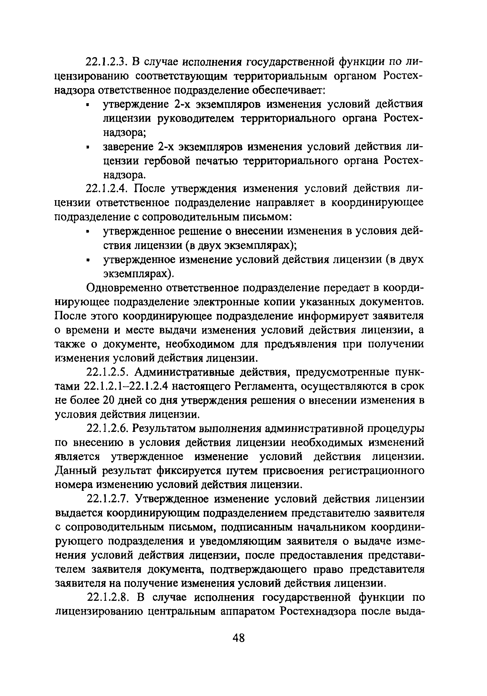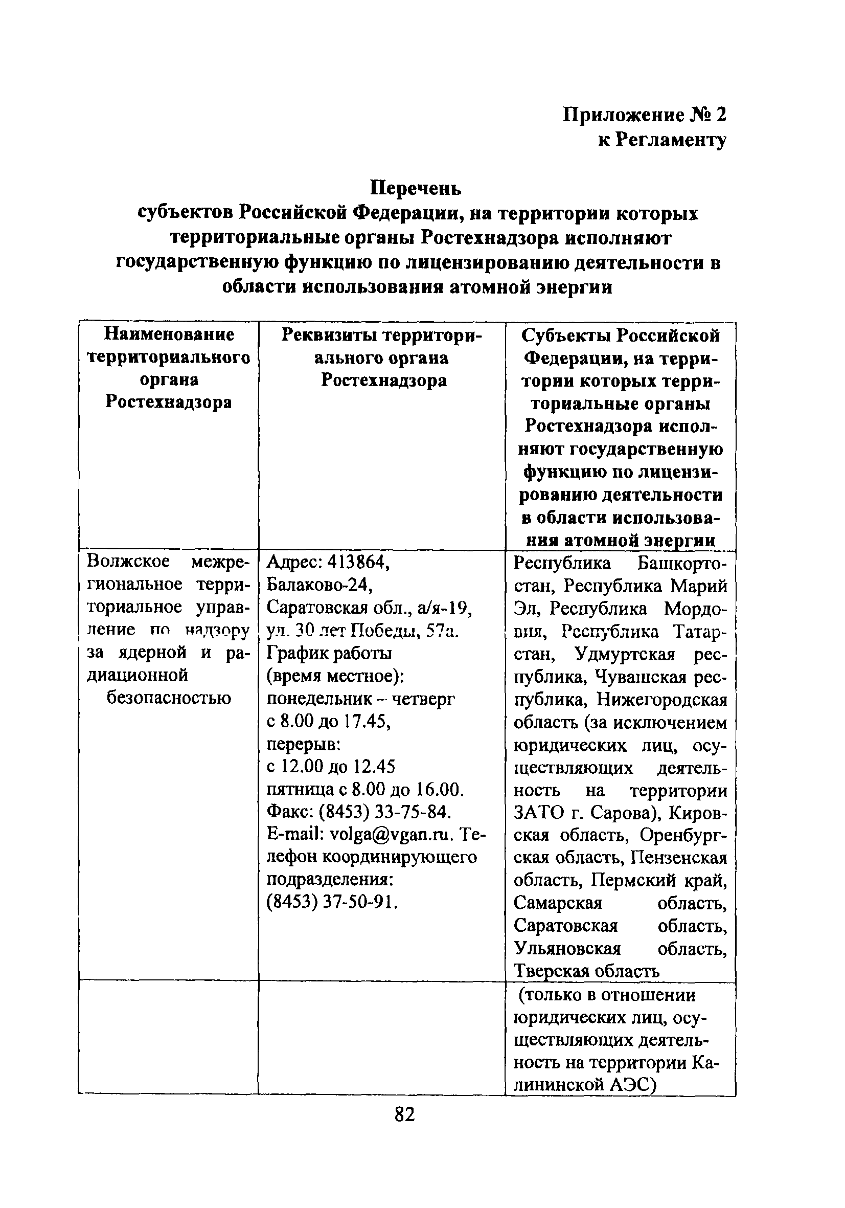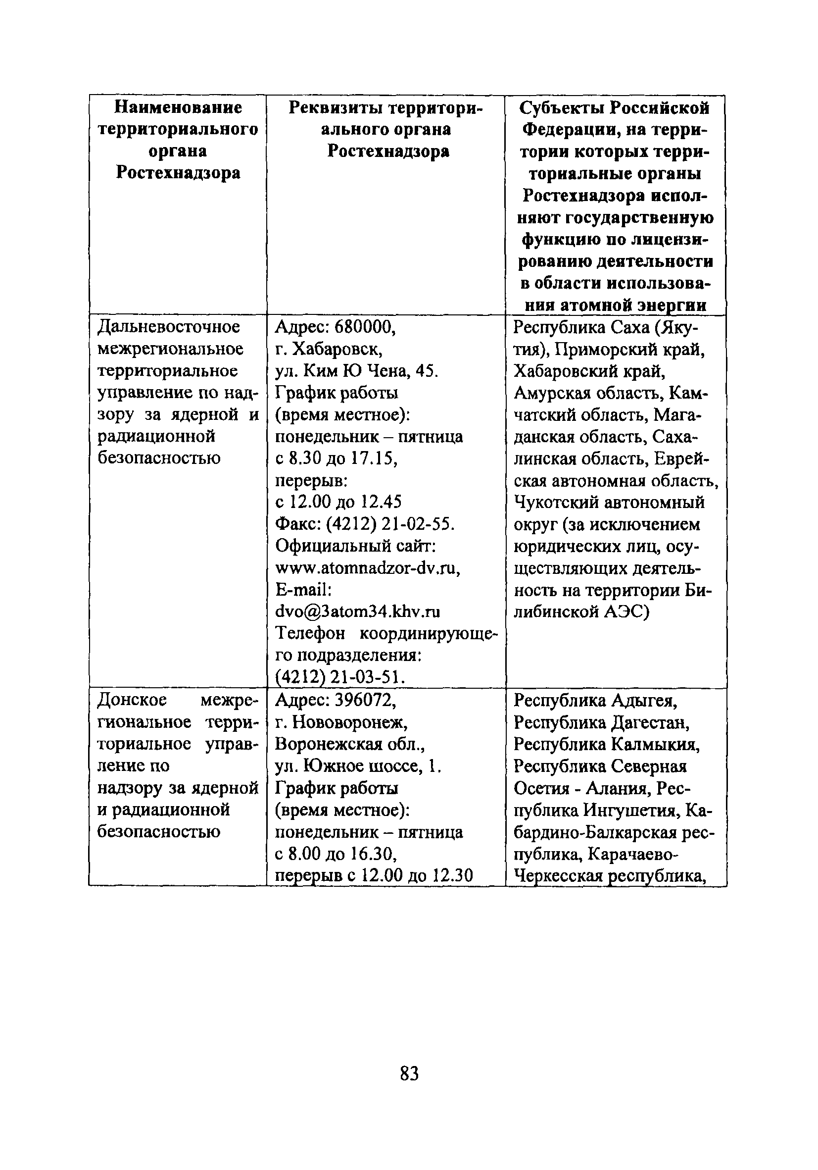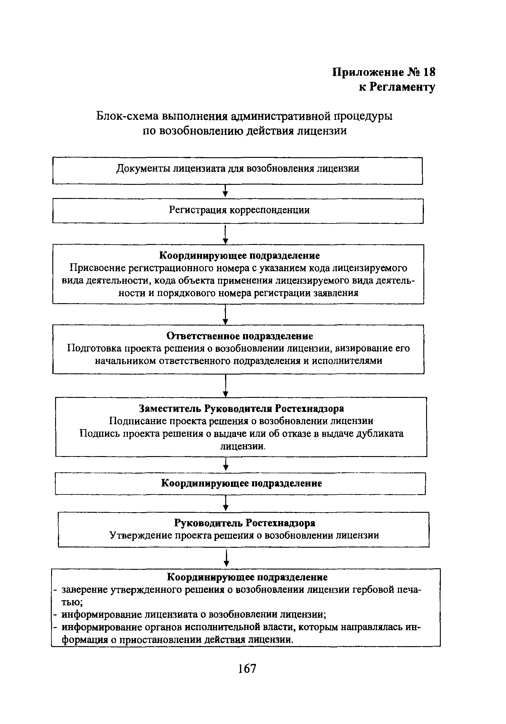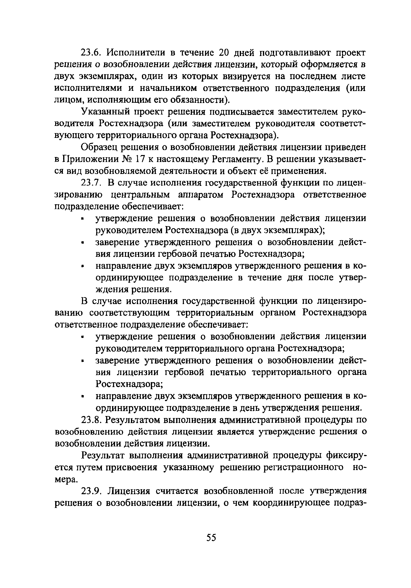 | Оглавление: | I. Общие положения II. Требования к порядку исполнения государственной функции по лицензированию деятельности в области использования атомной энергии III. Административные процедуры IV. Порядок и формы контроля за исполнением государственной функции V. Порядок обжалования действий (бездействия) должностного лица, а также принимаемого им решения при исполнении государственной функции по лицензированию деятельности в области использования атомной энергии Приложение № 1 Разграничение полномочий между центральным аппаратом Ростехнадзора и его территориальными органами при исполнении государственной функции по лицензированию деятельности в области использования атомной энергии и максимальные сроки проведения экспертизы документов, представленных для получения лицензии Приложение № 2 Перечень субъектов Российской Федерации, на территории которых территориальные органы Ростехнадзора исполняют государственную функцию по лицензированию деятельности в области использования атомной энергии Приложение № 3 Обобщенная информация о ходе рассмотрения заявлений на получение лицензий Приложение № 4 Требования к составу комплекта документов, обосновывающих обеспечение ядерной и радиационной безопасности ядерной установки, радиационного источника, пункта хранения и (или) заявленной деятельности, определенные Федеральной службой по экологическому, технологическому и атомному надзору в соответствии с п. 11 ж) Положения о лицензировании деятельности в области использования атомной энергии Приложение № 5 Блок-схема выполнения административной процедуры по рассмотрению заявления о выдаче лицензии и проведению предварительной проверки документов Приложение № 6 Блок-схема выполнения административной процедуры по рассмотрению документов, представленных для получения лицензии Приложение № 7 Образец решения о выдаче лицензии (об отказе в выдаче лицензии) Приложение № 8 Образец лицензии Приложение № 9 Блок-схема выполнения административной процедуры по принятию решения о выдаче или отказе в выдаче лицензии Приложение № 10 Блок-схема выполнения административной процедуры по выдаче лицензии с установлением условий ее действия Приложение № 11 Блок-схема выполнения административной процедуры по сопровождению выданной лицензии путем проведения инспекции с целью проверки выполнения условий действия лицензии Приложение № 12 Образец решения о внесении или об отказе во внесении изменения в условия действия лицензии Приложение № 13 Образец изменения условий действия лицензии Приложение № 14 Блок-схема выполнения административной процедуры по изменению условий действия лицензии Приложение № 15 Образец решения о приостановлении или прекращении действия (аннулировании) лицензии Приложение № 16 Блок-схема выполнения административной процедуры по приостановлению или прекращению действия (аннулированию) лицензии Приложение № 17 Образец решения о возобновлении лицензии Приложение № 18 Блок-схема выполнения административной процедуры по возобновлению действия лицензии Приложение № 19 Блок-схема выполнения административной процедуры по выдаче дубликата лицензии Справочная информация (не является составной частью вышеприведенного Административного регламента) |