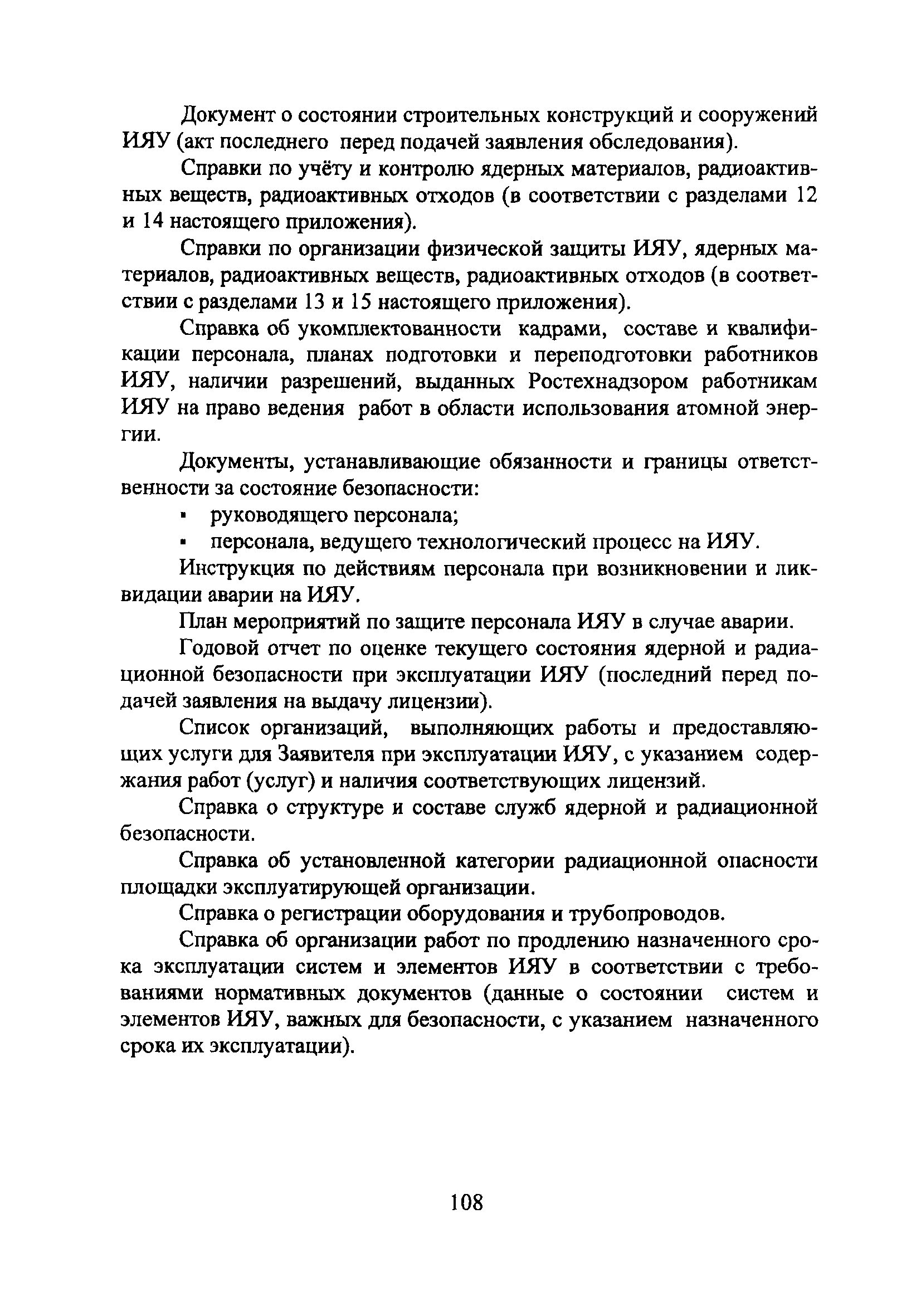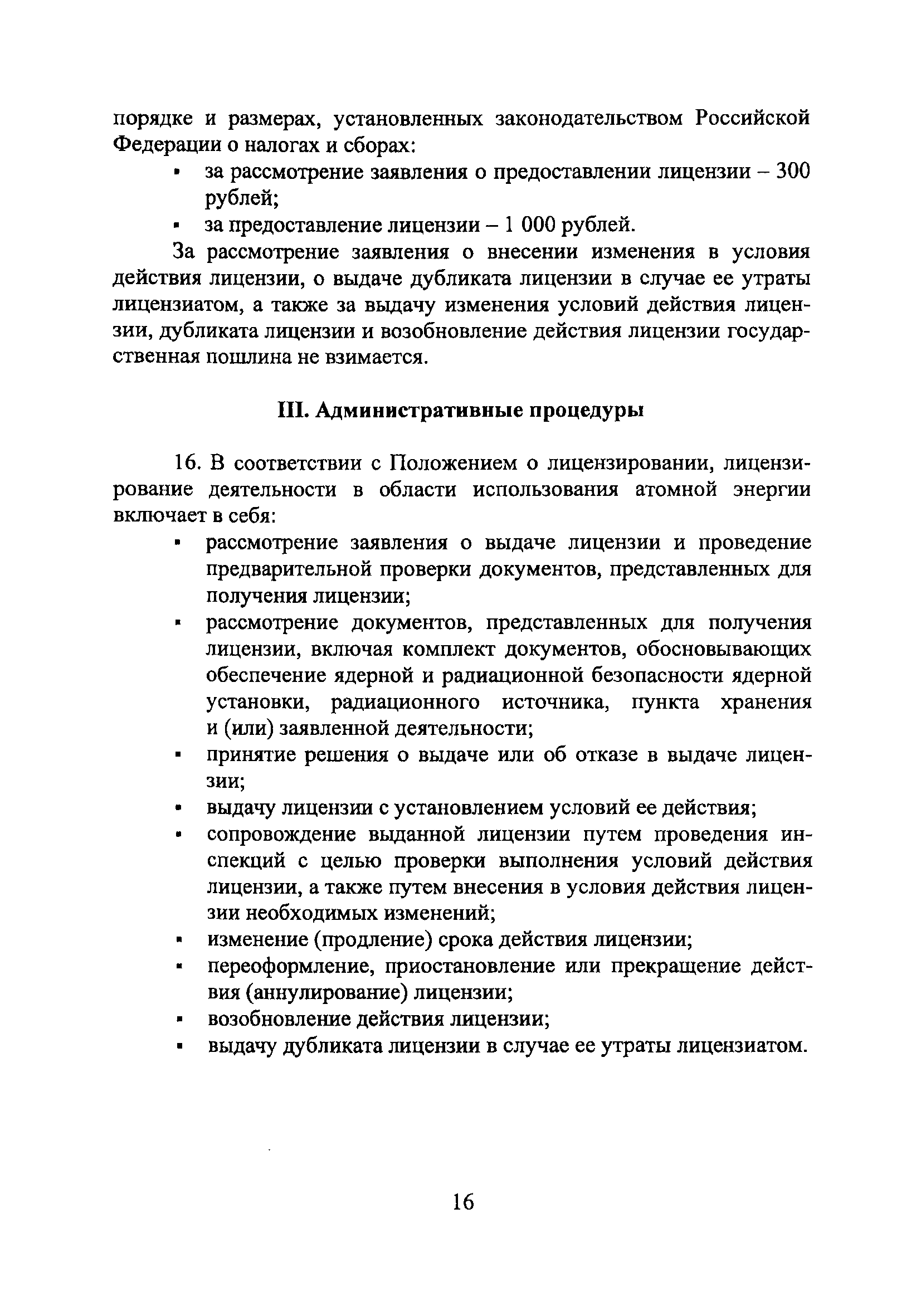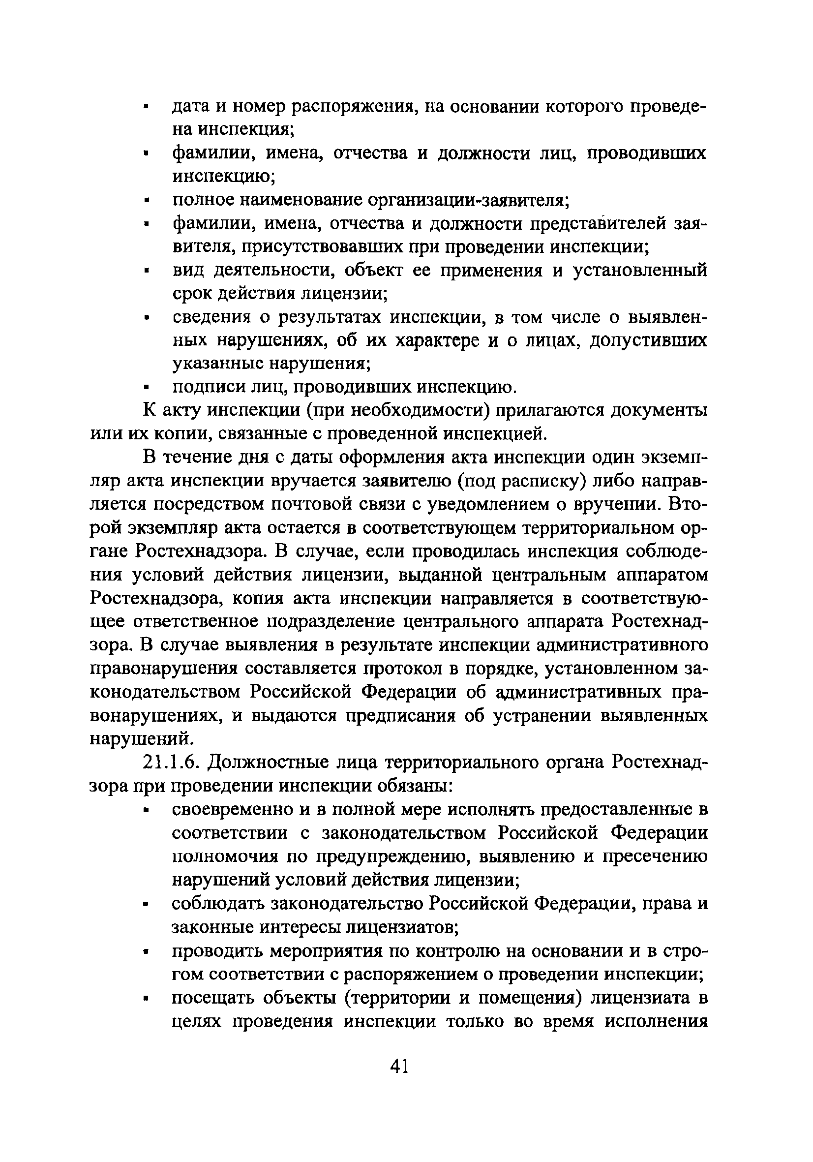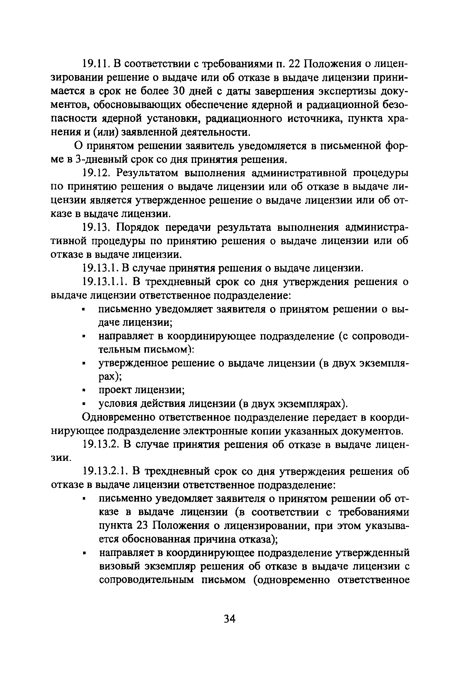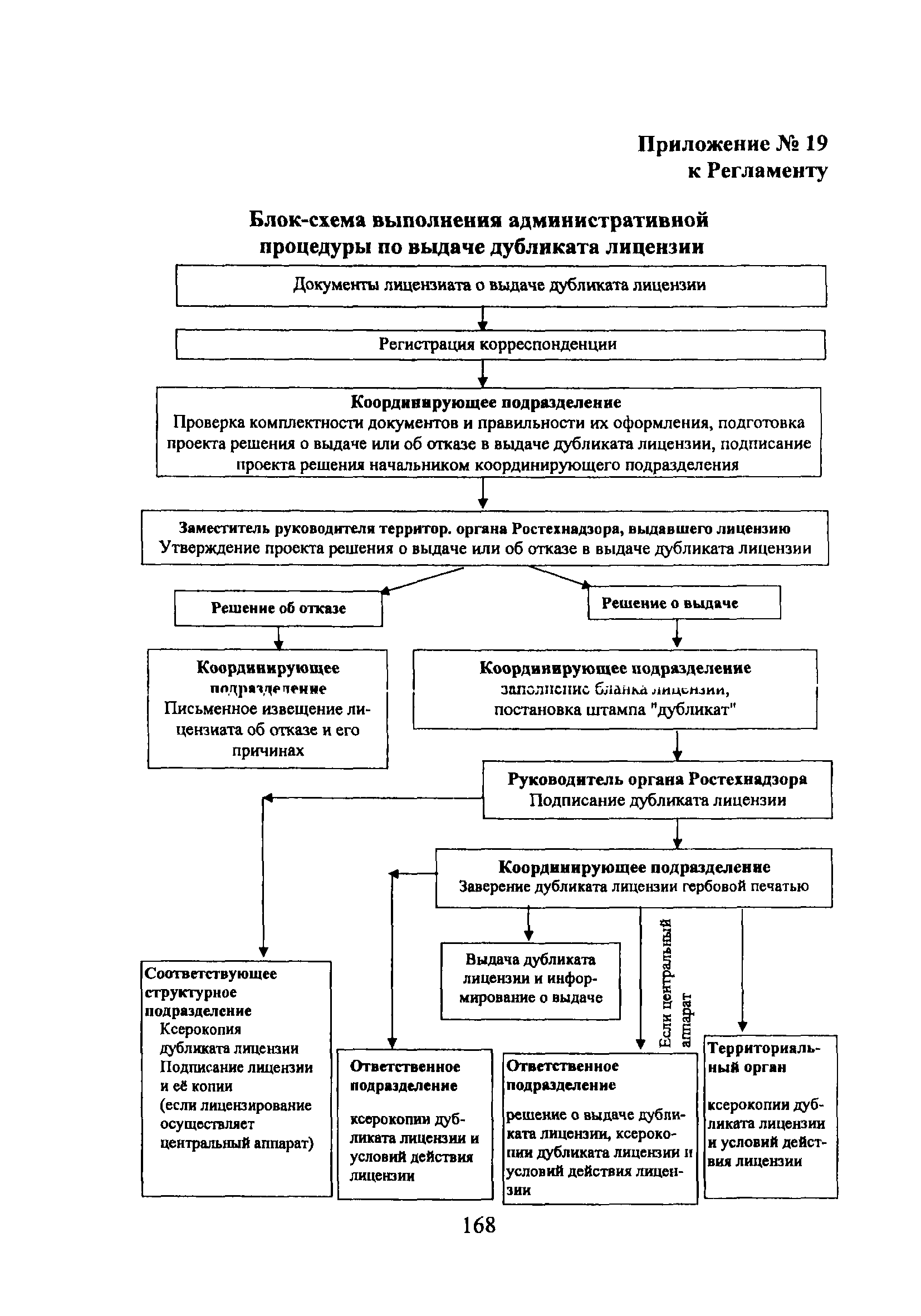 | Оглавление: | I. Общие положения II. Требования к порядку исполнения государственной функции по лицензированию деятельности в области использования атомной энергии III. Административные процедуры IV. Порядок и формы контроля за исполнением государственной функции V. Порядок обжалования действий (бездействия) должностного лица, а также принимаемого им решения при исполнении государственной функции по лицензированию деятельности в области использования атомной энергии Приложение № 1 Разграничение полномочий между центральным аппаратом Ростехнадзора и его территориальными органами при исполнении государственной функции по лицензированию деятельности в области использования атомной энергии и максимальные сроки проведения экспертизы документов, представленных для получения лицензии Приложение № 2 Перечень субъектов Российской Федерации, на территории которых территориальные органы Ростехнадзора исполняют государственную функцию по лицензированию деятельности в области использования атомной энергии Приложение № 3 Обобщенная информация о ходе рассмотрения заявлений на получение лицензий Приложение № 4 Требования к составу комплекта документов, обосновывающих обеспечение ядерной и радиационной безопасности ядерной установки, радиационного источника, пункта хранения и (или) заявленной деятельности, определенные Федеральной службой по экологическому, технологическому и атомному надзору в соответствии с п. 11 ж) Положения о лицензировании деятельности в области использования атомной энергии Приложение № 5 Блок-схема выполнения административной процедуры по рассмотрению заявления о выдаче лицензии и проведению предварительной проверки документов Приложение № 6 Блок-схема выполнения административной процедуры по рассмотрению документов, представленных для получения лицензии Приложение № 7 Образец решения о выдаче лицензии (об отказе в выдаче лицензии) Приложение № 8 Образец лицензии Приложение № 9 Блок-схема выполнения административной процедуры по принятию решения о выдаче или отказе в выдаче лицензии Приложение № 10 Блок-схема выполнения административной процедуры по выдаче лицензии с установлением условий ее действия Приложение № 11 Блок-схема выполнения административной процедуры по сопровождению выданной лицензии путем проведения инспекции с целью проверки выполнения условий действия лицензии Приложение № 12 Образец решения о внесении или об отказе во внесении изменения в условия действия лицензии Приложение № 13 Образец изменения условий действия лицензии Приложение № 14 Блок-схема выполнения административной процедуры по изменению условий действия лицензии Приложение № 15 Образец решения о приостановлении или прекращении действия (аннулировании) лицензии Приложение № 16 Блок-схема выполнения административной процедуры по приостановлению или прекращению действия (аннулированию) лицензии Приложение № 17 Образец решения о возобновлении лицензии Приложение № 18 Блок-схема выполнения административной процедуры по возобновлению действия лицензии Приложение № 19 Блок-схема выполнения административной процедуры по выдаче дубликата лицензии Справочная информация (не является составной частью вышеприведенного Административного регламента) |