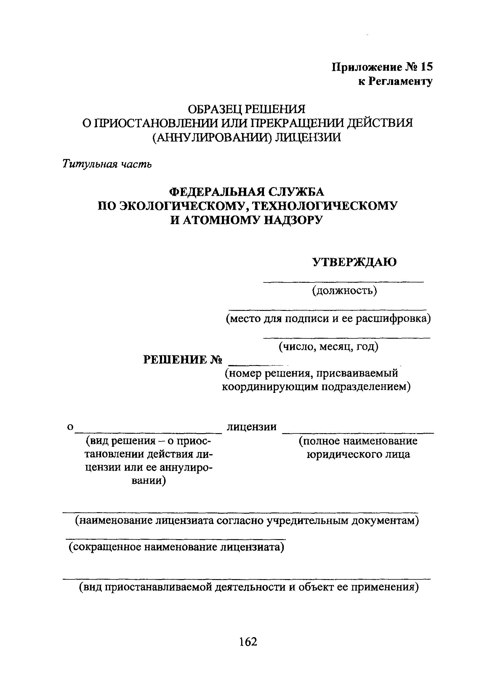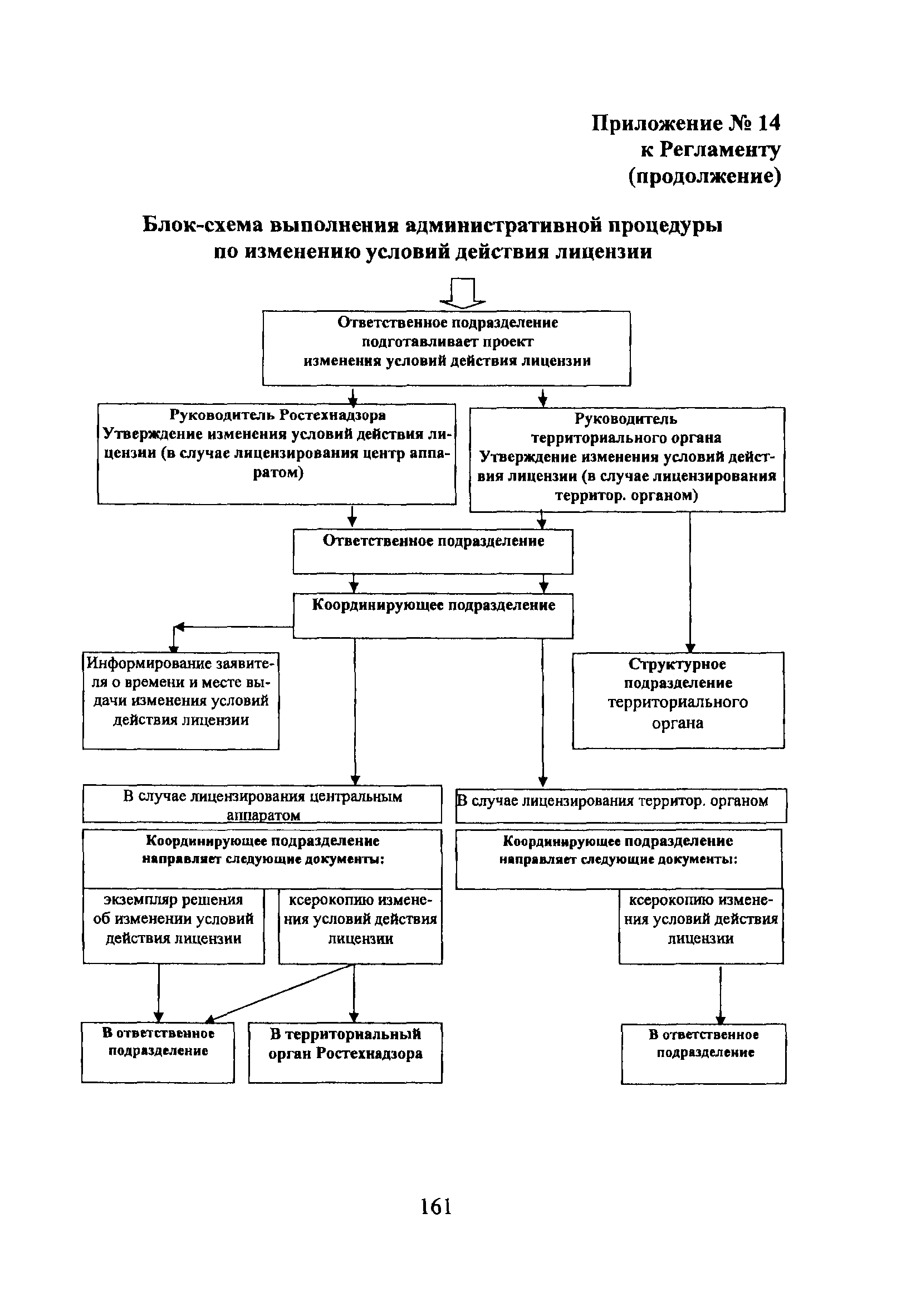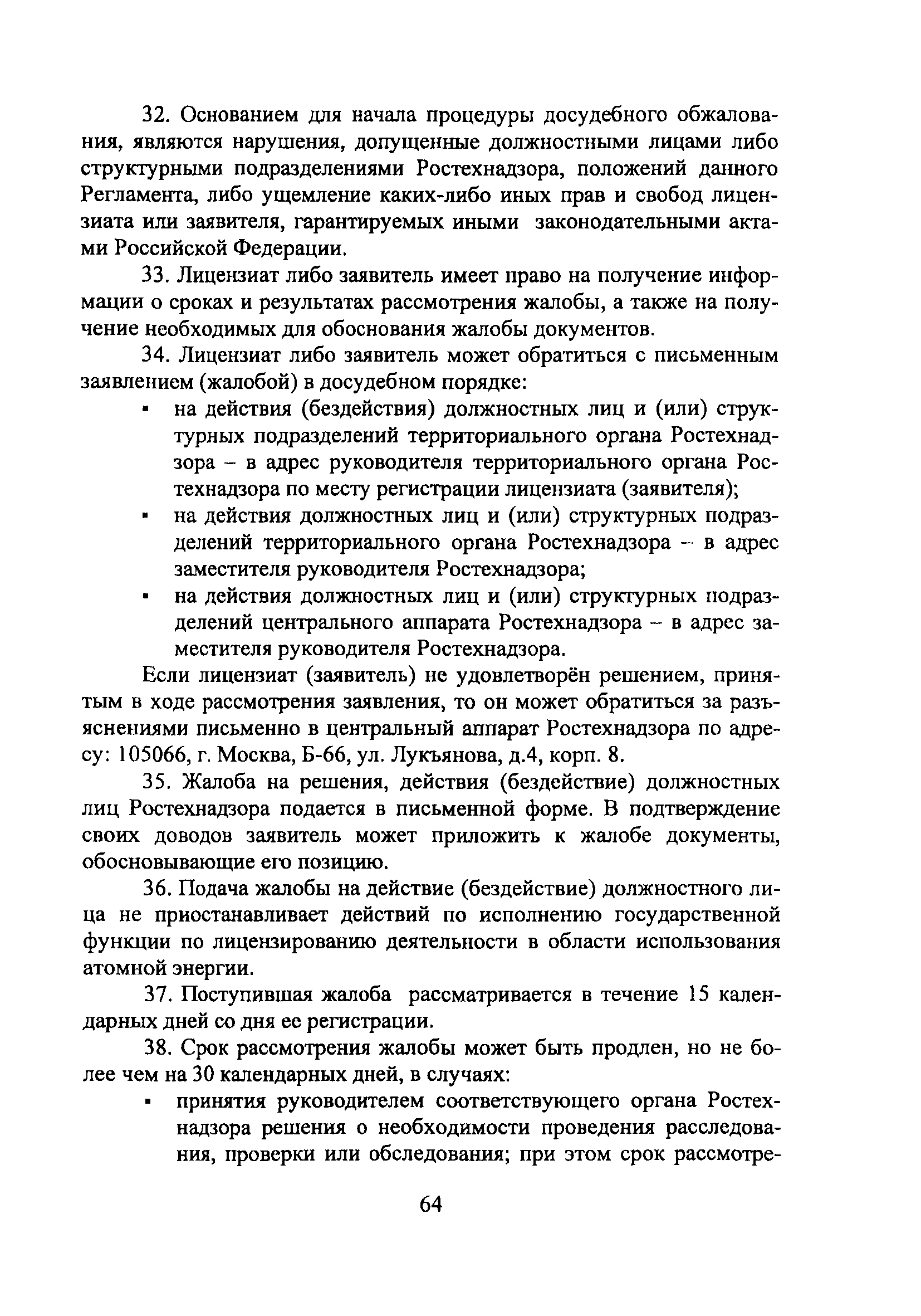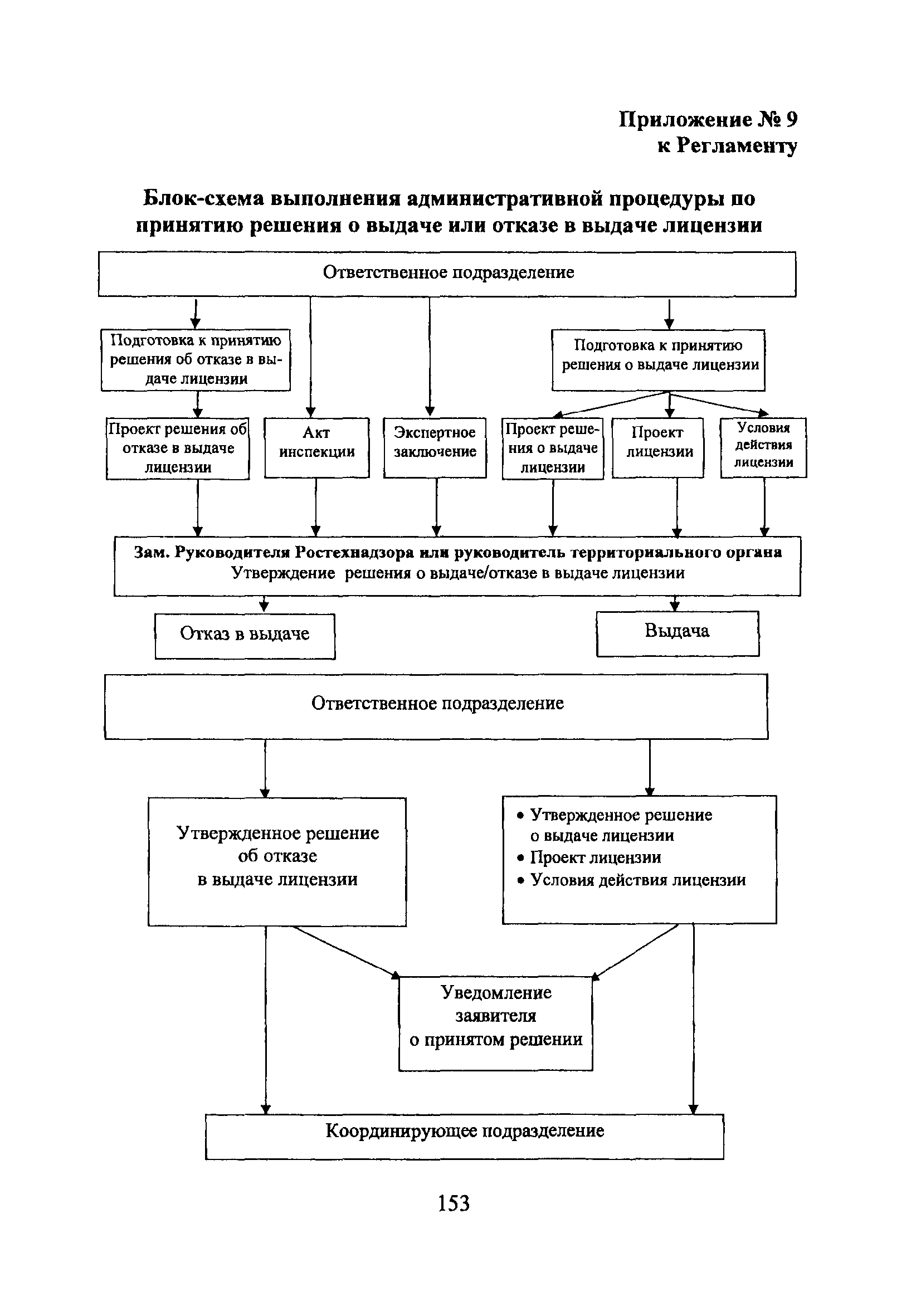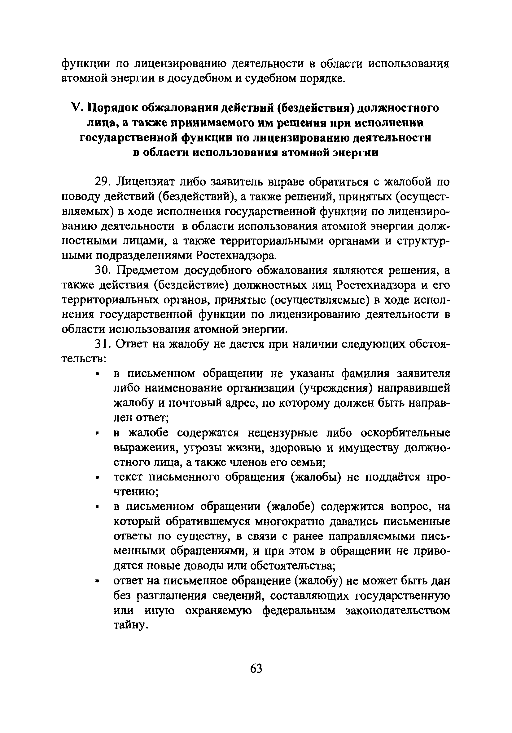 | Оглавление: | I. Общие положения II. Требования к порядку исполнения государственной функции по лицензированию деятельности в области использования атомной энергии III. Административные процедуры IV. Порядок и формы контроля за исполнением государственной функции V. Порядок обжалования действий (бездействия) должностного лица, а также принимаемого им решения при исполнении государственной функции по лицензированию деятельности в области использования атомной энергии Приложение № 1 Разграничение полномочий между центральным аппаратом Ростехнадзора и его территориальными органами при исполнении государственной функции по лицензированию деятельности в области использования атомной энергии и максимальные сроки проведения экспертизы документов, представленных для получения лицензии Приложение № 2 Перечень субъектов Российской Федерации, на территории которых территориальные органы Ростехнадзора исполняют государственную функцию по лицензированию деятельности в области использования атомной энергии Приложение № 3 Обобщенная информация о ходе рассмотрения заявлений на получение лицензий Приложение № 4 Требования к составу комплекта документов, обосновывающих обеспечение ядерной и радиационной безопасности ядерной установки, радиационного источника, пункта хранения и (или) заявленной деятельности, определенные Федеральной службой по экологическому, технологическому и атомному надзору в соответствии с п. 11 ж) Положения о лицензировании деятельности в области использования атомной энергии Приложение № 5 Блок-схема выполнения административной процедуры по рассмотрению заявления о выдаче лицензии и проведению предварительной проверки документов Приложение № 6 Блок-схема выполнения административной процедуры по рассмотрению документов, представленных для получения лицензии Приложение № 7 Образец решения о выдаче лицензии (об отказе в выдаче лицензии) Приложение № 8 Образец лицензии Приложение № 9 Блок-схема выполнения административной процедуры по принятию решения о выдаче или отказе в выдаче лицензии Приложение № 10 Блок-схема выполнения административной процедуры по выдаче лицензии с установлением условий ее действия Приложение № 11 Блок-схема выполнения административной процедуры по сопровождению выданной лицензии путем проведения инспекции с целью проверки выполнения условий действия лицензии Приложение № 12 Образец решения о внесении или об отказе во внесении изменения в условия действия лицензии Приложение № 13 Образец изменения условий действия лицензии Приложение № 14 Блок-схема выполнения административной процедуры по изменению условий действия лицензии Приложение № 15 Образец решения о приостановлении или прекращении действия (аннулировании) лицензии Приложение № 16 Блок-схема выполнения административной процедуры по приостановлению или прекращению действия (аннулированию) лицензии Приложение № 17 Образец решения о возобновлении лицензии Приложение № 18 Блок-схема выполнения административной процедуры по возобновлению действия лицензии Приложение № 19 Блок-схема выполнения административной процедуры по выдаче дубликата лицензии Справочная информация (не является составной частью вышеприведенного Административного регламента) |
