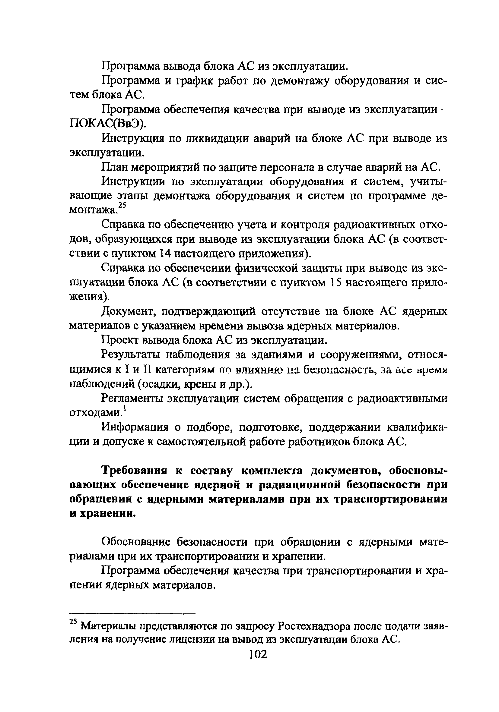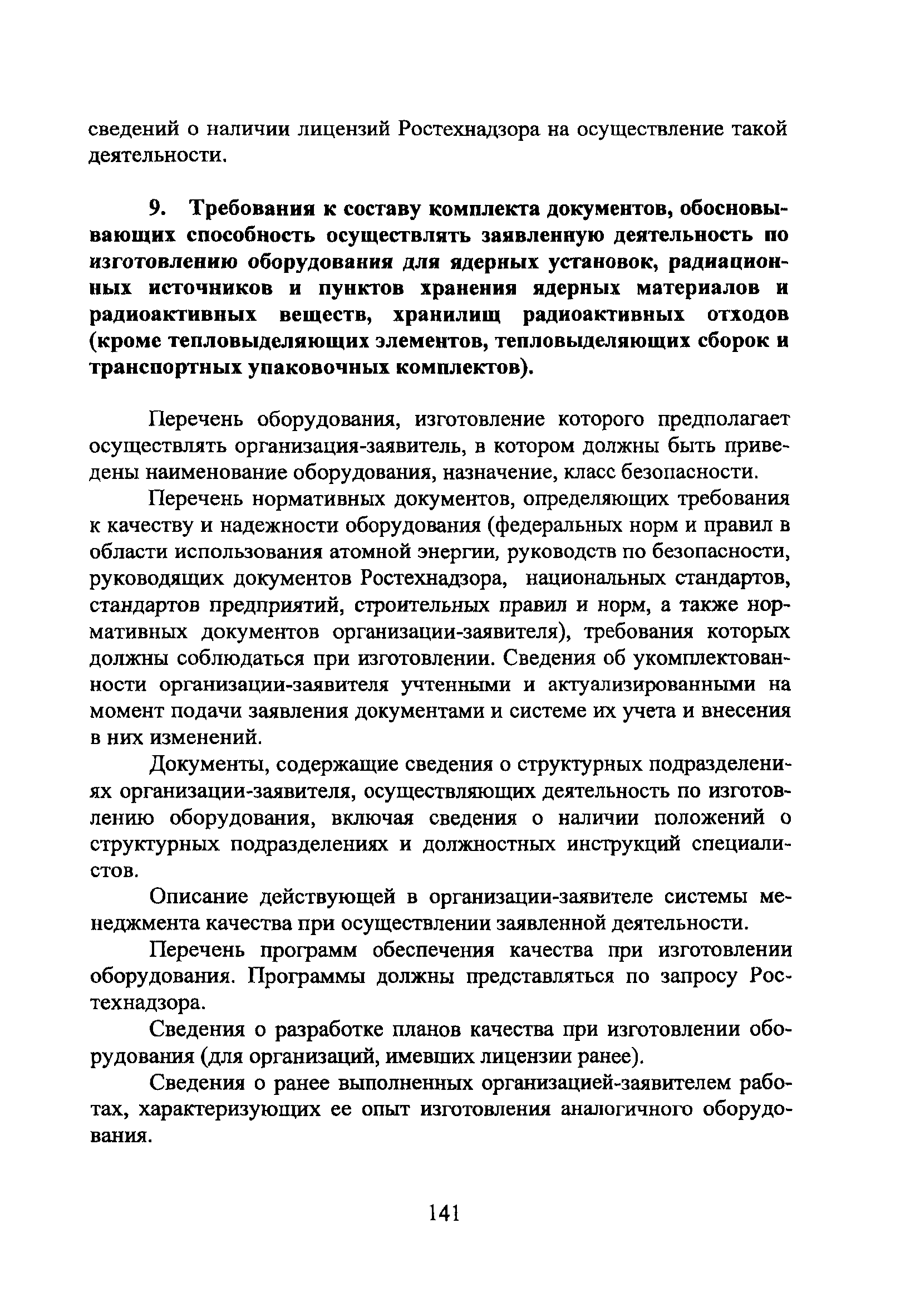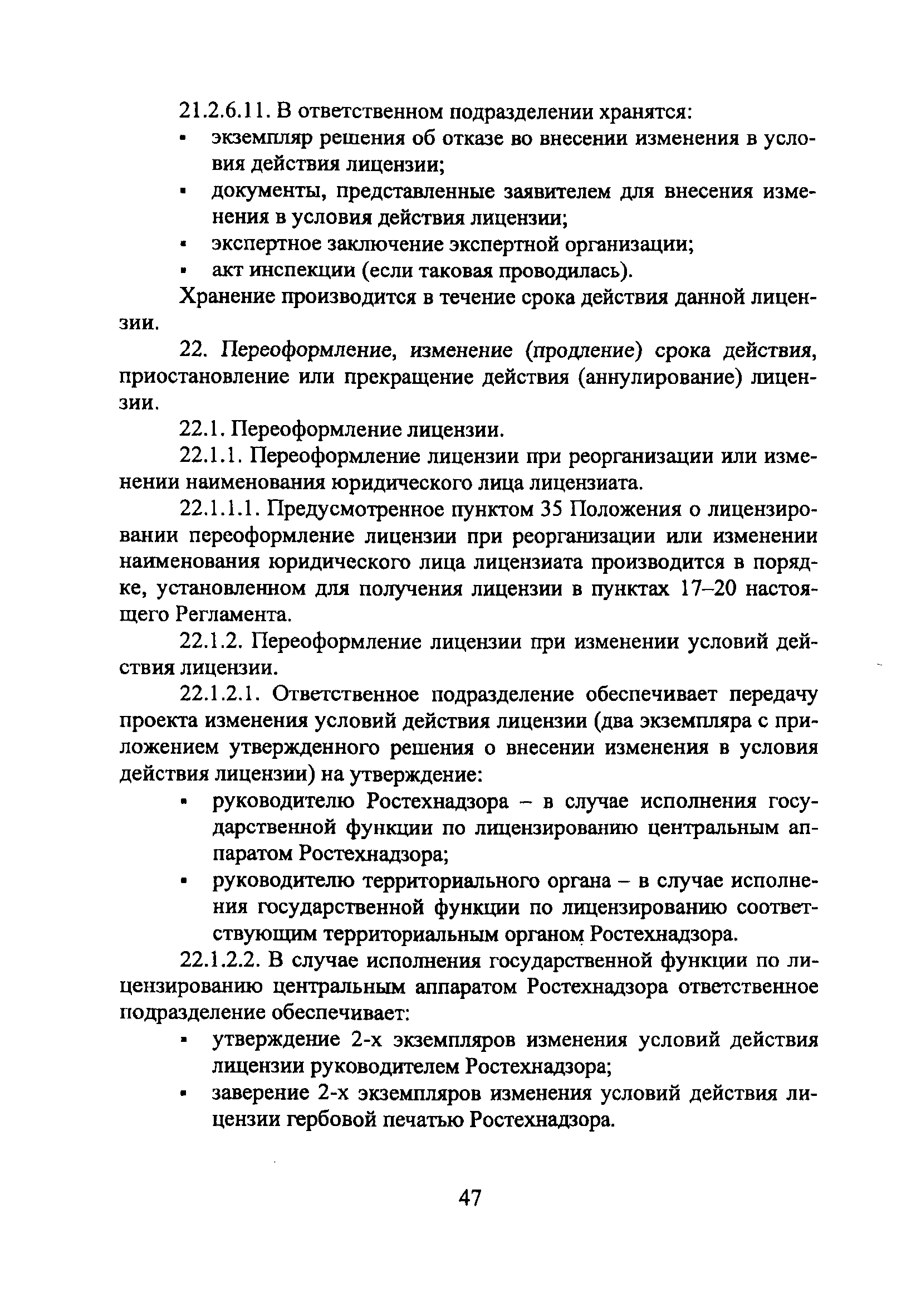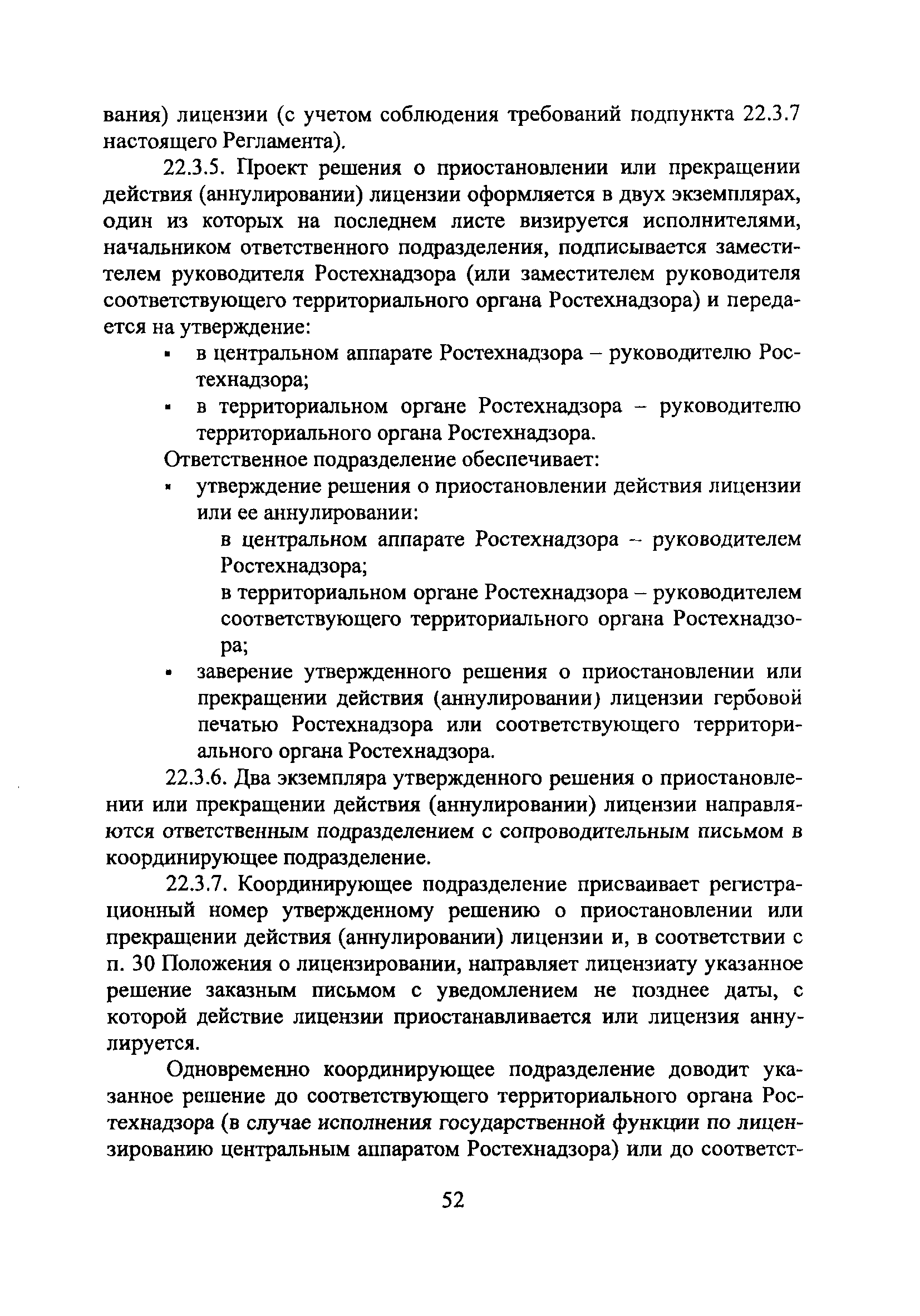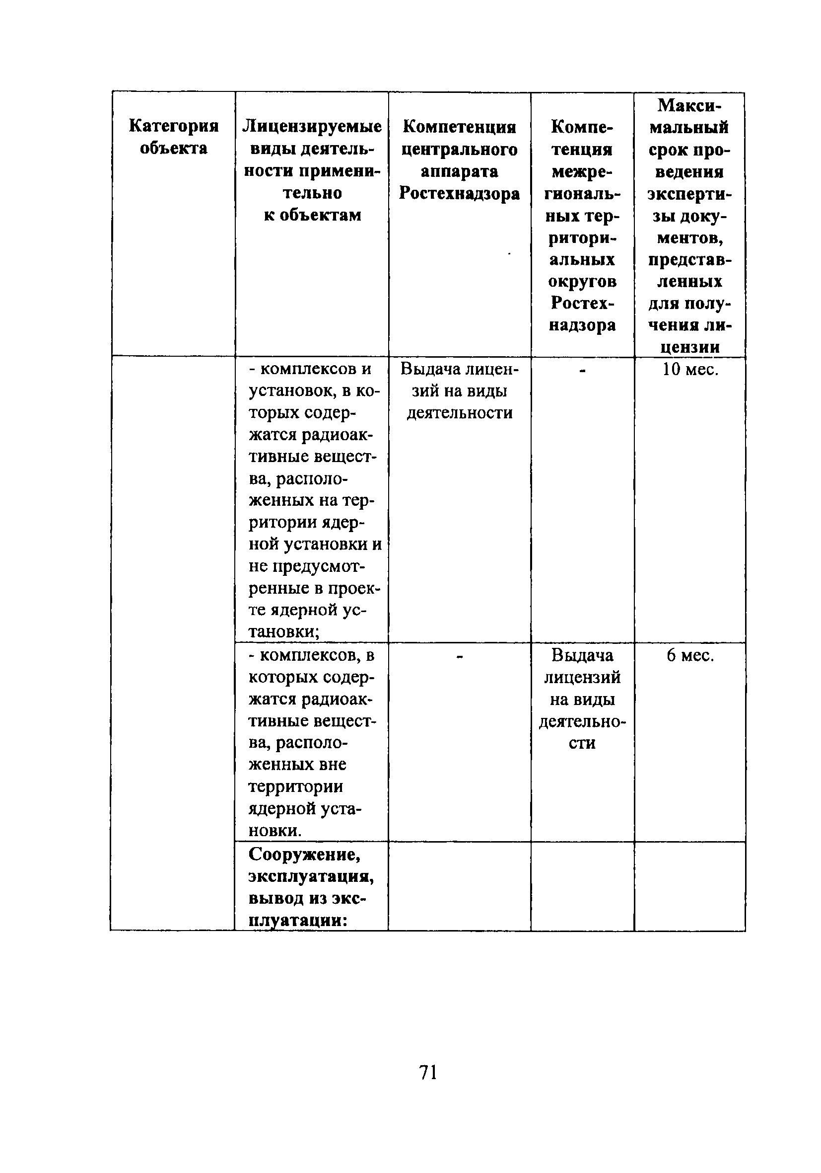 | Оглавление: | I. Общие положения II. Требования к порядку исполнения государственной функции по лицензированию деятельности в области использования атомной энергии III. Административные процедуры IV. Порядок и формы контроля за исполнением государственной функции V. Порядок обжалования действий (бездействия) должностного лица, а также принимаемого им решения при исполнении государственной функции по лицензированию деятельности в области использования атомной энергии Приложение № 1 Разграничение полномочий между центральным аппаратом Ростехнадзора и его территориальными органами при исполнении государственной функции по лицензированию деятельности в области использования атомной энергии и максимальные сроки проведения экспертизы документов, представленных для получения лицензии Приложение № 2 Перечень субъектов Российской Федерации, на территории которых территориальные органы Ростехнадзора исполняют государственную функцию по лицензированию деятельности в области использования атомной энергии Приложение № 3 Обобщенная информация о ходе рассмотрения заявлений на получение лицензий Приложение № 4 Требования к составу комплекта документов, обосновывающих обеспечение ядерной и радиационной безопасности ядерной установки, радиационного источника, пункта хранения и (или) заявленной деятельности, определенные Федеральной службой по экологическому, технологическому и атомному надзору в соответствии с п. 11 ж) Положения о лицензировании деятельности в области использования атомной энергии Приложение № 5 Блок-схема выполнения административной процедуры по рассмотрению заявления о выдаче лицензии и проведению предварительной проверки документов Приложение № 6 Блок-схема выполнения административной процедуры по рассмотрению документов, представленных для получения лицензии Приложение № 7 Образец решения о выдаче лицензии (об отказе в выдаче лицензии) Приложение № 8 Образец лицензии Приложение № 9 Блок-схема выполнения административной процедуры по принятию решения о выдаче или отказе в выдаче лицензии Приложение № 10 Блок-схема выполнения административной процедуры по выдаче лицензии с установлением условий ее действия Приложение № 11 Блок-схема выполнения административной процедуры по сопровождению выданной лицензии путем проведения инспекции с целью проверки выполнения условий действия лицензии Приложение № 12 Образец решения о внесении или об отказе во внесении изменения в условия действия лицензии Приложение № 13 Образец изменения условий действия лицензии Приложение № 14 Блок-схема выполнения административной процедуры по изменению условий действия лицензии Приложение № 15 Образец решения о приостановлении или прекращении действия (аннулировании) лицензии Приложение № 16 Блок-схема выполнения административной процедуры по приостановлению или прекращению действия (аннулированию) лицензии Приложение № 17 Образец решения о возобновлении лицензии Приложение № 18 Блок-схема выполнения административной процедуры по возобновлению действия лицензии Приложение № 19 Блок-схема выполнения административной процедуры по выдаче дубликата лицензии Справочная информация (не является составной частью вышеприведенного Административного регламента) |