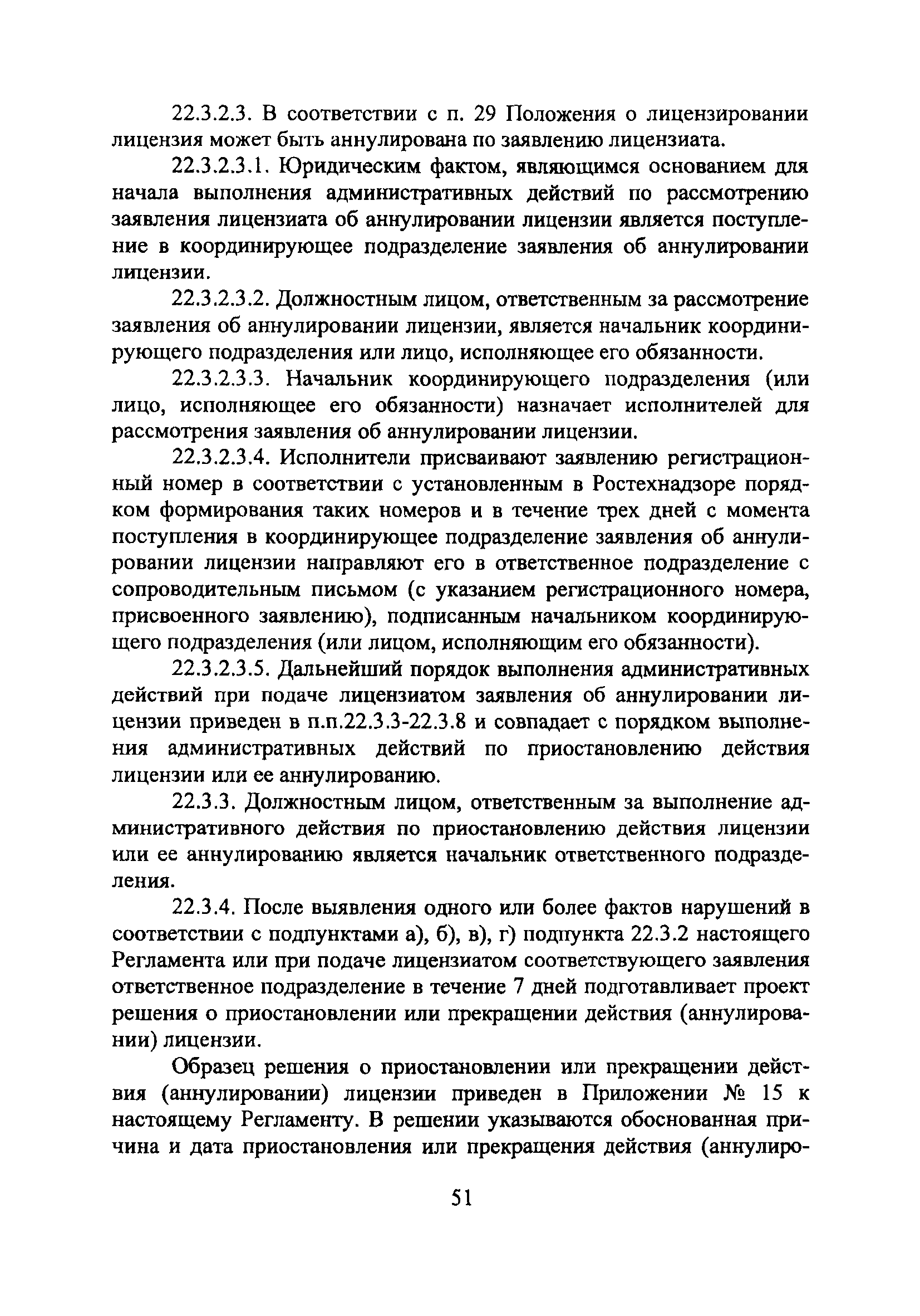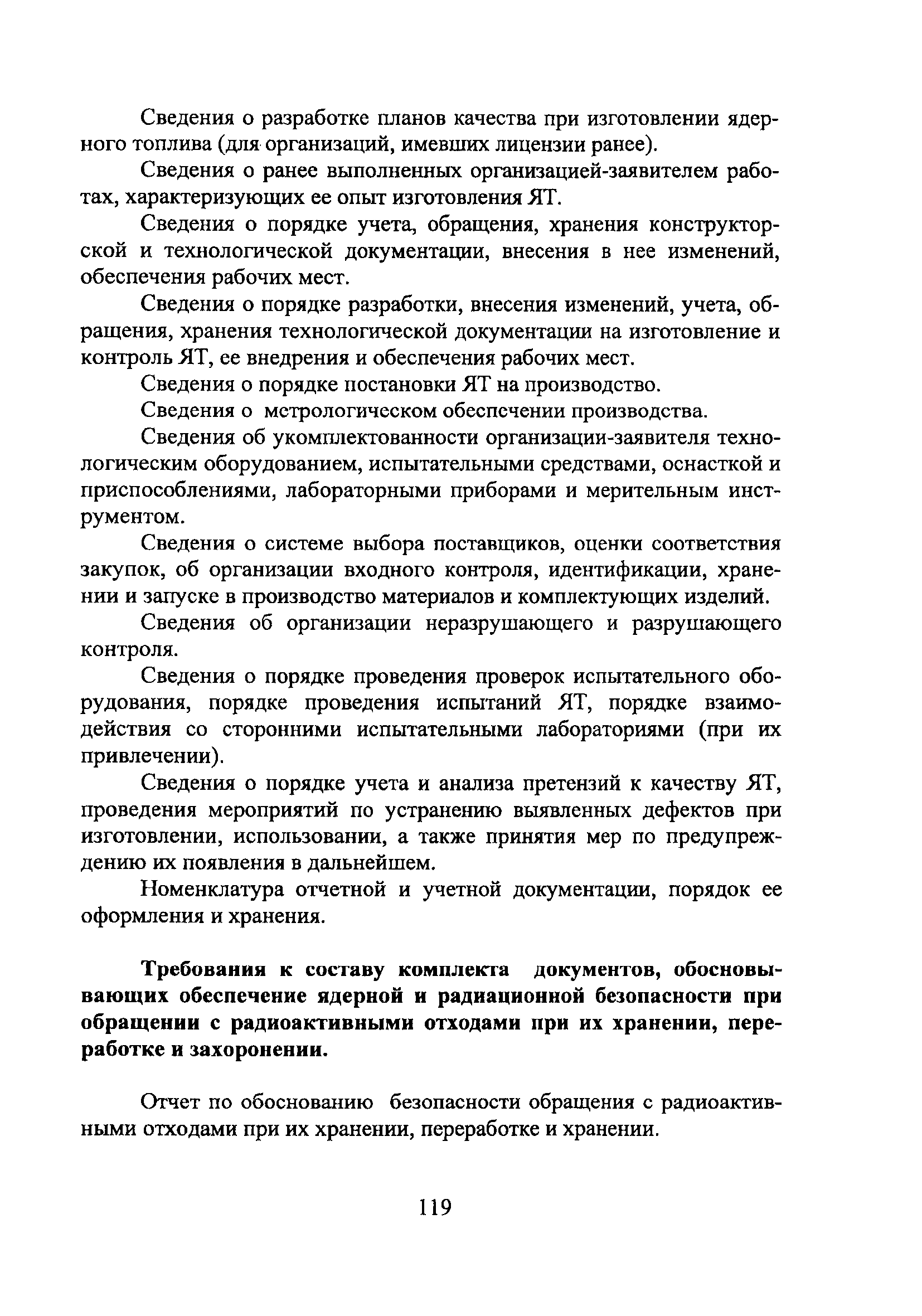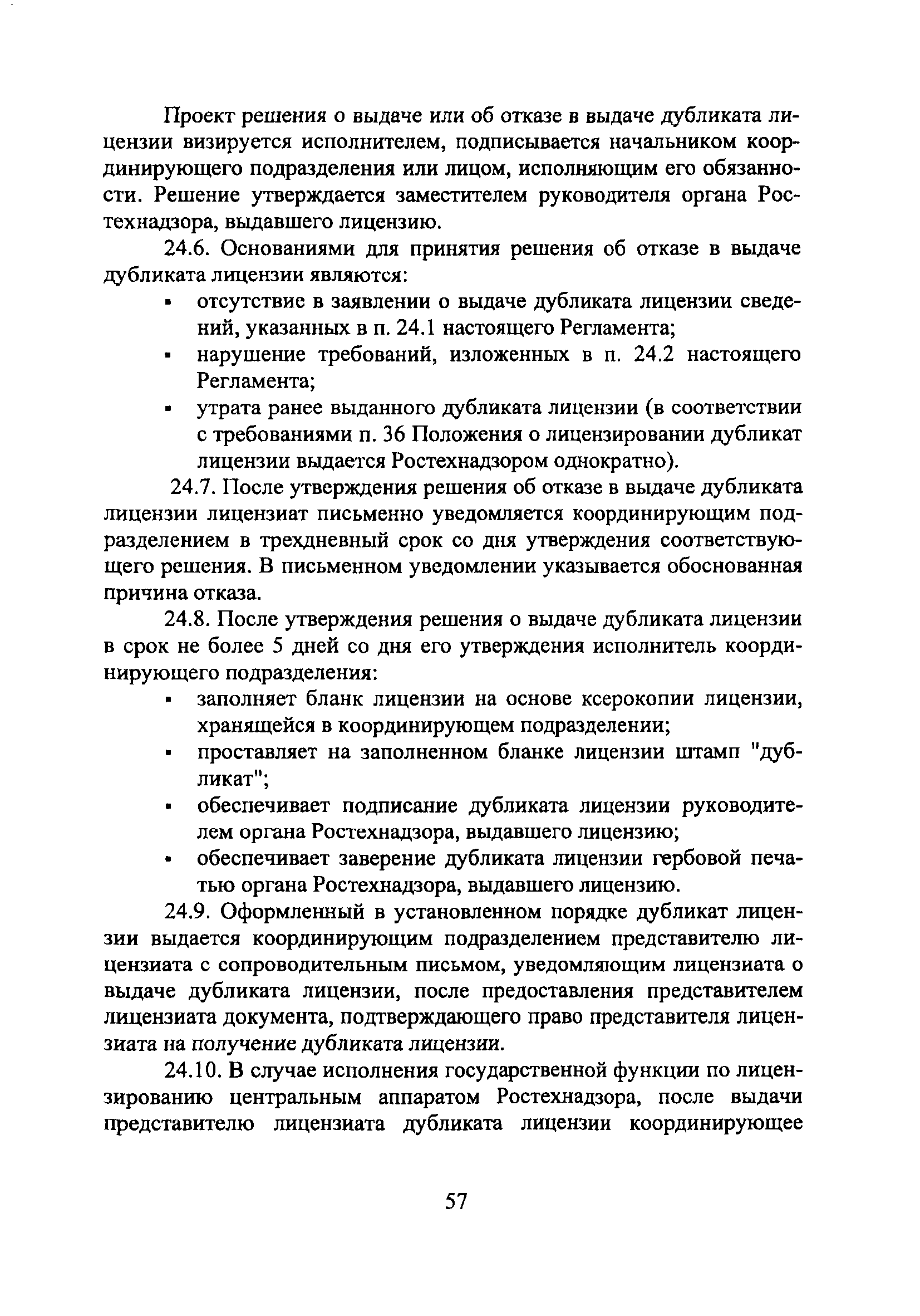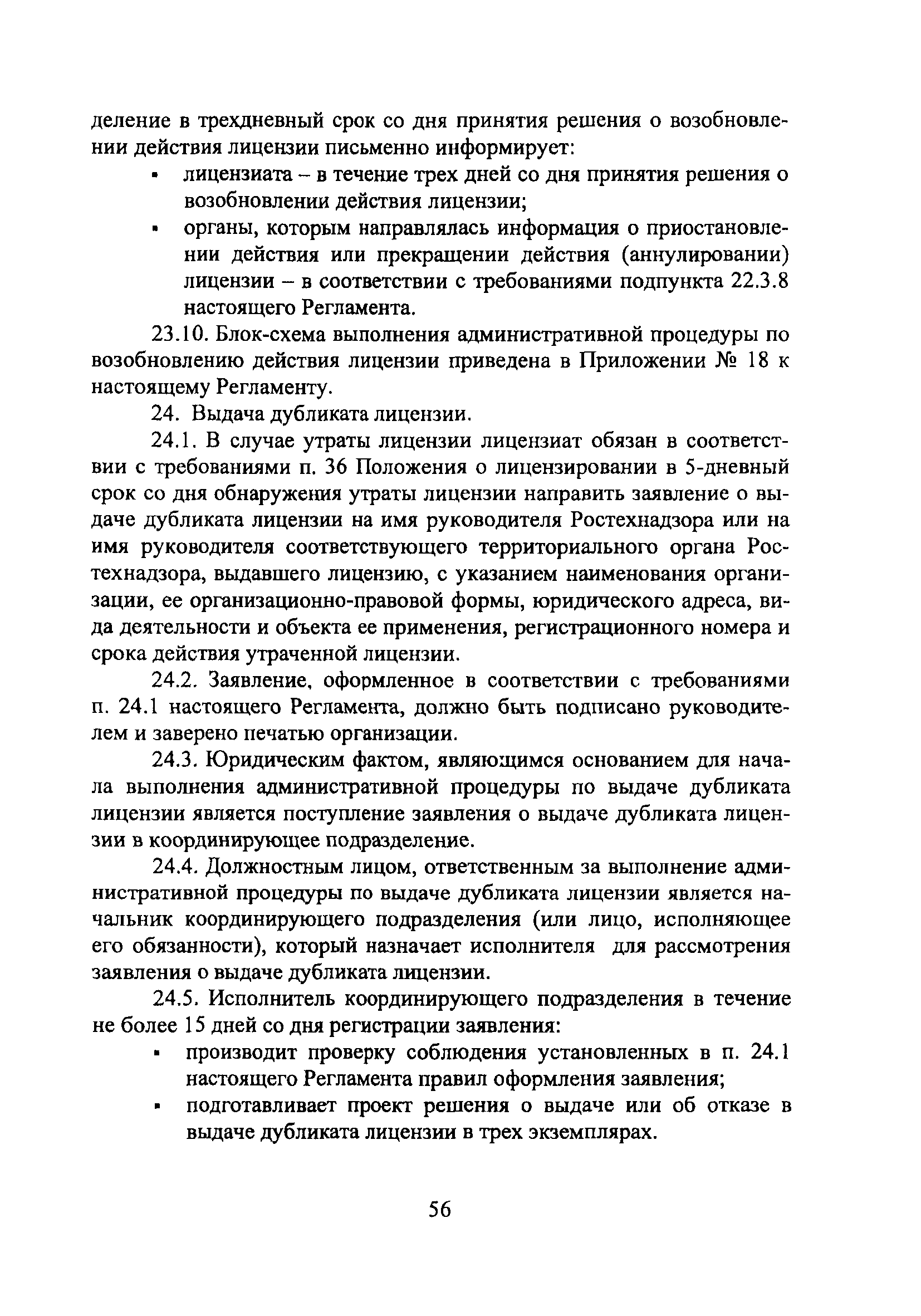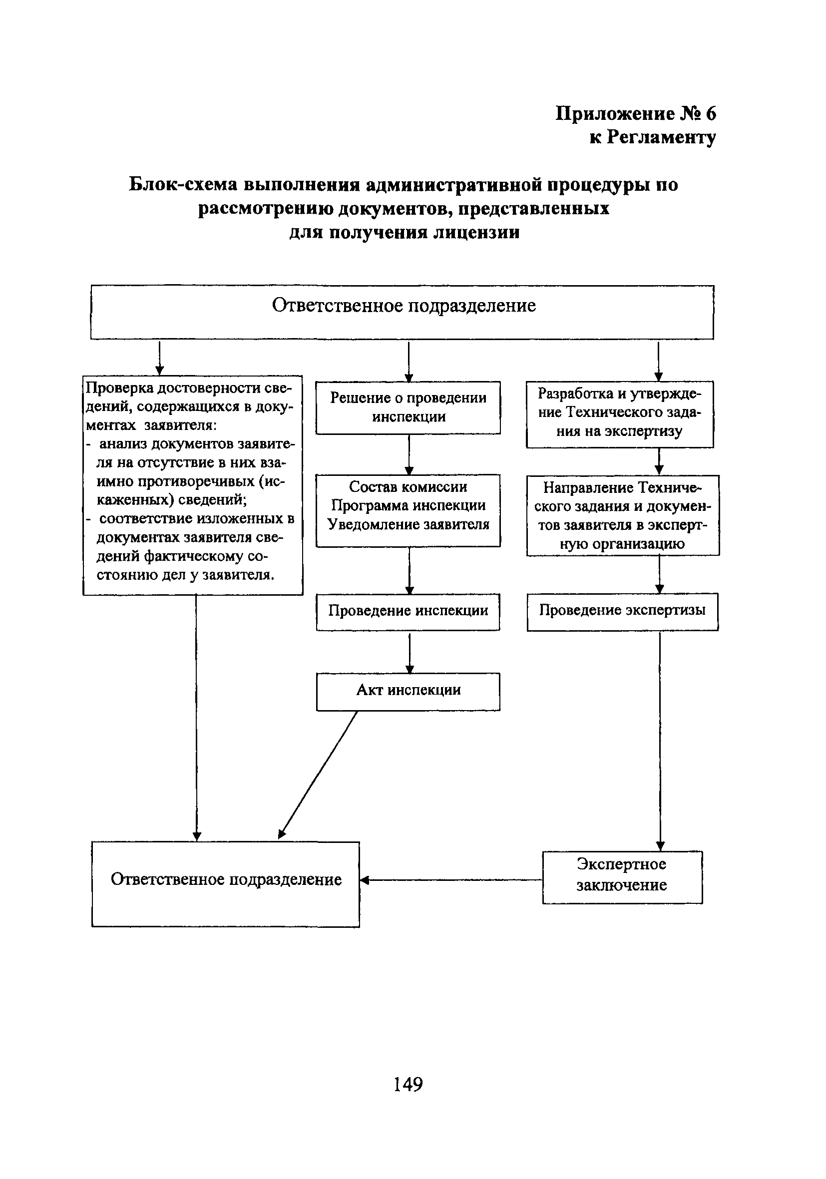 | Оглавление: | I. Общие положения II. Требования к порядку исполнения государственной функции по лицензированию деятельности в области использования атомной энергии III. Административные процедуры IV. Порядок и формы контроля за исполнением государственной функции V. Порядок обжалования действий (бездействия) должностного лица, а также принимаемого им решения при исполнении государственной функции по лицензированию деятельности в области использования атомной энергии Приложение № 1 Разграничение полномочий между центральным аппаратом Ростехнадзора и его территориальными органами при исполнении государственной функции по лицензированию деятельности в области использования атомной энергии и максимальные сроки проведения экспертизы документов, представленных для получения лицензии Приложение № 2 Перечень субъектов Российской Федерации, на территории которых территориальные органы Ростехнадзора исполняют государственную функцию по лицензированию деятельности в области использования атомной энергии Приложение № 3 Обобщенная информация о ходе рассмотрения заявлений на получение лицензий Приложение № 4 Требования к составу комплекта документов, обосновывающих обеспечение ядерной и радиационной безопасности ядерной установки, радиационного источника, пункта хранения и (или) заявленной деятельности, определенные Федеральной службой по экологическому, технологическому и атомному надзору в соответствии с п. 11 ж) Положения о лицензировании деятельности в области использования атомной энергии Приложение № 5 Блок-схема выполнения административной процедуры по рассмотрению заявления о выдаче лицензии и проведению предварительной проверки документов Приложение № 6 Блок-схема выполнения административной процедуры по рассмотрению документов, представленных для получения лицензии Приложение № 7 Образец решения о выдаче лицензии (об отказе в выдаче лицензии) Приложение № 8 Образец лицензии Приложение № 9 Блок-схема выполнения административной процедуры по принятию решения о выдаче или отказе в выдаче лицензии Приложение № 10 Блок-схема выполнения административной процедуры по выдаче лицензии с установлением условий ее действия Приложение № 11 Блок-схема выполнения административной процедуры по сопровождению выданной лицензии путем проведения инспекции с целью проверки выполнения условий действия лицензии Приложение № 12 Образец решения о внесении или об отказе во внесении изменения в условия действия лицензии Приложение № 13 Образец изменения условий действия лицензии Приложение № 14 Блок-схема выполнения административной процедуры по изменению условий действия лицензии Приложение № 15 Образец решения о приостановлении или прекращении действия (аннулировании) лицензии Приложение № 16 Блок-схема выполнения административной процедуры по приостановлению или прекращению действия (аннулированию) лицензии Приложение № 17 Образец решения о возобновлении лицензии Приложение № 18 Блок-схема выполнения административной процедуры по возобновлению действия лицензии Приложение № 19 Блок-схема выполнения административной процедуры по выдаче дубликата лицензии Справочная информация (не является составной частью вышеприведенного Административного регламента) |