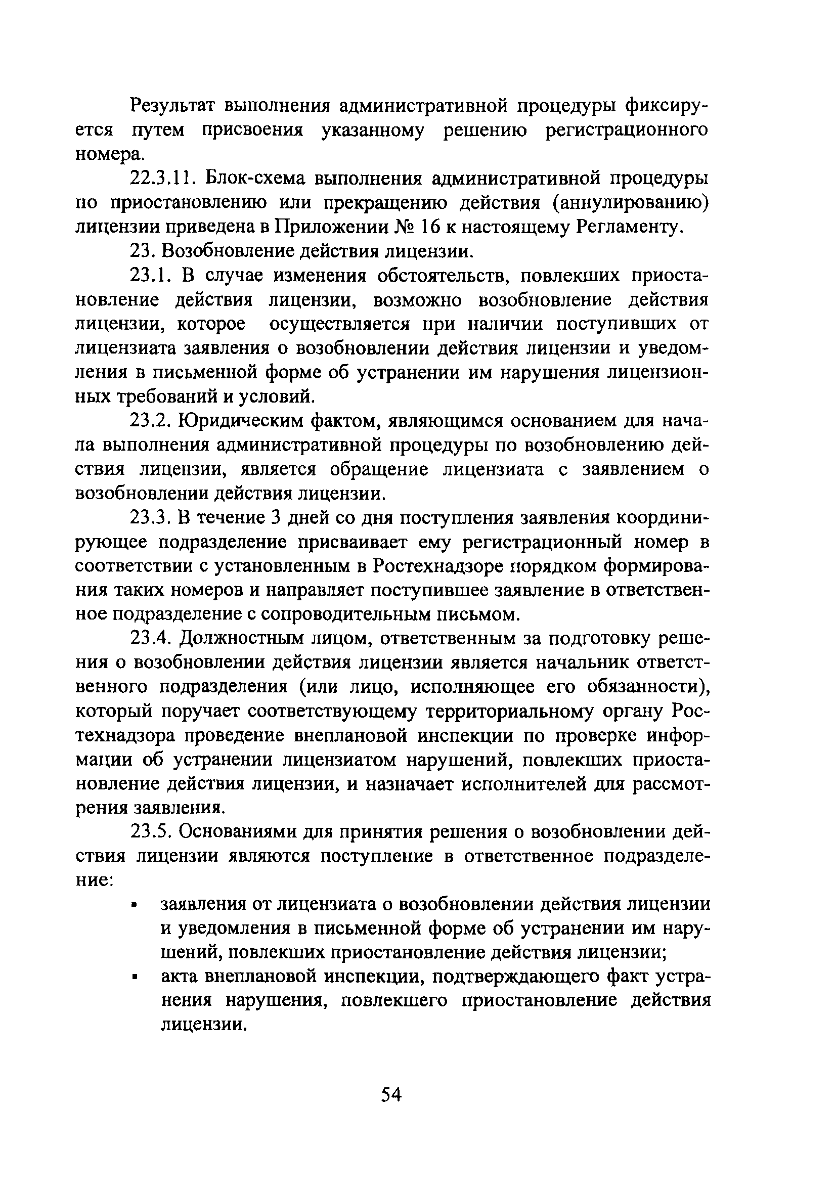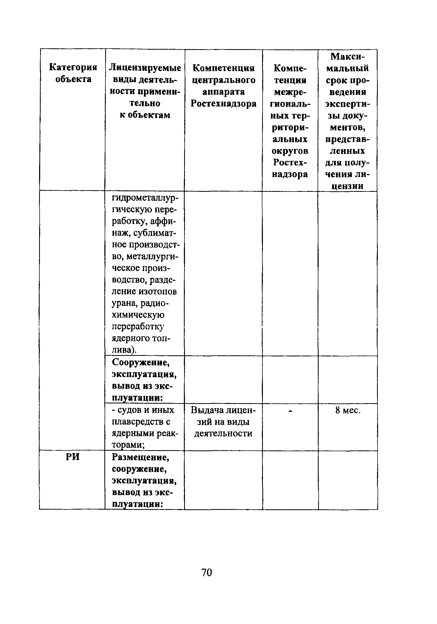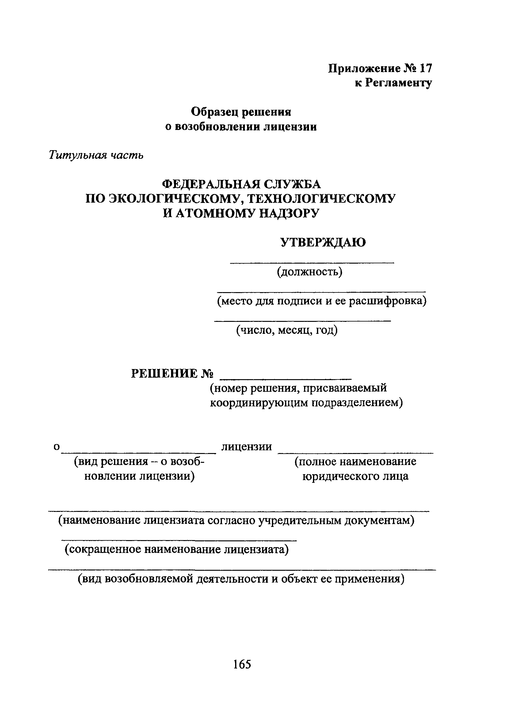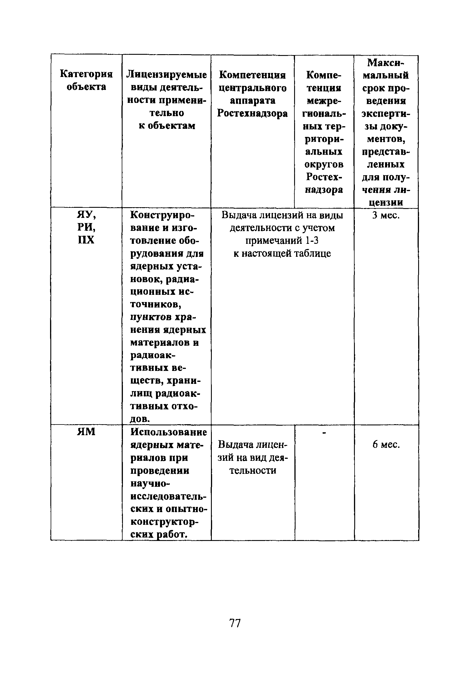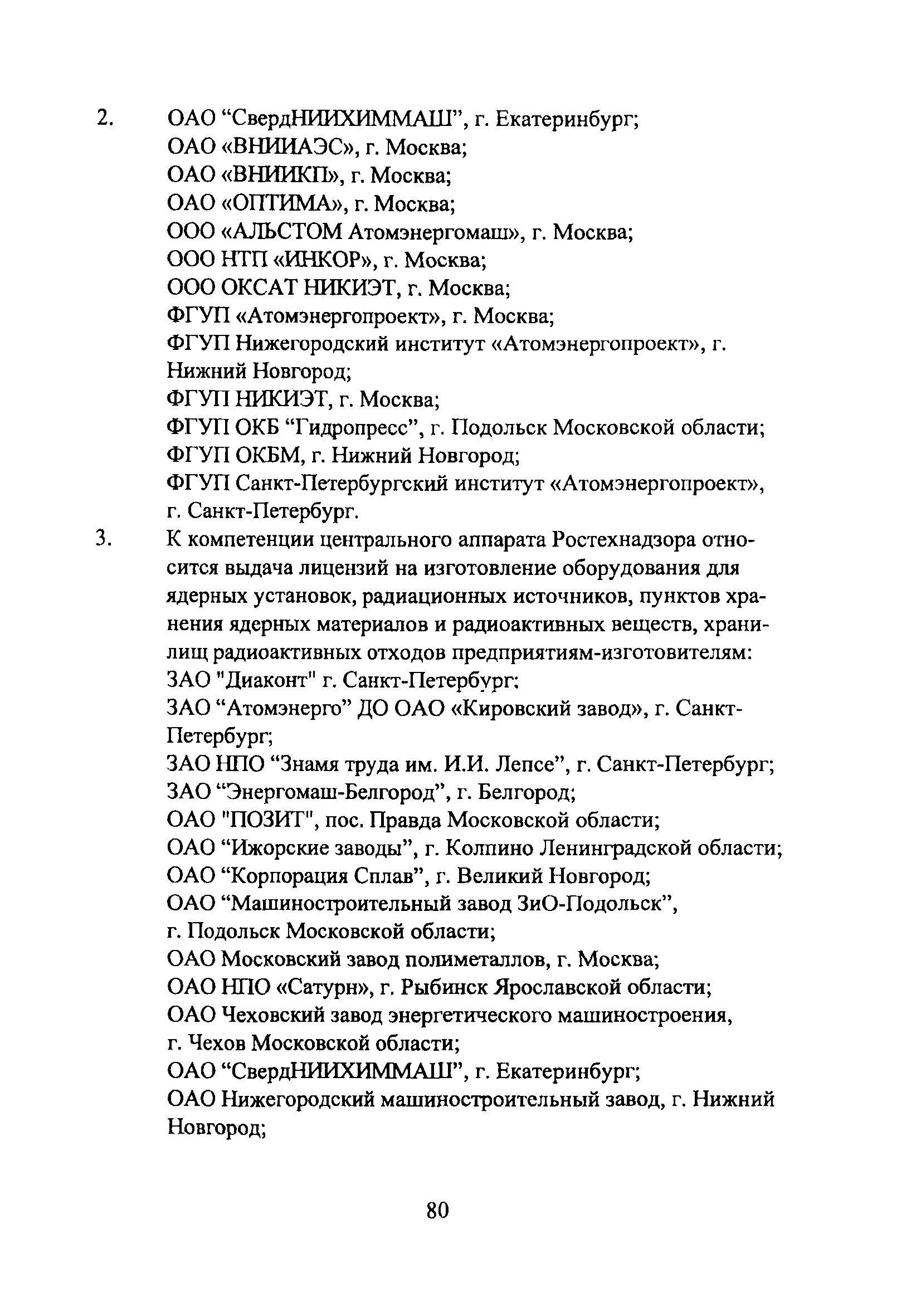 | Оглавление: | I. Общие положения II. Требования к порядку исполнения государственной функции по лицензированию деятельности в области использования атомной энергии III. Административные процедуры IV. Порядок и формы контроля за исполнением государственной функции V. Порядок обжалования действий (бездействия) должностного лица, а также принимаемого им решения при исполнении государственной функции по лицензированию деятельности в области использования атомной энергии Приложение № 1 Разграничение полномочий между центральным аппаратом Ростехнадзора и его территориальными органами при исполнении государственной функции по лицензированию деятельности в области использования атомной энергии и максимальные сроки проведения экспертизы документов, представленных для получения лицензии Приложение № 2 Перечень субъектов Российской Федерации, на территории которых территориальные органы Ростехнадзора исполняют государственную функцию по лицензированию деятельности в области использования атомной энергии Приложение № 3 Обобщенная информация о ходе рассмотрения заявлений на получение лицензий Приложение № 4 Требования к составу комплекта документов, обосновывающих обеспечение ядерной и радиационной безопасности ядерной установки, радиационного источника, пункта хранения и (или) заявленной деятельности, определенные Федеральной службой по экологическому, технологическому и атомному надзору в соответствии с п. 11 ж) Положения о лицензировании деятельности в области использования атомной энергии Приложение № 5 Блок-схема выполнения административной процедуры по рассмотрению заявления о выдаче лицензии и проведению предварительной проверки документов Приложение № 6 Блок-схема выполнения административной процедуры по рассмотрению документов, представленных для получения лицензии Приложение № 7 Образец решения о выдаче лицензии (об отказе в выдаче лицензии) Приложение № 8 Образец лицензии Приложение № 9 Блок-схема выполнения административной процедуры по принятию решения о выдаче или отказе в выдаче лицензии Приложение № 10 Блок-схема выполнения административной процедуры по выдаче лицензии с установлением условий ее действия Приложение № 11 Блок-схема выполнения административной процедуры по сопровождению выданной лицензии путем проведения инспекции с целью проверки выполнения условий действия лицензии Приложение № 12 Образец решения о внесении или об отказе во внесении изменения в условия действия лицензии Приложение № 13 Образец изменения условий действия лицензии Приложение № 14 Блок-схема выполнения административной процедуры по изменению условий действия лицензии Приложение № 15 Образец решения о приостановлении или прекращении действия (аннулировании) лицензии Приложение № 16 Блок-схема выполнения административной процедуры по приостановлению или прекращению действия (аннулированию) лицензии Приложение № 17 Образец решения о возобновлении лицензии Приложение № 18 Блок-схема выполнения административной процедуры по возобновлению действия лицензии Приложение № 19 Блок-схема выполнения административной процедуры по выдаче дубликата лицензии Справочная информация (не является составной частью вышеприведенного Административного регламента) |