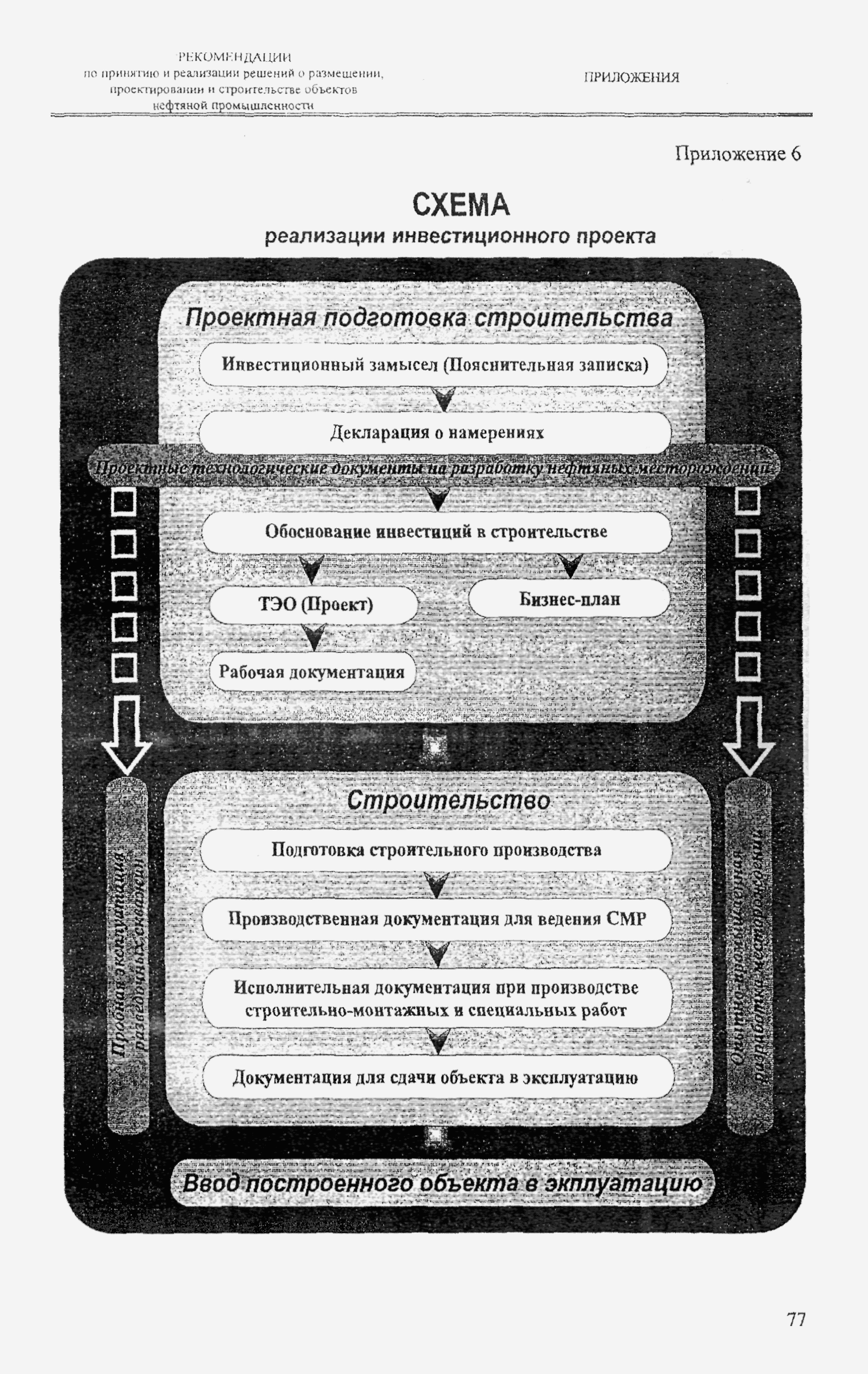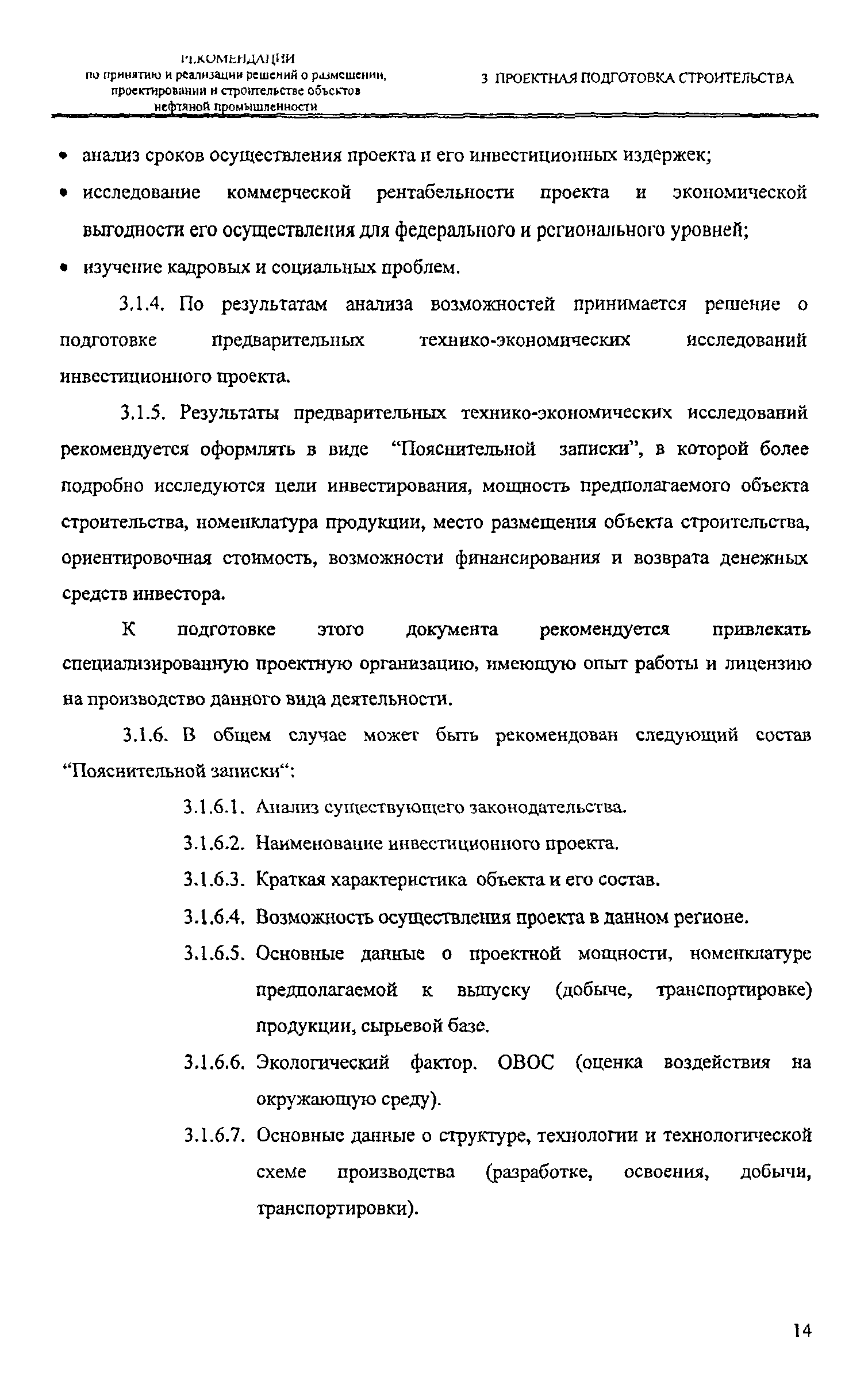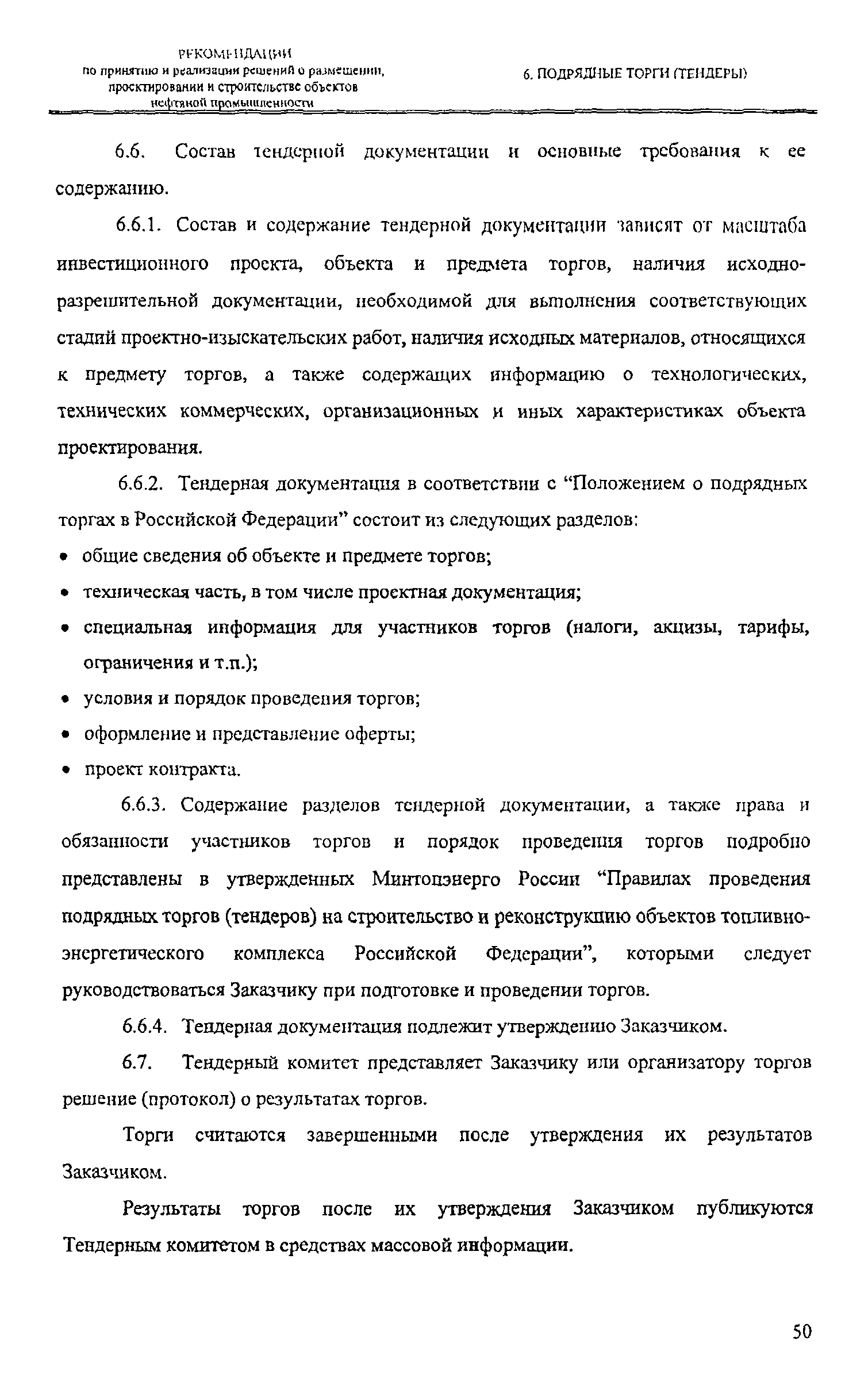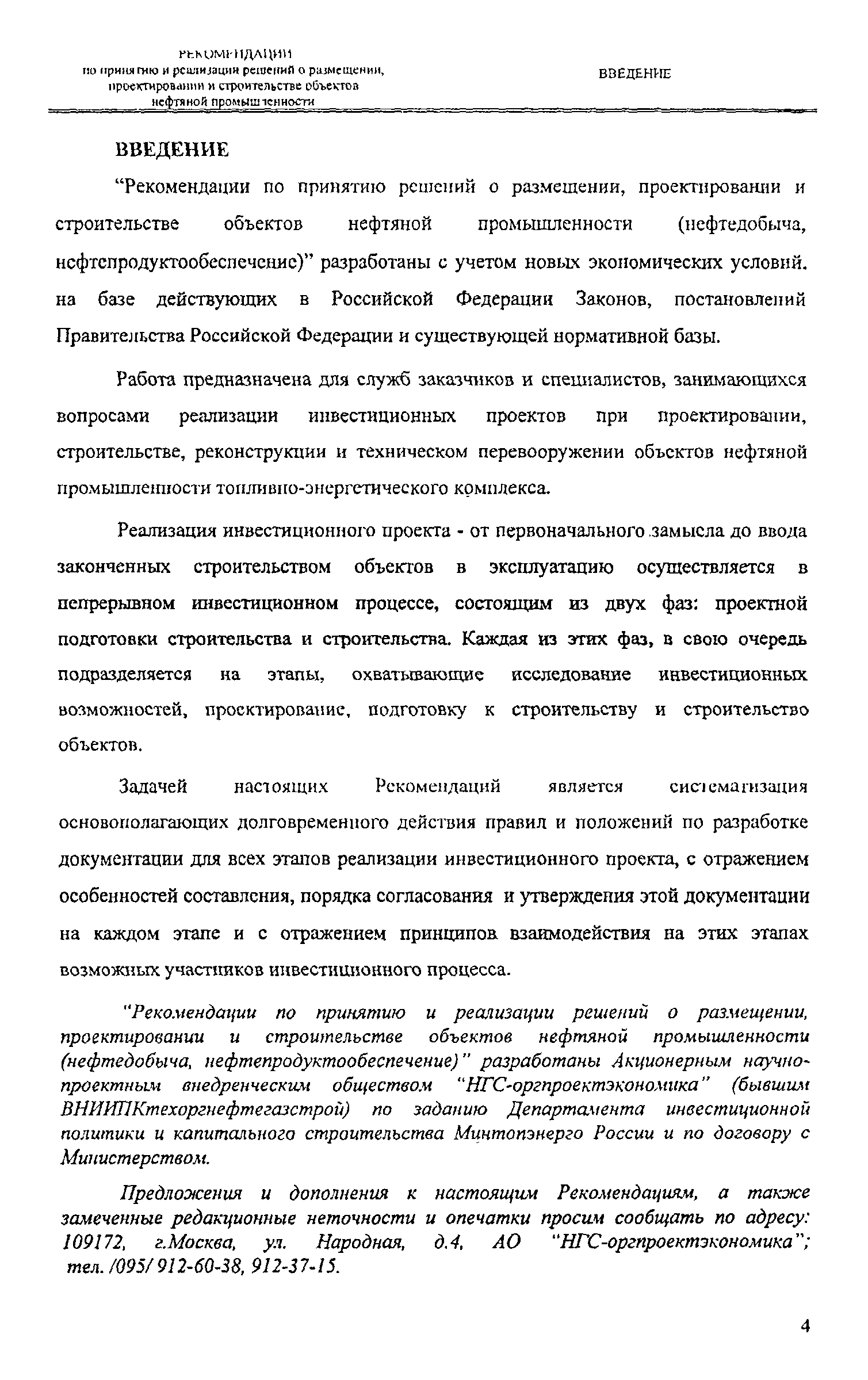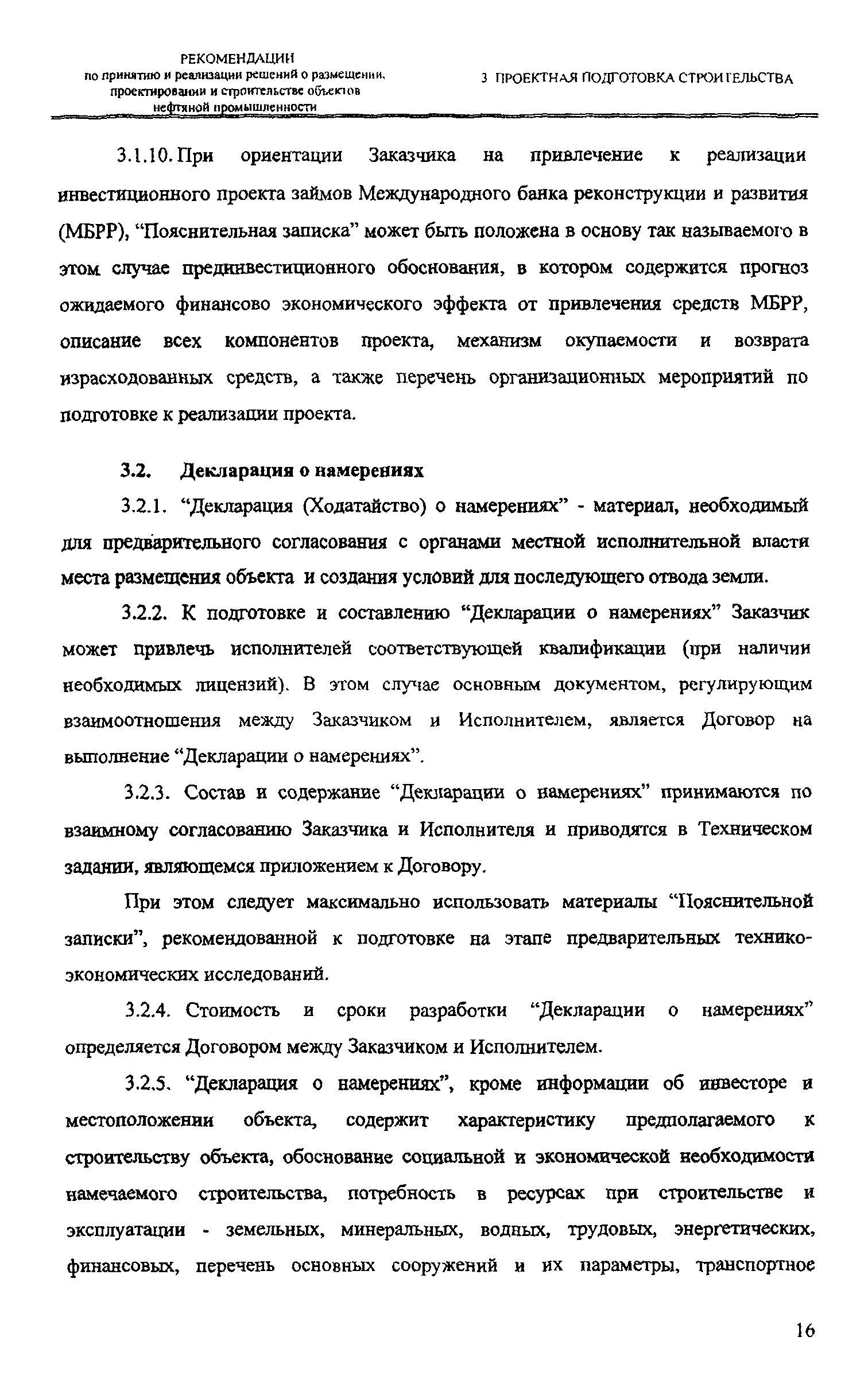 Временные рекомендации по принятию и реализации решений о размещении, проектировании и строительстве объектов нефтяной промышленности| Статус: | действует | | Название рус.: | Временные рекомендации по принятию и реализации решений о размещении, проектировании и строительстве объектов нефтяной промышленности | | Дата добавления в базу: | 01.09.2013 | | Дата актуализации: | 01.01.2021 | | Дата введения: | 01.01.1998 | | Область применения: | "Рекомендации" определяют порядок действий и состав работ, подлежащих выполнению на разных стадиях Заказчиком, Проектировщиком, Подрядчиком, иными юридическими и физическими лицами - участниками инвестиционного процесса в ходе реализации инвестиционных проектов по строительству объектов нефтедобычи и нефтепродуктообеспечения, независимо от их форм собственности и принадлежности. | | Оглавление: | Введение 1 Область применения 2 Общие положения 3 Проектная подготовка строительства 4 Взаимодействие Заказчика с органами исполнительной власти, государственного надзора и местной администрации 5 Экспертиза и утверждение проектно-сметной документации 6 Подрядны еторги (тендеры) 7 Строительство Приложение | | Разработан: | АО НГС-Оргпроектэкономика (NGS-Orgprojecteconomika AO )