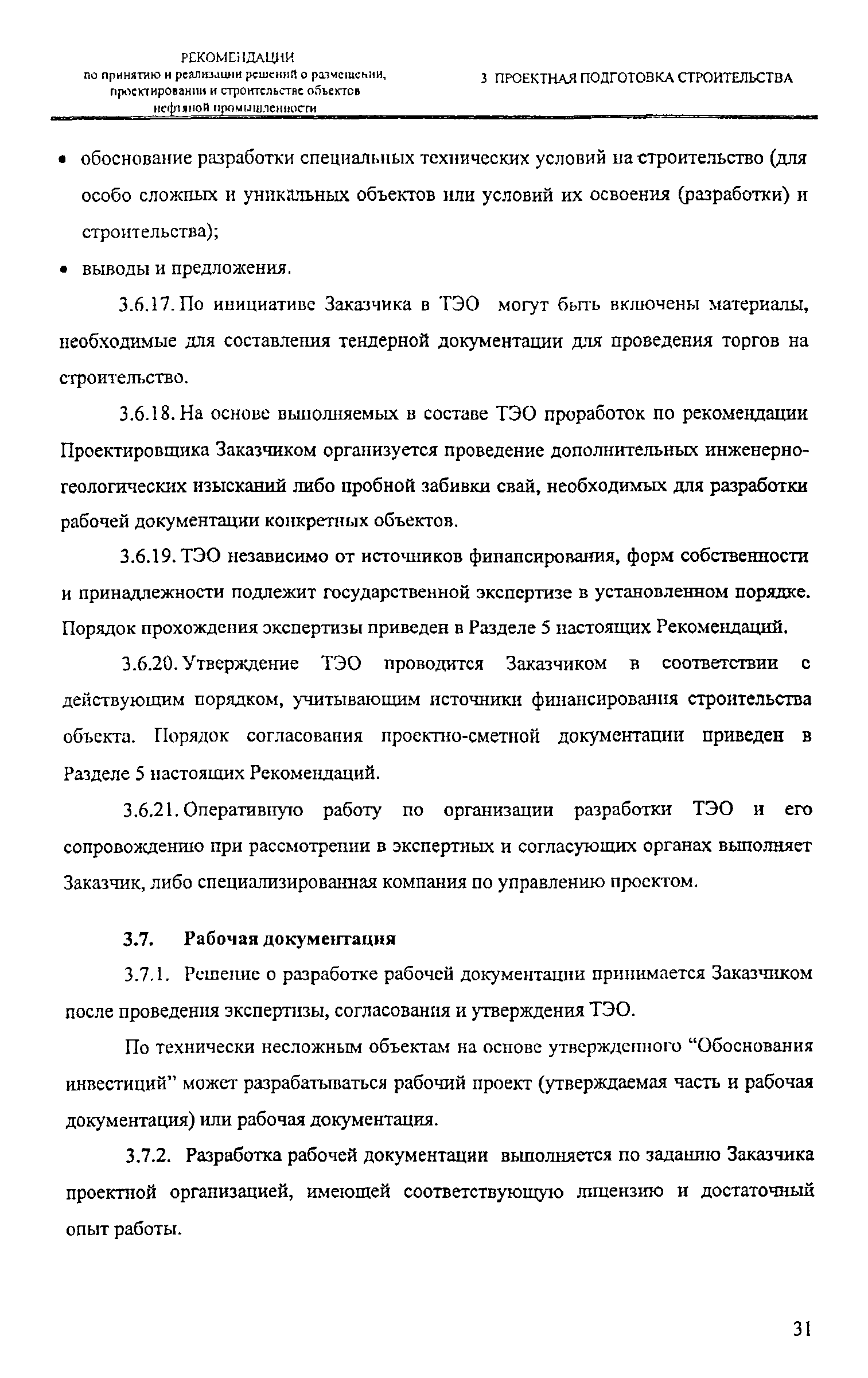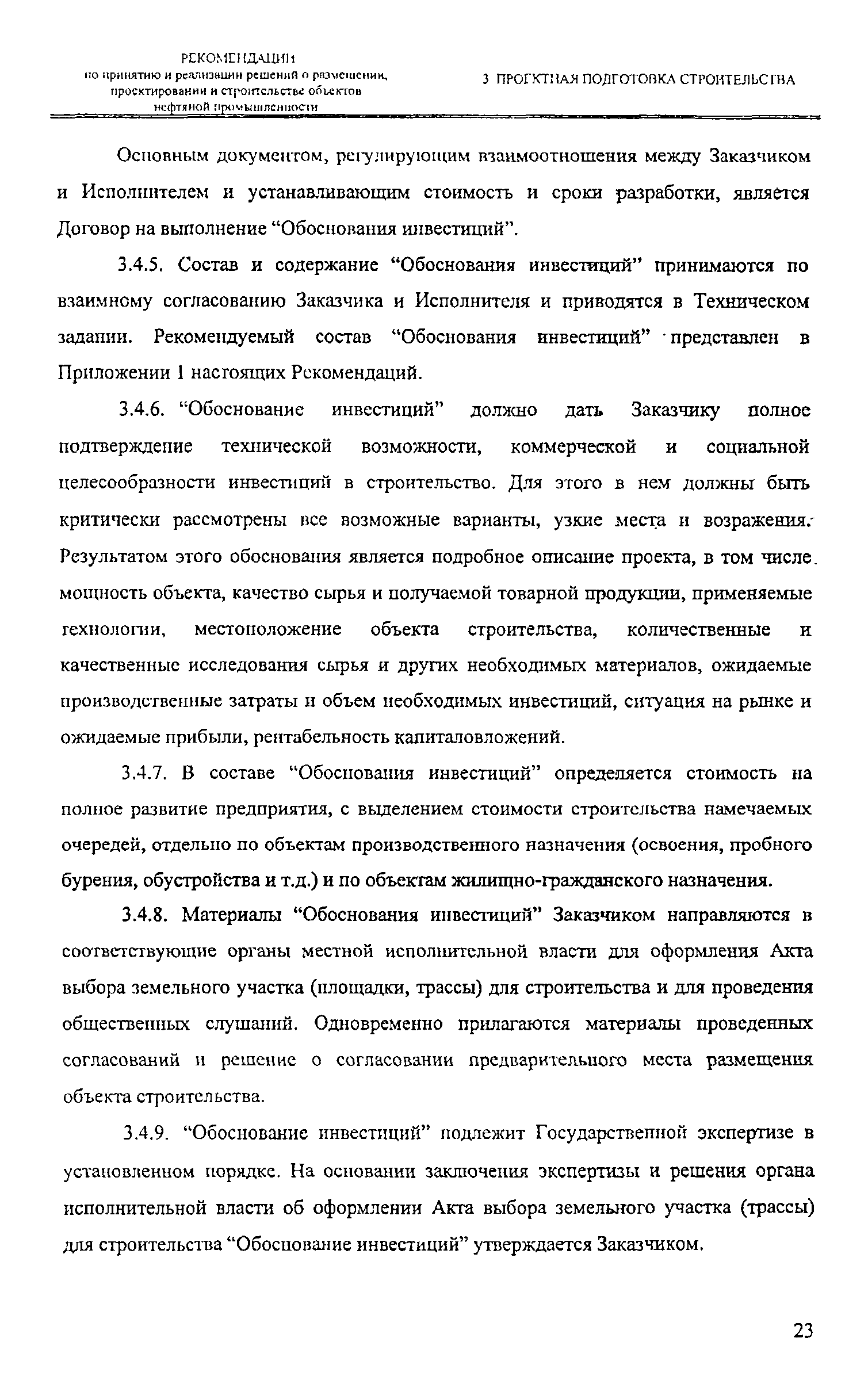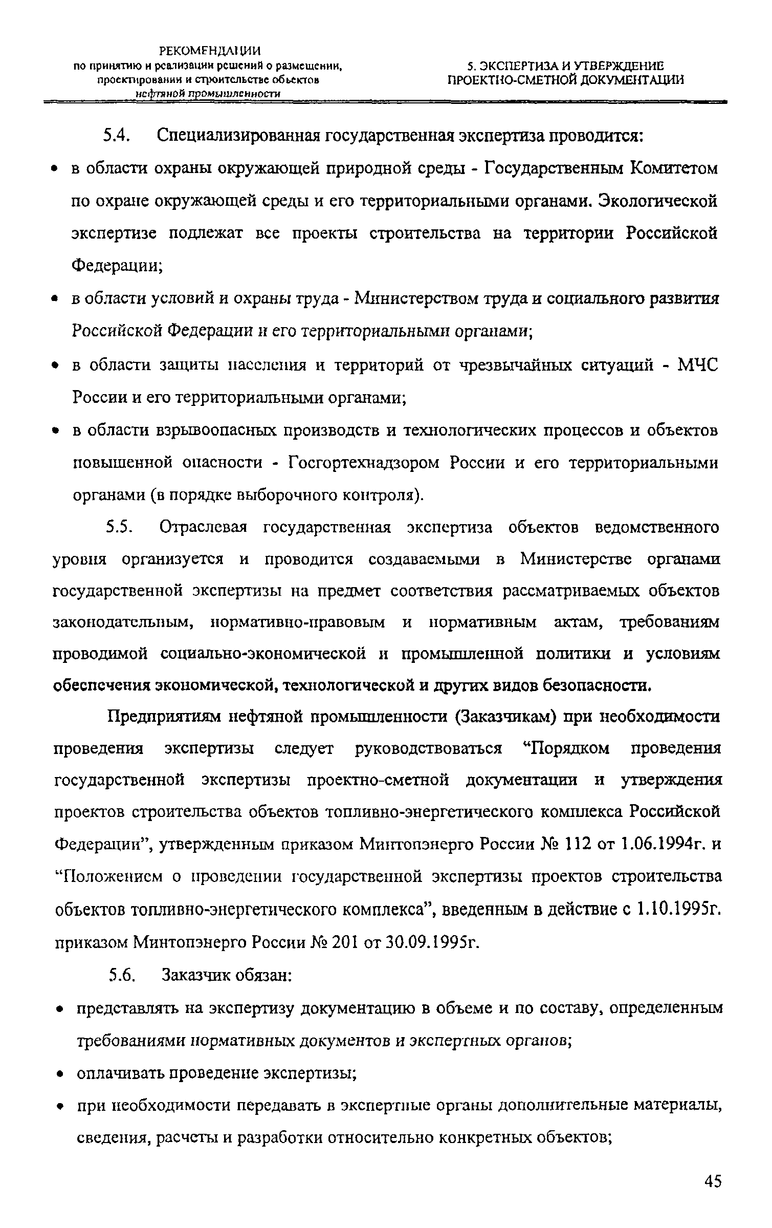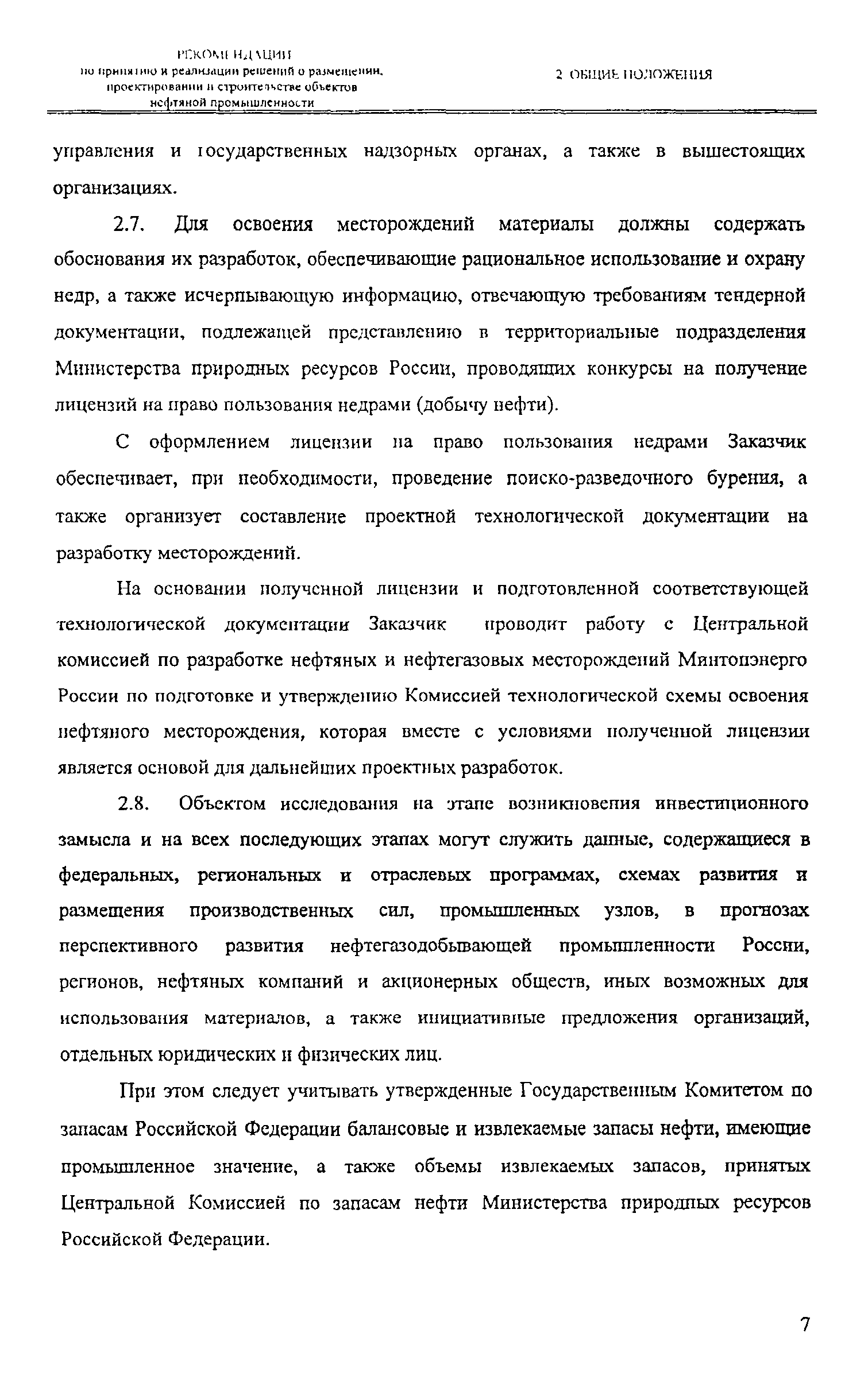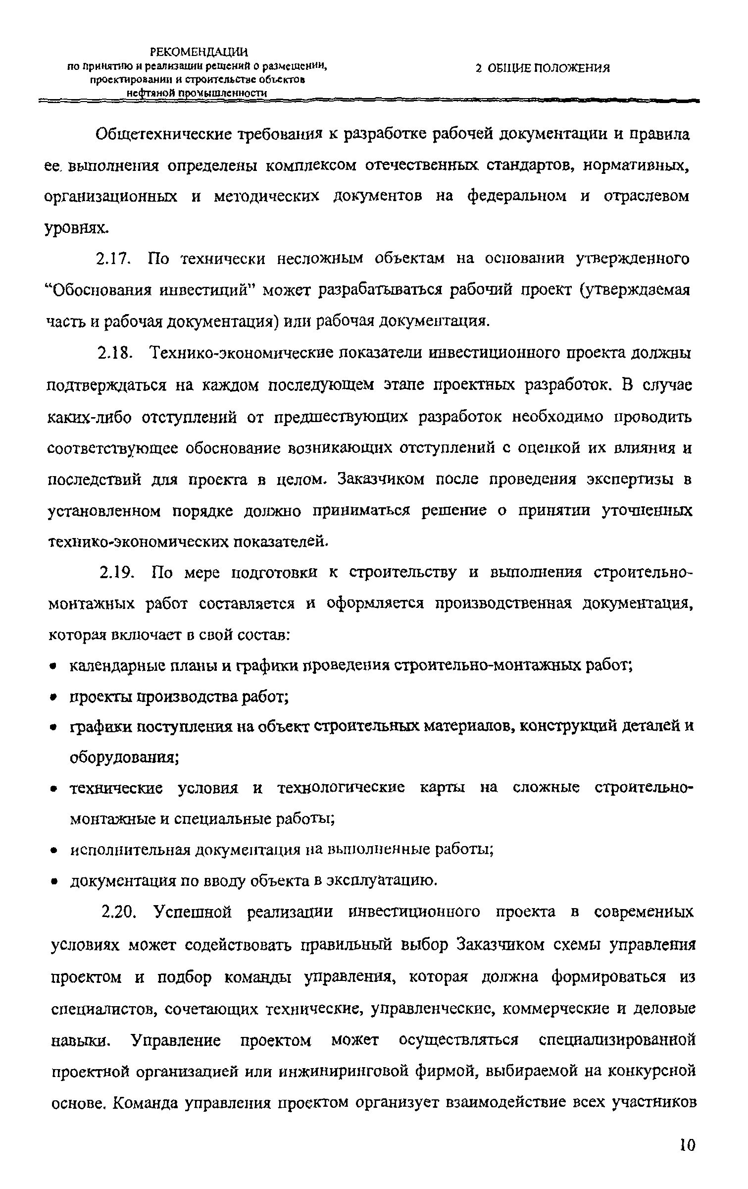 Временные рекомендации по принятию и реализации решений о размещении, проектировании и строительстве объектов нефтяной промышленности| Статус: | действует | | Название рус.: | Временные рекомендации по принятию и реализации решений о размещении, проектировании и строительстве объектов нефтяной промышленности | | Дата добавления в базу: | 01.09.2013 | | Дата актуализации: | 01.01.2021 | | Дата введения: | 01.01.1998 | | Область применения: | "Рекомендации" определяют порядок действий и состав работ, подлежащих выполнению на разных стадиях Заказчиком, Проектировщиком, Подрядчиком, иными юридическими и физическими лицами - участниками инвестиционного процесса в ходе реализации инвестиционных проектов по строительству объектов нефтедобычи и нефтепродуктообеспечения, независимо от их форм собственности и принадлежности. | | Оглавление: | Введение 1 Область применения 2 Общие положения 3 Проектная подготовка строительства 4 Взаимодействие Заказчика с органами исполнительной власти, государственного надзора и местной администрации 5 Экспертиза и утверждение проектно-сметной документации 6 Подрядны еторги (тендеры) 7 Строительство Приложение | | Разработан: | АО НГС-Оргпроектэкономика (NGS-Orgprojecteconomika AO )