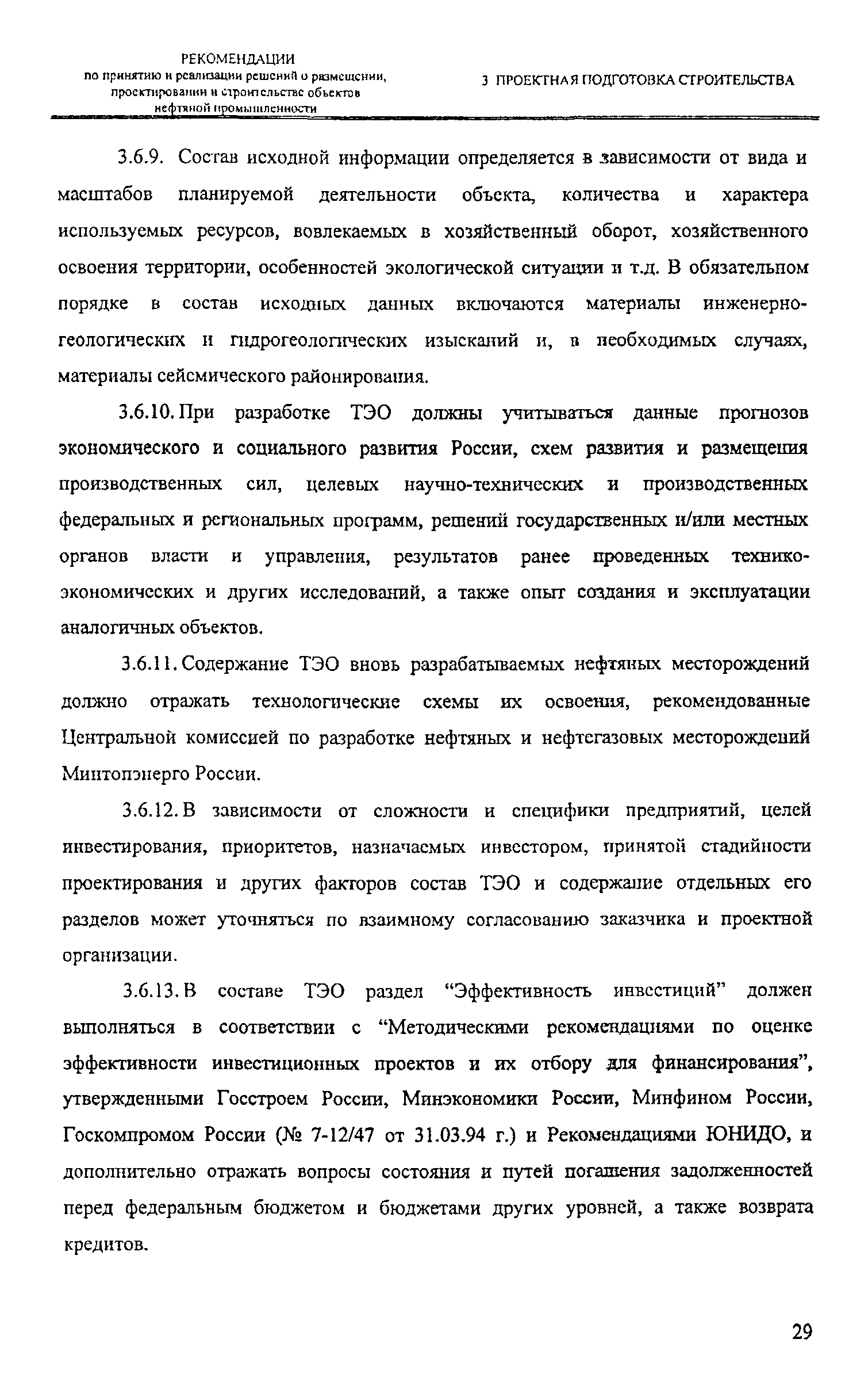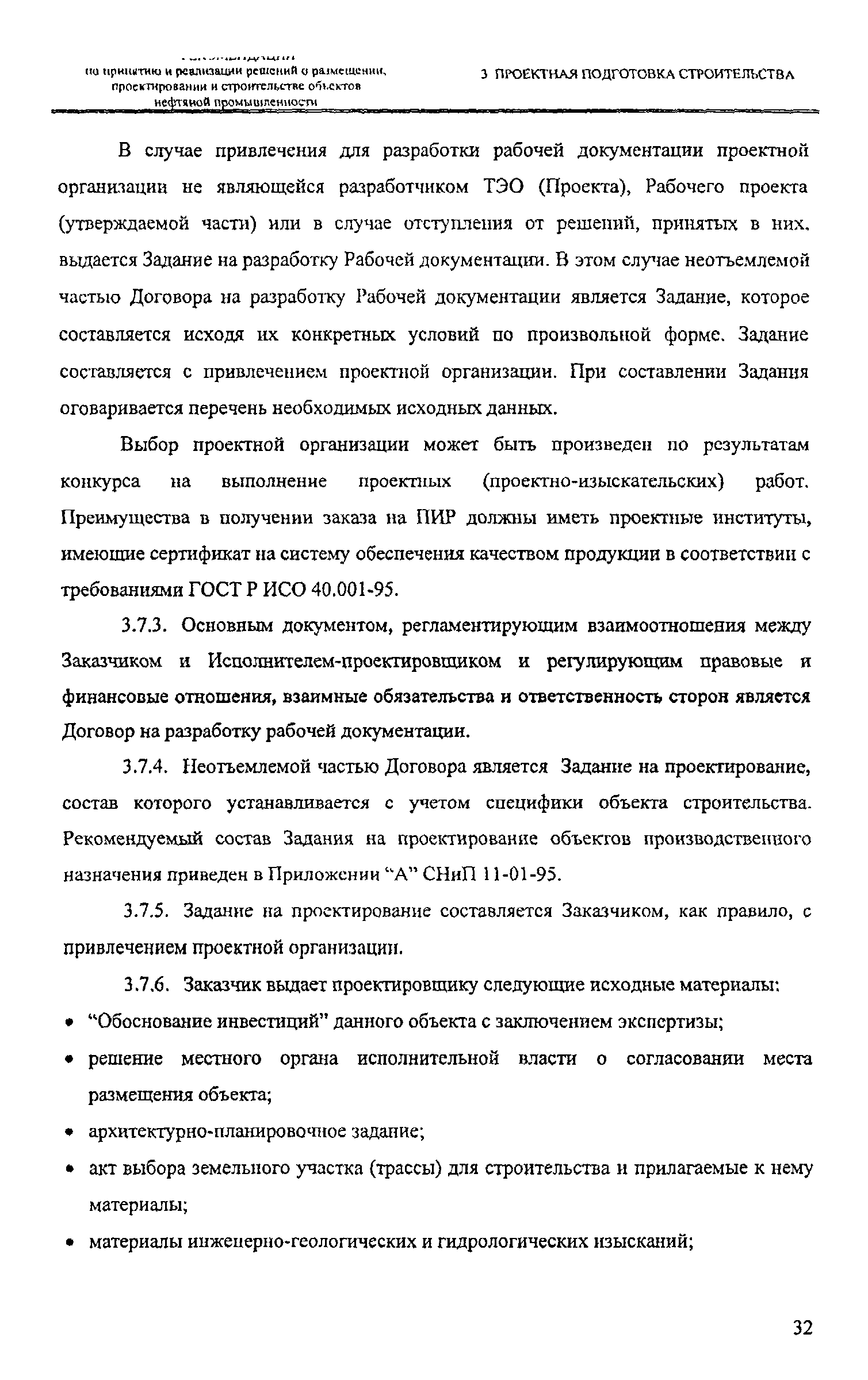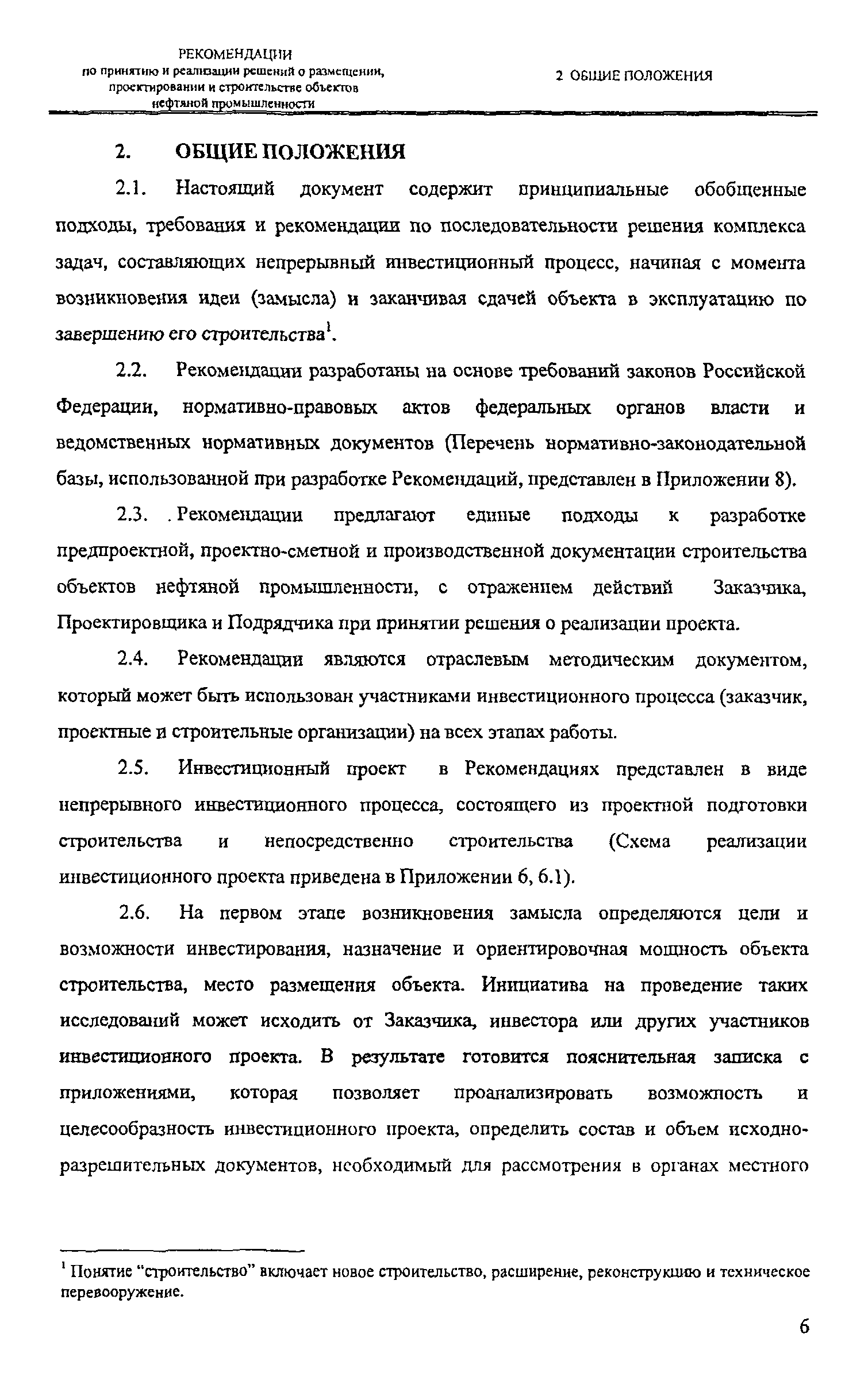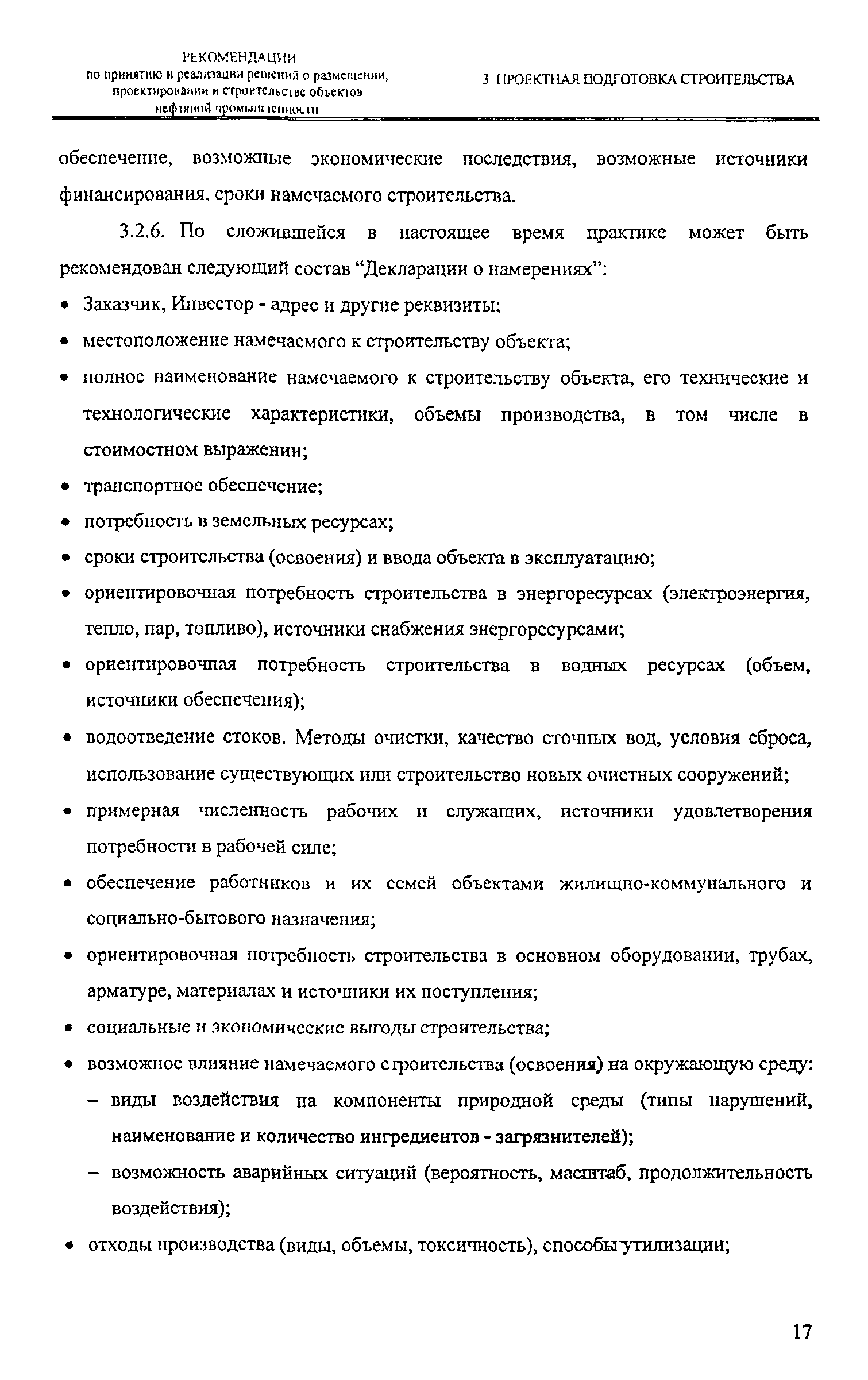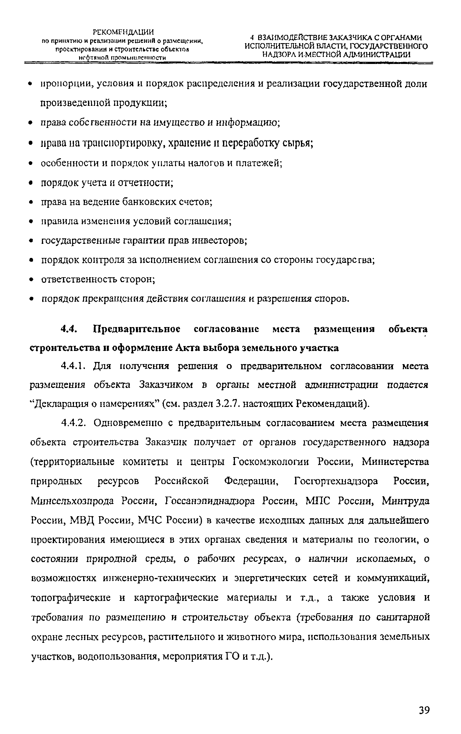 Временные рекомендации по принятию и реализации решений о размещении, проектировании и строительстве объектов нефтяной промышленности| Статус: | действует | | Название рус.: | Временные рекомендации по принятию и реализации решений о размещении, проектировании и строительстве объектов нефтяной промышленности | | Дата добавления в базу: | 01.09.2013 | | Дата актуализации: | 01.01.2021 | | Дата введения: | 01.01.1998 | | Область применения: | "Рекомендации" определяют порядок действий и состав работ, подлежащих выполнению на разных стадиях Заказчиком, Проектировщиком, Подрядчиком, иными юридическими и физическими лицами - участниками инвестиционного процесса в ходе реализации инвестиционных проектов по строительству объектов нефтедобычи и нефтепродуктообеспечения, независимо от их форм собственности и принадлежности. | | Оглавление: | Введение 1 Область применения 2 Общие положения 3 Проектная подготовка строительства 4 Взаимодействие Заказчика с органами исполнительной власти, государственного надзора и местной администрации 5 Экспертиза и утверждение проектно-сметной документации 6 Подрядны еторги (тендеры) 7 Строительство Приложение | | Разработан: | АО НГС-Оргпроектэкономика (NGS-Orgprojecteconomika AO )