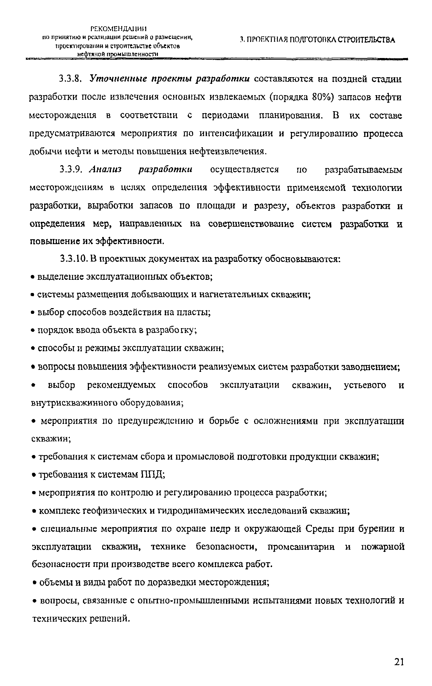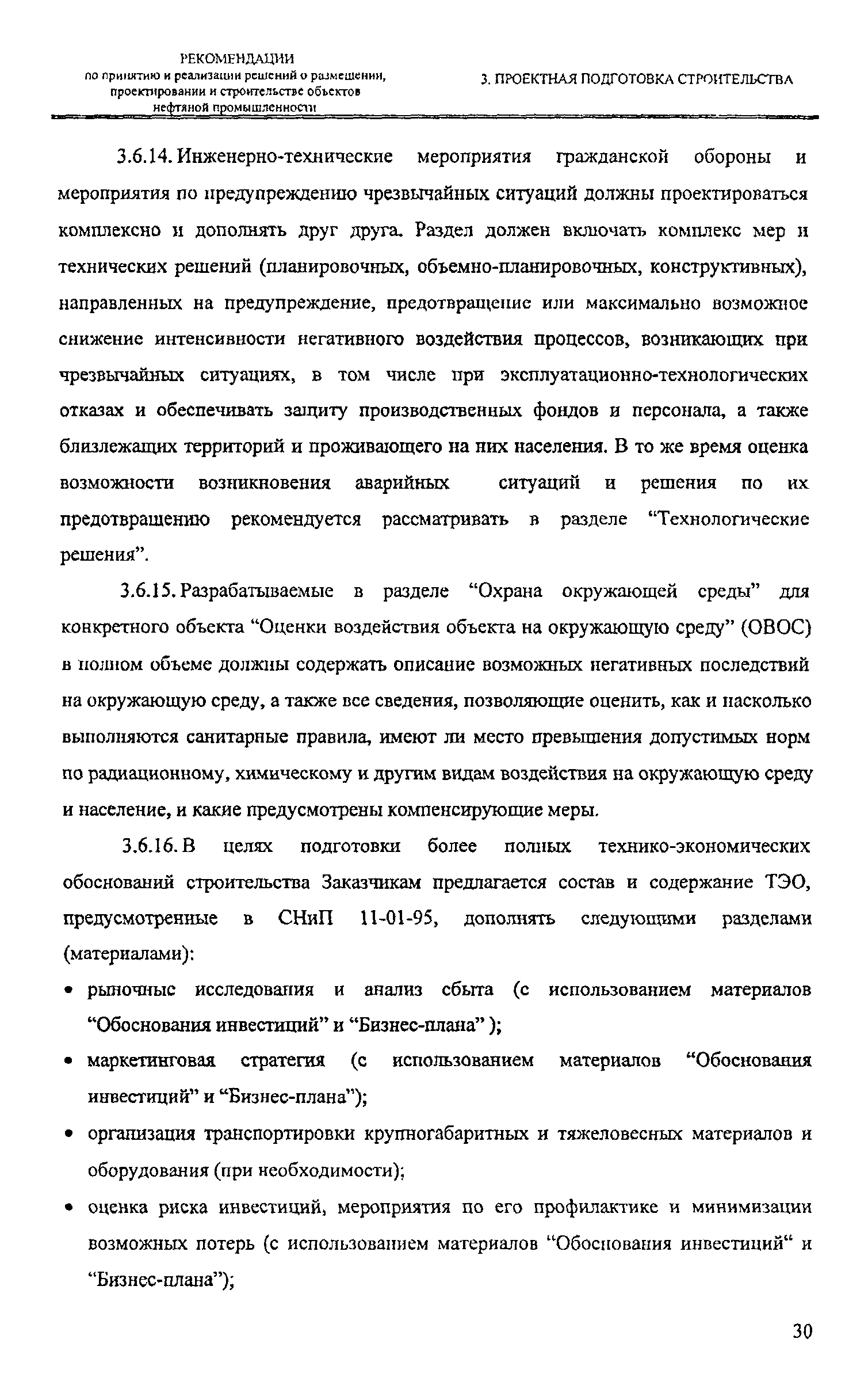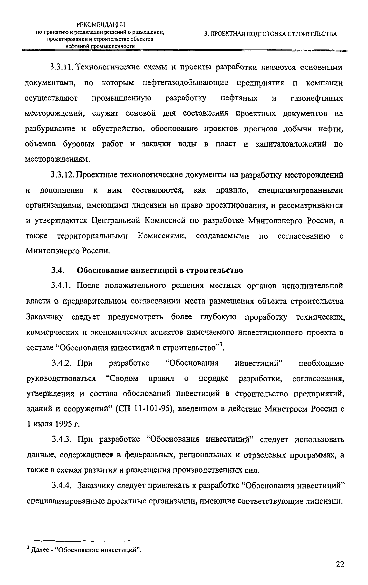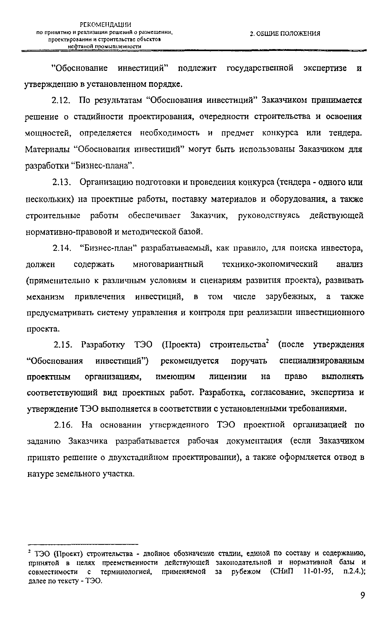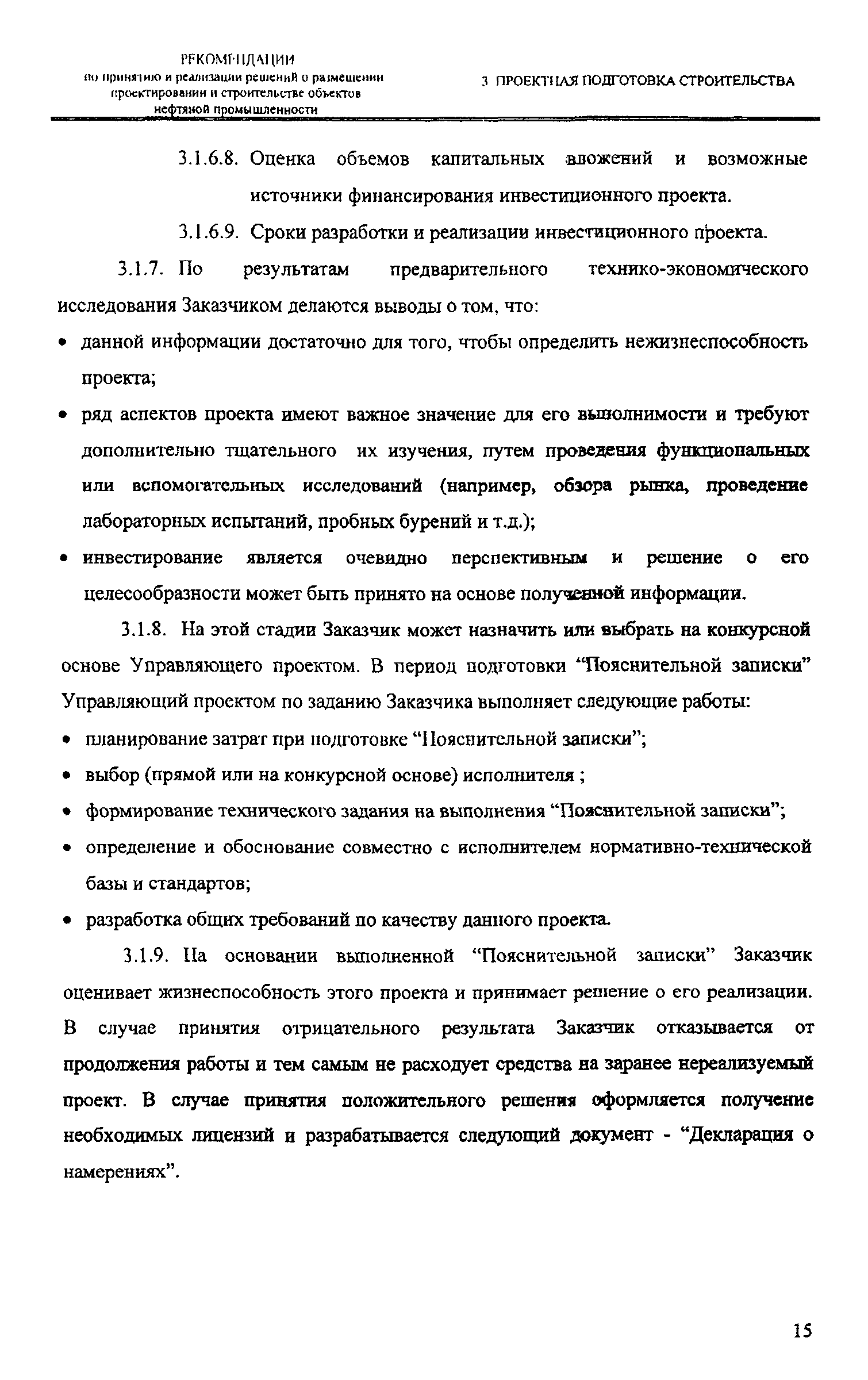 Временные рекомендации по принятию и реализации решений о размещении, проектировании и строительстве объектов нефтяной промышленности| Статус: | действует | | Название рус.: | Временные рекомендации по принятию и реализации решений о размещении, проектировании и строительстве объектов нефтяной промышленности | | Дата добавления в базу: | 01.09.2013 | | Дата актуализации: | 01.01.2021 | | Дата введения: | 01.01.1998 | | Область применения: | "Рекомендации" определяют порядок действий и состав работ, подлежащих выполнению на разных стадиях Заказчиком, Проектировщиком, Подрядчиком, иными юридическими и физическими лицами - участниками инвестиционного процесса в ходе реализации инвестиционных проектов по строительству объектов нефтедобычи и нефтепродуктообеспечения, независимо от их форм собственности и принадлежности. | | Оглавление: | Введение 1 Область применения 2 Общие положения 3 Проектная подготовка строительства 4 Взаимодействие Заказчика с органами исполнительной власти, государственного надзора и местной администрации 5 Экспертиза и утверждение проектно-сметной документации 6 Подрядны еторги (тендеры) 7 Строительство Приложение | | Разработан: | АО НГС-Оргпроектэкономика (NGS-Orgprojecteconomika AO )