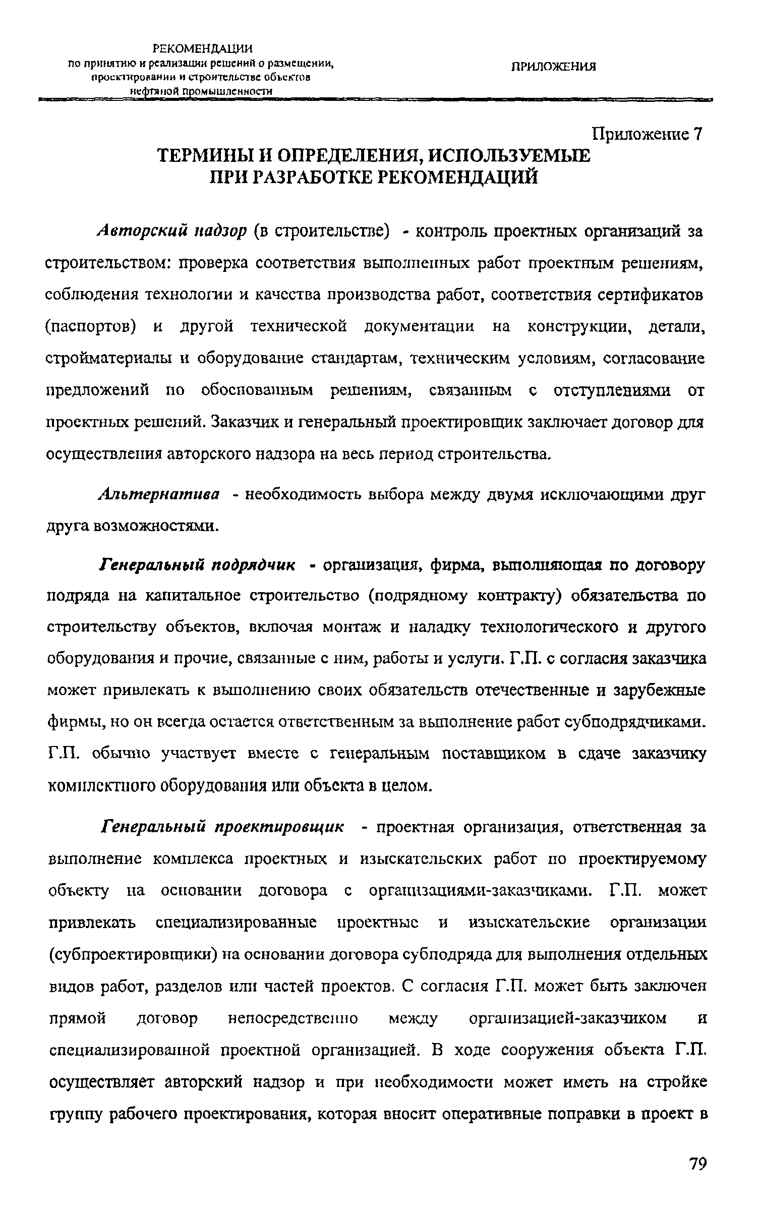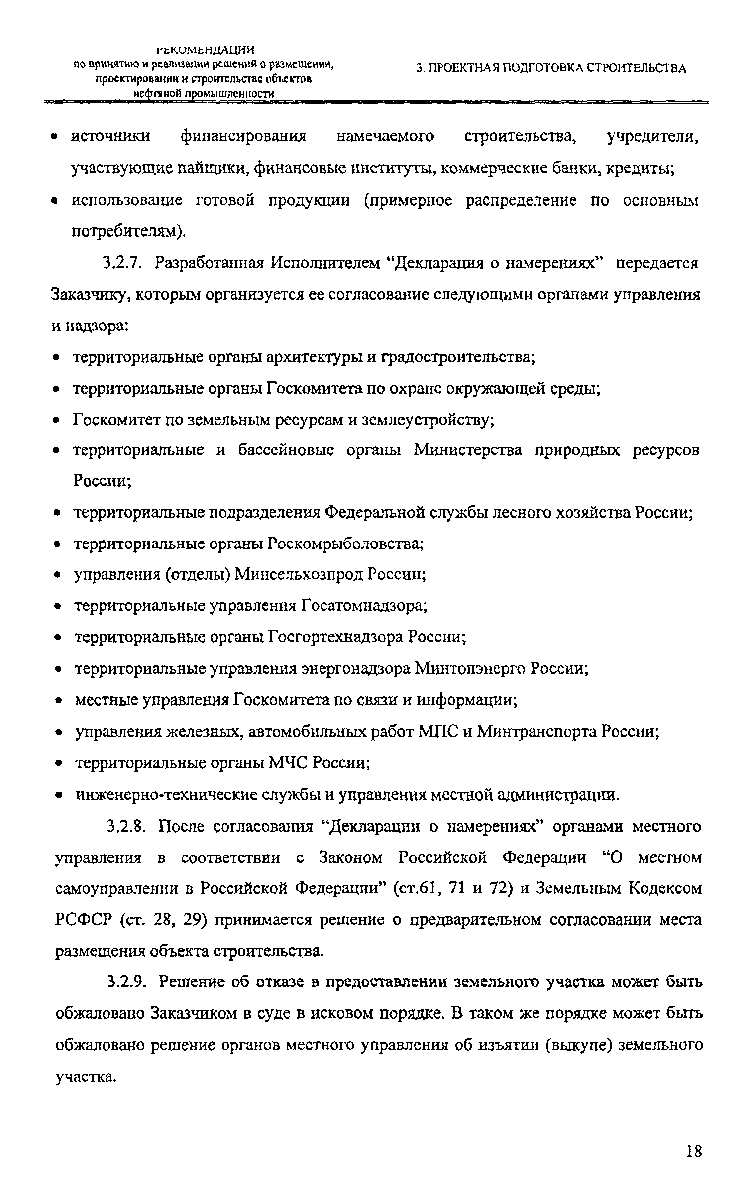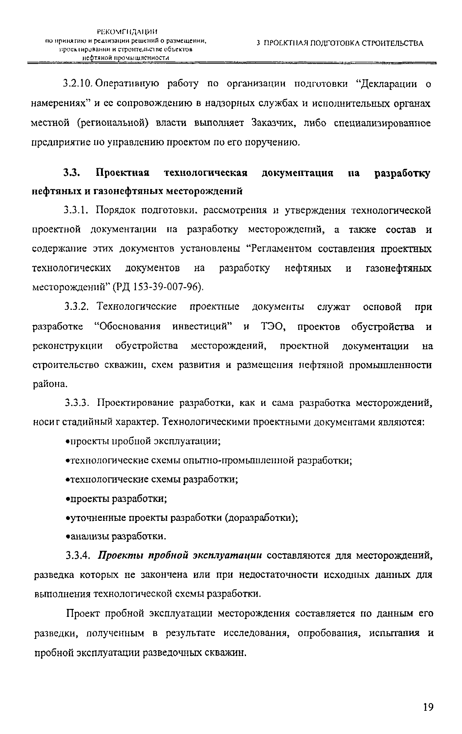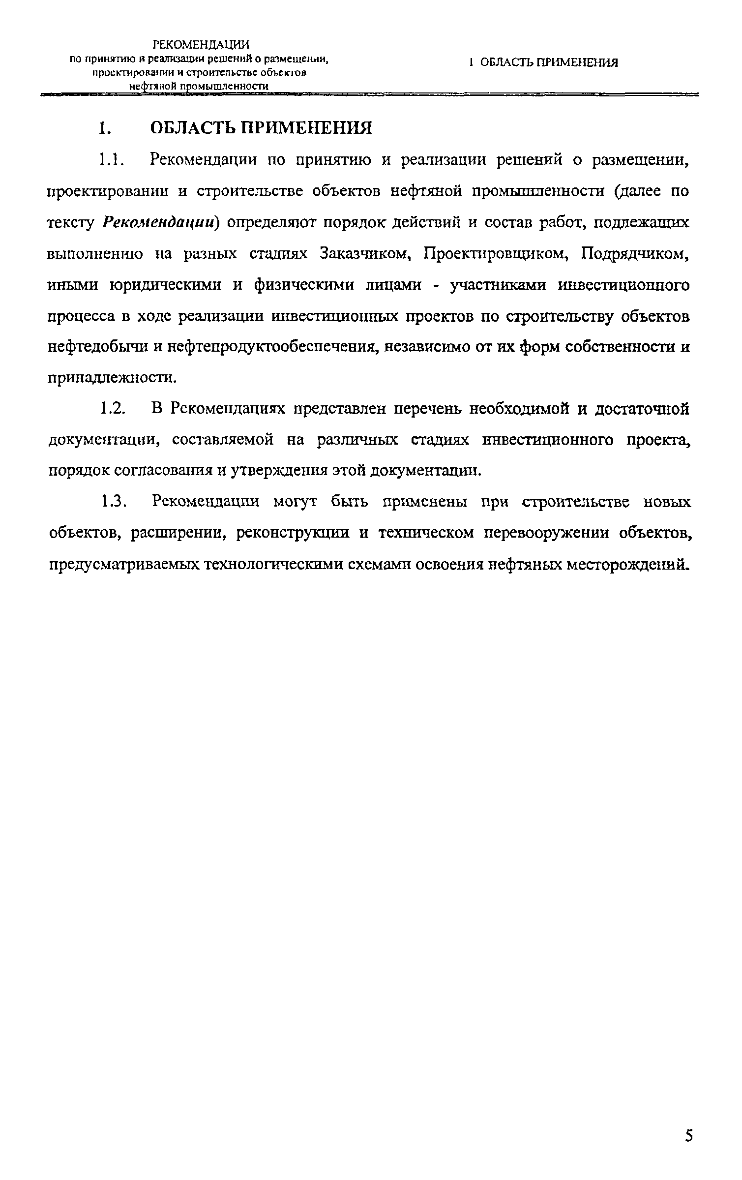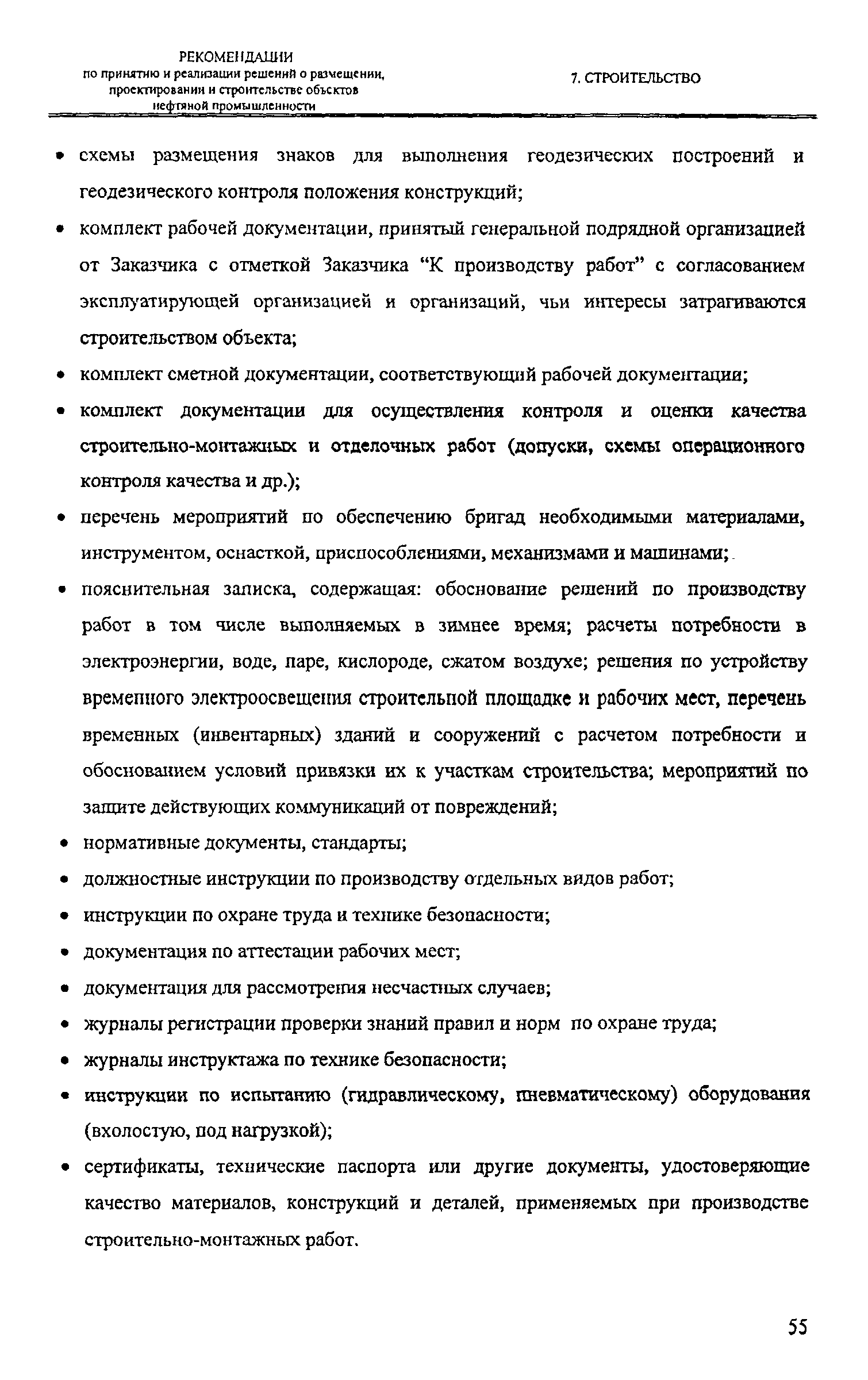 Временные рекомендации по принятию и реализации решений о размещении, проектировании и строительстве объектов нефтяной промышленности| Статус: | действует | | Название рус.: | Временные рекомендации по принятию и реализации решений о размещении, проектировании и строительстве объектов нефтяной промышленности | | Дата добавления в базу: | 01.09.2013 | | Дата актуализации: | 01.01.2021 | | Дата введения: | 01.01.1998 | | Область применения: | "Рекомендации" определяют порядок действий и состав работ, подлежащих выполнению на разных стадиях Заказчиком, Проектировщиком, Подрядчиком, иными юридическими и физическими лицами - участниками инвестиционного процесса в ходе реализации инвестиционных проектов по строительству объектов нефтедобычи и нефтепродуктообеспечения, независимо от их форм собственности и принадлежности. | | Оглавление: | Введение 1 Область применения 2 Общие положения 3 Проектная подготовка строительства 4 Взаимодействие Заказчика с органами исполнительной власти, государственного надзора и местной администрации 5 Экспертиза и утверждение проектно-сметной документации 6 Подрядны еторги (тендеры) 7 Строительство Приложение | | Разработан: | АО НГС-Оргпроектэкономика (NGS-Orgprojecteconomika AO )