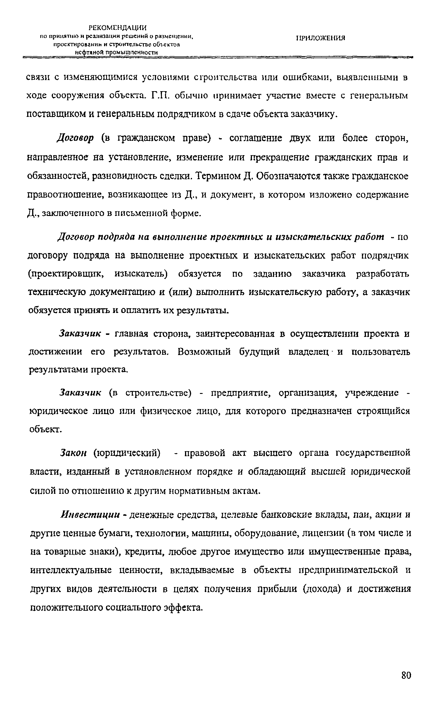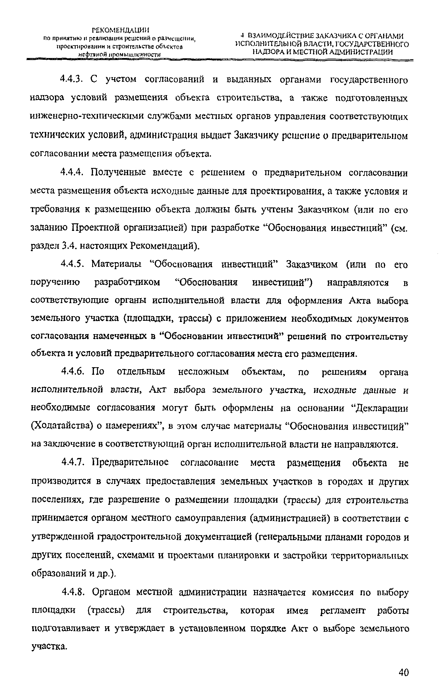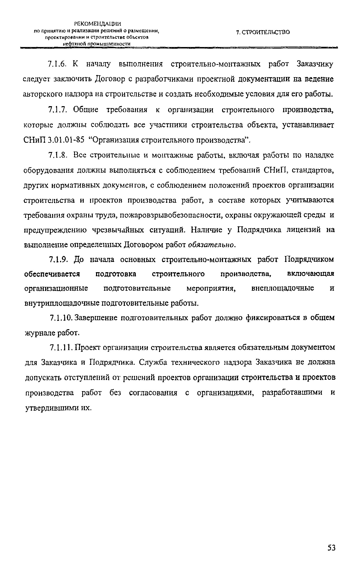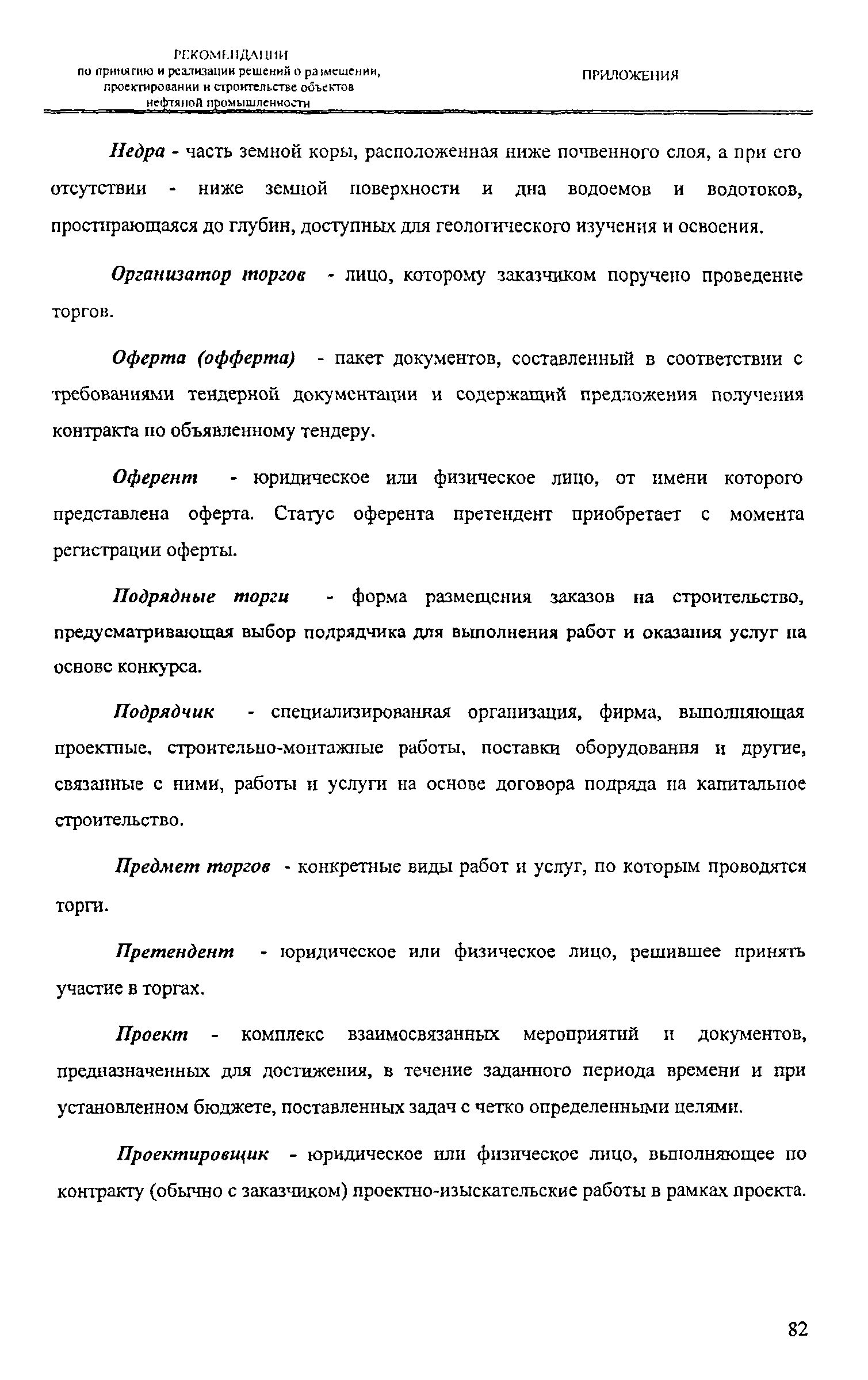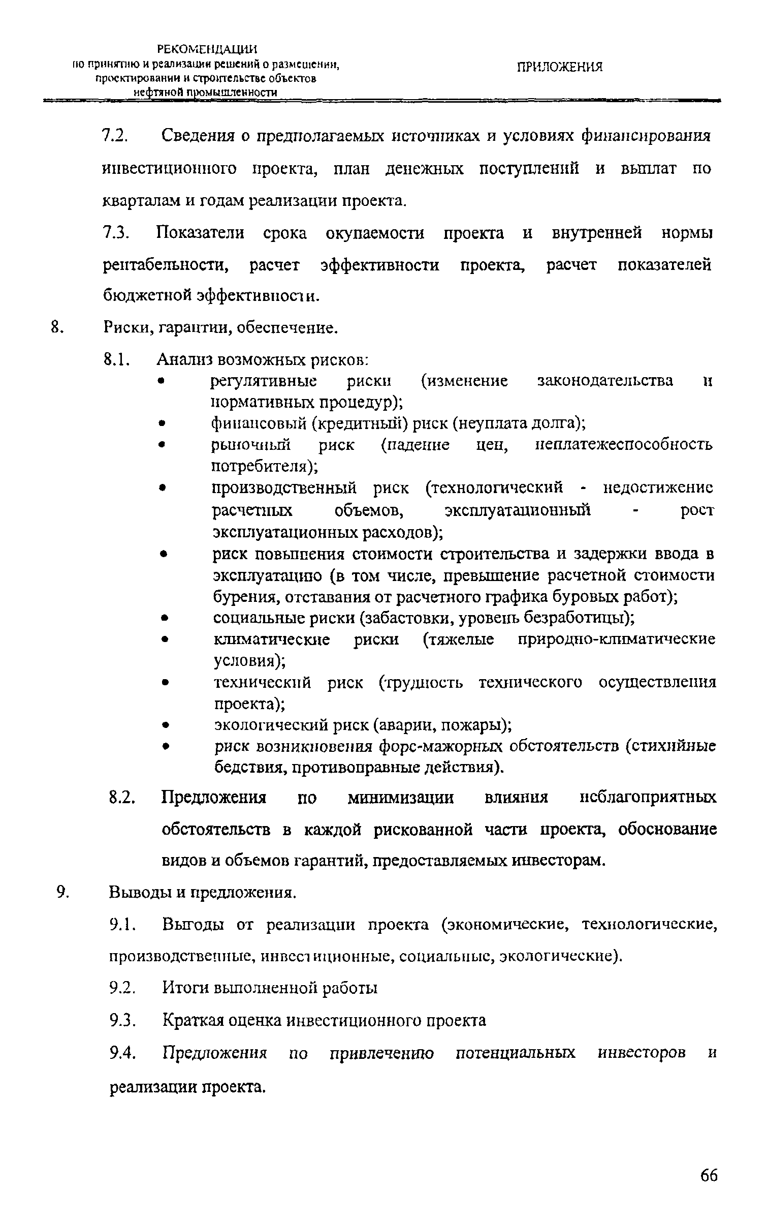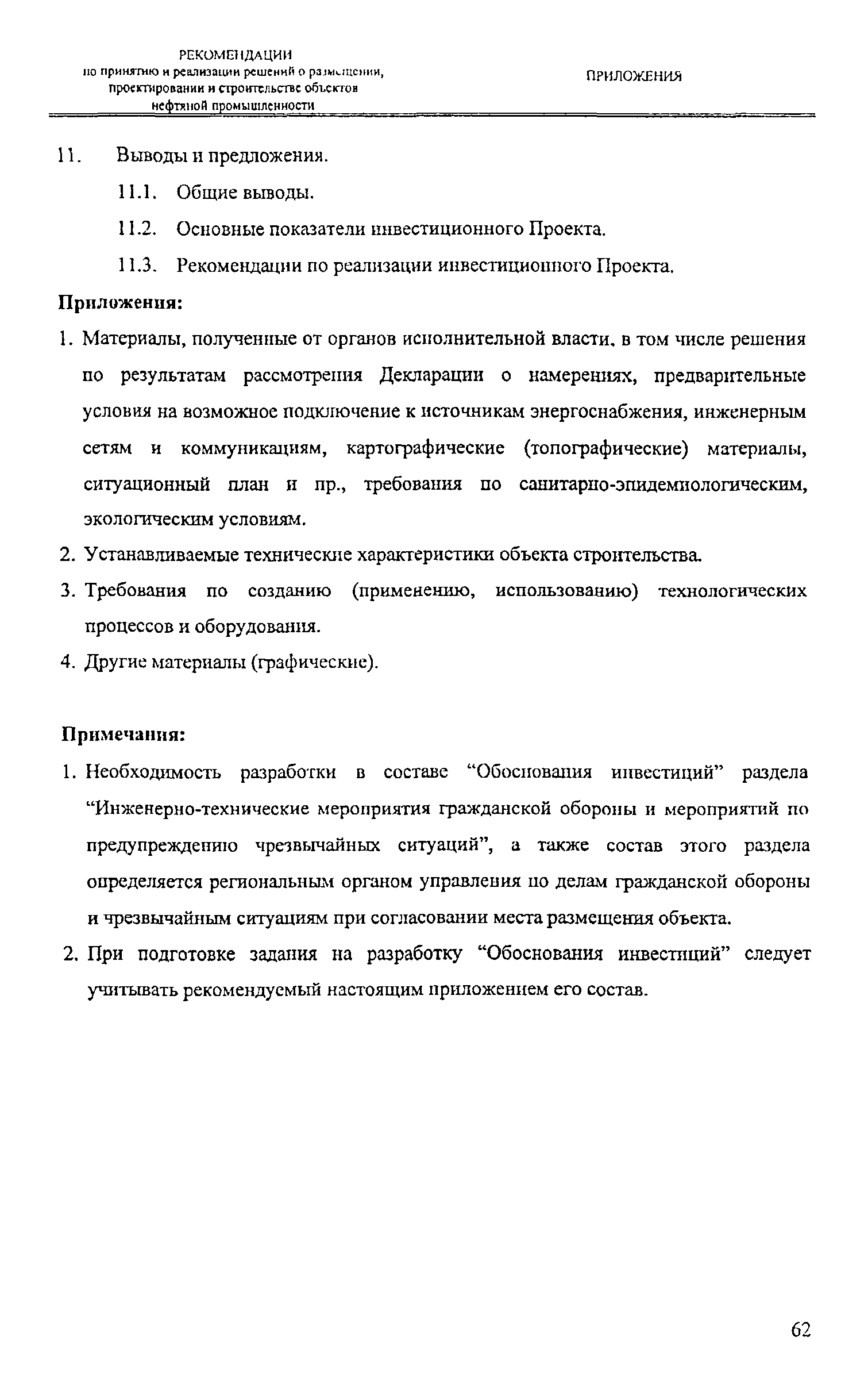 Временные рекомендации по принятию и реализации решений о размещении, проектировании и строительстве объектов нефтяной промышленности| Статус: | действует | | Название рус.: | Временные рекомендации по принятию и реализации решений о размещении, проектировании и строительстве объектов нефтяной промышленности | | Дата добавления в базу: | 01.09.2013 | | Дата актуализации: | 01.01.2021 | | Дата введения: | 01.01.1998 | | Область применения: | "Рекомендации" определяют порядок действий и состав работ, подлежащих выполнению на разных стадиях Заказчиком, Проектировщиком, Подрядчиком, иными юридическими и физическими лицами - участниками инвестиционного процесса в ходе реализации инвестиционных проектов по строительству объектов нефтедобычи и нефтепродуктообеспечения, независимо от их форм собственности и принадлежности. | | Оглавление: | Введение 1 Область применения 2 Общие положения 3 Проектная подготовка строительства 4 Взаимодействие Заказчика с органами исполнительной власти, государственного надзора и местной администрации 5 Экспертиза и утверждение проектно-сметной документации 6 Подрядны еторги (тендеры) 7 Строительство Приложение | | Разработан: | АО НГС-Оргпроектэкономика (NGS-Orgprojecteconomika AO )