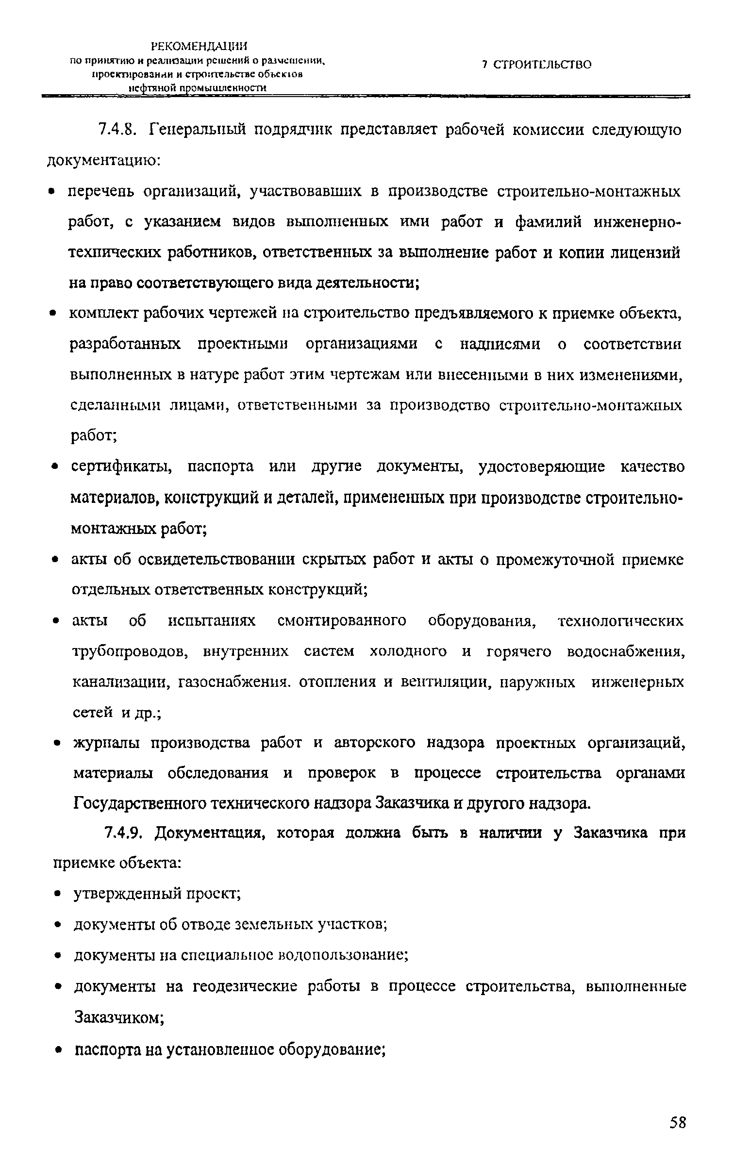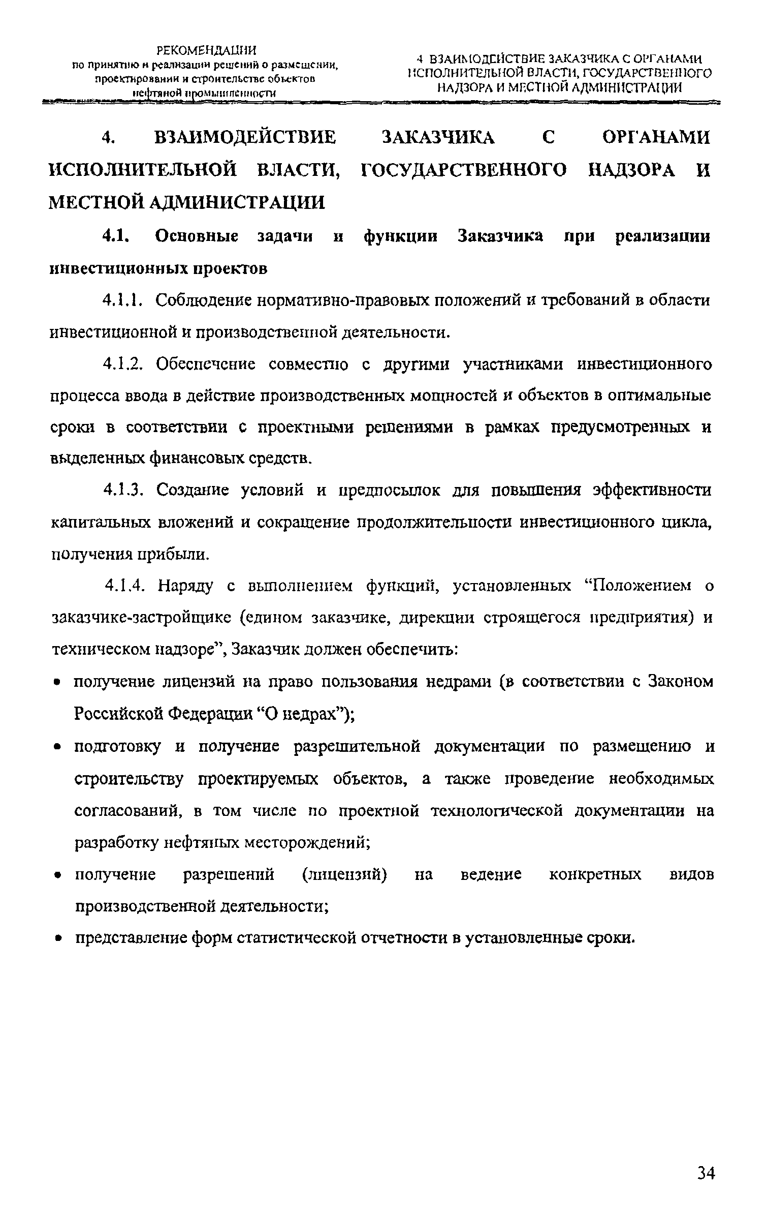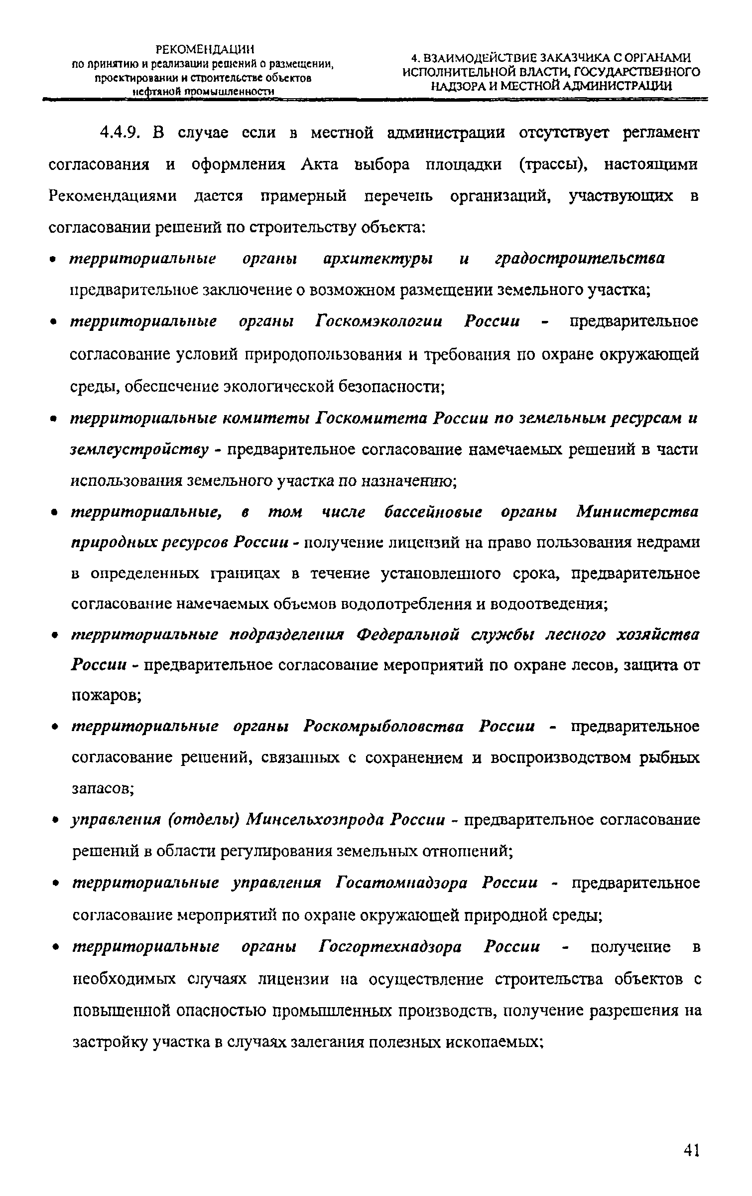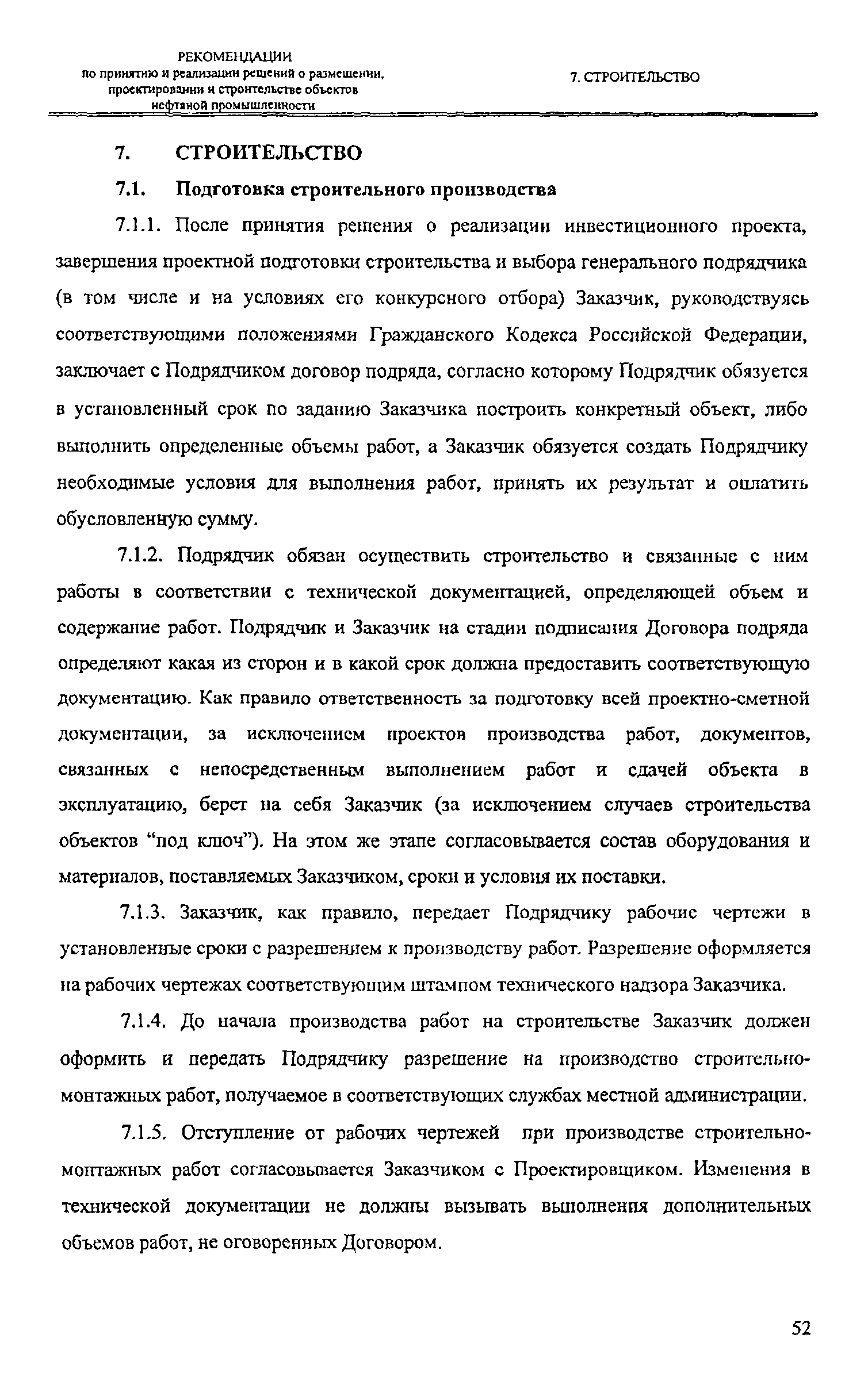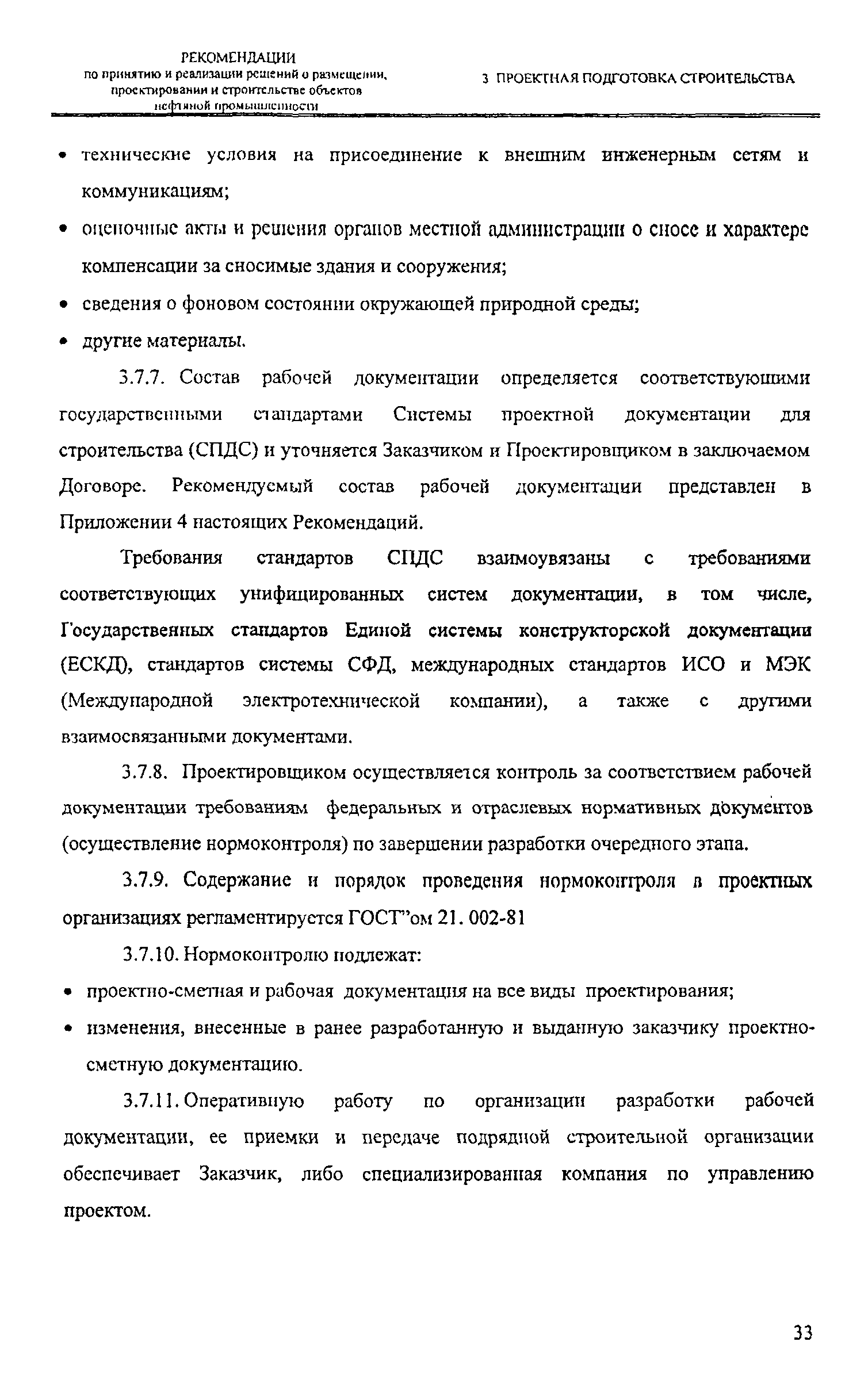 Временные рекомендации по принятию и реализации решений о размещении, проектировании и строительстве объектов нефтяной промышленности| Статус: | действует | | Название рус.: | Временные рекомендации по принятию и реализации решений о размещении, проектировании и строительстве объектов нефтяной промышленности | | Дата добавления в базу: | 01.09.2013 | | Дата актуализации: | 01.01.2021 | | Дата введения: | 01.01.1998 | | Область применения: | "Рекомендации" определяют порядок действий и состав работ, подлежащих выполнению на разных стадиях Заказчиком, Проектировщиком, Подрядчиком, иными юридическими и физическими лицами - участниками инвестиционного процесса в ходе реализации инвестиционных проектов по строительству объектов нефтедобычи и нефтепродуктообеспечения, независимо от их форм собственности и принадлежности. | | Оглавление: | Введение 1 Область применения 2 Общие положения 3 Проектная подготовка строительства 4 Взаимодействие Заказчика с органами исполнительной власти, государственного надзора и местной администрации 5 Экспертиза и утверждение проектно-сметной документации 6 Подрядны еторги (тендеры) 7 Строительство Приложение | | Разработан: | АО НГС-Оргпроектэкономика (NGS-Orgprojecteconomika AO )
