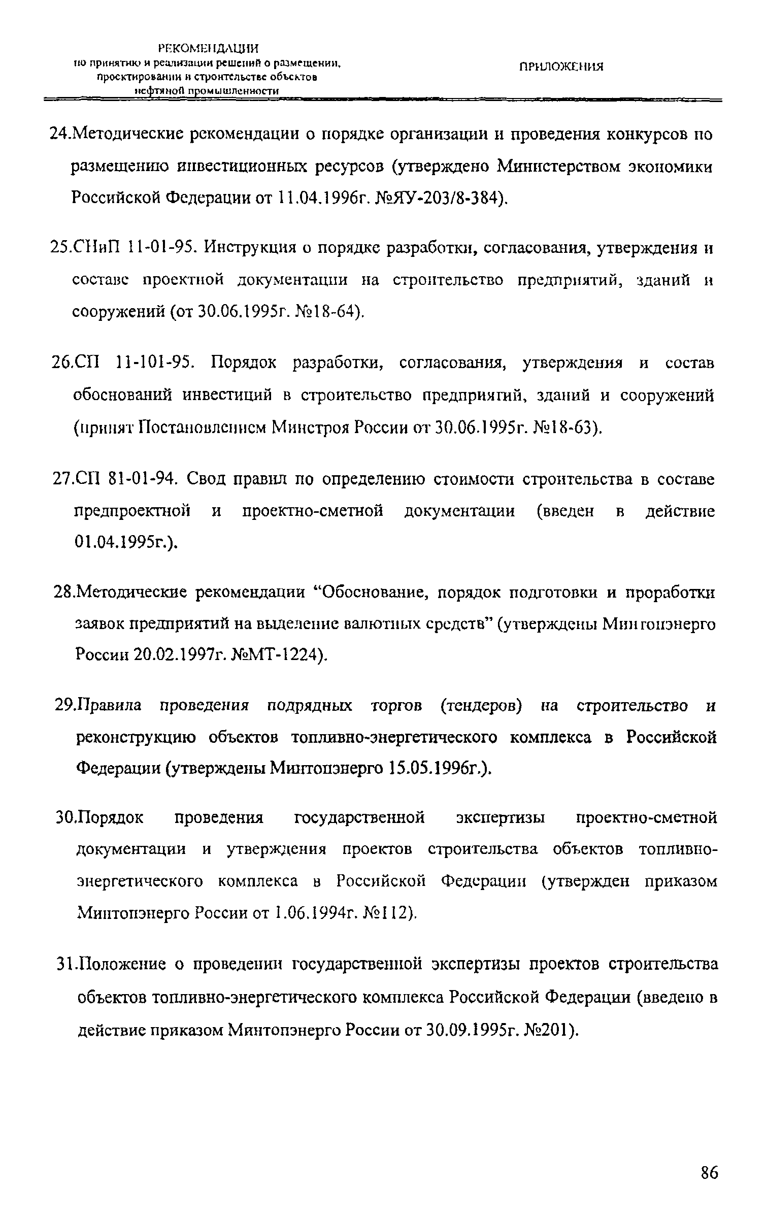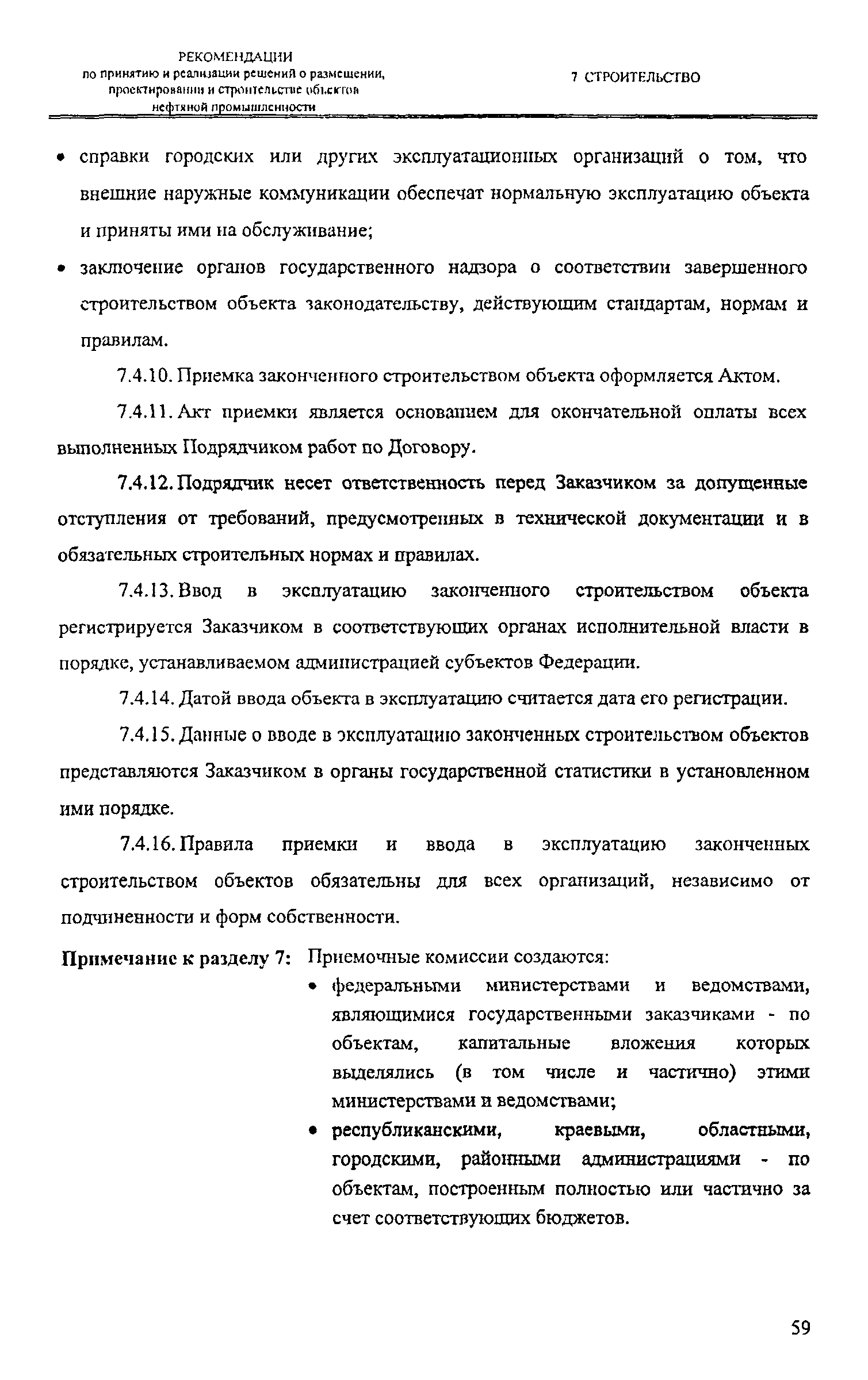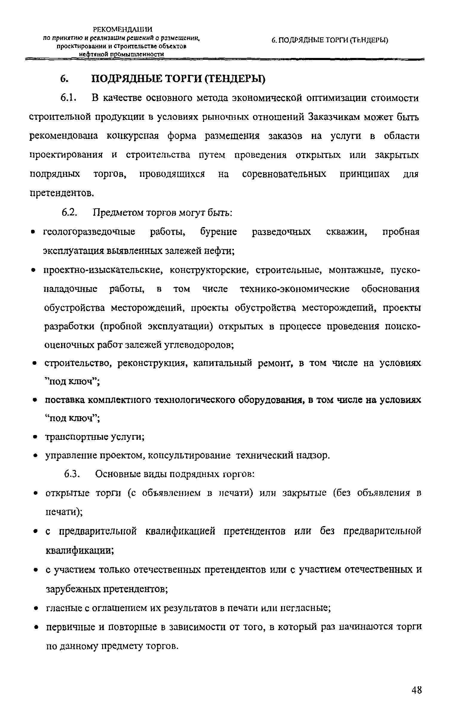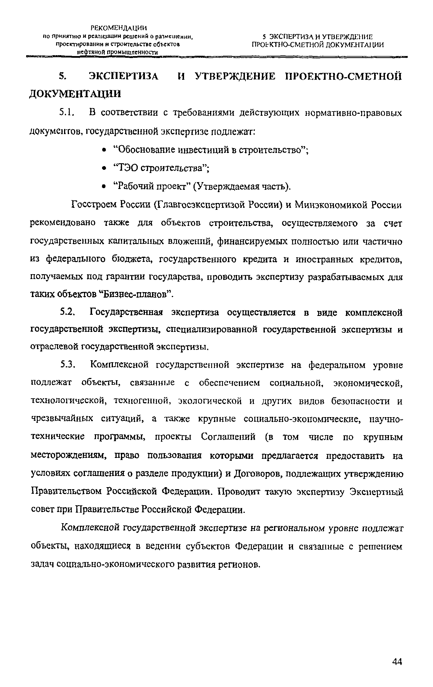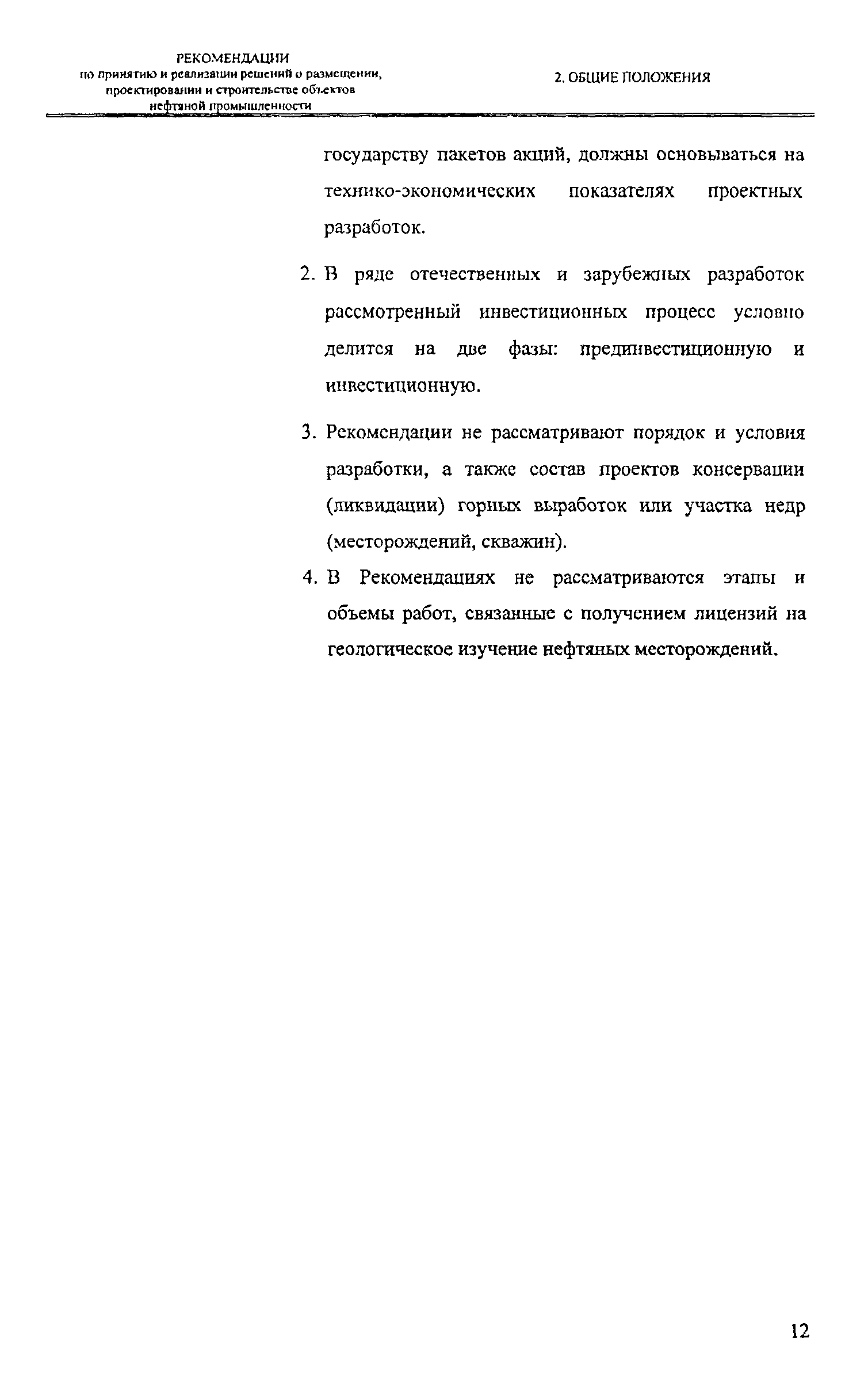 Временные рекомендации по принятию и реализации решений о размещении, проектировании и строительстве объектов нефтяной промышленности| Статус: | действует | | Название рус.: | Временные рекомендации по принятию и реализации решений о размещении, проектировании и строительстве объектов нефтяной промышленности | | Дата добавления в базу: | 01.09.2013 | | Дата актуализации: | 01.01.2021 | | Дата введения: | 01.01.1998 | | Область применения: | "Рекомендации" определяют порядок действий и состав работ, подлежащих выполнению на разных стадиях Заказчиком, Проектировщиком, Подрядчиком, иными юридическими и физическими лицами - участниками инвестиционного процесса в ходе реализации инвестиционных проектов по строительству объектов нефтедобычи и нефтепродуктообеспечения, независимо от их форм собственности и принадлежности. | | Оглавление: | Введение 1 Область применения 2 Общие положения 3 Проектная подготовка строительства 4 Взаимодействие Заказчика с органами исполнительной власти, государственного надзора и местной администрации 5 Экспертиза и утверждение проектно-сметной документации 6 Подрядны еторги (тендеры) 7 Строительство Приложение | | Разработан: | АО НГС-Оргпроектэкономика (NGS-Orgprojecteconomika AO )