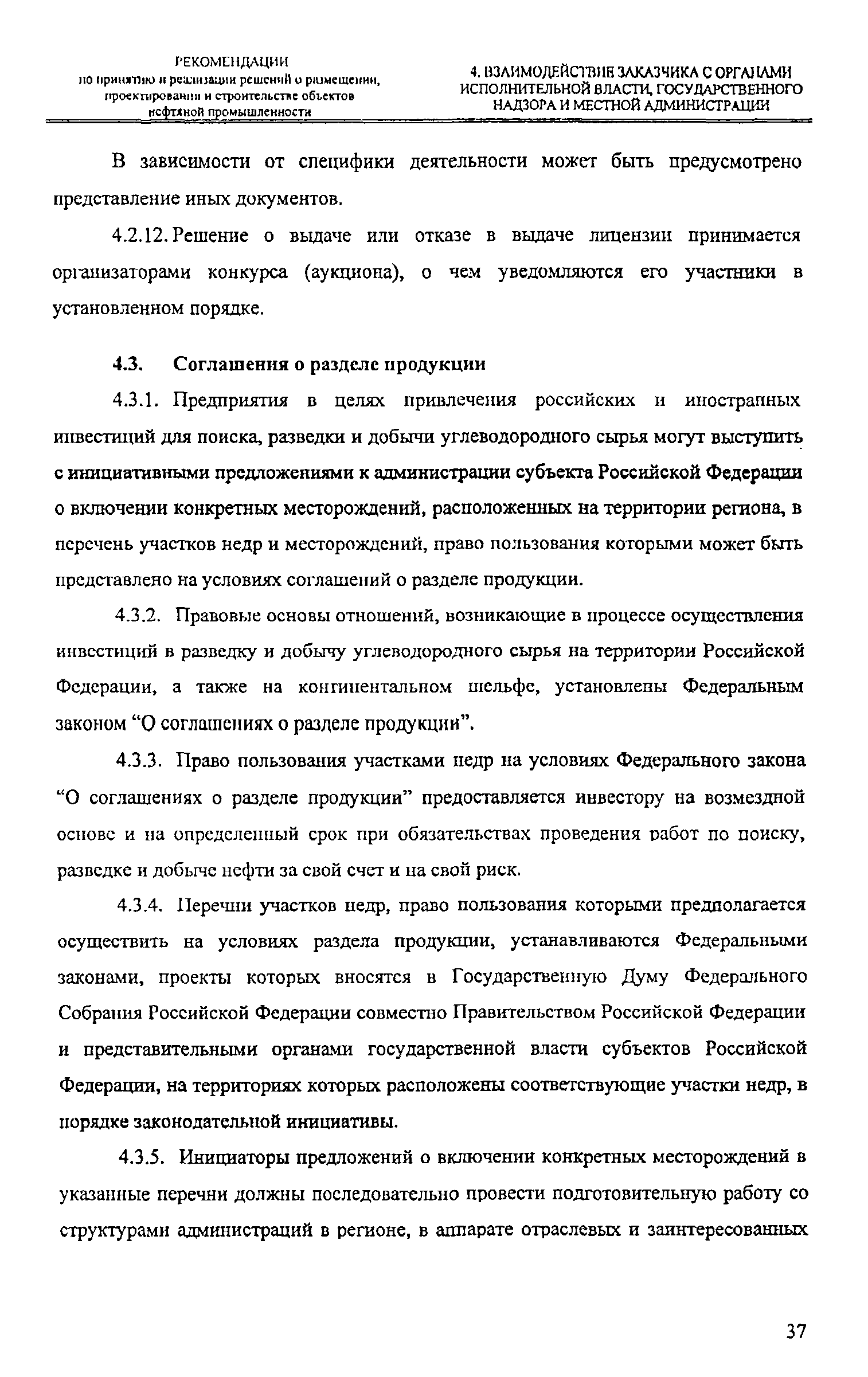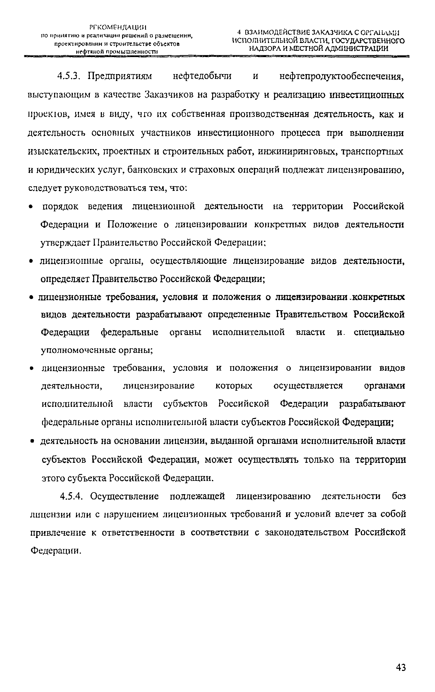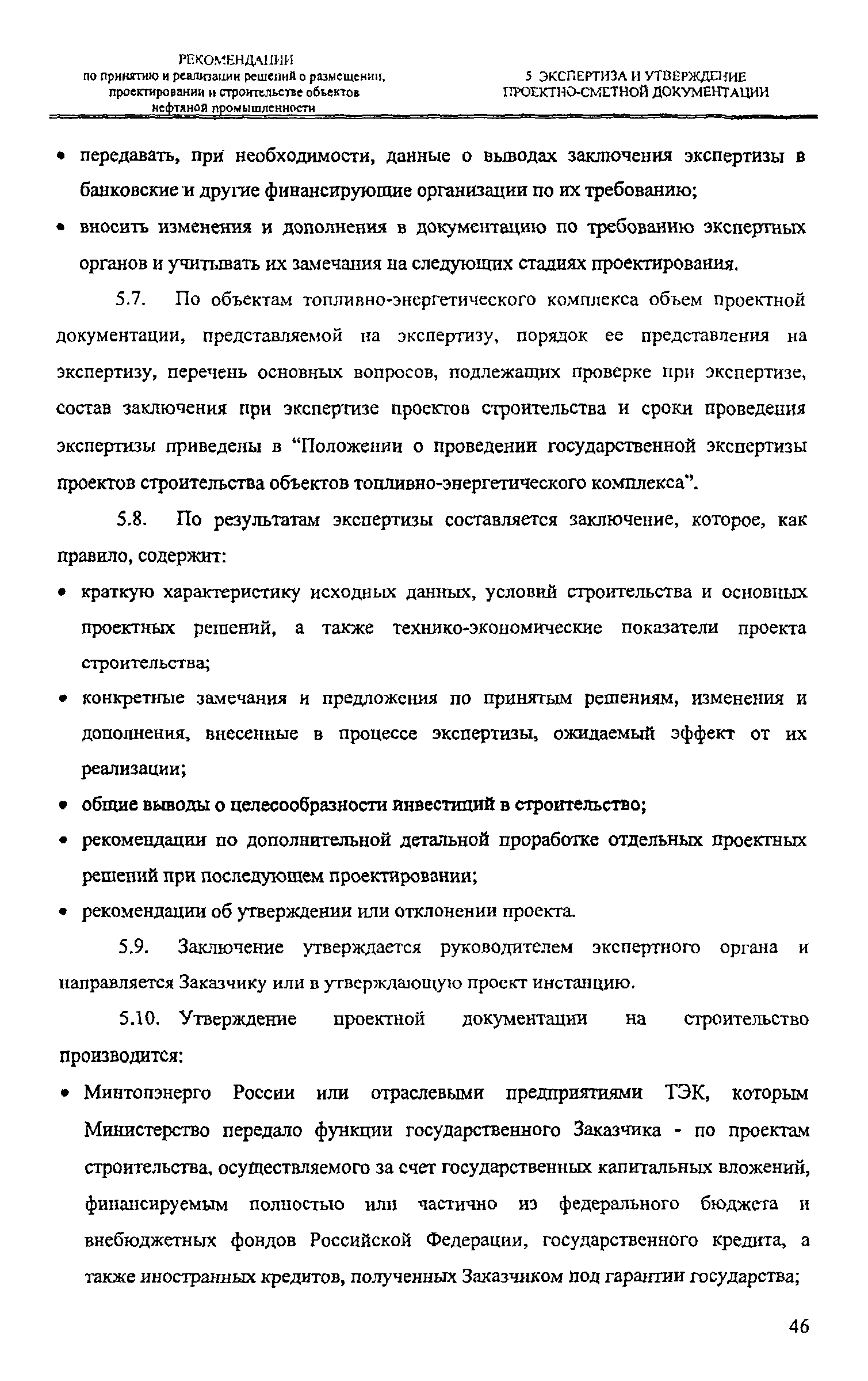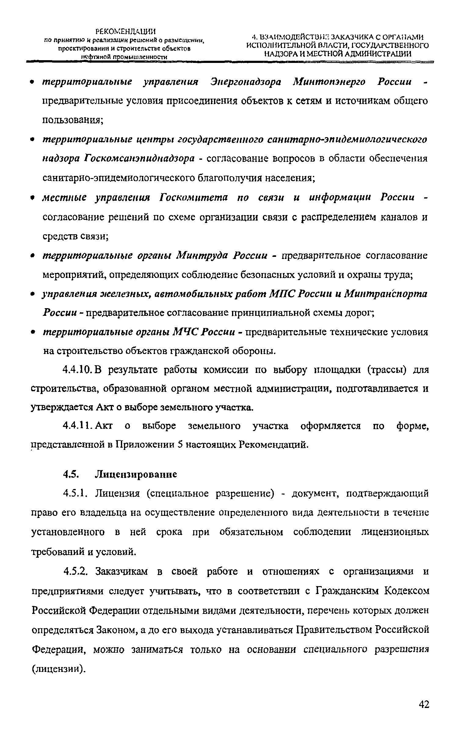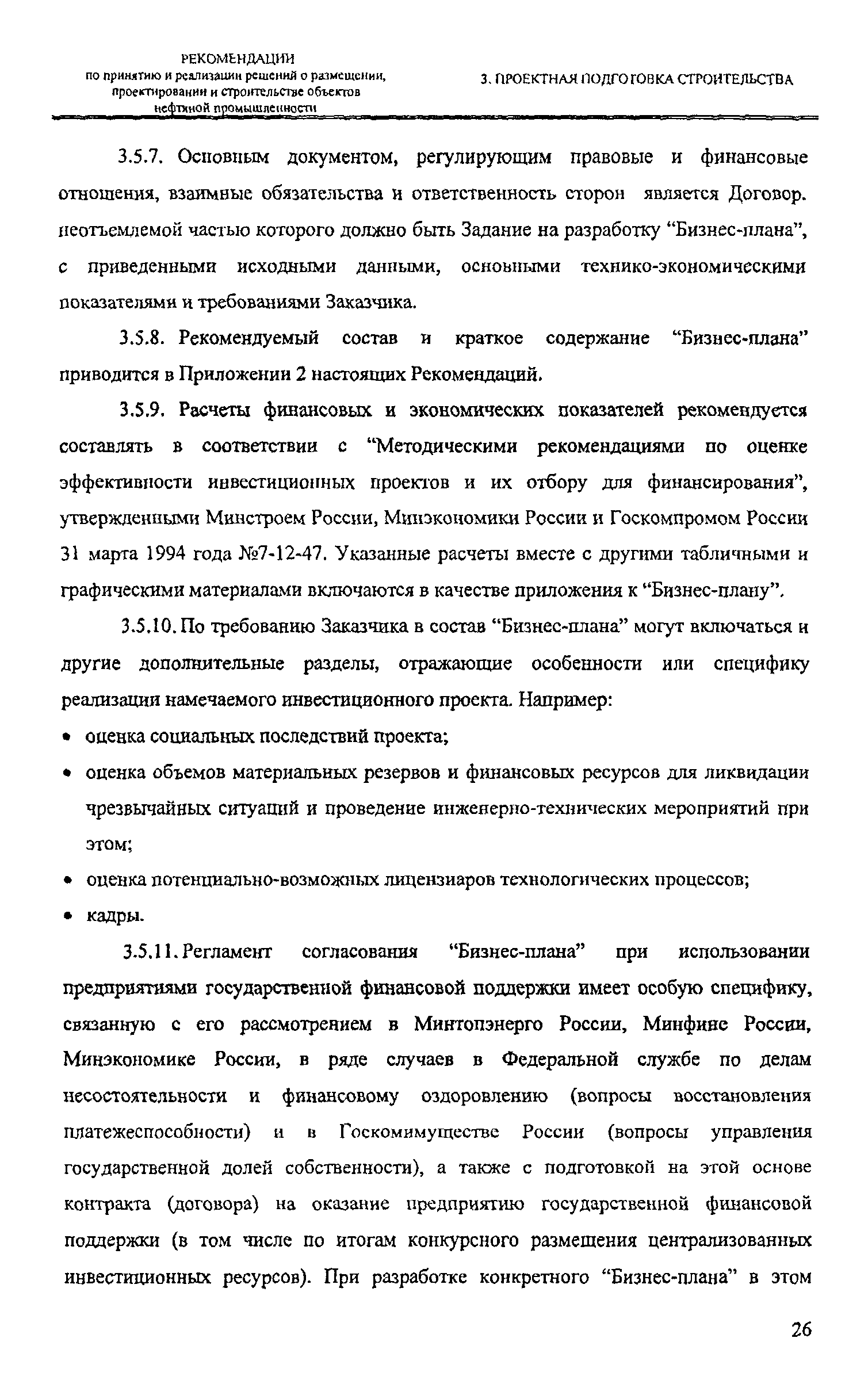 Временные рекомендации по принятию и реализации решений о размещении, проектировании и строительстве объектов нефтяной промышленности| Статус: | действует | | Название рус.: | Временные рекомендации по принятию и реализации решений о размещении, проектировании и строительстве объектов нефтяной промышленности | | Дата добавления в базу: | 01.09.2013 | | Дата актуализации: | 01.01.2021 | | Дата введения: | 01.01.1998 | | Область применения: | "Рекомендации" определяют порядок действий и состав работ, подлежащих выполнению на разных стадиях Заказчиком, Проектировщиком, Подрядчиком, иными юридическими и физическими лицами - участниками инвестиционного процесса в ходе реализации инвестиционных проектов по строительству объектов нефтедобычи и нефтепродуктообеспечения, независимо от их форм собственности и принадлежности. | | Оглавление: | Введение 1 Область применения 2 Общие положения 3 Проектная подготовка строительства 4 Взаимодействие Заказчика с органами исполнительной власти, государственного надзора и местной администрации 5 Экспертиза и утверждение проектно-сметной документации 6 Подрядны еторги (тендеры) 7 Строительство Приложение | | Разработан: | АО НГС-Оргпроектэкономика (NGS-Orgprojecteconomika AO )