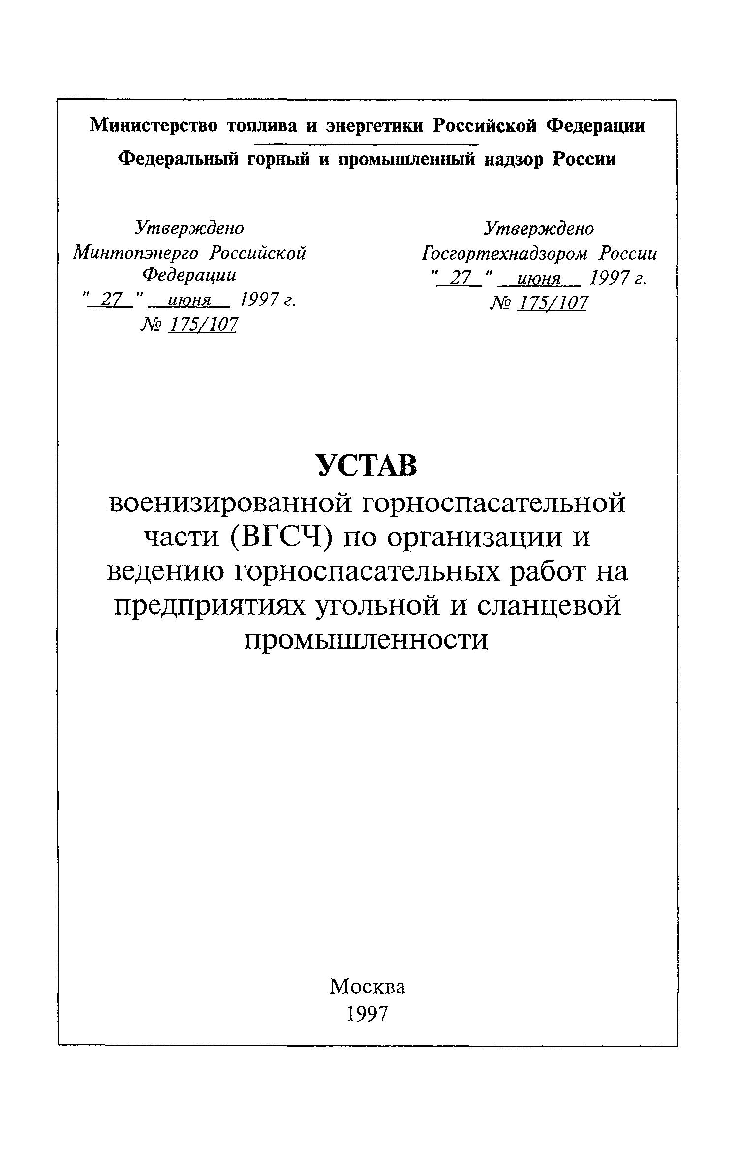 | Утверждён: | 27.06.1997 Госгортехнадзор России (Russian Federation Gosgortekhnadzor 107) 27.06.1997 Минтопэнерго России (Russian Federation Mintopenergo 175)