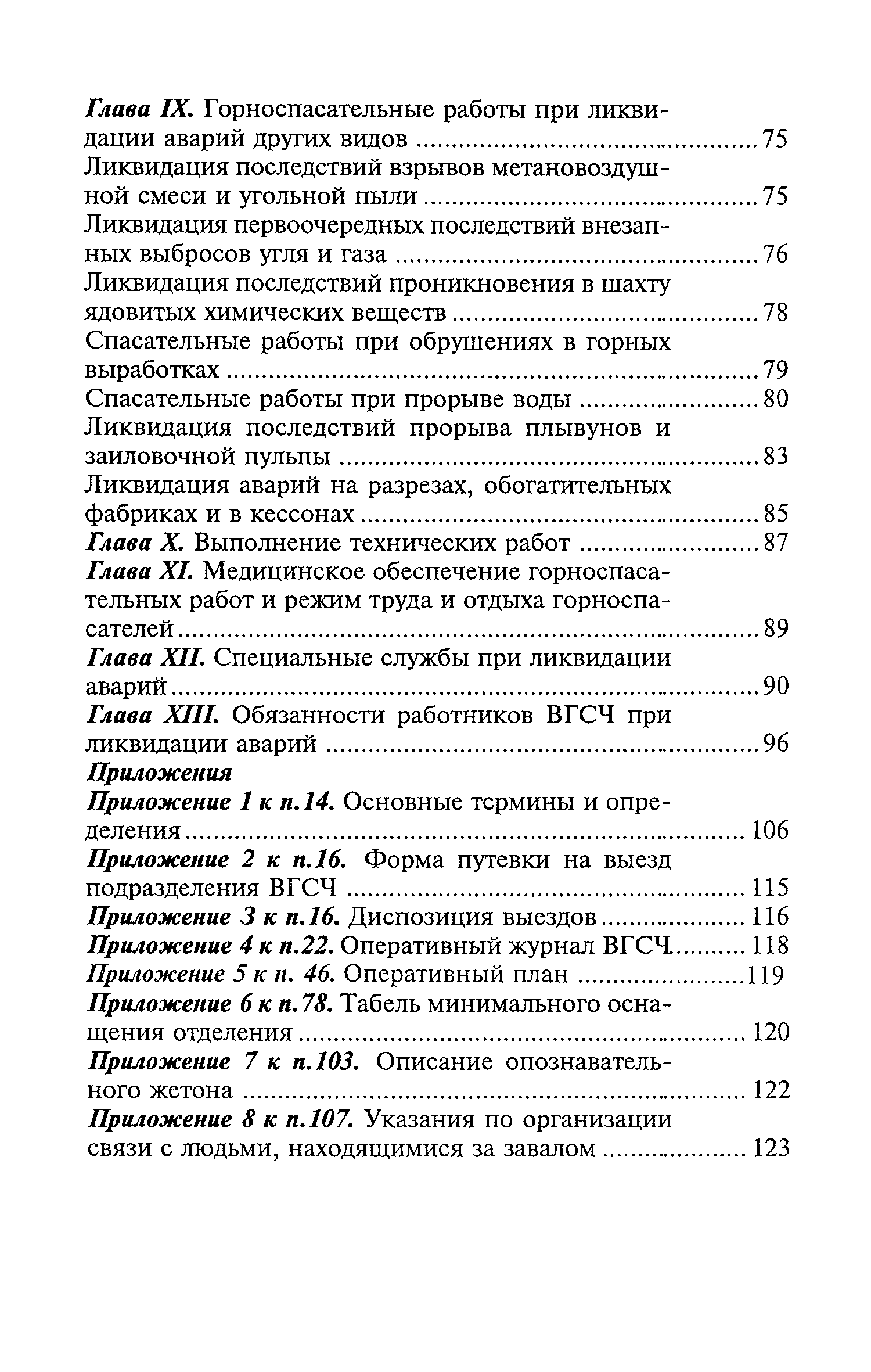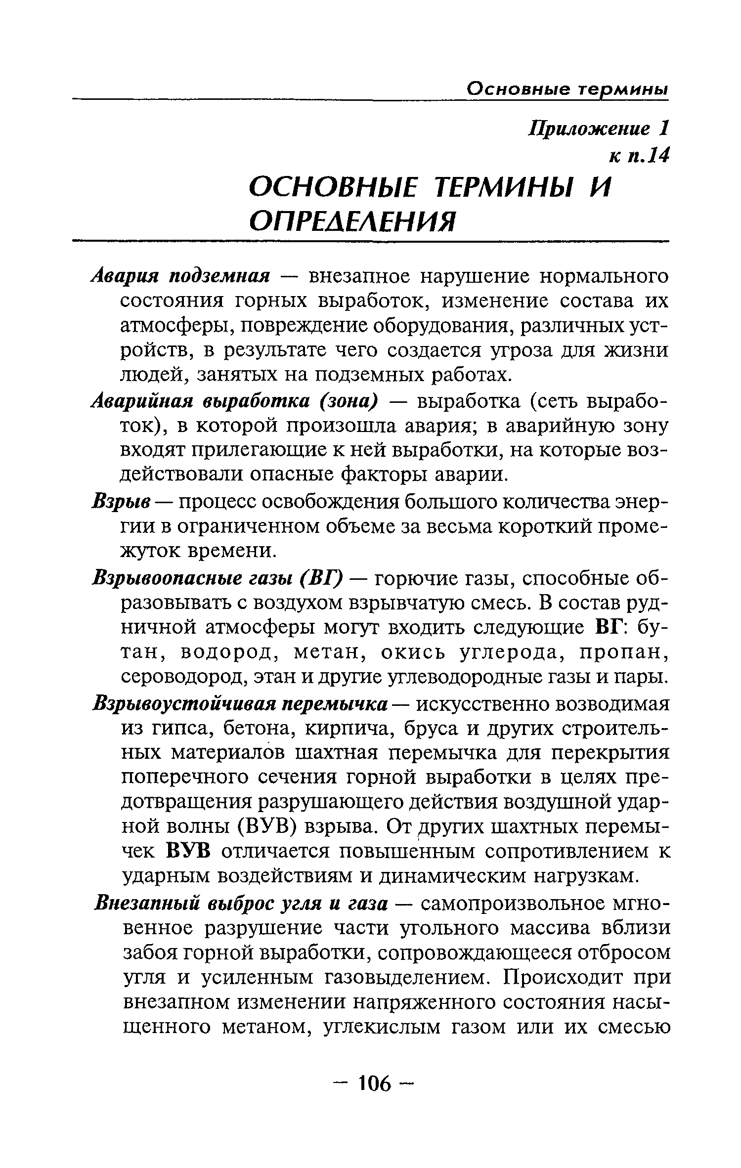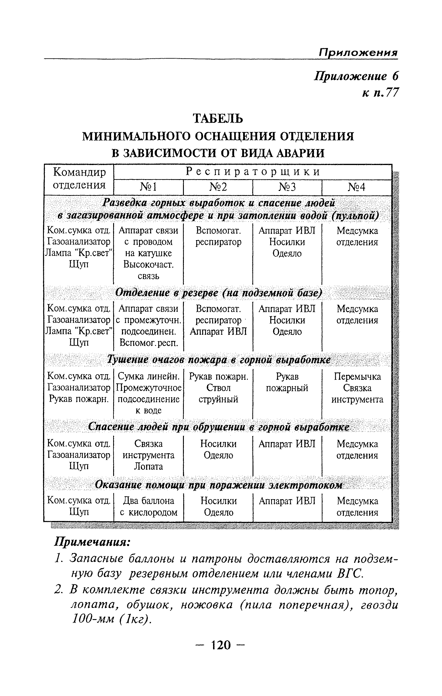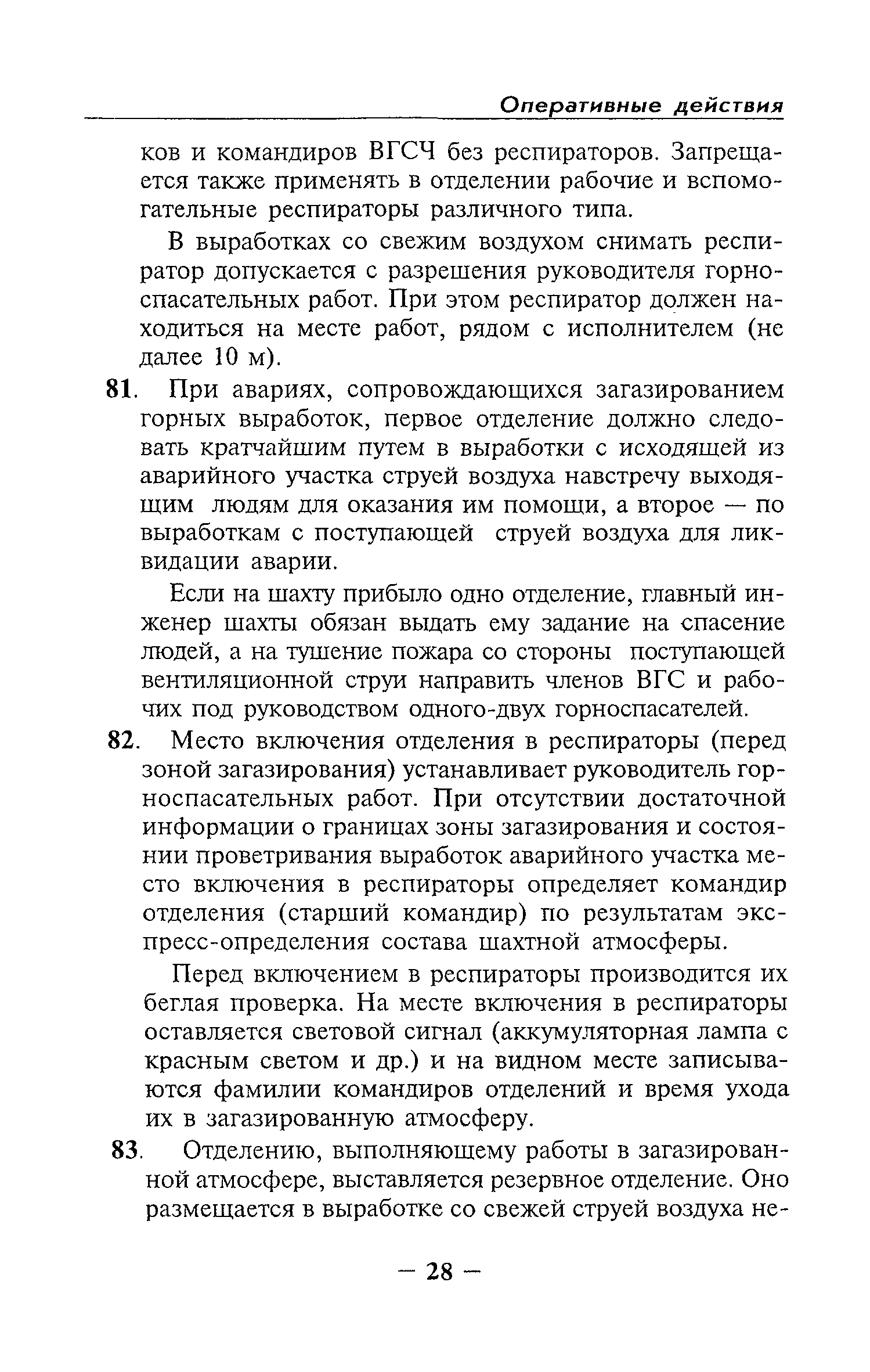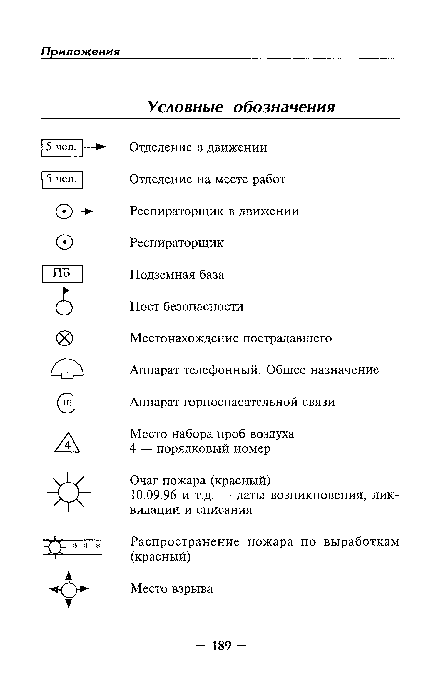 | Оглавление: | Глава I Общие положения Глава II Организационные действия в первоначальный период аварии Организация связи при горноспасательных работах Глава III Организация аварийно-спасательных работ Глава IV Действия вспомогательной горноспасательной службы Глава V Оперативные действия отделений ВГСЧ Глава VI Организация разведки и спасения людей Разведка с целью поиска людей и их спасения Разведка для выяснения обстановки Глава VII Горноспасательные работы в условиях высоких и низких температур Глава VIII Тушение подземных пожаров Вентиляционные режимы при тушении пожаров Тушение пожаров активным способом Изоляция пожарных участков Тушение пожаров в шахтах, опасных по газу и пыли Тушение пожаров в тупиковых горных выработках Тушение пожаров в наклонных горных выработках Тушение пожаров на ленточных конвейерах Тушение пожаров в горизонтальных выработках и камерах Тушение пожаров в надшахтных зданиях и вертикальных выработках Глава IХ Горноспасательные работы при ликвидации аварий других видов Ликвидация последствий взрывов метановоздушной смеси и угольной пыли Ликвидация первоочередных последствий внезапных выбросов угля и газа Ликвидация последствий проникновения в шахту ядовитых химических веществ Спасательные работы при обрушениях в горных выработках Спасательные работы при прорыве воды Ликвидация последствий прорыва плывунов и заиловочной пульпы Ликвидация аварий на разрезах, обогатительных фабриках и в кессонах Глава Х Выполнение технических работ Глава ХI Медицинское обеспечение горноспасательных работ и режим труда и отдыха горноспасателей Глава ХII Специальные службы при ликвидации аварий Глава ХIII Обязанности работников ВГСЧ при ликвидации аварий Приложение 1 к п. 14. Основные термины и определения Приложение 2 к п. 16. Форма путевки на выезд подразделения ВГСЧ Приложение 3 к п. 16. Диспозиция выездов Приложение 4 к п. 22. Оперативный журнал ВГСЧ Приложение 5 к п. 46. Оперативный план Приложение 6 к п. 78. Табель минимального оснащения отделения Приложение 7 к п. 103. Описание опознавательного жетона Приложение 8 к п. 107. Указания по организации связи с людьми, находящимися за завалом Приложение 9 к п. 114. Таблица скорости движения отделения в шахте Приложение 10 к п. 178. Методика расчета проемов в изолирующих перемычках Приложение 11 к п. 193. Методика определения взрываемости смеси горючих газов Приложение 12 к п. 195. Методика определения параметров воздушных ударных волн при взрывах газов и пыли в горных выработках Приложение 13 к п. 204. Параметры взрывоустойчивых гипсовых перемычек Приложение 14. Методические указания по расчету времени выхода включенных в самоспасатели людей по загазированным выработкам шахты Условные обозначения |