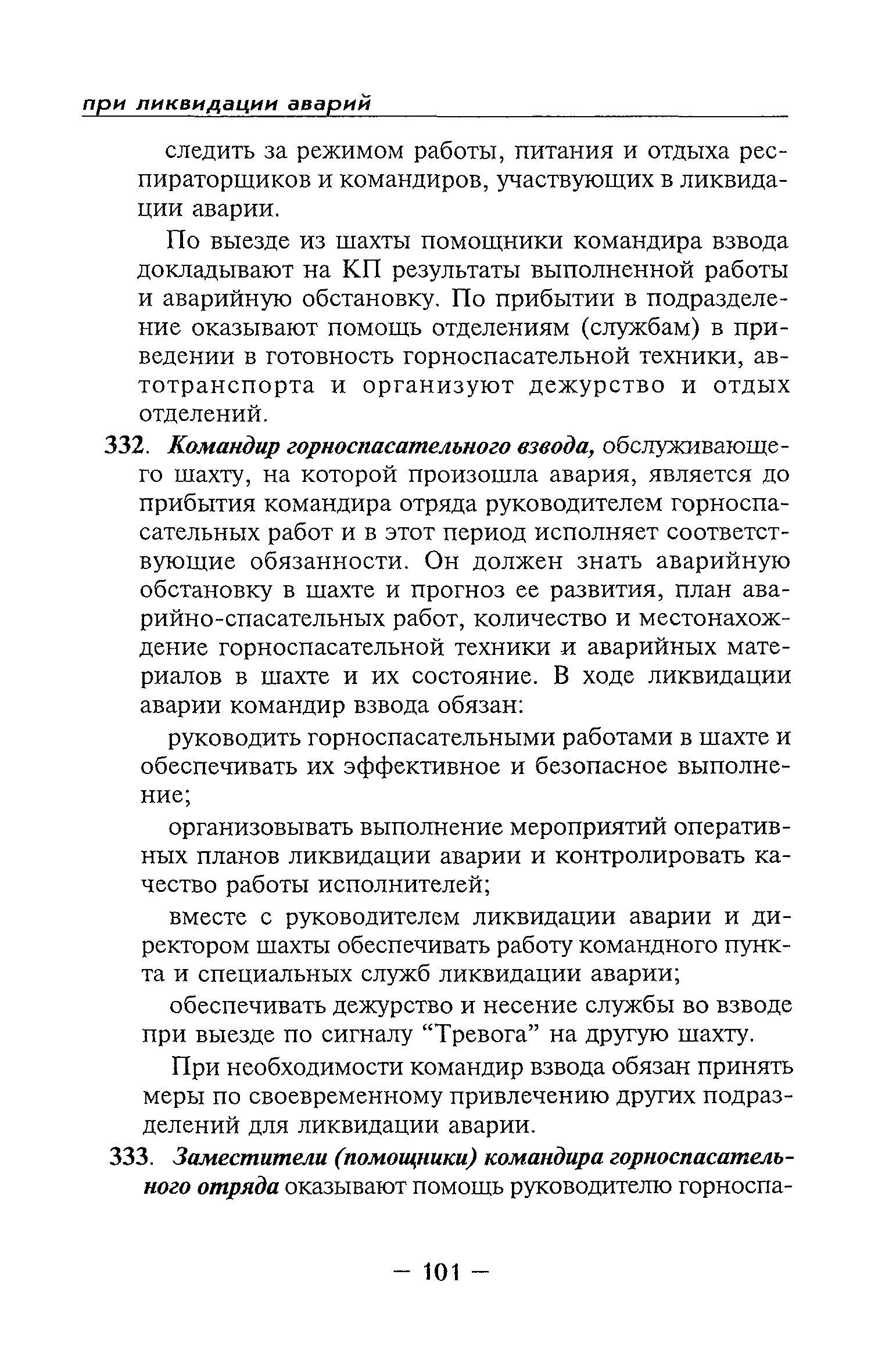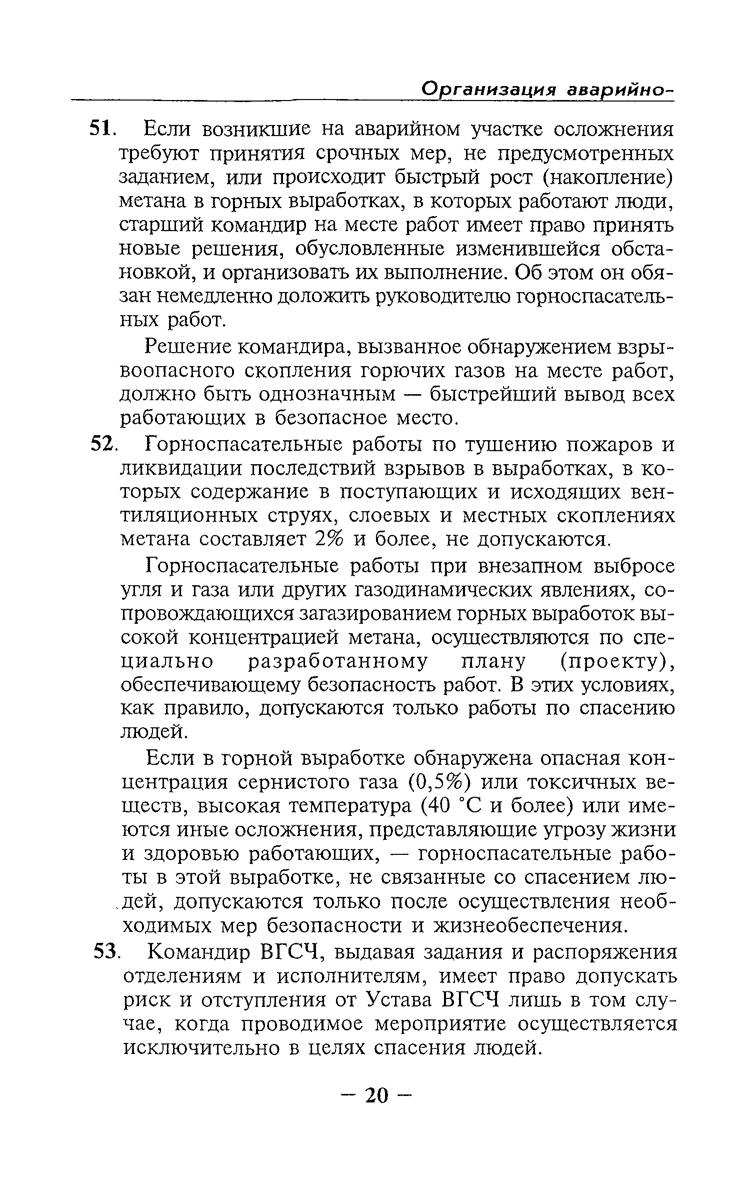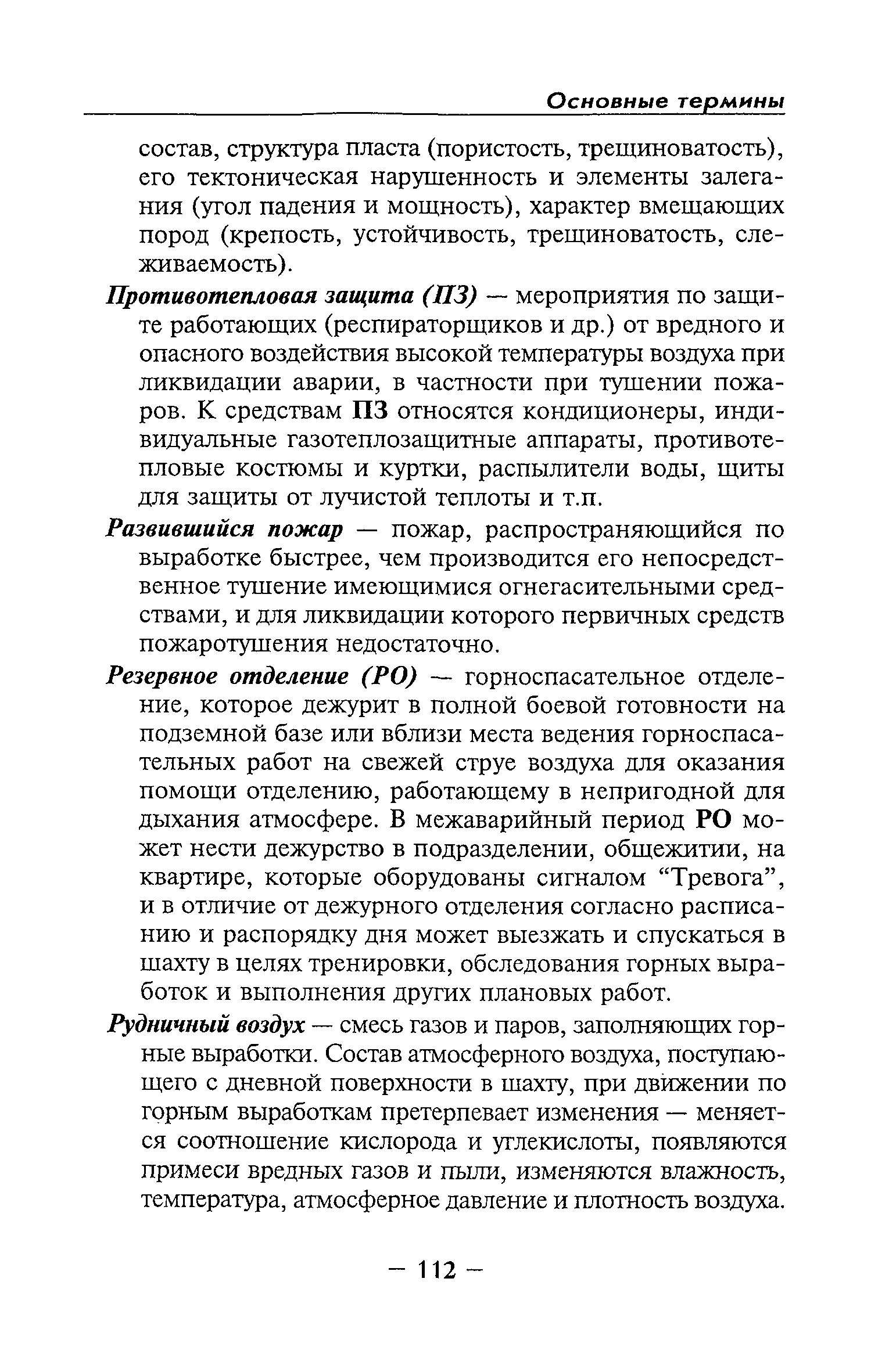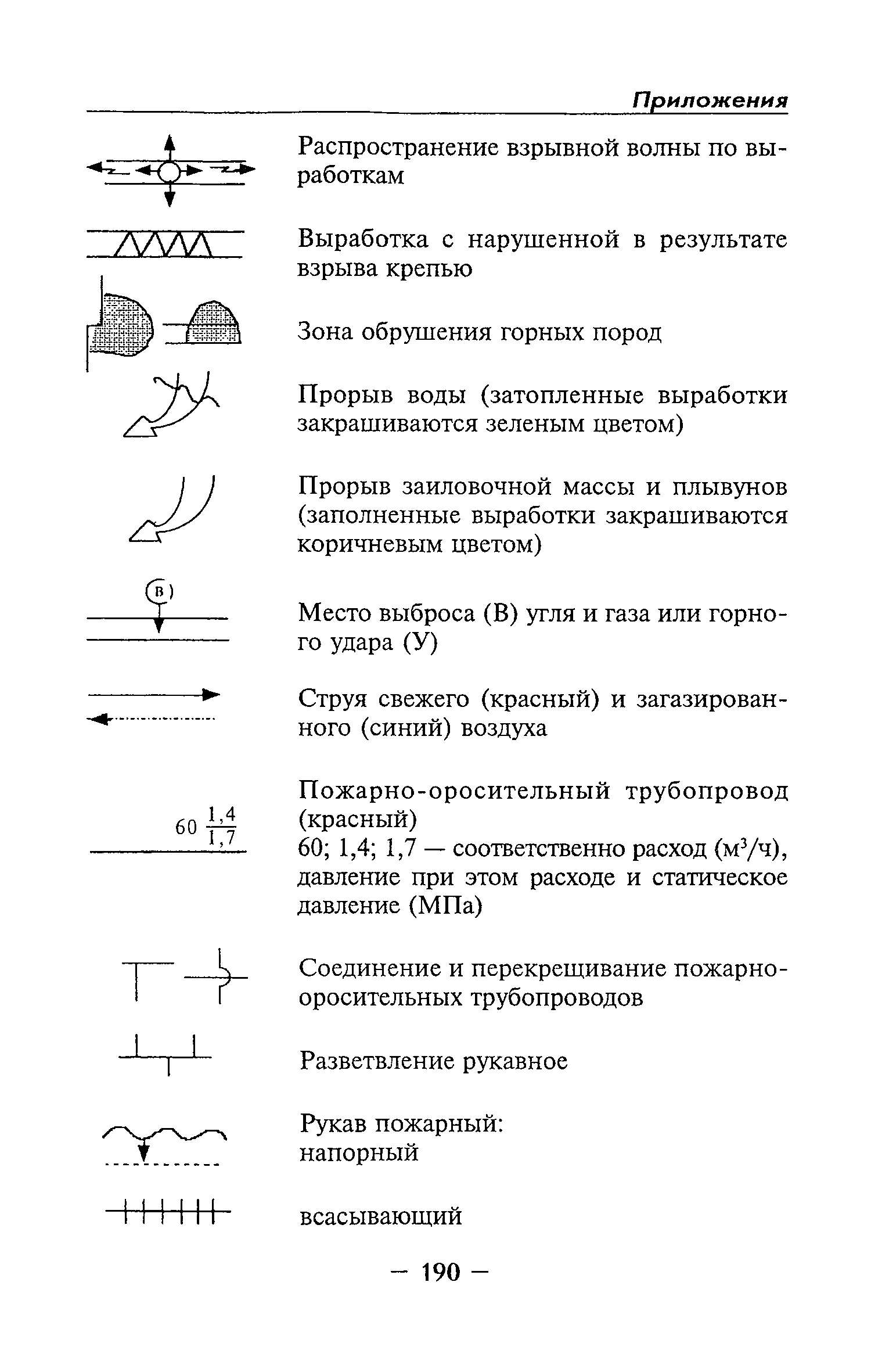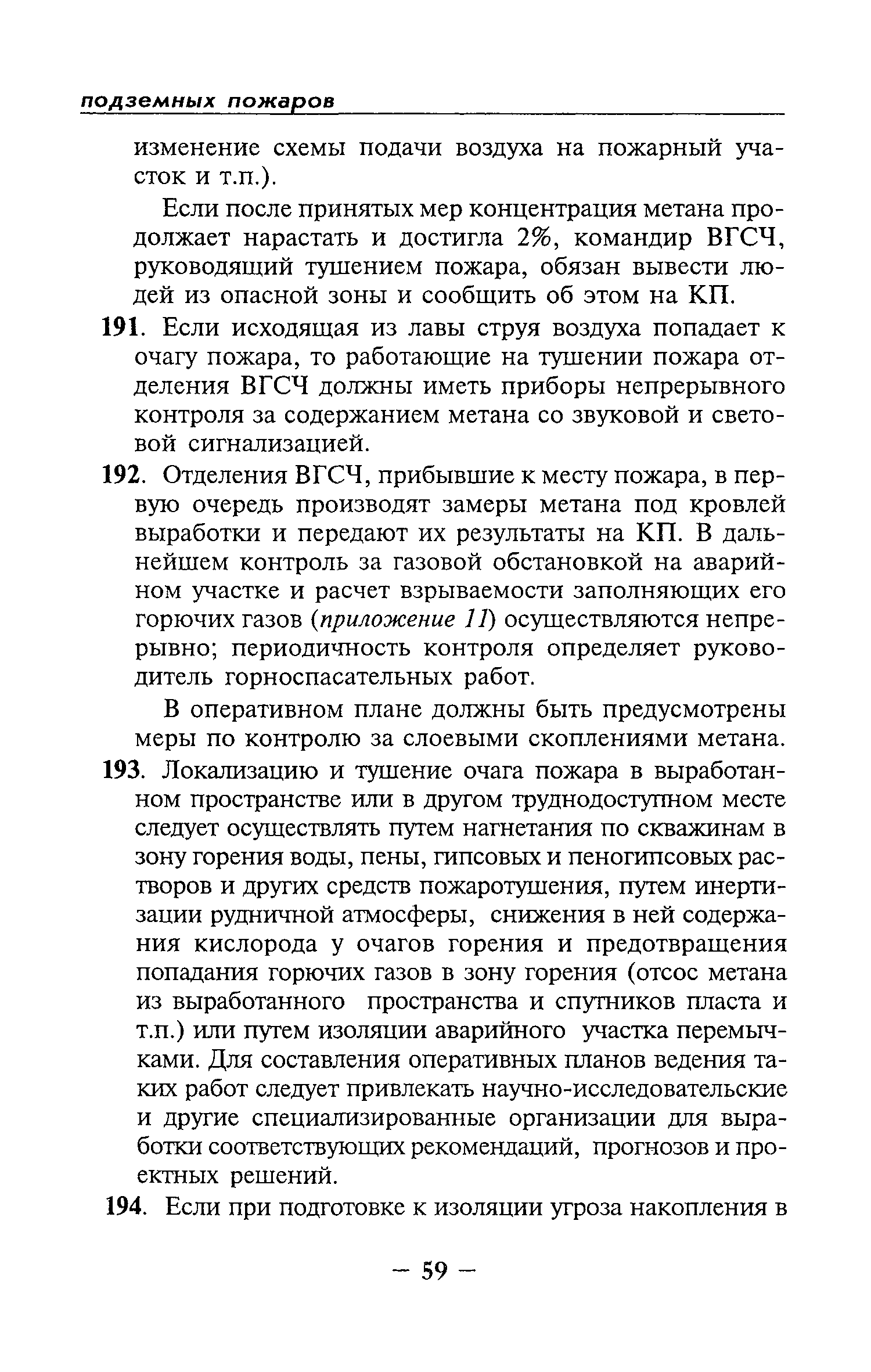 | Оглавление: | Глава I Общие положения Глава II Организационные действия в первоначальный период аварии Организация связи при горноспасательных работах Глава III Организация аварийно-спасательных работ Глава IV Действия вспомогательной горноспасательной службы Глава V Оперативные действия отделений ВГСЧ Глава VI Организация разведки и спасения людей Разведка с целью поиска людей и их спасения Разведка для выяснения обстановки Глава VII Горноспасательные работы в условиях высоких и низких температур Глава VIII Тушение подземных пожаров Вентиляционные режимы при тушении пожаров Тушение пожаров активным способом Изоляция пожарных участков Тушение пожаров в шахтах, опасных по газу и пыли Тушение пожаров в тупиковых горных выработках Тушение пожаров в наклонных горных выработках Тушение пожаров на ленточных конвейерах Тушение пожаров в горизонтальных выработках и камерах Тушение пожаров в надшахтных зданиях и вертикальных выработках Глава IХ Горноспасательные работы при ликвидации аварий других видов Ликвидация последствий взрывов метановоздушной смеси и угольной пыли Ликвидация первоочередных последствий внезапных выбросов угля и газа Ликвидация последствий проникновения в шахту ядовитых химических веществ Спасательные работы при обрушениях в горных выработках Спасательные работы при прорыве воды Ликвидация последствий прорыва плывунов и заиловочной пульпы Ликвидация аварий на разрезах, обогатительных фабриках и в кессонах Глава Х Выполнение технических работ Глава ХI Медицинское обеспечение горноспасательных работ и режим труда и отдыха горноспасателей Глава ХII Специальные службы при ликвидации аварий Глава ХIII Обязанности работников ВГСЧ при ликвидации аварий Приложение 1 к п. 14. Основные термины и определения Приложение 2 к п. 16. Форма путевки на выезд подразделения ВГСЧ Приложение 3 к п. 16. Диспозиция выездов Приложение 4 к п. 22. Оперативный журнал ВГСЧ Приложение 5 к п. 46. Оперативный план Приложение 6 к п. 78. Табель минимального оснащения отделения Приложение 7 к п. 103. Описание опознавательного жетона Приложение 8 к п. 107. Указания по организации связи с людьми, находящимися за завалом Приложение 9 к п. 114. Таблица скорости движения отделения в шахте Приложение 10 к п. 178. Методика расчета проемов в изолирующих перемычках Приложение 11 к п. 193. Методика определения взрываемости смеси горючих газов Приложение 12 к п. 195. Методика определения параметров воздушных ударных волн при взрывах газов и пыли в горных выработках Приложение 13 к п. 204. Параметры взрывоустойчивых гипсовых перемычек Приложение 14. Методические указания по расчету времени выхода включенных в самоспасатели людей по загазированным выработкам шахты Условные обозначения |