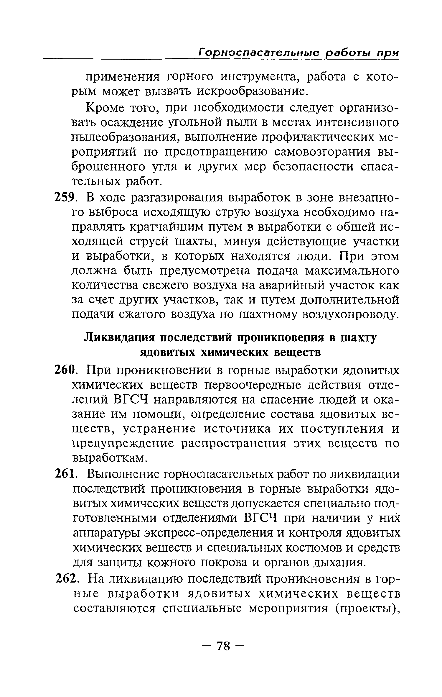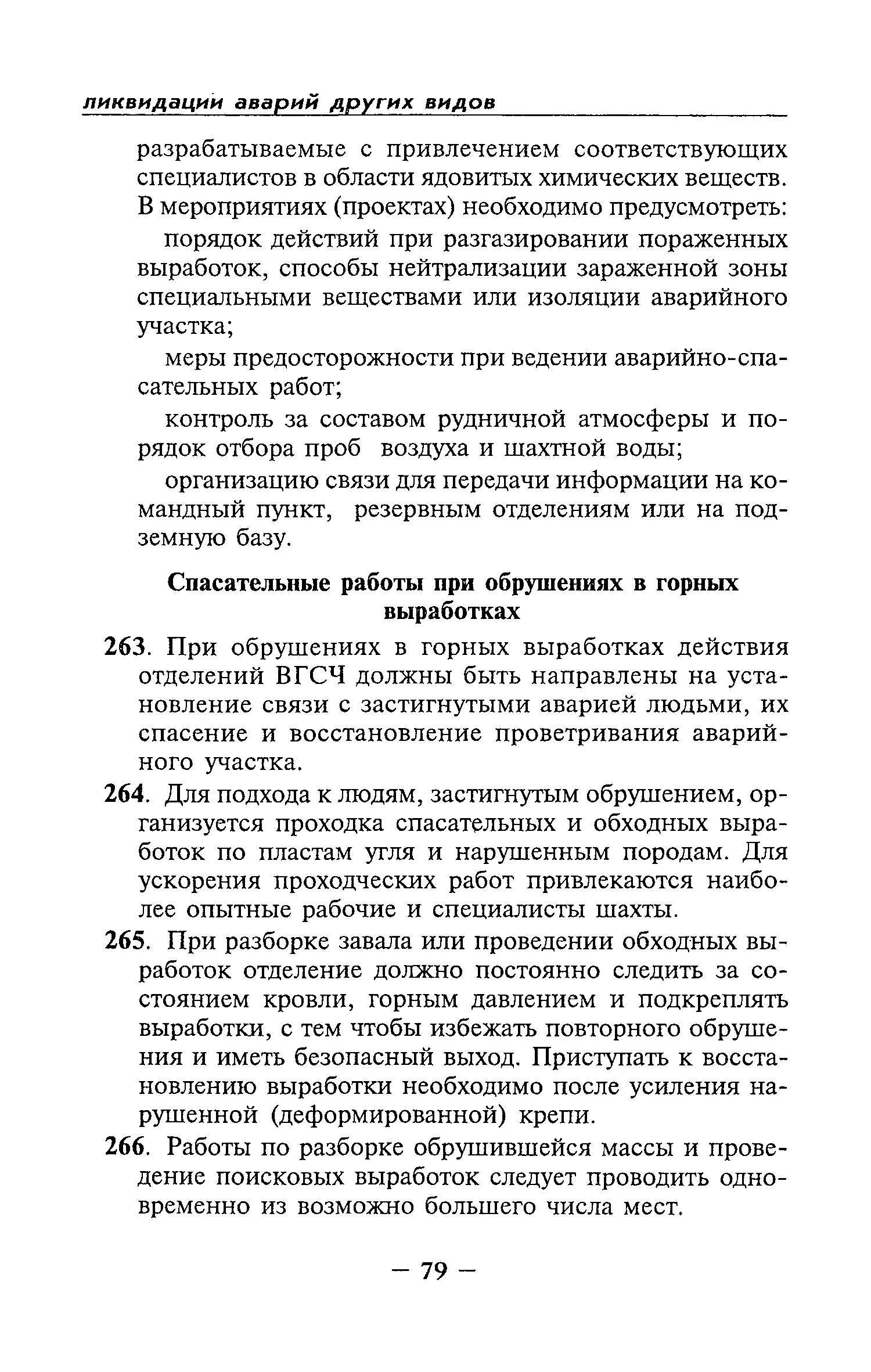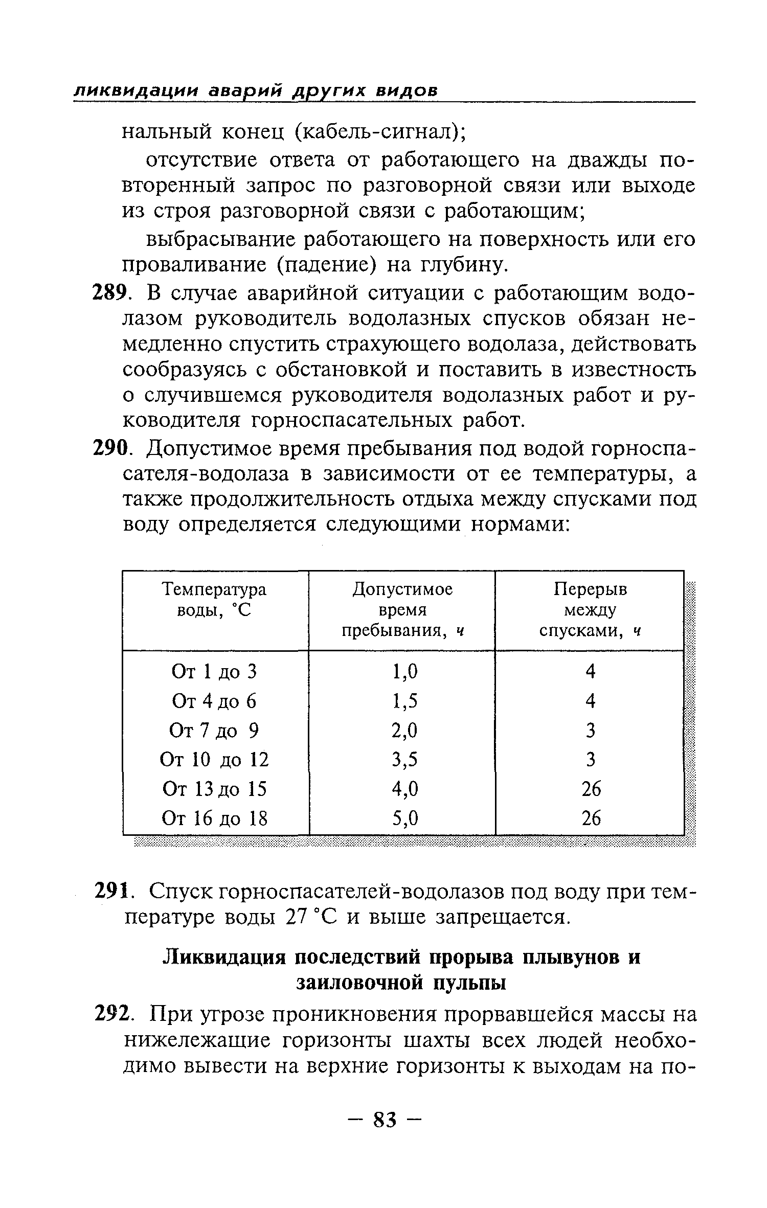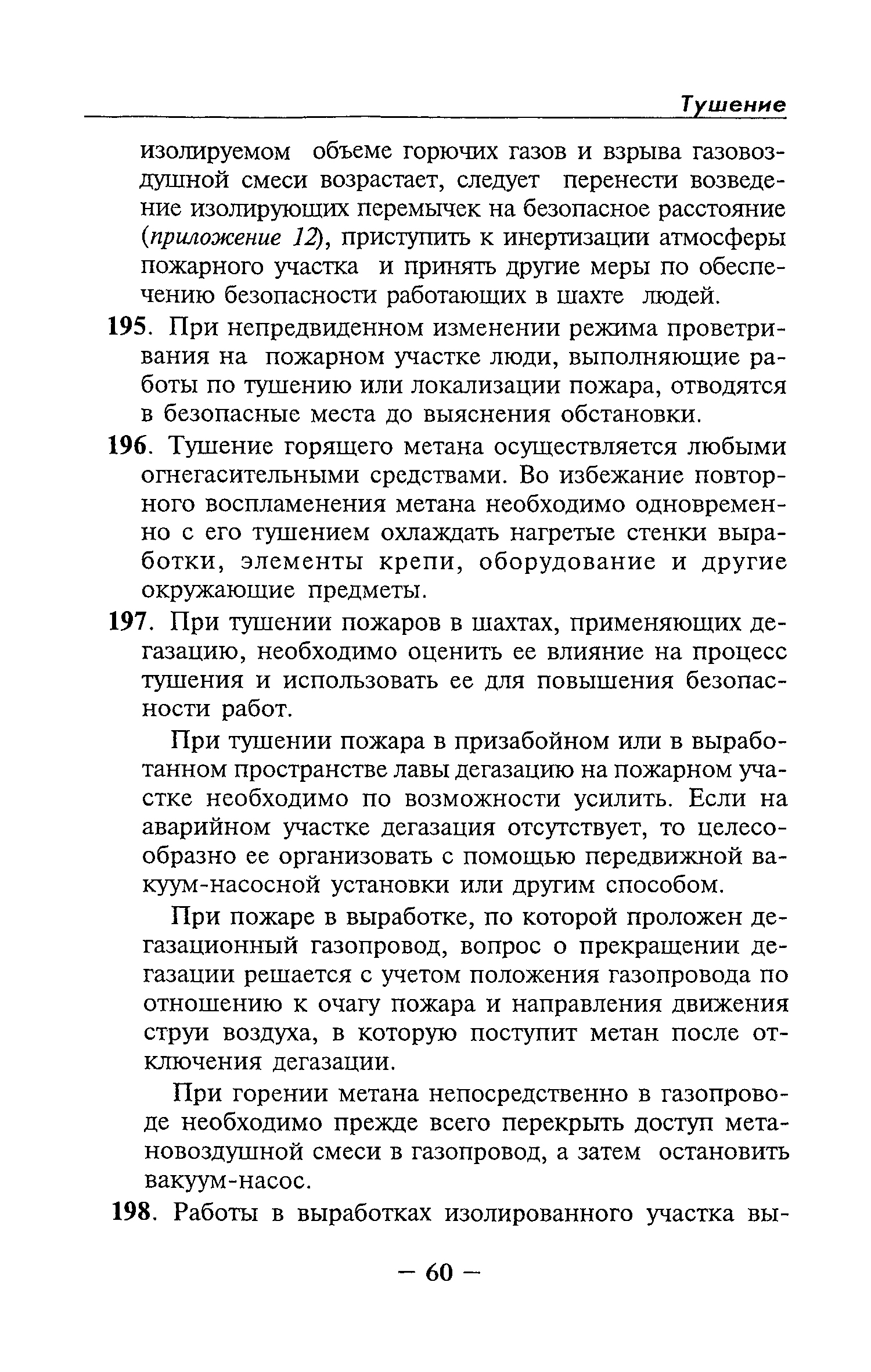 | Оглавление: | Глава I Общие положения Глава II Организационные действия в первоначальный период аварии Организация связи при горноспасательных работах Глава III Организация аварийно-спасательных работ Глава IV Действия вспомогательной горноспасательной службы Глава V Оперативные действия отделений ВГСЧ Глава VI Организация разведки и спасения людей Разведка с целью поиска людей и их спасения Разведка для выяснения обстановки Глава VII Горноспасательные работы в условиях высоких и низких температур Глава VIII Тушение подземных пожаров Вентиляционные режимы при тушении пожаров Тушение пожаров активным способом Изоляция пожарных участков Тушение пожаров в шахтах, опасных по газу и пыли Тушение пожаров в тупиковых горных выработках Тушение пожаров в наклонных горных выработках Тушение пожаров на ленточных конвейерах Тушение пожаров в горизонтальных выработках и камерах Тушение пожаров в надшахтных зданиях и вертикальных выработках Глава IХ Горноспасательные работы при ликвидации аварий других видов Ликвидация последствий взрывов метановоздушной смеси и угольной пыли Ликвидация первоочередных последствий внезапных выбросов угля и газа Ликвидация последствий проникновения в шахту ядовитых химических веществ Спасательные работы при обрушениях в горных выработках Спасательные работы при прорыве воды Ликвидация последствий прорыва плывунов и заиловочной пульпы Ликвидация аварий на разрезах, обогатительных фабриках и в кессонах Глава Х Выполнение технических работ Глава ХI Медицинское обеспечение горноспасательных работ и режим труда и отдыха горноспасателей Глава ХII Специальные службы при ликвидации аварий Глава ХIII Обязанности работников ВГСЧ при ликвидации аварий Приложение 1 к п. 14. Основные термины и определения Приложение 2 к п. 16. Форма путевки на выезд подразделения ВГСЧ Приложение 3 к п. 16. Диспозиция выездов Приложение 4 к п. 22. Оперативный журнал ВГСЧ Приложение 5 к п. 46. Оперативный план Приложение 6 к п. 78. Табель минимального оснащения отделения Приложение 7 к п. 103. Описание опознавательного жетона Приложение 8 к п. 107. Указания по организации связи с людьми, находящимися за завалом Приложение 9 к п. 114. Таблица скорости движения отделения в шахте Приложение 10 к п. 178. Методика расчета проемов в изолирующих перемычках Приложение 11 к п. 193. Методика определения взрываемости смеси горючих газов Приложение 12 к п. 195. Методика определения параметров воздушных ударных волн при взрывах газов и пыли в горных выработках Приложение 13 к п. 204. Параметры взрывоустойчивых гипсовых перемычек Приложение 14. Методические указания по расчету времени выхода включенных в самоспасатели людей по загазированным выработкам шахты Условные обозначения |