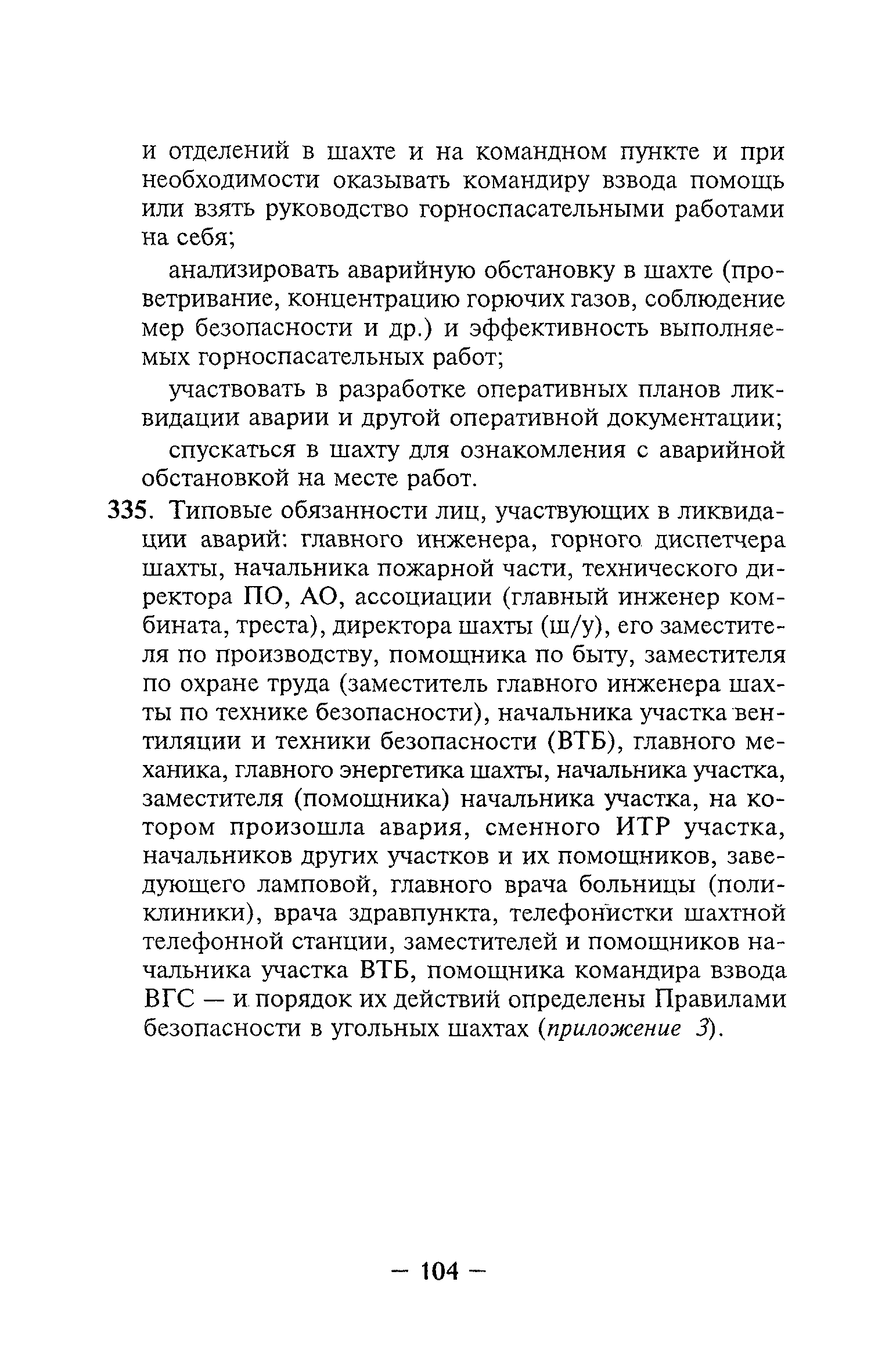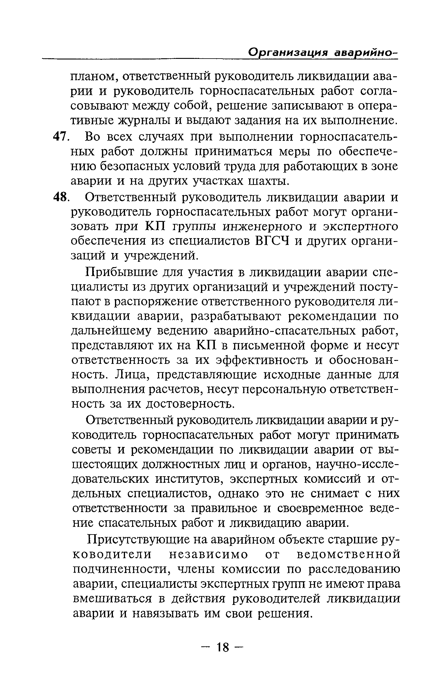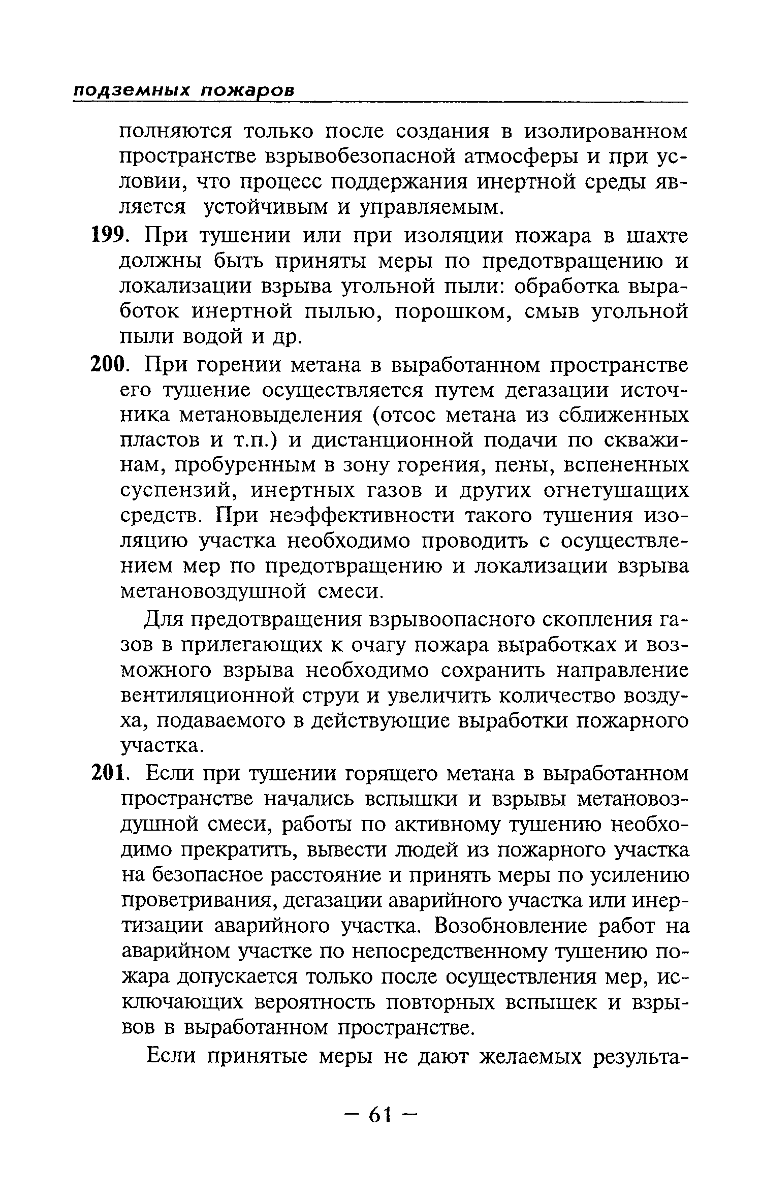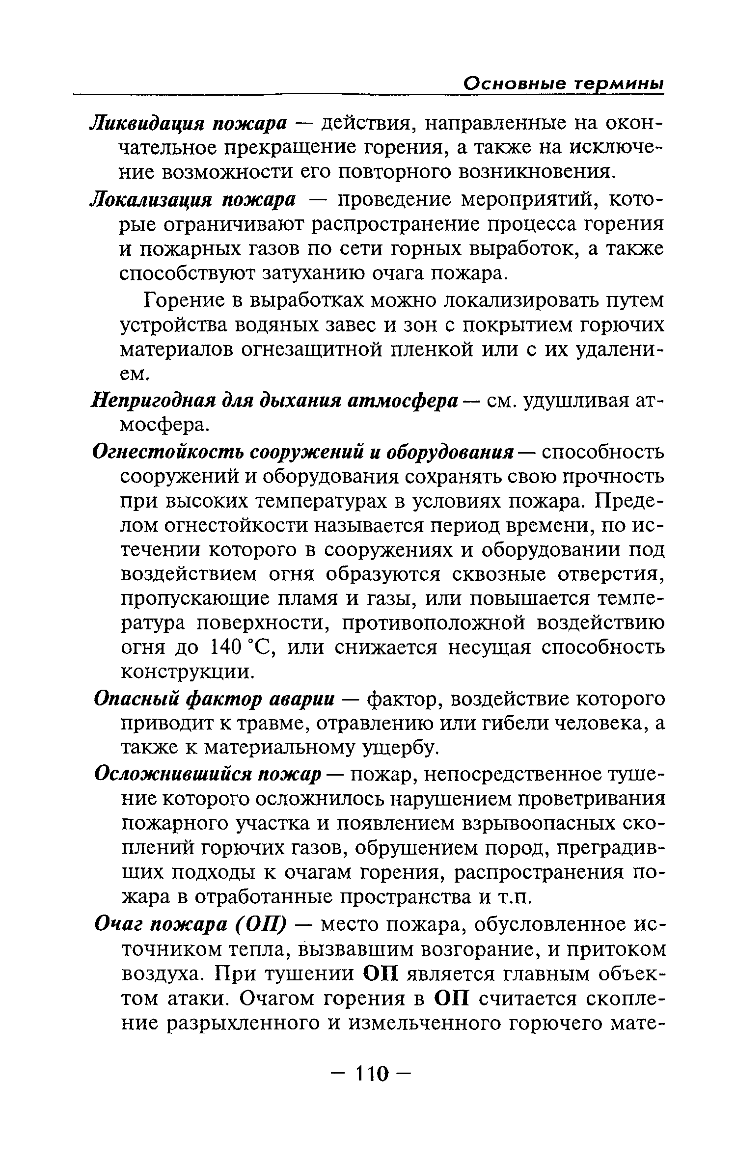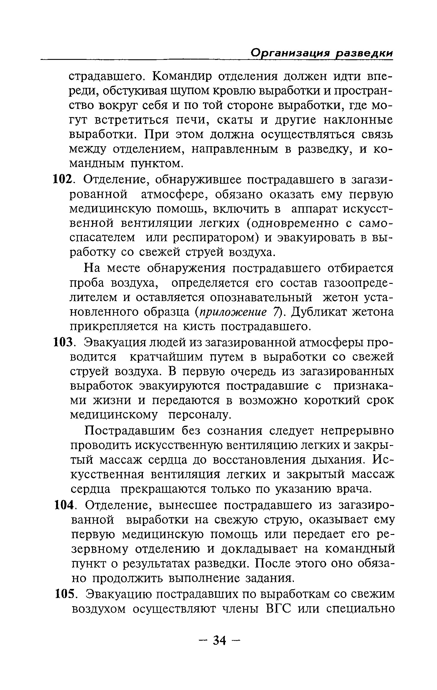 | Оглавление: | Глава I Общие положения Глава II Организационные действия в первоначальный период аварии Организация связи при горноспасательных работах Глава III Организация аварийно-спасательных работ Глава IV Действия вспомогательной горноспасательной службы Глава V Оперативные действия отделений ВГСЧ Глава VI Организация разведки и спасения людей Разведка с целью поиска людей и их спасения Разведка для выяснения обстановки Глава VII Горноспасательные работы в условиях высоких и низких температур Глава VIII Тушение подземных пожаров Вентиляционные режимы при тушении пожаров Тушение пожаров активным способом Изоляция пожарных участков Тушение пожаров в шахтах, опасных по газу и пыли Тушение пожаров в тупиковых горных выработках Тушение пожаров в наклонных горных выработках Тушение пожаров на ленточных конвейерах Тушение пожаров в горизонтальных выработках и камерах Тушение пожаров в надшахтных зданиях и вертикальных выработках Глава IХ Горноспасательные работы при ликвидации аварий других видов Ликвидация последствий взрывов метановоздушной смеси и угольной пыли Ликвидация первоочередных последствий внезапных выбросов угля и газа Ликвидация последствий проникновения в шахту ядовитых химических веществ Спасательные работы при обрушениях в горных выработках Спасательные работы при прорыве воды Ликвидация последствий прорыва плывунов и заиловочной пульпы Ликвидация аварий на разрезах, обогатительных фабриках и в кессонах Глава Х Выполнение технических работ Глава ХI Медицинское обеспечение горноспасательных работ и режим труда и отдыха горноспасателей Глава ХII Специальные службы при ликвидации аварий Глава ХIII Обязанности работников ВГСЧ при ликвидации аварий Приложение 1 к п. 14. Основные термины и определения Приложение 2 к п. 16. Форма путевки на выезд подразделения ВГСЧ Приложение 3 к п. 16. Диспозиция выездов Приложение 4 к п. 22. Оперативный журнал ВГСЧ Приложение 5 к п. 46. Оперативный план Приложение 6 к п. 78. Табель минимального оснащения отделения Приложение 7 к п. 103. Описание опознавательного жетона Приложение 8 к п. 107. Указания по организации связи с людьми, находящимися за завалом Приложение 9 к п. 114. Таблица скорости движения отделения в шахте Приложение 10 к п. 178. Методика расчета проемов в изолирующих перемычках Приложение 11 к п. 193. Методика определения взрываемости смеси горючих газов Приложение 12 к п. 195. Методика определения параметров воздушных ударных волн при взрывах газов и пыли в горных выработках Приложение 13 к п. 204. Параметры взрывоустойчивых гипсовых перемычек Приложение 14. Методические указания по расчету времени выхода включенных в самоспасатели людей по загазированным выработкам шахты Условные обозначения |