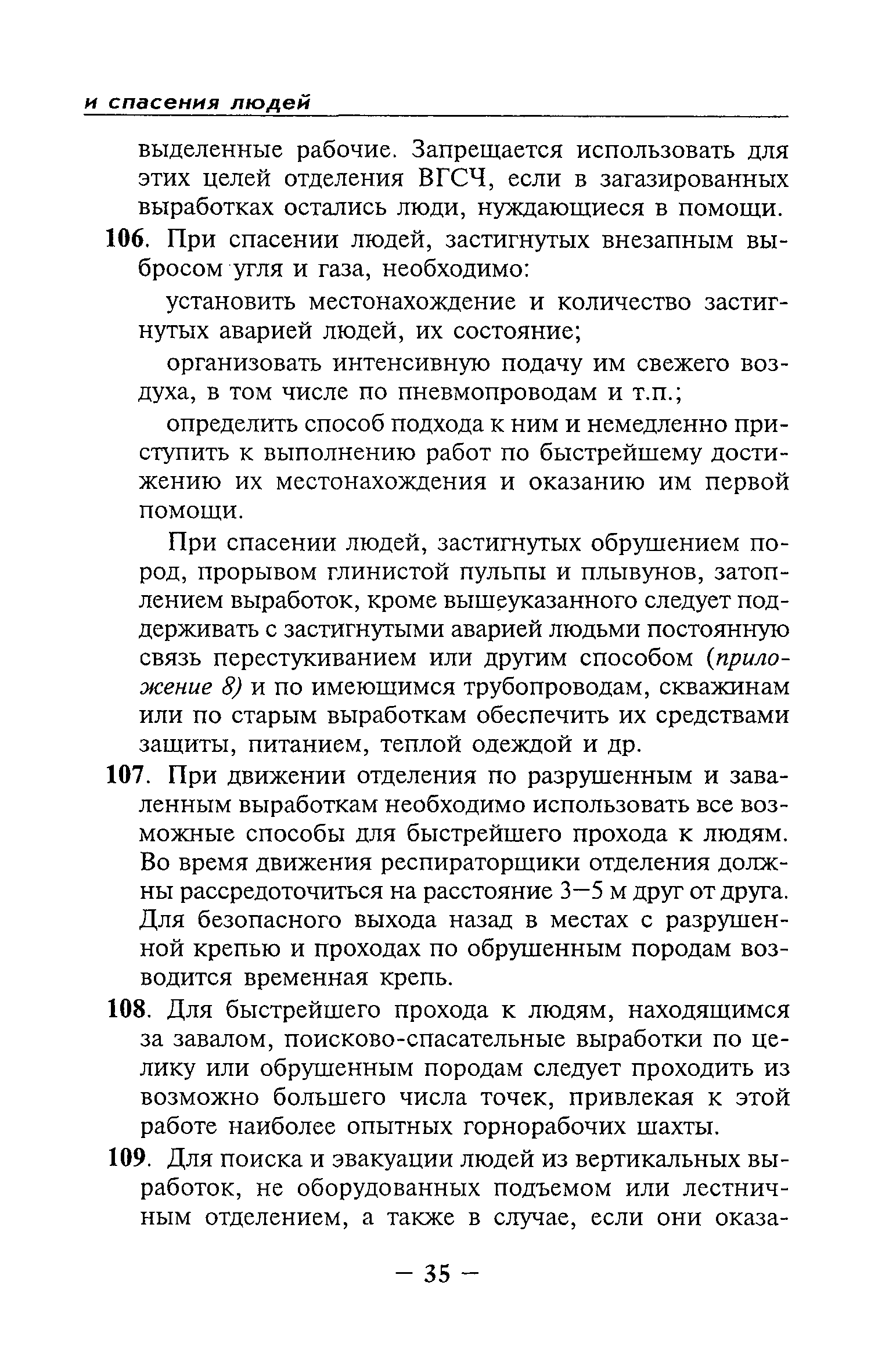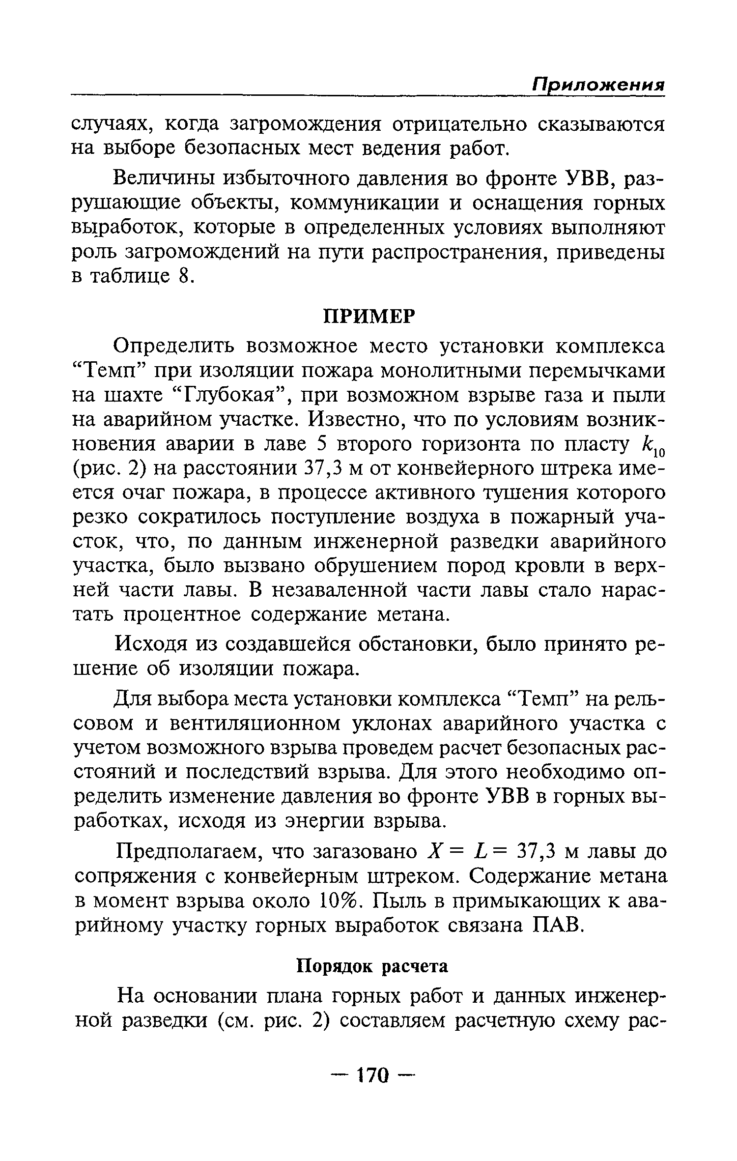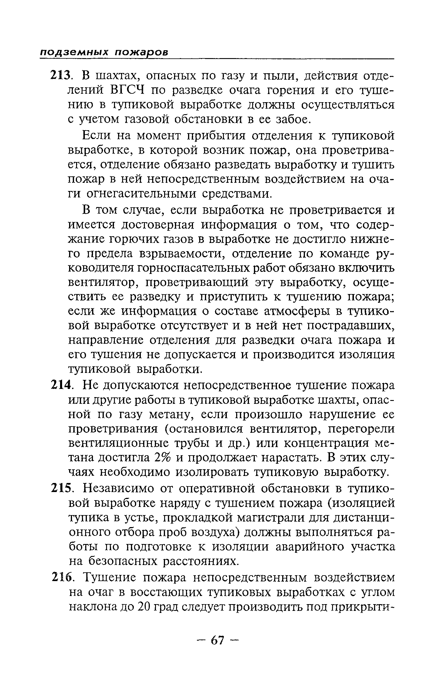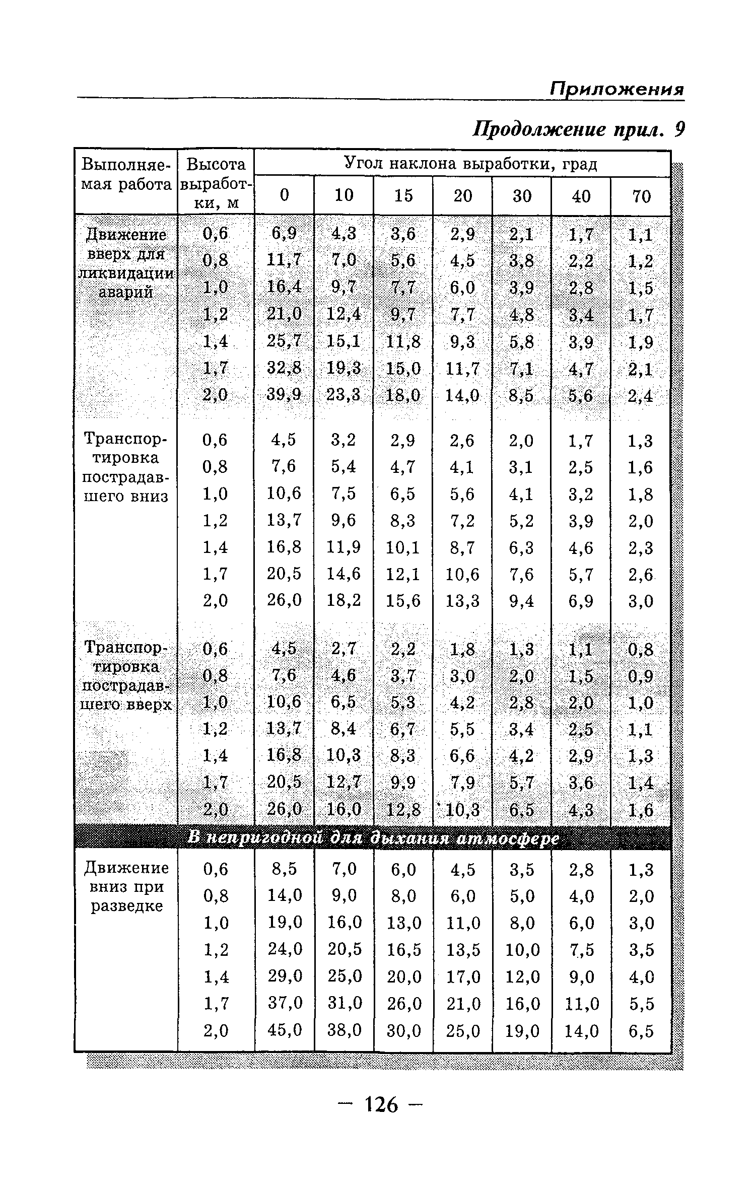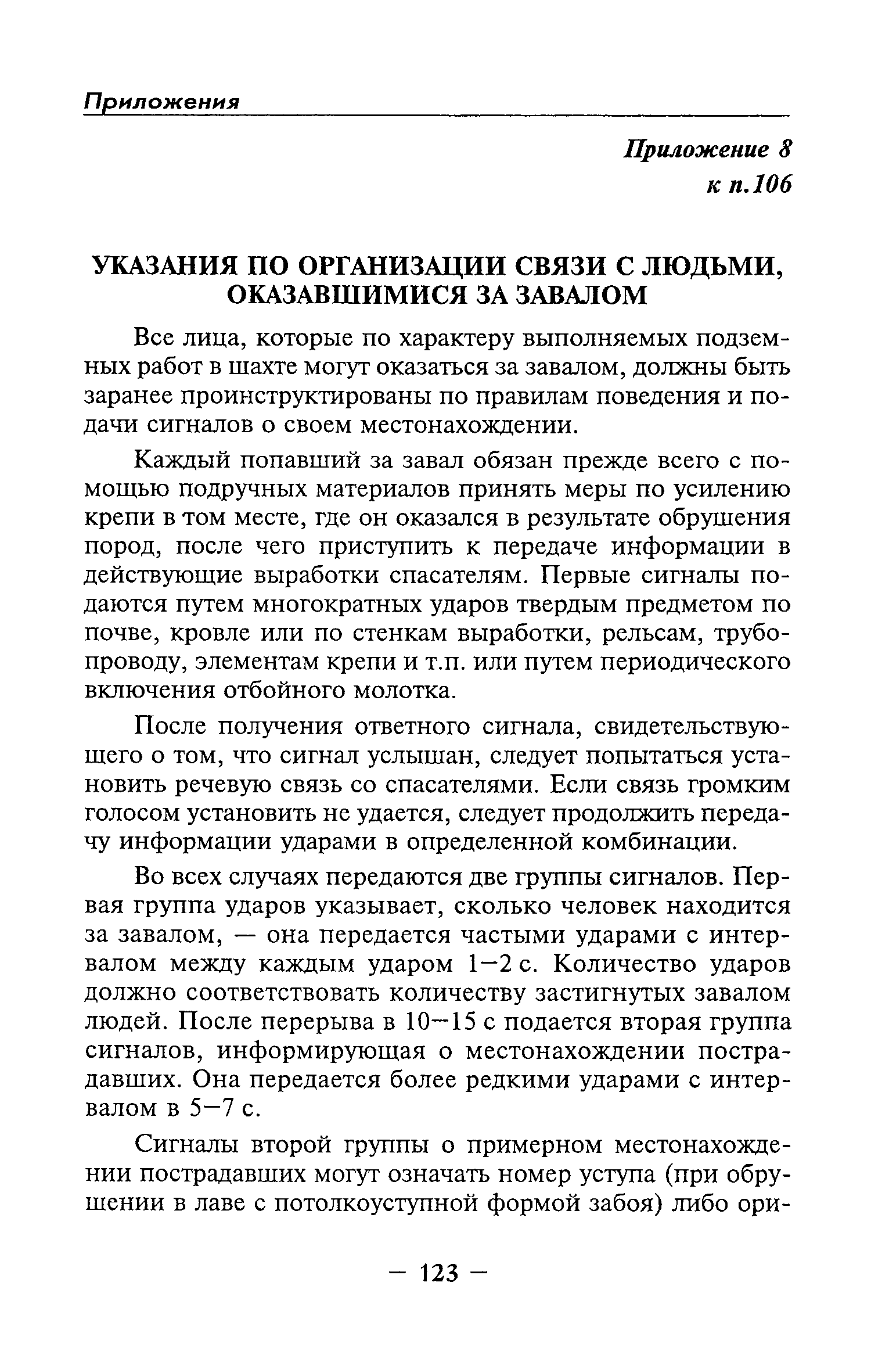 | Оглавление: | Глава I Общие положения Глава II Организационные действия в первоначальный период аварии Организация связи при горноспасательных работах Глава III Организация аварийно-спасательных работ Глава IV Действия вспомогательной горноспасательной службы Глава V Оперативные действия отделений ВГСЧ Глава VI Организация разведки и спасения людей Разведка с целью поиска людей и их спасения Разведка для выяснения обстановки Глава VII Горноспасательные работы в условиях высоких и низких температур Глава VIII Тушение подземных пожаров Вентиляционные режимы при тушении пожаров Тушение пожаров активным способом Изоляция пожарных участков Тушение пожаров в шахтах, опасных по газу и пыли Тушение пожаров в тупиковых горных выработках Тушение пожаров в наклонных горных выработках Тушение пожаров на ленточных конвейерах Тушение пожаров в горизонтальных выработках и камерах Тушение пожаров в надшахтных зданиях и вертикальных выработках Глава IХ Горноспасательные работы при ликвидации аварий других видов Ликвидация последствий взрывов метановоздушной смеси и угольной пыли Ликвидация первоочередных последствий внезапных выбросов угля и газа Ликвидация последствий проникновения в шахту ядовитых химических веществ Спасательные работы при обрушениях в горных выработках Спасательные работы при прорыве воды Ликвидация последствий прорыва плывунов и заиловочной пульпы Ликвидация аварий на разрезах, обогатительных фабриках и в кессонах Глава Х Выполнение технических работ Глава ХI Медицинское обеспечение горноспасательных работ и режим труда и отдыха горноспасателей Глава ХII Специальные службы при ликвидации аварий Глава ХIII Обязанности работников ВГСЧ при ликвидации аварий Приложение 1 к п. 14. Основные термины и определения Приложение 2 к п. 16. Форма путевки на выезд подразделения ВГСЧ Приложение 3 к п. 16. Диспозиция выездов Приложение 4 к п. 22. Оперативный журнал ВГСЧ Приложение 5 к п. 46. Оперативный план Приложение 6 к п. 78. Табель минимального оснащения отделения Приложение 7 к п. 103. Описание опознавательного жетона Приложение 8 к п. 107. Указания по организации связи с людьми, находящимися за завалом Приложение 9 к п. 114. Таблица скорости движения отделения в шахте Приложение 10 к п. 178. Методика расчета проемов в изолирующих перемычках Приложение 11 к п. 193. Методика определения взрываемости смеси горючих газов Приложение 12 к п. 195. Методика определения параметров воздушных ударных волн при взрывах газов и пыли в горных выработках Приложение 13 к п. 204. Параметры взрывоустойчивых гипсовых перемычек Приложение 14. Методические указания по расчету времени выхода включенных в самоспасатели людей по загазированным выработкам шахты Условные обозначения |