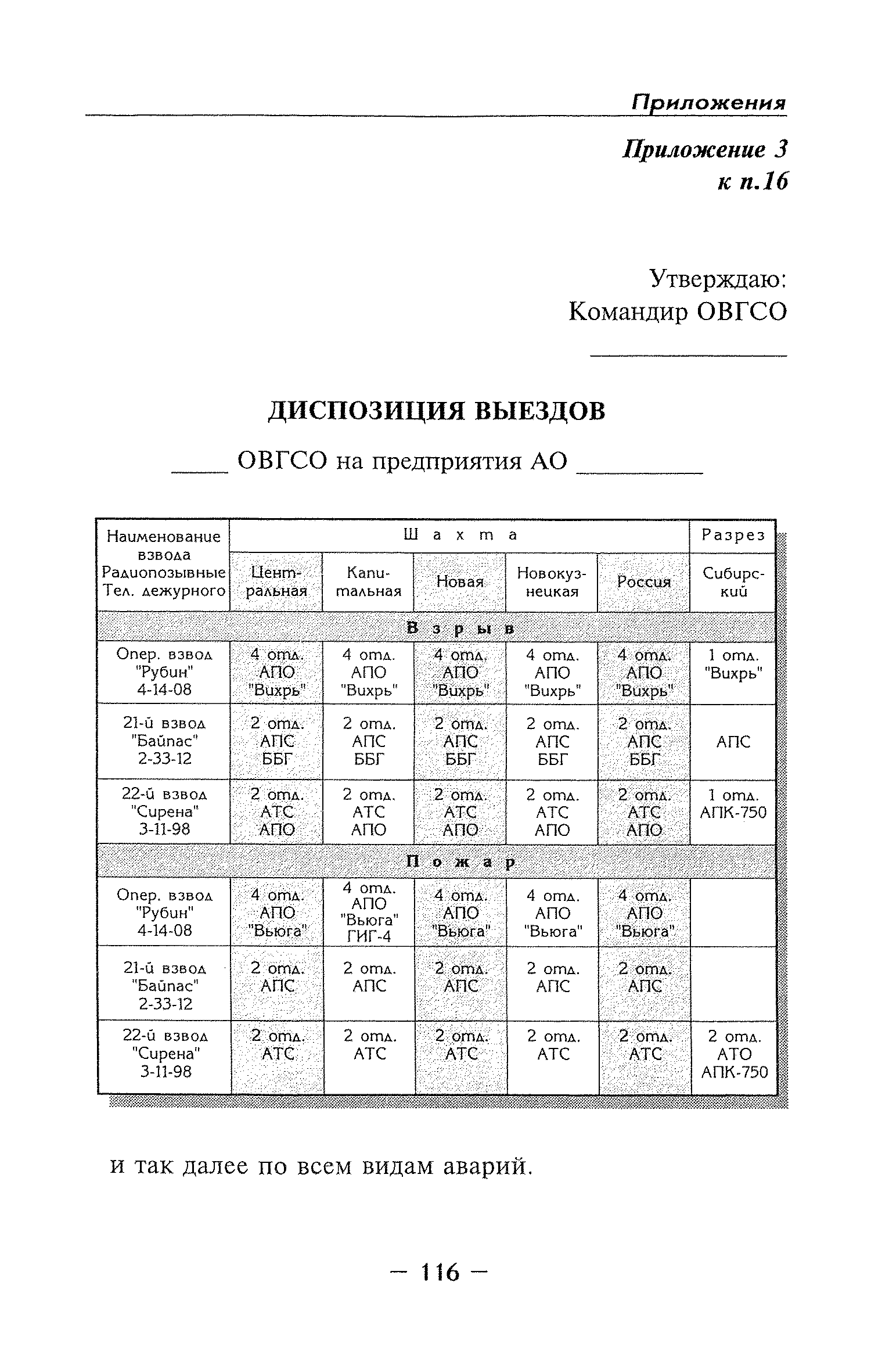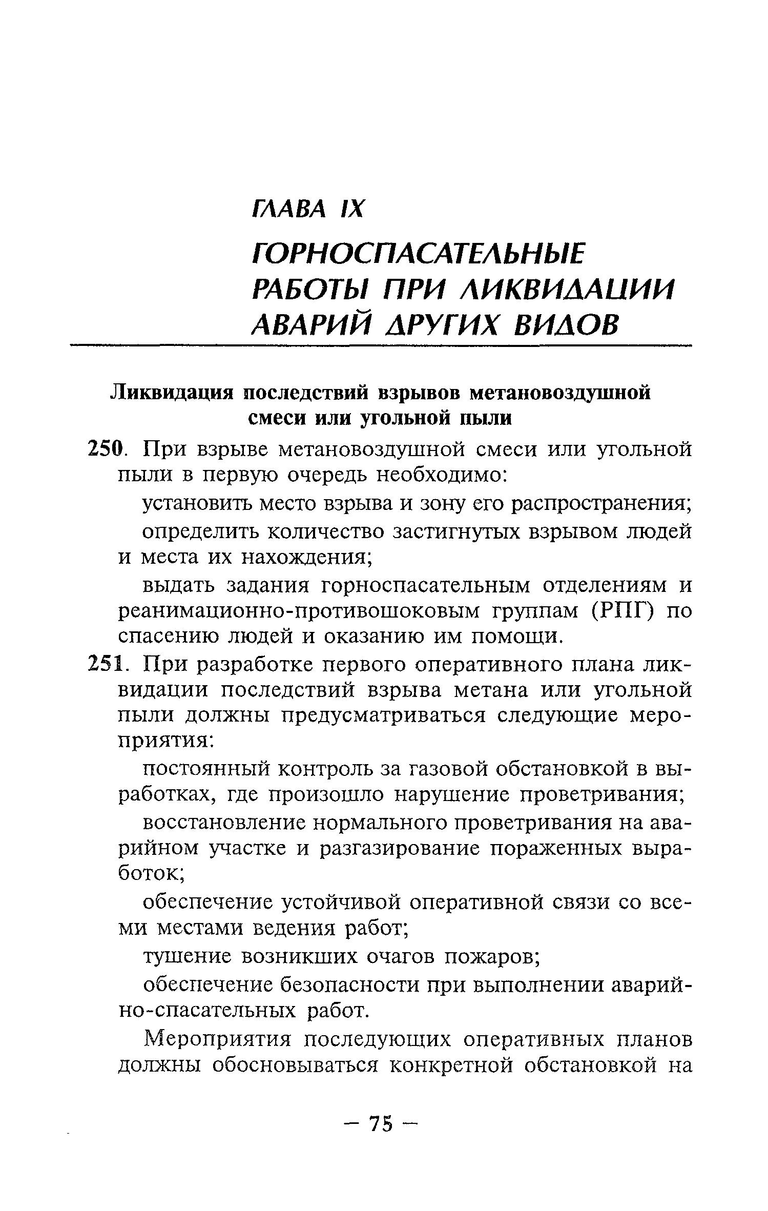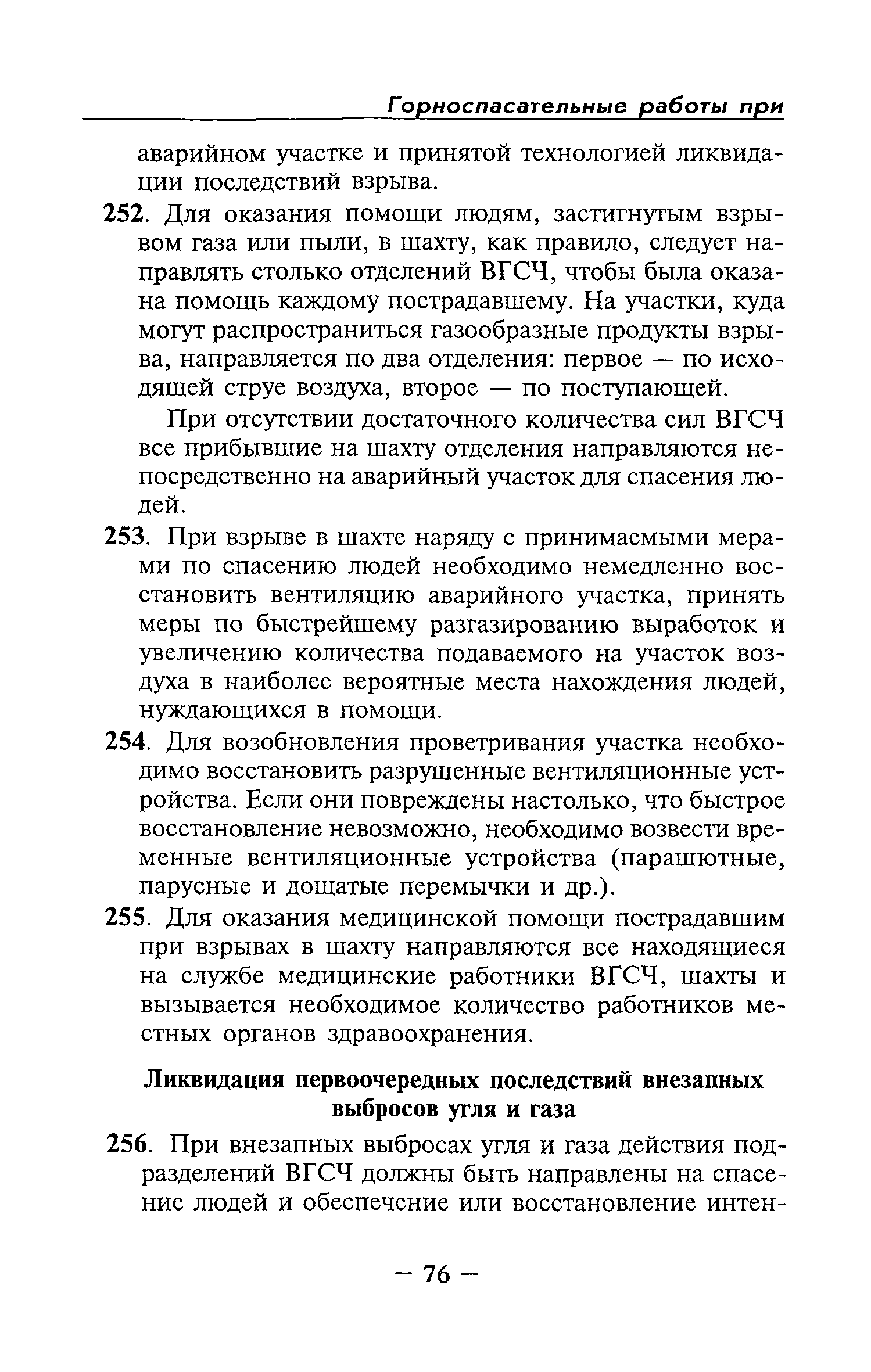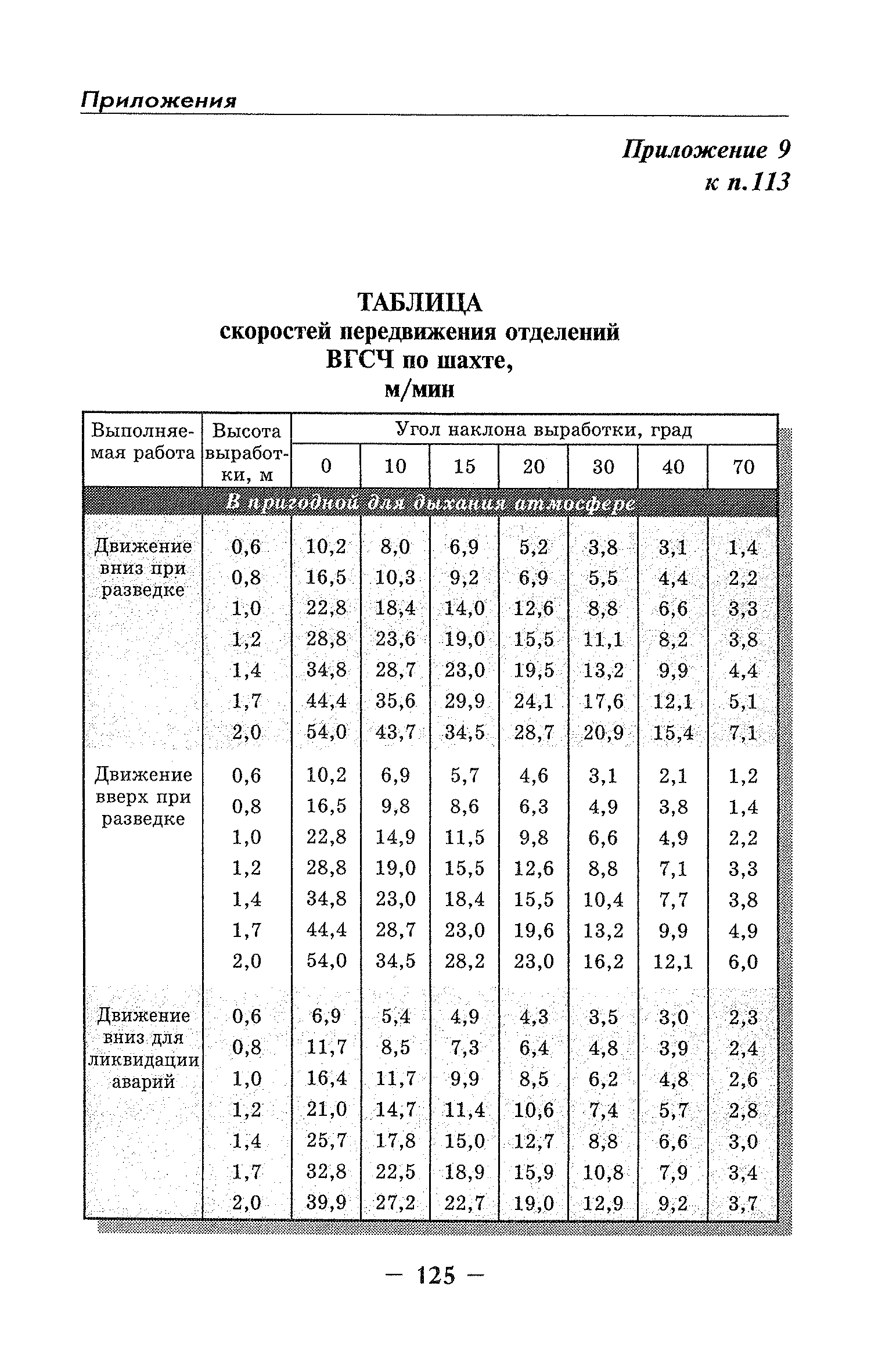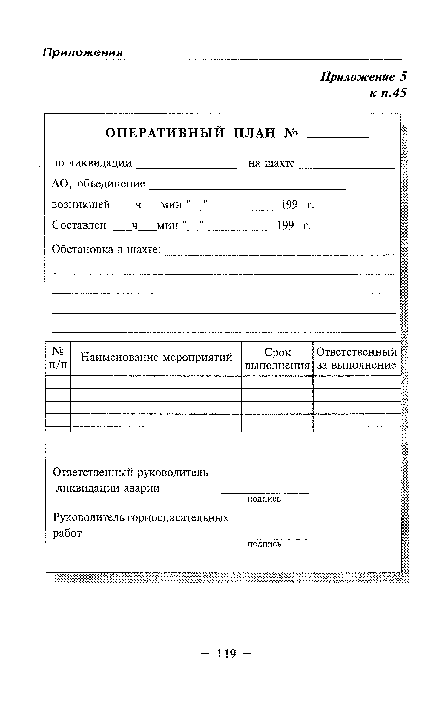 | Оглавление: | Глава I Общие положения Глава II Организационные действия в первоначальный период аварии Организация связи при горноспасательных работах Глава III Организация аварийно-спасательных работ Глава IV Действия вспомогательной горноспасательной службы Глава V Оперативные действия отделений ВГСЧ Глава VI Организация разведки и спасения людей Разведка с целью поиска людей и их спасения Разведка для выяснения обстановки Глава VII Горноспасательные работы в условиях высоких и низких температур Глава VIII Тушение подземных пожаров Вентиляционные режимы при тушении пожаров Тушение пожаров активным способом Изоляция пожарных участков Тушение пожаров в шахтах, опасных по газу и пыли Тушение пожаров в тупиковых горных выработках Тушение пожаров в наклонных горных выработках Тушение пожаров на ленточных конвейерах Тушение пожаров в горизонтальных выработках и камерах Тушение пожаров в надшахтных зданиях и вертикальных выработках Глава IХ Горноспасательные работы при ликвидации аварий других видов Ликвидация последствий взрывов метановоздушной смеси и угольной пыли Ликвидация первоочередных последствий внезапных выбросов угля и газа Ликвидация последствий проникновения в шахту ядовитых химических веществ Спасательные работы при обрушениях в горных выработках Спасательные работы при прорыве воды Ликвидация последствий прорыва плывунов и заиловочной пульпы Ликвидация аварий на разрезах, обогатительных фабриках и в кессонах Глава Х Выполнение технических работ Глава ХI Медицинское обеспечение горноспасательных работ и режим труда и отдыха горноспасателей Глава ХII Специальные службы при ликвидации аварий Глава ХIII Обязанности работников ВГСЧ при ликвидации аварий Приложение 1 к п. 14. Основные термины и определения Приложение 2 к п. 16. Форма путевки на выезд подразделения ВГСЧ Приложение 3 к п. 16. Диспозиция выездов Приложение 4 к п. 22. Оперативный журнал ВГСЧ Приложение 5 к п. 46. Оперативный план Приложение 6 к п. 78. Табель минимального оснащения отделения Приложение 7 к п. 103. Описание опознавательного жетона Приложение 8 к п. 107. Указания по организации связи с людьми, находящимися за завалом Приложение 9 к п. 114. Таблица скорости движения отделения в шахте Приложение 10 к п. 178. Методика расчета проемов в изолирующих перемычках Приложение 11 к п. 193. Методика определения взрываемости смеси горючих газов Приложение 12 к п. 195. Методика определения параметров воздушных ударных волн при взрывах газов и пыли в горных выработках Приложение 13 к п. 204. Параметры взрывоустойчивых гипсовых перемычек Приложение 14. Методические указания по расчету времени выхода включенных в самоспасатели людей по загазированным выработкам шахты Условные обозначения |