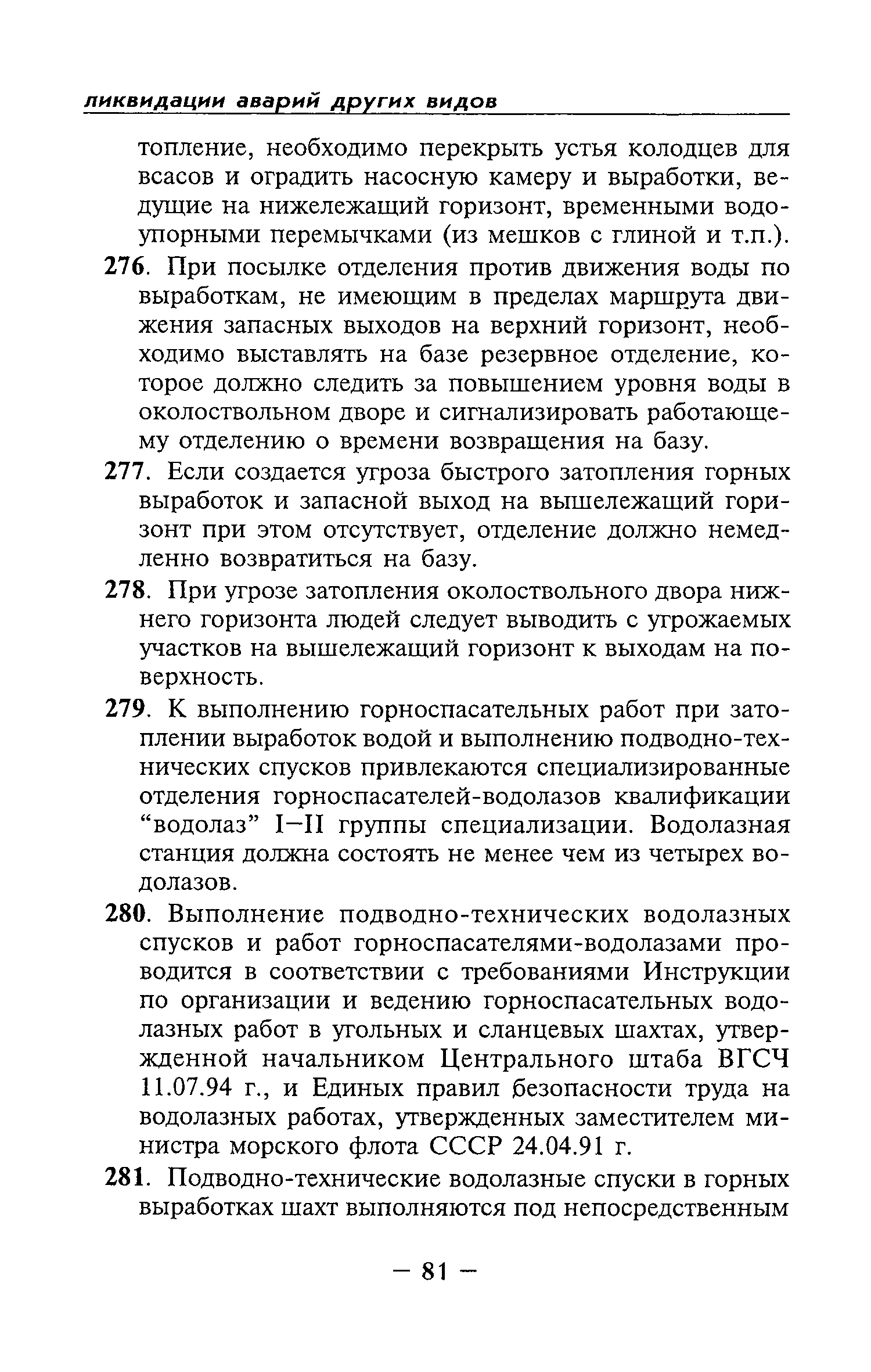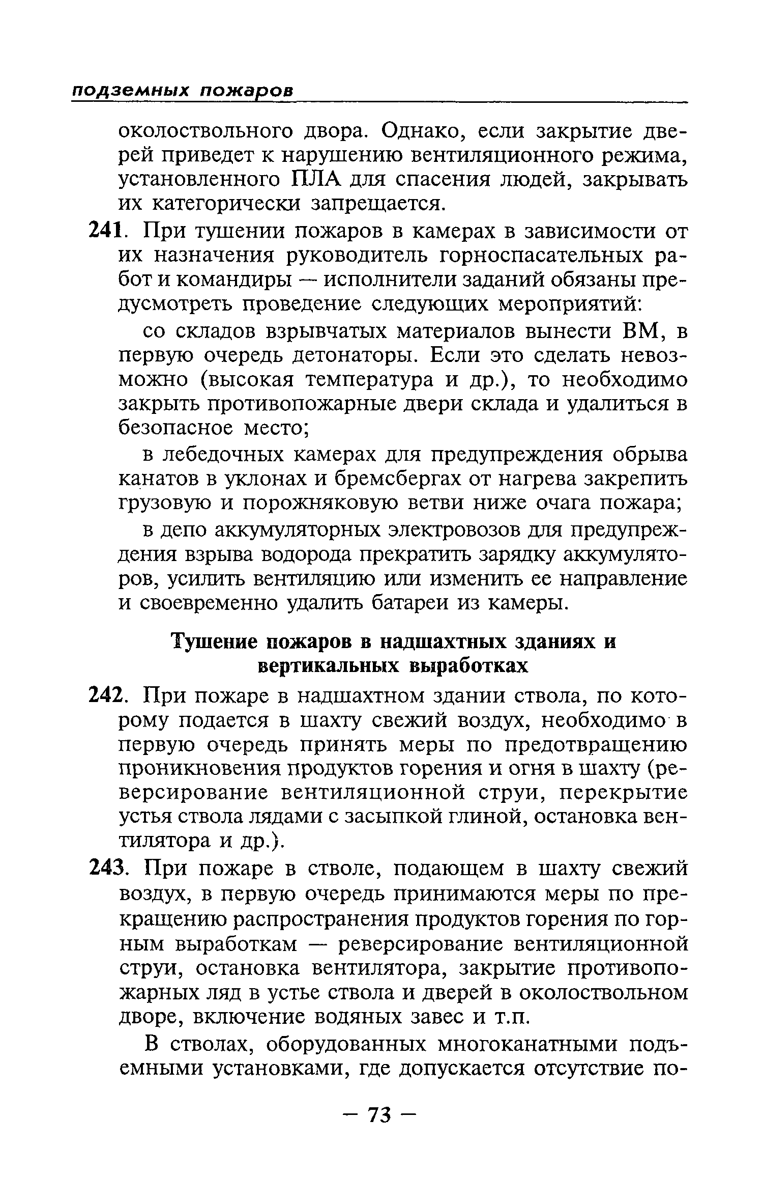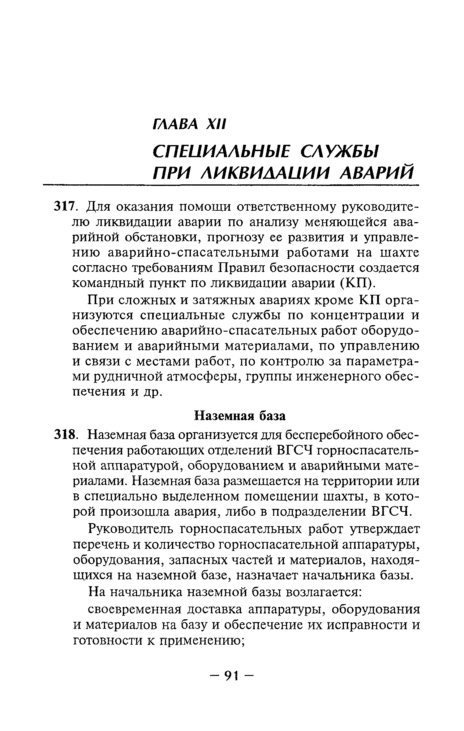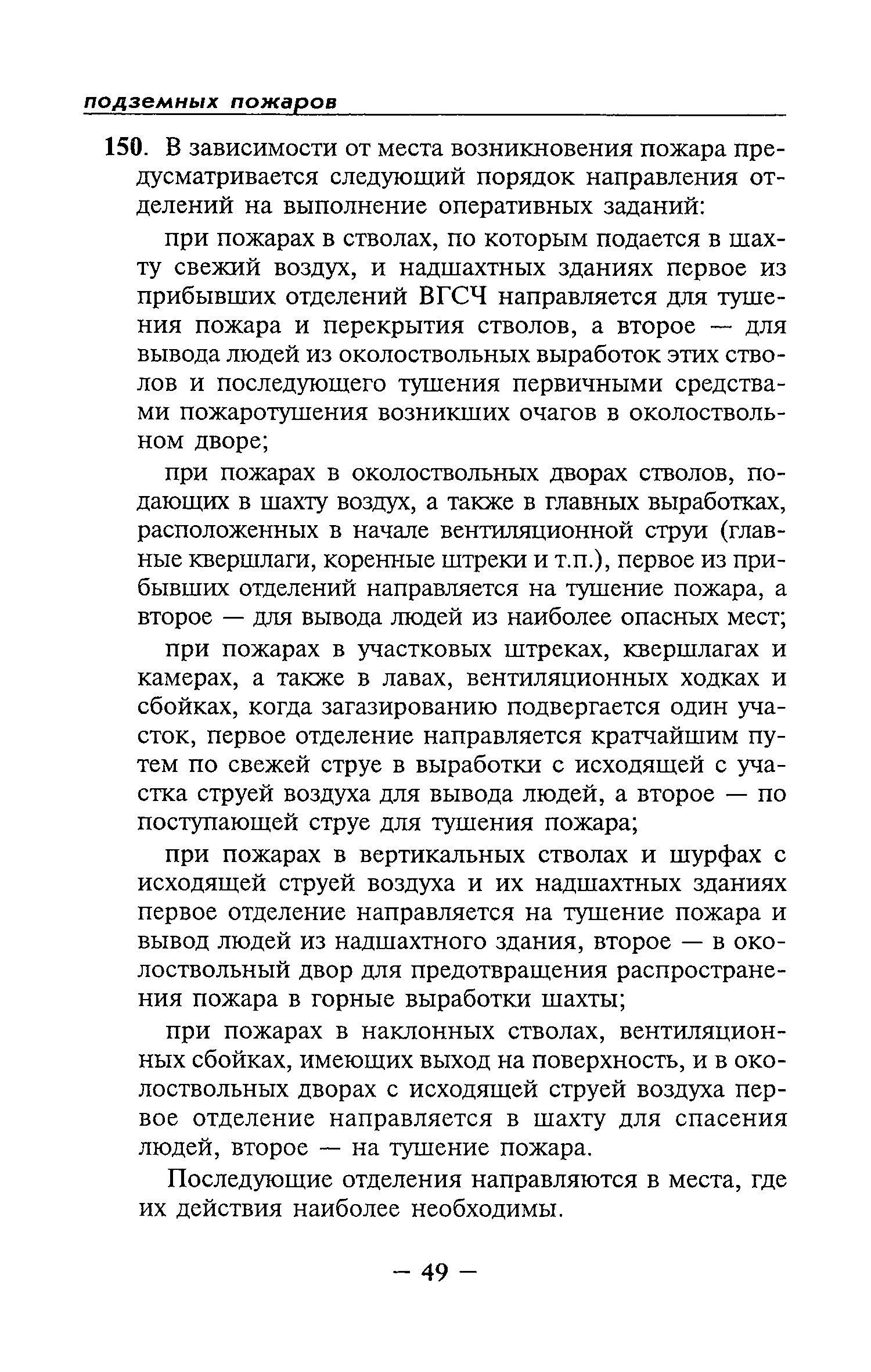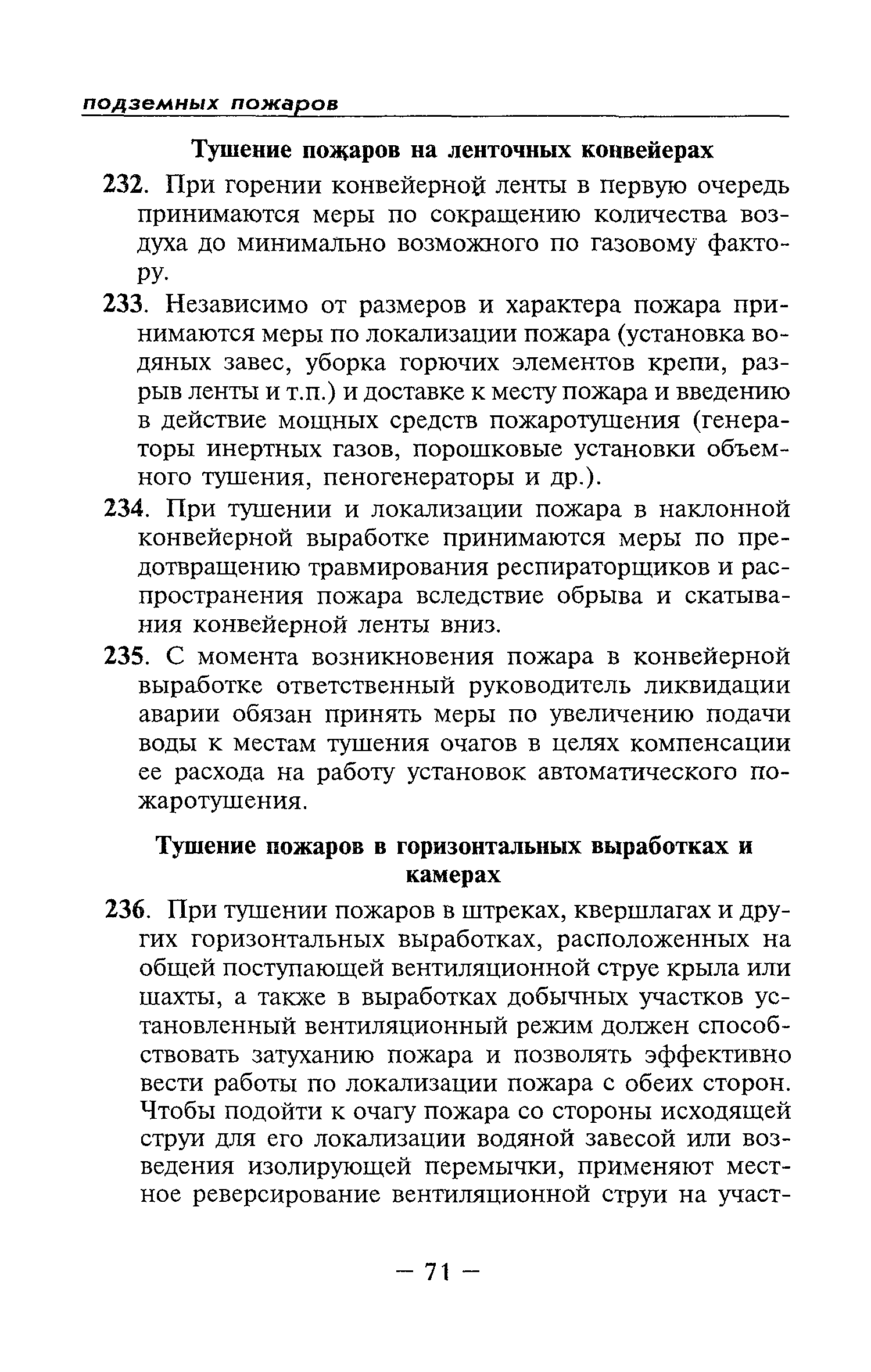 | Оглавление: | Глава I Общие положения Глава II Организационные действия в первоначальный период аварии Организация связи при горноспасательных работах Глава III Организация аварийно-спасательных работ Глава IV Действия вспомогательной горноспасательной службы Глава V Оперативные действия отделений ВГСЧ Глава VI Организация разведки и спасения людей Разведка с целью поиска людей и их спасения Разведка для выяснения обстановки Глава VII Горноспасательные работы в условиях высоких и низких температур Глава VIII Тушение подземных пожаров Вентиляционные режимы при тушении пожаров Тушение пожаров активным способом Изоляция пожарных участков Тушение пожаров в шахтах, опасных по газу и пыли Тушение пожаров в тупиковых горных выработках Тушение пожаров в наклонных горных выработках Тушение пожаров на ленточных конвейерах Тушение пожаров в горизонтальных выработках и камерах Тушение пожаров в надшахтных зданиях и вертикальных выработках Глава IХ Горноспасательные работы при ликвидации аварий других видов Ликвидация последствий взрывов метановоздушной смеси и угольной пыли Ликвидация первоочередных последствий внезапных выбросов угля и газа Ликвидация последствий проникновения в шахту ядовитых химических веществ Спасательные работы при обрушениях в горных выработках Спасательные работы при прорыве воды Ликвидация последствий прорыва плывунов и заиловочной пульпы Ликвидация аварий на разрезах, обогатительных фабриках и в кессонах Глава Х Выполнение технических работ Глава ХI Медицинское обеспечение горноспасательных работ и режим труда и отдыха горноспасателей Глава ХII Специальные службы при ликвидации аварий Глава ХIII Обязанности работников ВГСЧ при ликвидации аварий Приложение 1 к п. 14. Основные термины и определения Приложение 2 к п. 16. Форма путевки на выезд подразделения ВГСЧ Приложение 3 к п. 16. Диспозиция выездов Приложение 4 к п. 22. Оперативный журнал ВГСЧ Приложение 5 к п. 46. Оперативный план Приложение 6 к п. 78. Табель минимального оснащения отделения Приложение 7 к п. 103. Описание опознавательного жетона Приложение 8 к п. 107. Указания по организации связи с людьми, находящимися за завалом Приложение 9 к п. 114. Таблица скорости движения отделения в шахте Приложение 10 к п. 178. Методика расчета проемов в изолирующих перемычках Приложение 11 к п. 193. Методика определения взрываемости смеси горючих газов Приложение 12 к п. 195. Методика определения параметров воздушных ударных волн при взрывах газов и пыли в горных выработках Приложение 13 к п. 204. Параметры взрывоустойчивых гипсовых перемычек Приложение 14. Методические указания по расчету времени выхода включенных в самоспасатели людей по загазированным выработкам шахты Условные обозначения |