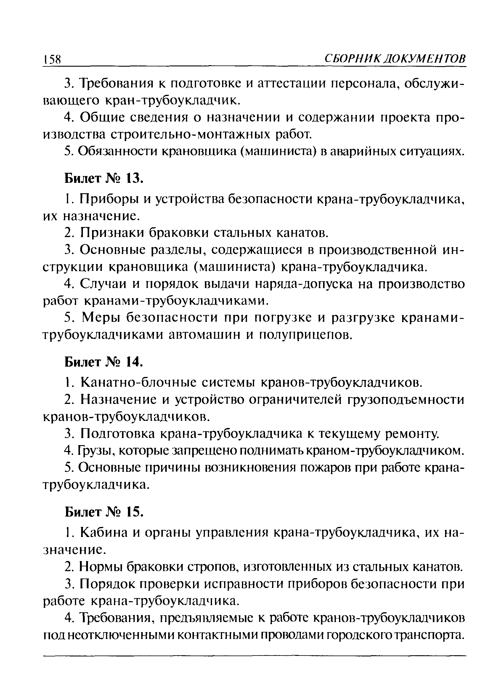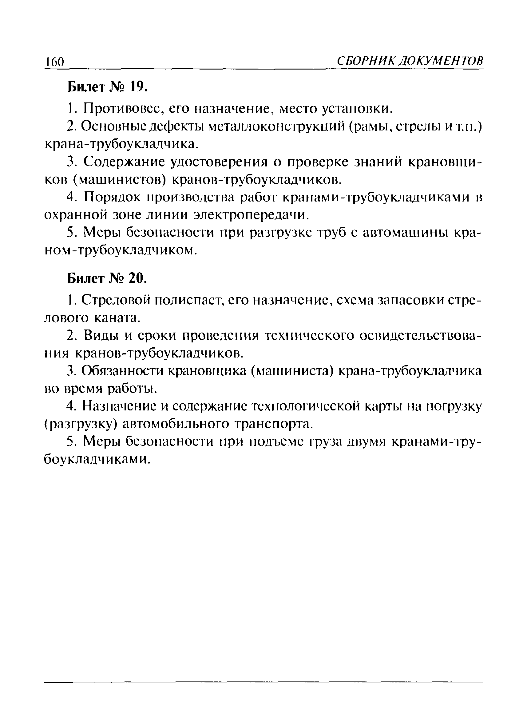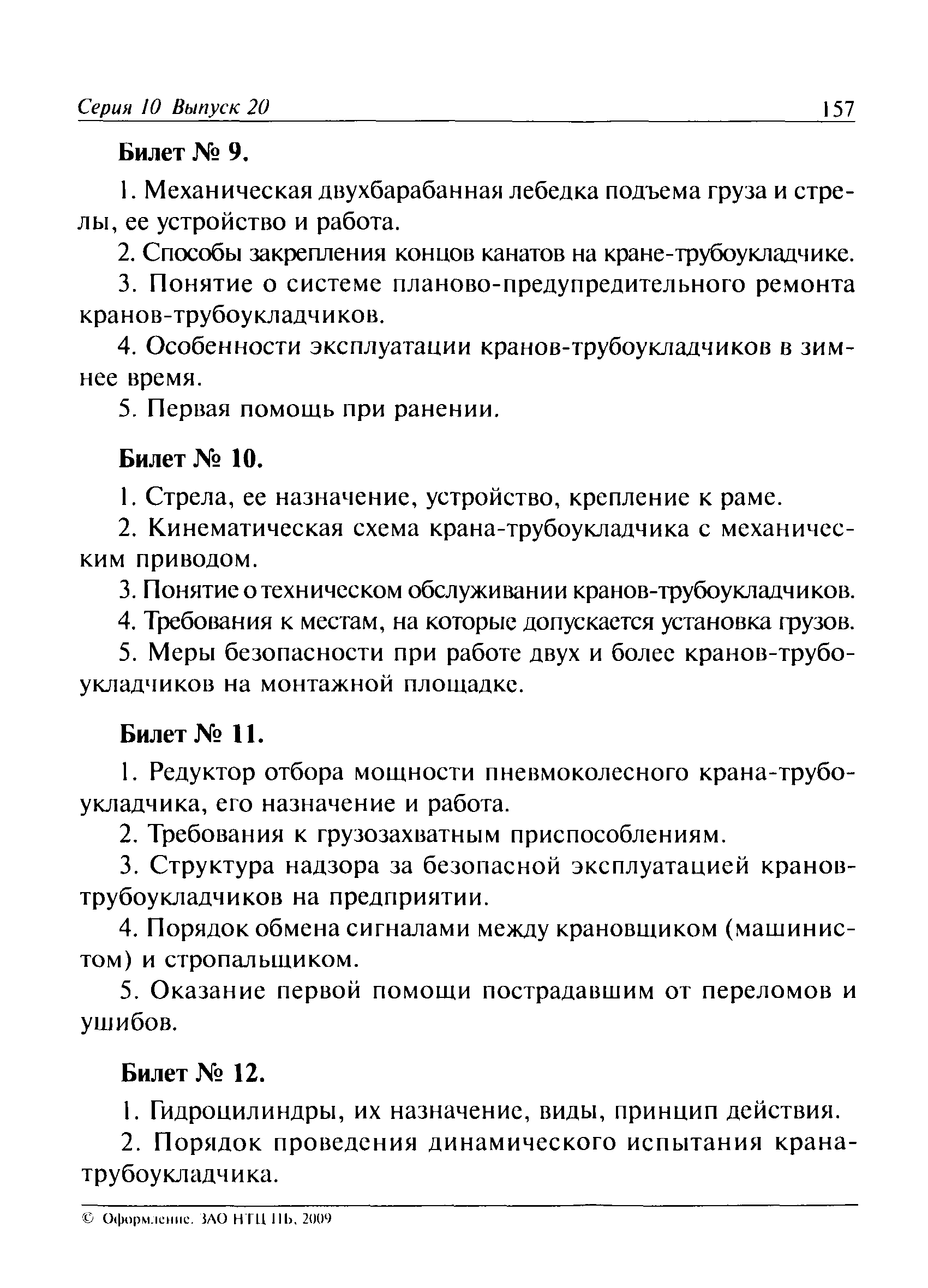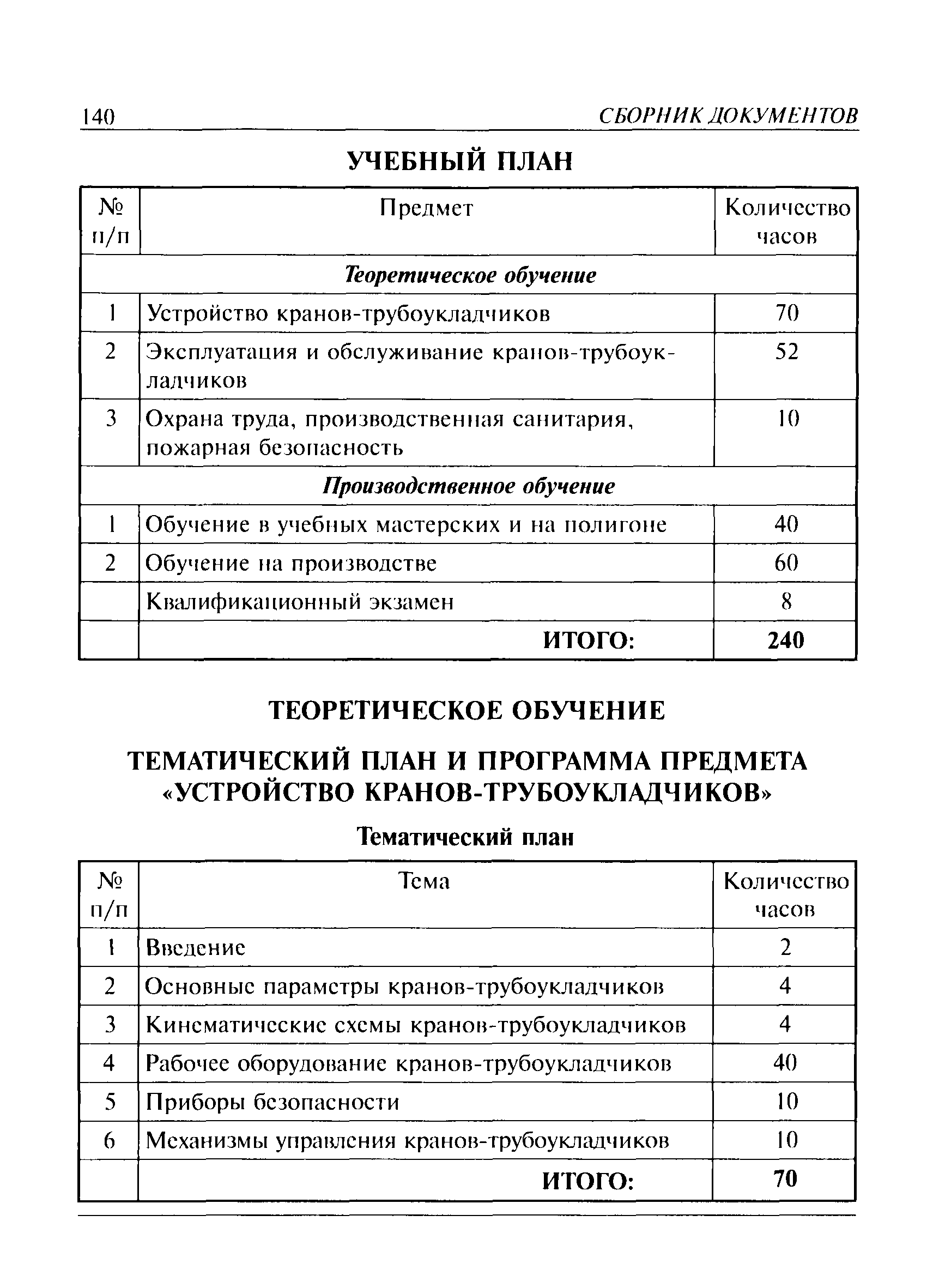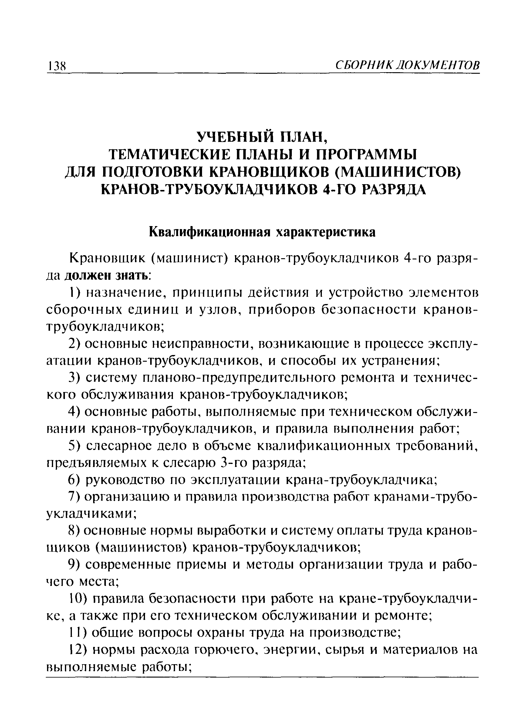| Оглавление: | Пояснительная записка Учебный план, тематические планы и программы для подготовки крановщиков (машинистов) кранов-трубоукладчиков 4-го разряда Квалификационная характеристика Учебный план Теоретическое обучение Тематический план и программа предмета "Устройство кранов-трубоукладчиков" Программа Тематический план и программа предмета "Эксплуатация и обслуживание кранов-трубоукладчиков" Программа Тематический план и программа предмета "Охрана труда, производственная санитария, пожарная безопасность" Программа Программа предмета "Обучение в учебных мастерских и на полигоне" Тематический план и программа предмета "Обучение на производстве" Программа Список рекомендуемой литературы Экзаменационные билеты для аттестации крановщиков (машинистов) кранов-трубоукладчиков |