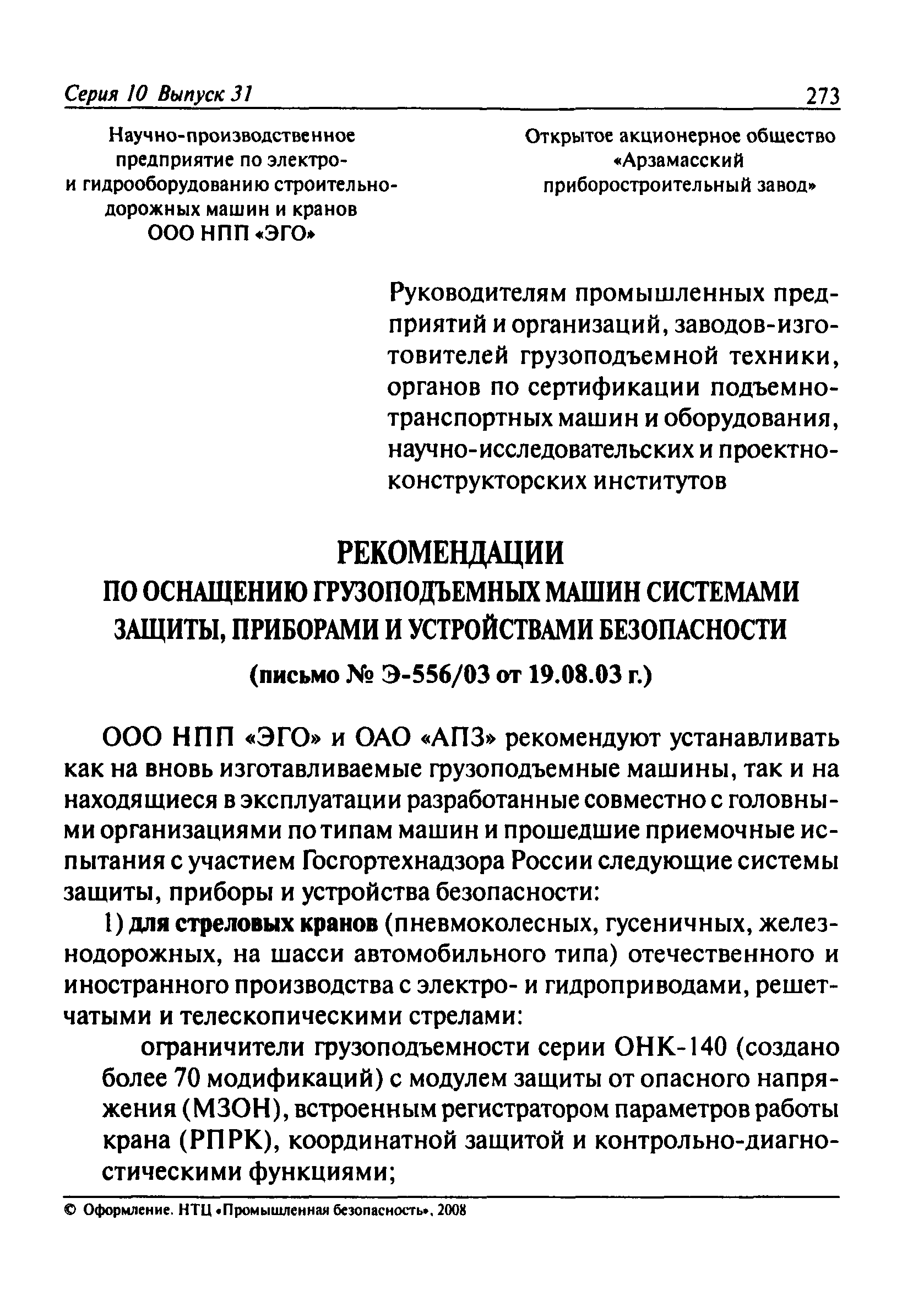 Рекомендации по оснащению грузоподъемных машин системами защиты, приборами и устройствами безопасности| Статус: | действует | | Название рус.: | Рекомендации по оснащению грузоподъемных машин системами защиты, приборами и устройствами безопасности | | Дата добавления в базу: | 01.09.2013 | | Дата актуализации: | 01.01.2021 | | Дата введения: | 19.08.2003 | | Утверждён: | ОАО Арзамасский приборостроительный завод (Arzamas Instrument Manufacturing Plant OAO ) 19.08.2003 ООО НПП ЭГО (Э-556/03)