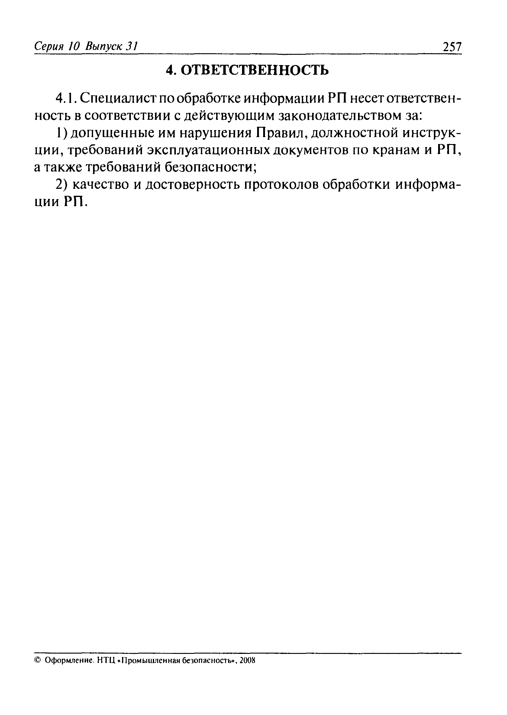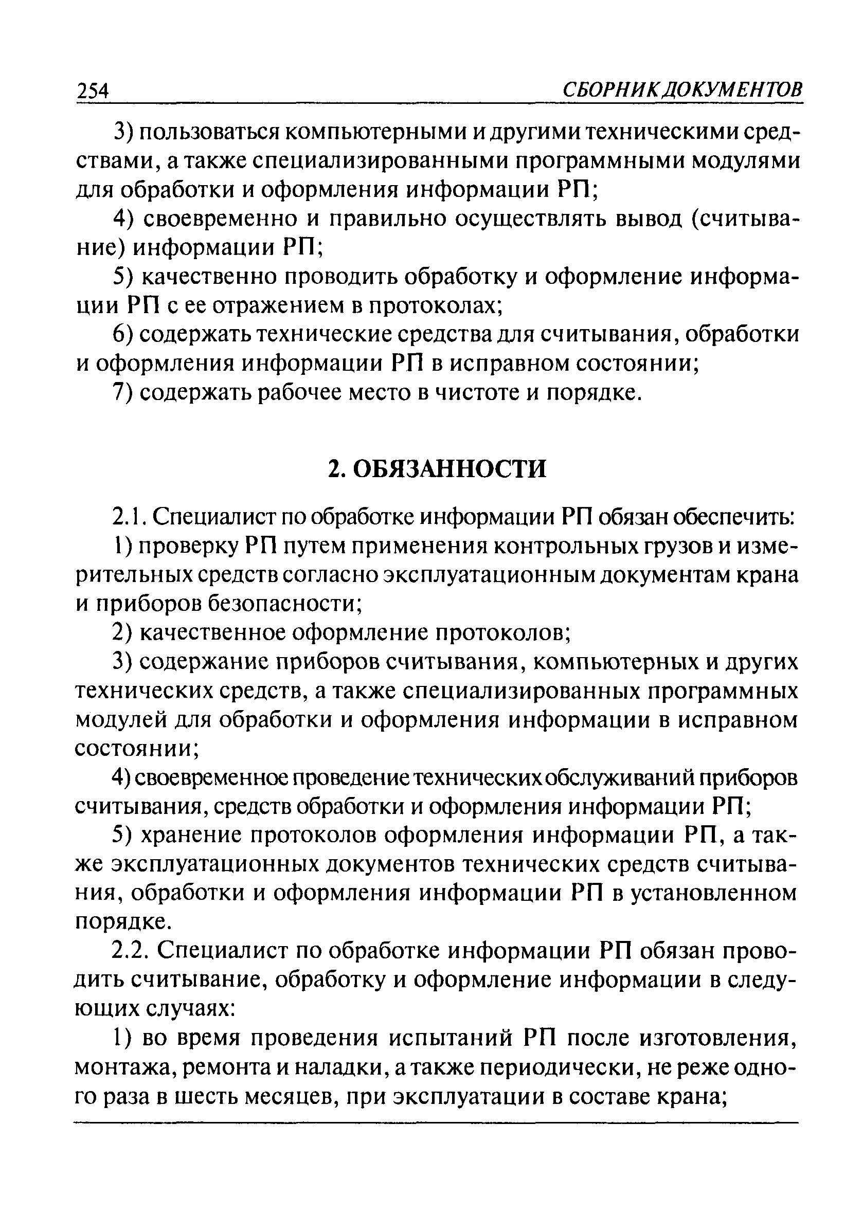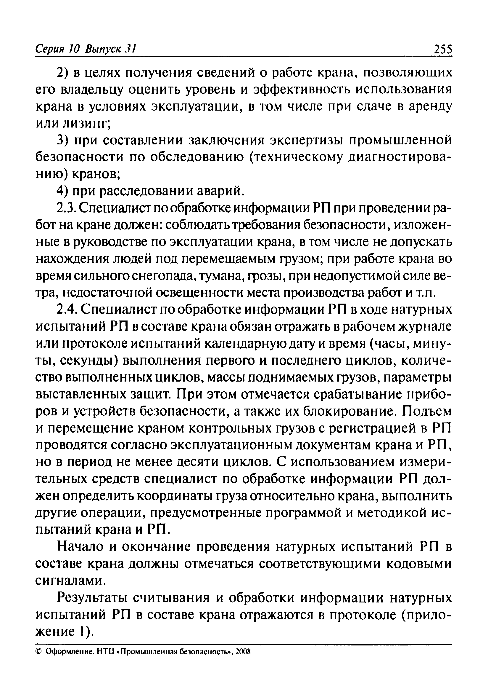| Оглавление: | 1. Общие положения 2. Обязанности 3. Права 4. Ответственность Приложение 1. Протокол проверки РП после изготовления, монтажа, ремонта, наладки и периодически в процессе эксплуатации Приложение 2. Протокол проверки эффективности использования крана в условиях эксплуатации Приложение 3. Протокол обработки информации РП при составлении заключения экспертизы промышленной безопасности крана Приложение 4. Протокол обработки информации РП при расследовании аварии крана |