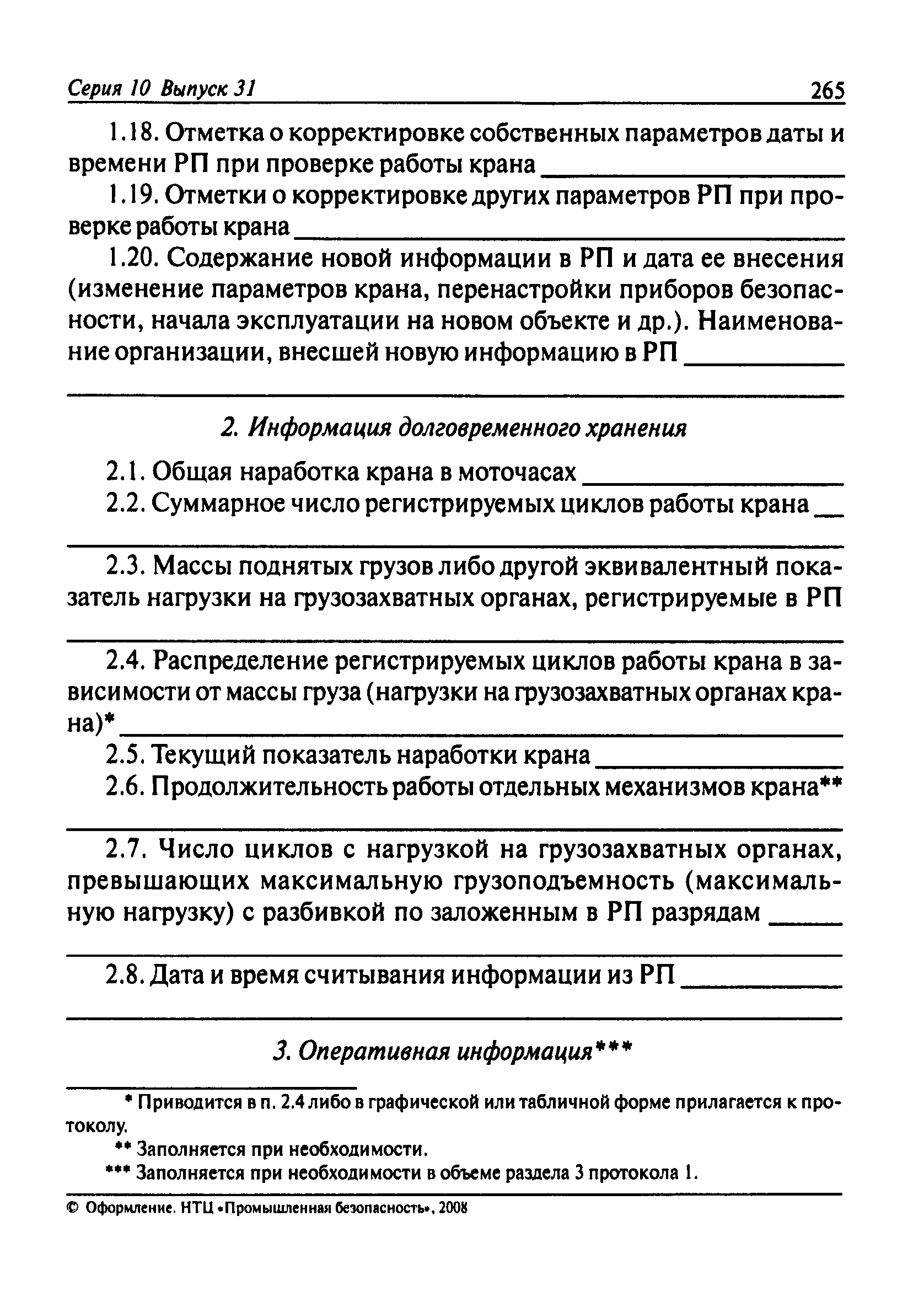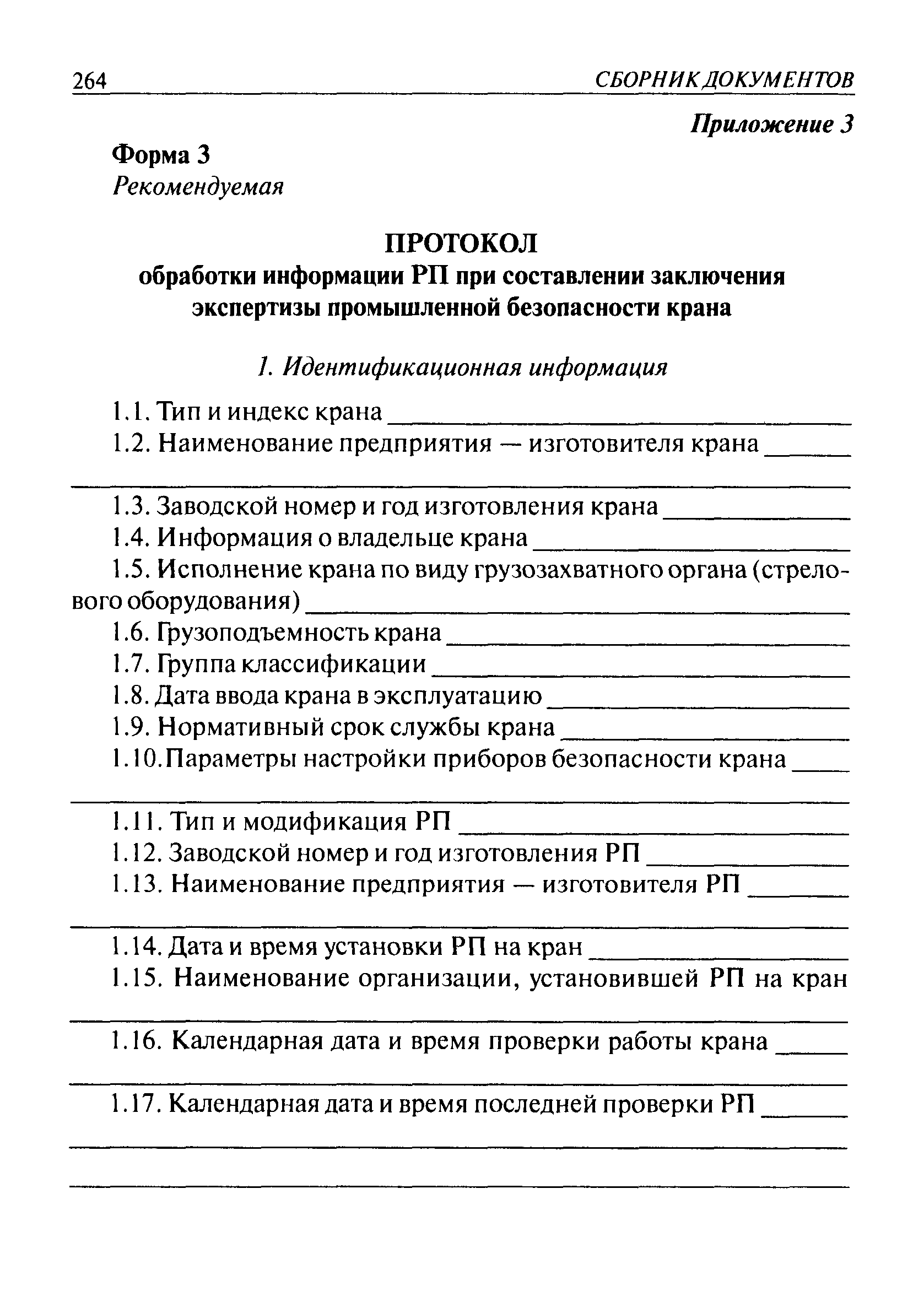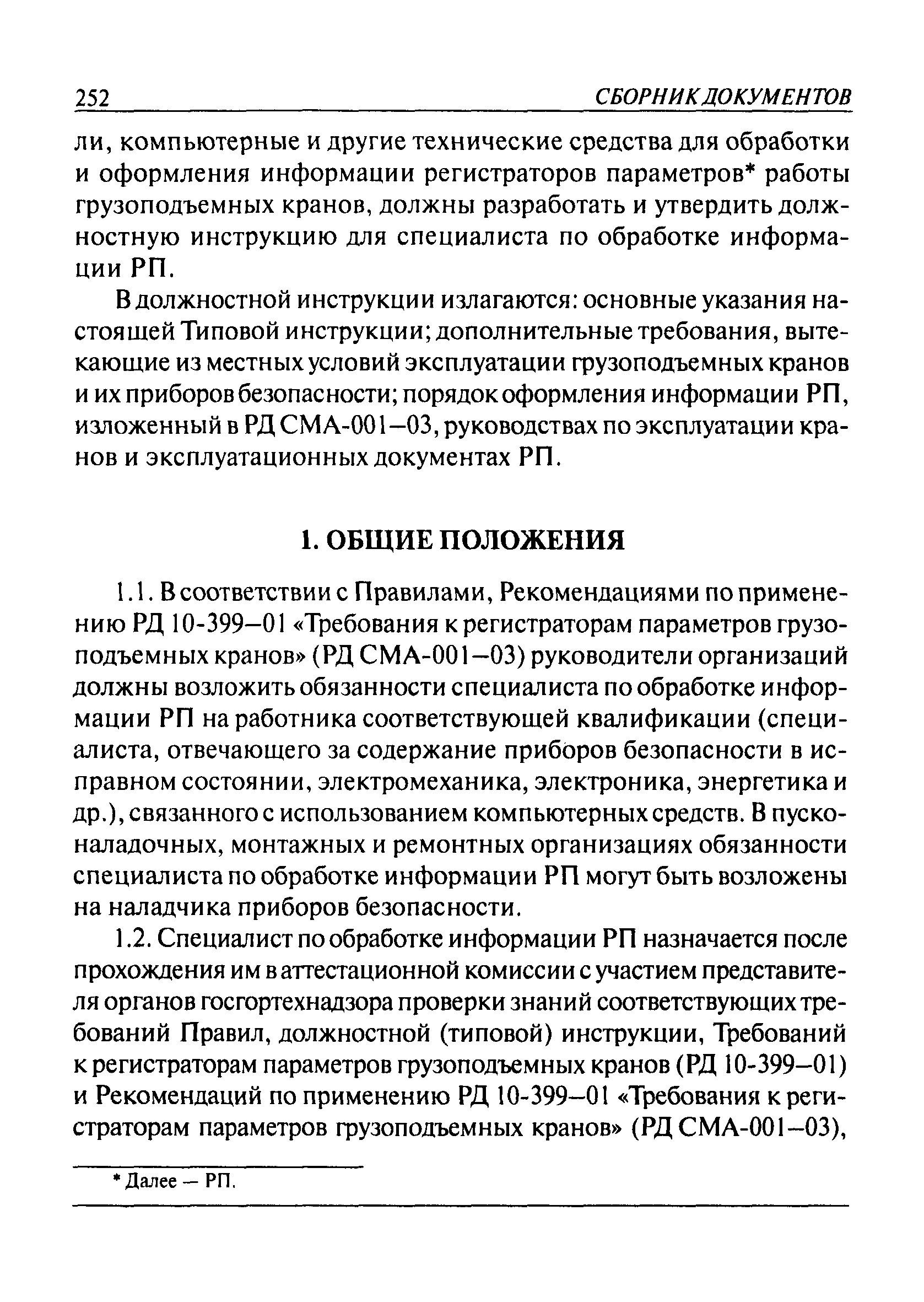 | Оглавление: | 1. Общие положения 2. Обязанности 3. Права 4. Ответственность Приложение 1. Протокол проверки РП после изготовления, монтажа, ремонта, наладки и периодически в процессе эксплуатации Приложение 2. Протокол проверки эффективности использования крана в условиях эксплуатации Приложение 3. Протокол обработки информации РП при составлении заключения экспертизы промышленной безопасности крана Приложение 4. Протокол обработки информации РП при расследовании аварии крана |