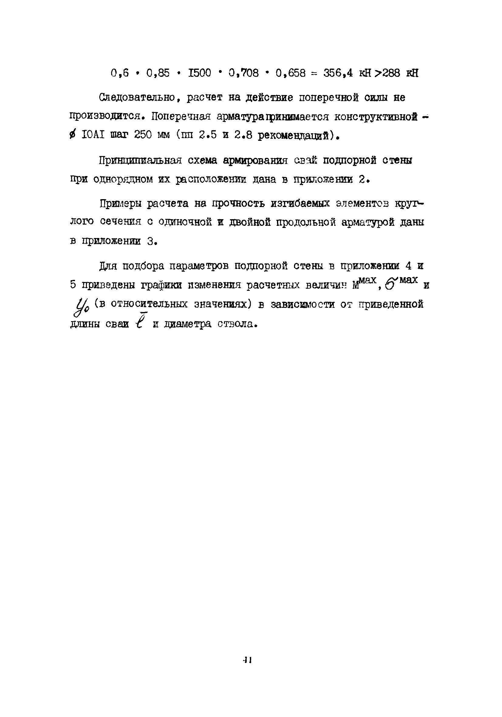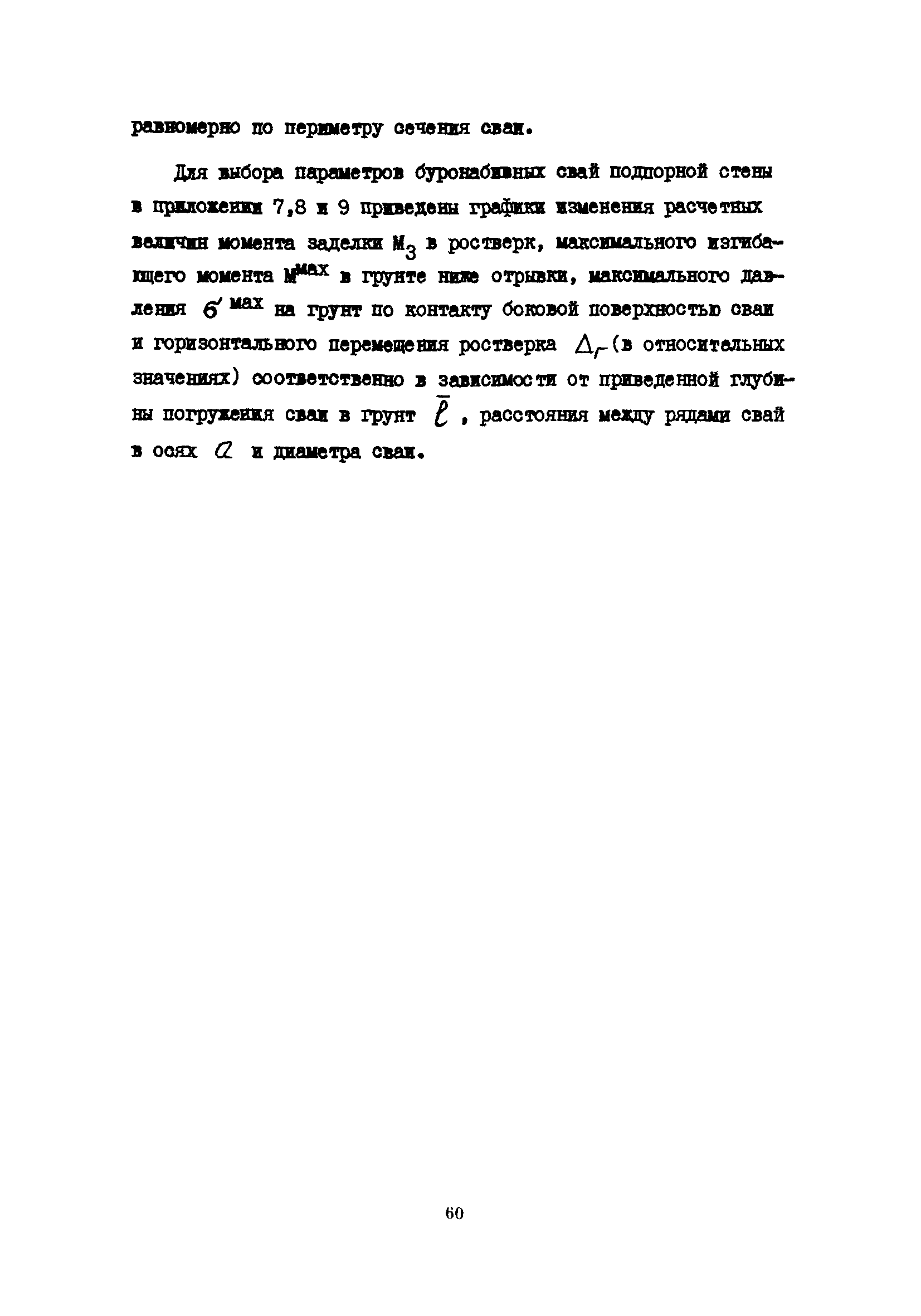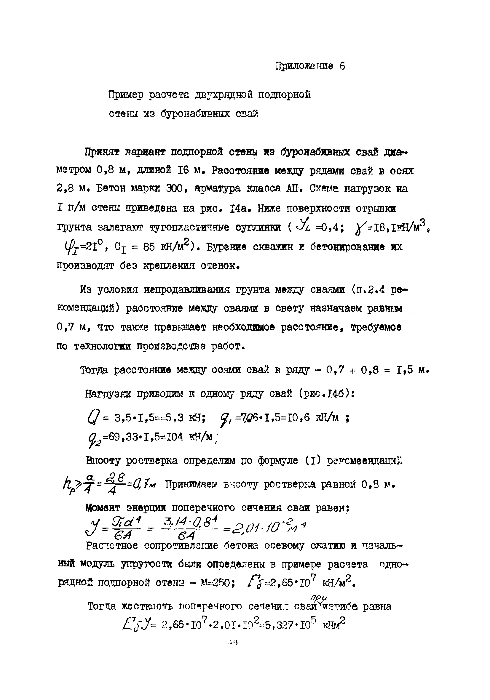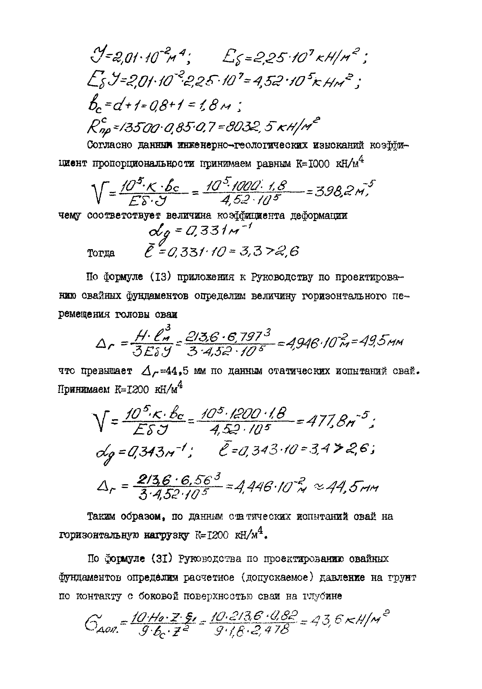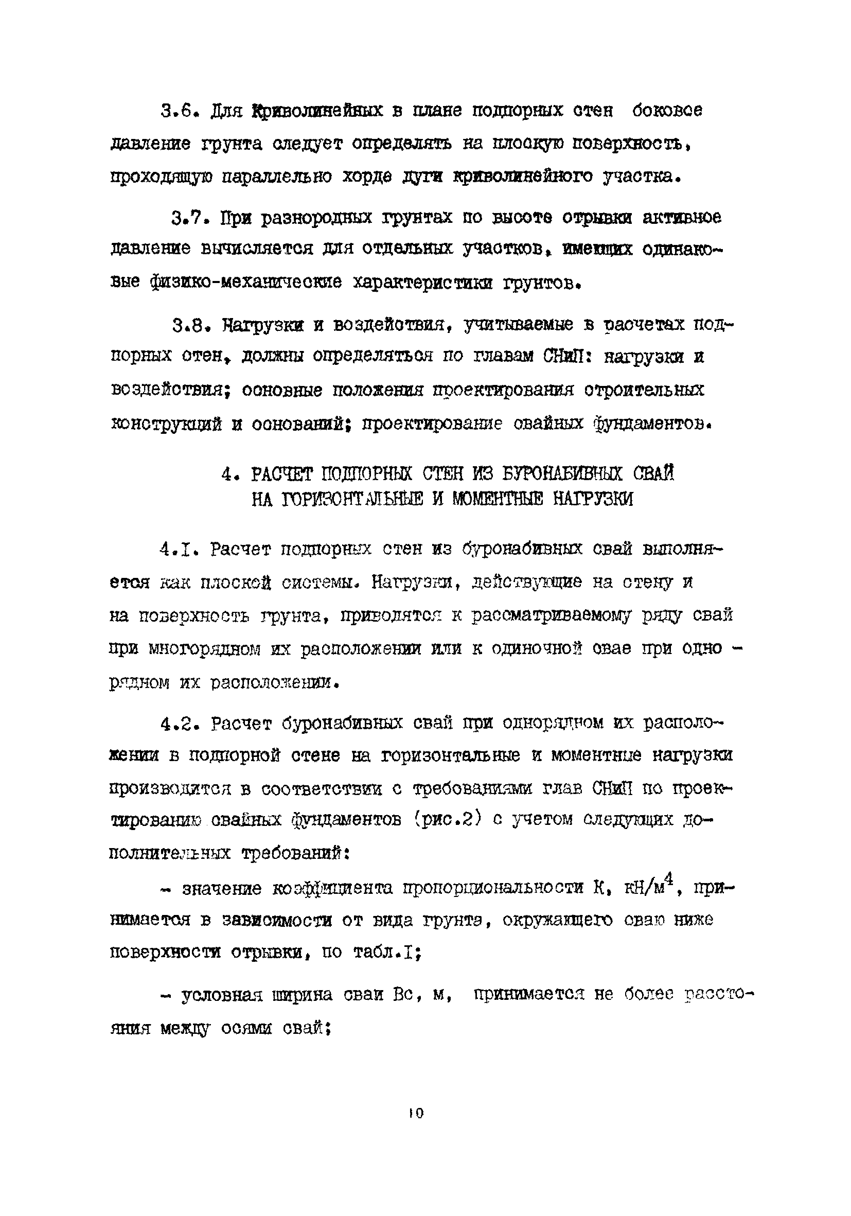 | Оглавление: | 1 Общие положения 2 Конструктивные требования 3 Общие положения расчета подпорных стен из буронабивных свай 4 Расчет подпорных стен из буронабивных свай на горизонтальные и моментные нагрузки 5 Определение коэффициента пропорциональности грунта по результатам статических испытаний свай на горизонтальную нагрузку 6 Расчет по прочности изгибаемых элементов круглого сечения, нормального к продольной оси Приложение 1. Пример расчета подпорных стен при однорядном расположении свай Приложение 2. Схема армирования свай подпорной стены при однорядном их расположении Приложение 3. Примеры расчета на прочность изгибаемых элементов круглого сечения с неравномерным расположением продольной арматуры в поперечном сечении Приложение 4. Графики изменения расчетных величин в зависимости от приведенной длины сваи Приложение 5. Графики изменения расчетных величин в зависимости от диаметра сваи Приложение 6. Пример расчета двухрядной подпорной стены из буронабивных свай Приложение 7. Графики изменения расчетных величин в зависимости от приведенной длины сваи Приложение 8. Графики изменения расчетных величин в зависимости от диаметра сваи Приложение 9. Графики изменения расчетных величин в зависимости от расстояния между рядами свай в осях Приложение 10. Пример статистической обработки результатов статических испытаний свай на горизонтальную нагрузку и определение коэффициента пропорциональности и допускаемого расчетного давления на грунт боковой поверхностью сваи |