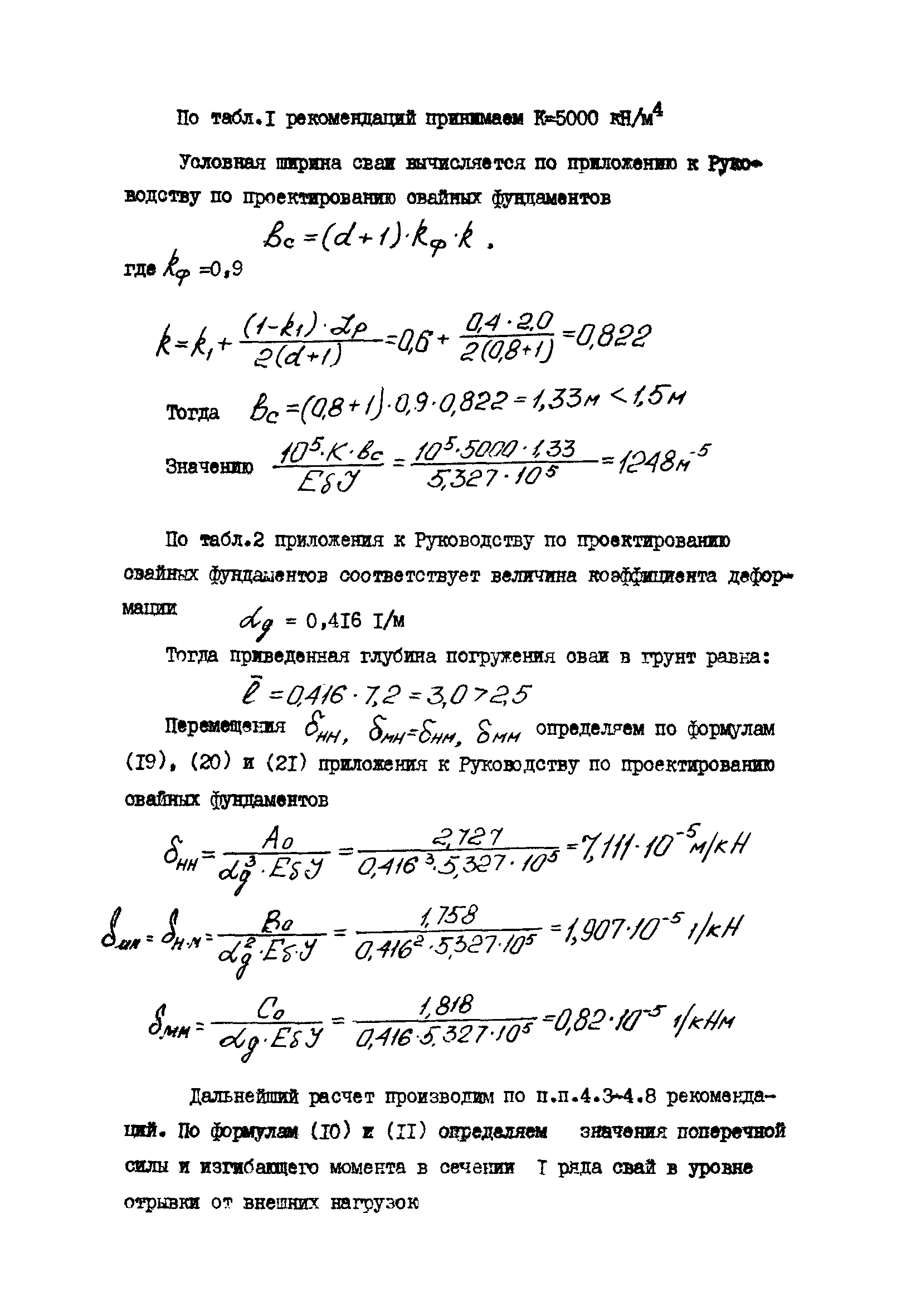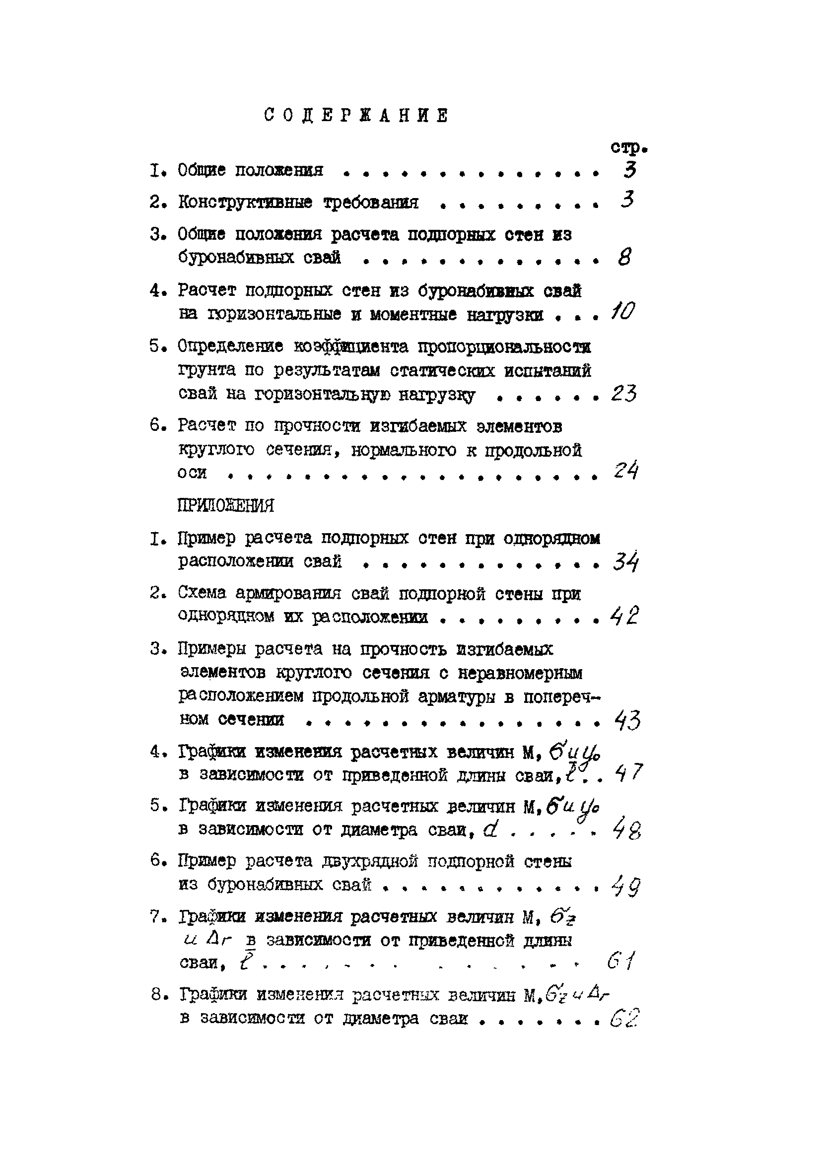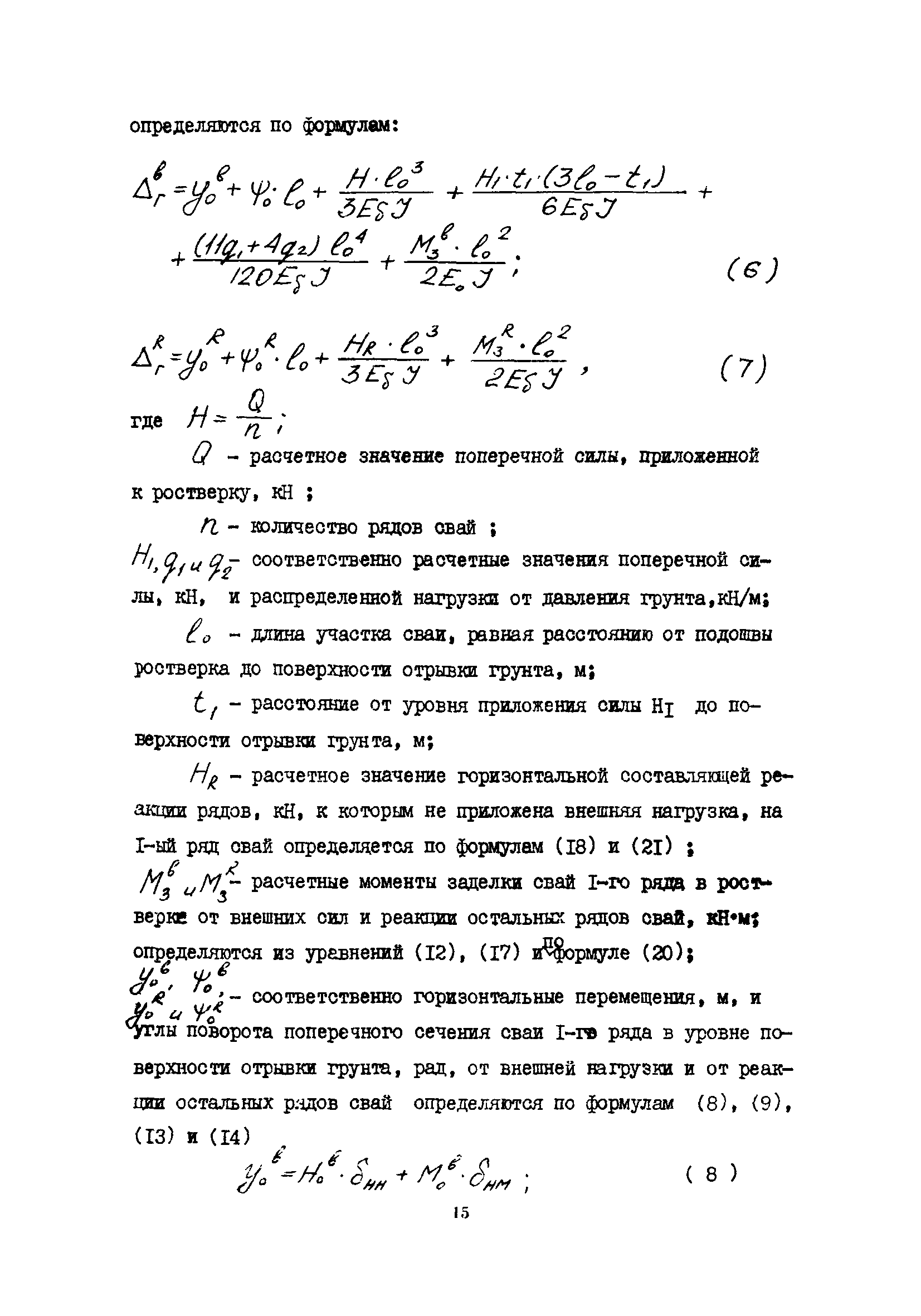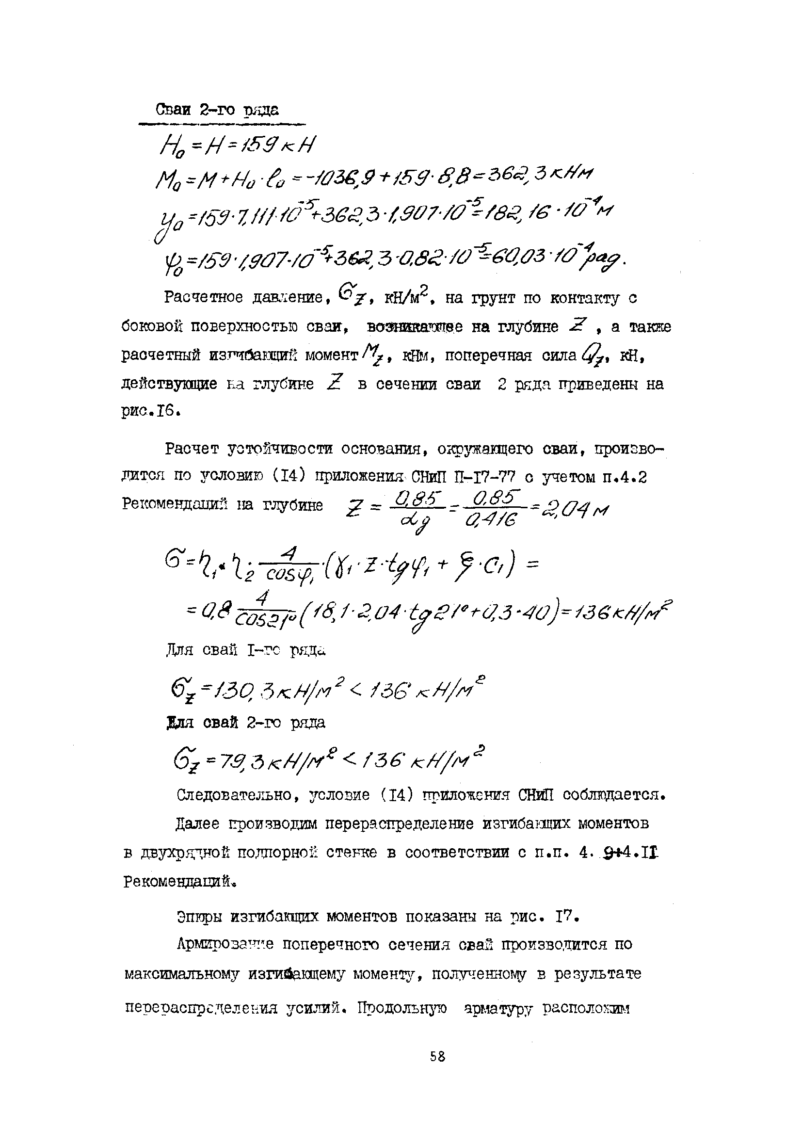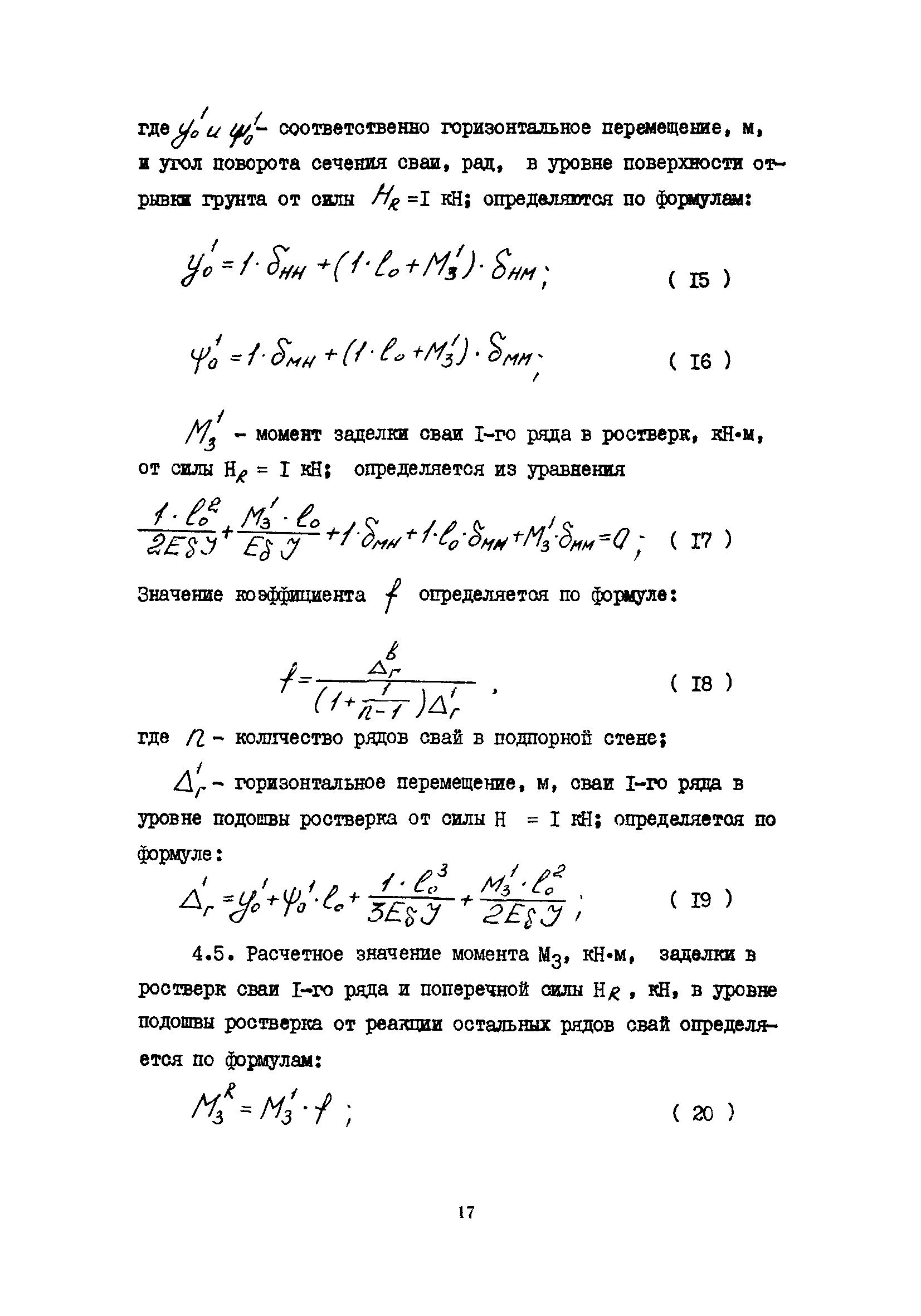 | Оглавление: | 1 Общие положения 2 Конструктивные требования 3 Общие положения расчета подпорных стен из буронабивных свай 4 Расчет подпорных стен из буронабивных свай на горизонтальные и моментные нагрузки 5 Определение коэффициента пропорциональности грунта по результатам статических испытаний свай на горизонтальную нагрузку 6 Расчет по прочности изгибаемых элементов круглого сечения, нормального к продольной оси Приложение 1. Пример расчета подпорных стен при однорядном расположении свай Приложение 2. Схема армирования свай подпорной стены при однорядном их расположении Приложение 3. Примеры расчета на прочность изгибаемых элементов круглого сечения с неравномерным расположением продольной арматуры в поперечном сечении Приложение 4. Графики изменения расчетных величин в зависимости от приведенной длины сваи Приложение 5. Графики изменения расчетных величин в зависимости от диаметра сваи Приложение 6. Пример расчета двухрядной подпорной стены из буронабивных свай Приложение 7. Графики изменения расчетных величин в зависимости от приведенной длины сваи Приложение 8. Графики изменения расчетных величин в зависимости от диаметра сваи Приложение 9. Графики изменения расчетных величин в зависимости от расстояния между рядами свай в осях Приложение 10. Пример статистической обработки результатов статических испытаний свай на горизонтальную нагрузку и определение коэффициента пропорциональности и допускаемого расчетного давления на грунт боковой поверхностью сваи |