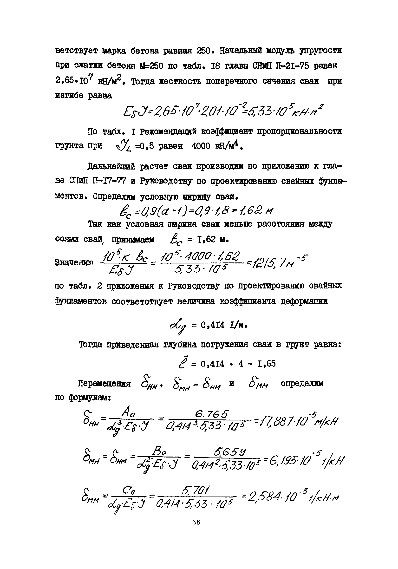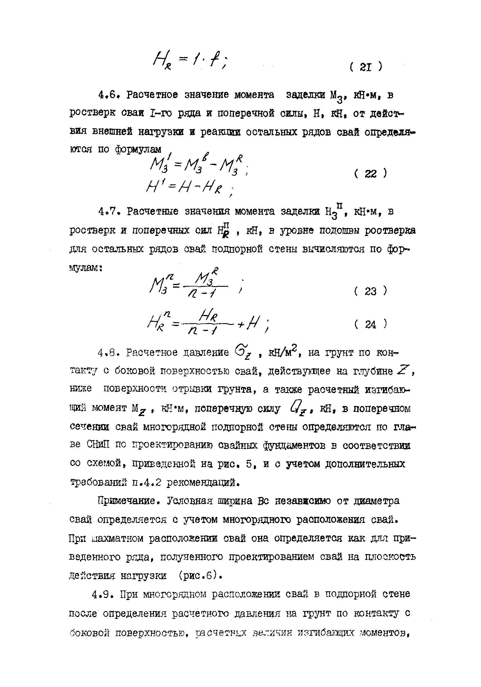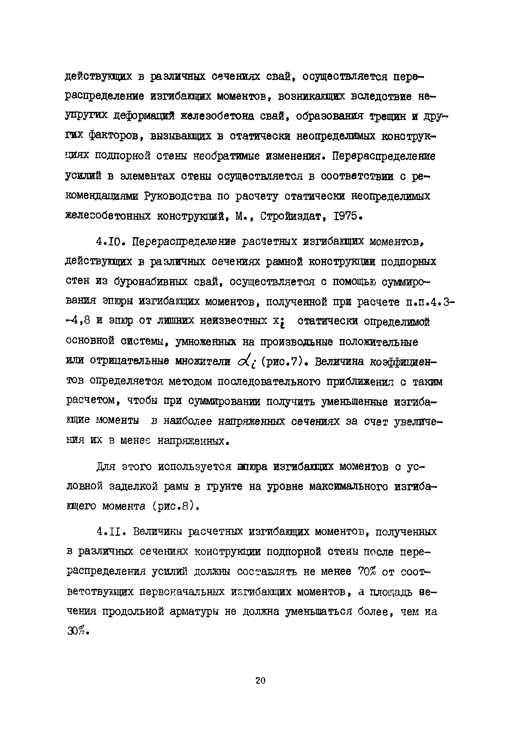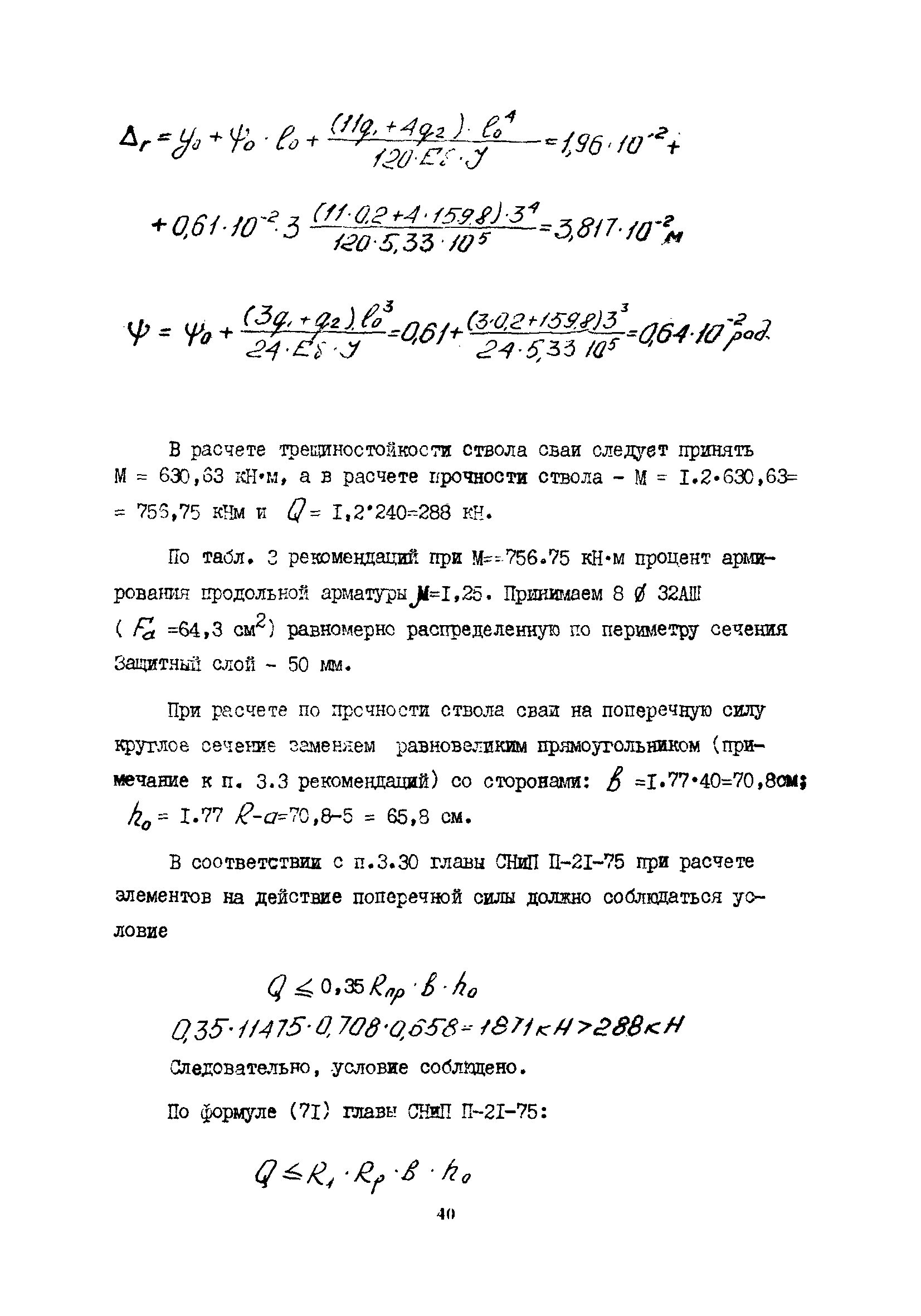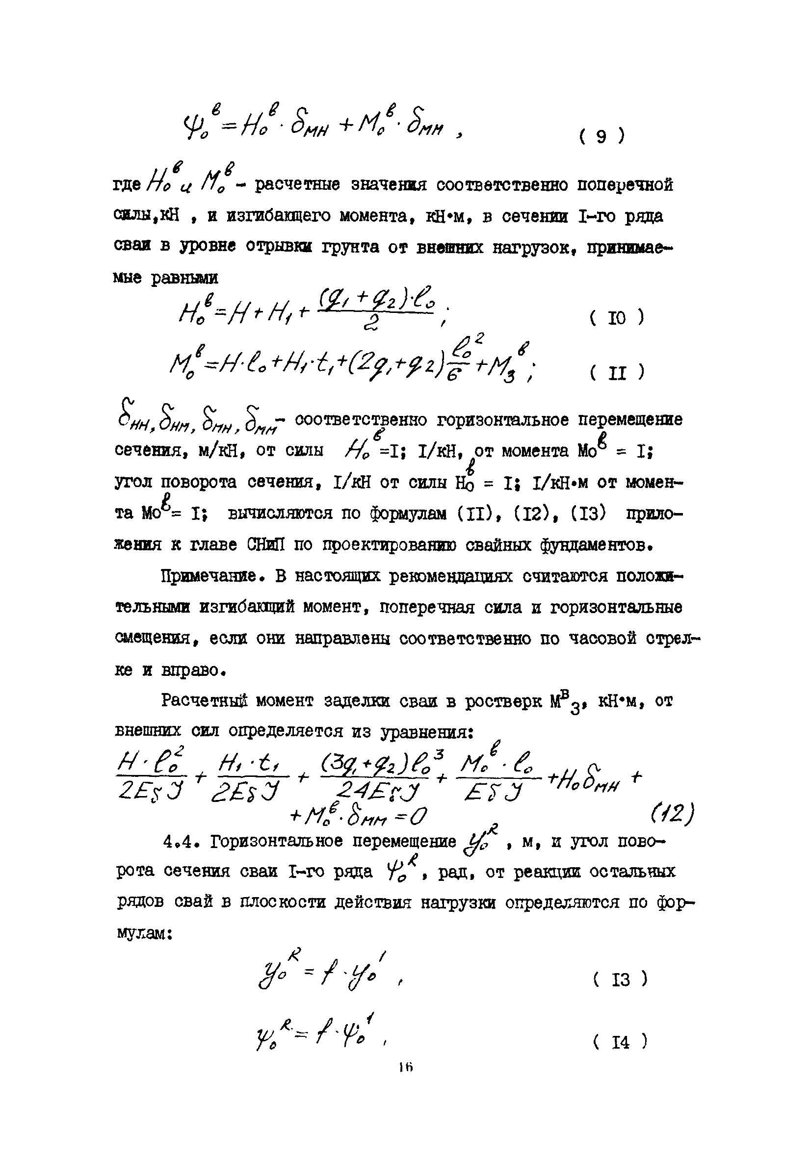 | Оглавление: | 1 Общие положения 2 Конструктивные требования 3 Общие положения расчета подпорных стен из буронабивных свай 4 Расчет подпорных стен из буронабивных свай на горизонтальные и моментные нагрузки 5 Определение коэффициента пропорциональности грунта по результатам статических испытаний свай на горизонтальную нагрузку 6 Расчет по прочности изгибаемых элементов круглого сечения, нормального к продольной оси Приложение 1. Пример расчета подпорных стен при однорядном расположении свай Приложение 2. Схема армирования свай подпорной стены при однорядном их расположении Приложение 3. Примеры расчета на прочность изгибаемых элементов круглого сечения с неравномерным расположением продольной арматуры в поперечном сечении Приложение 4. Графики изменения расчетных величин в зависимости от приведенной длины сваи Приложение 5. Графики изменения расчетных величин в зависимости от диаметра сваи Приложение 6. Пример расчета двухрядной подпорной стены из буронабивных свай Приложение 7. Графики изменения расчетных величин в зависимости от приведенной длины сваи Приложение 8. Графики изменения расчетных величин в зависимости от диаметра сваи Приложение 9. Графики изменения расчетных величин в зависимости от расстояния между рядами свай в осях Приложение 10. Пример статистической обработки результатов статических испытаний свай на горизонтальную нагрузку и определение коэффициента пропорциональности и допускаемого расчетного давления на грунт боковой поверхностью сваи |
