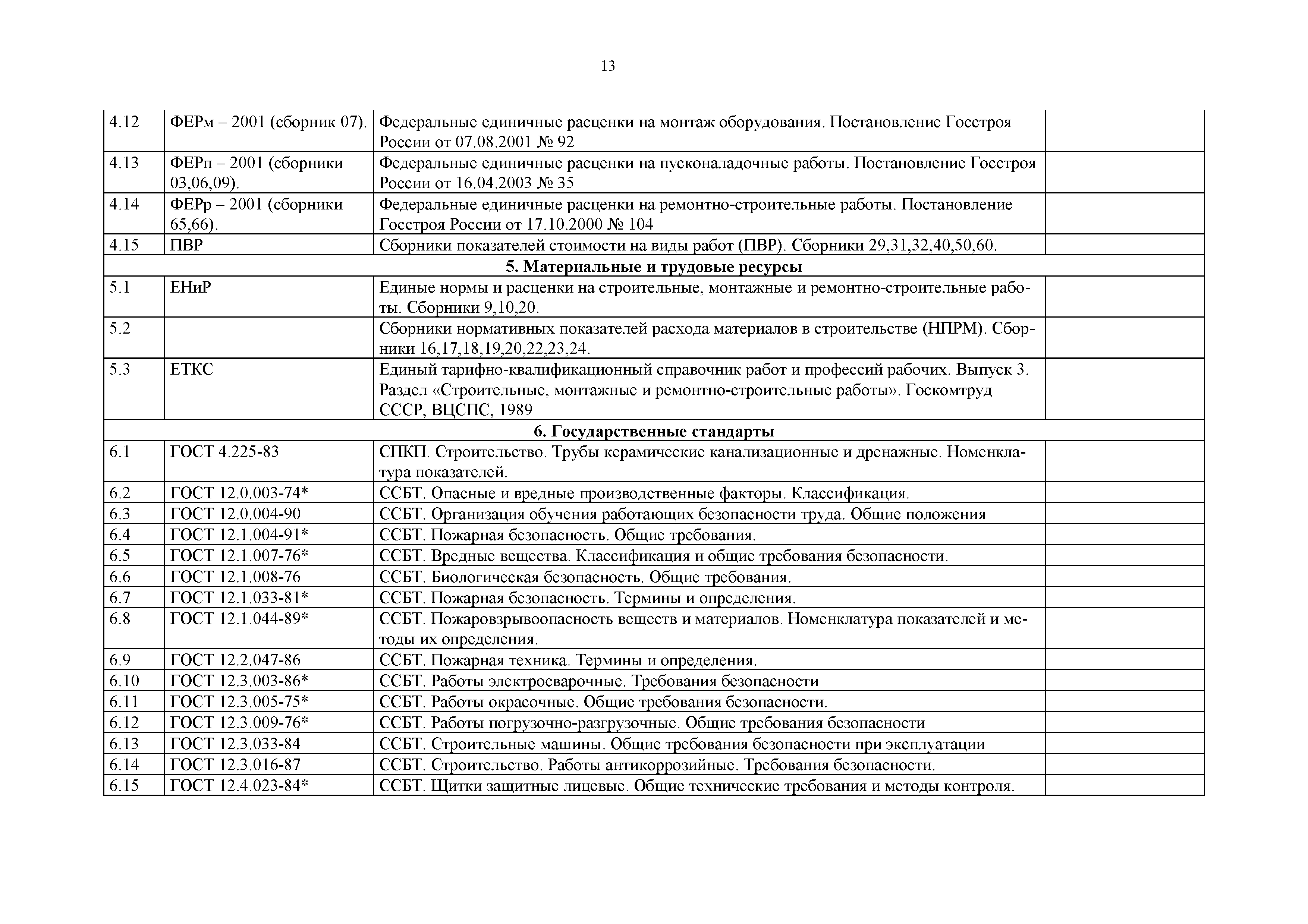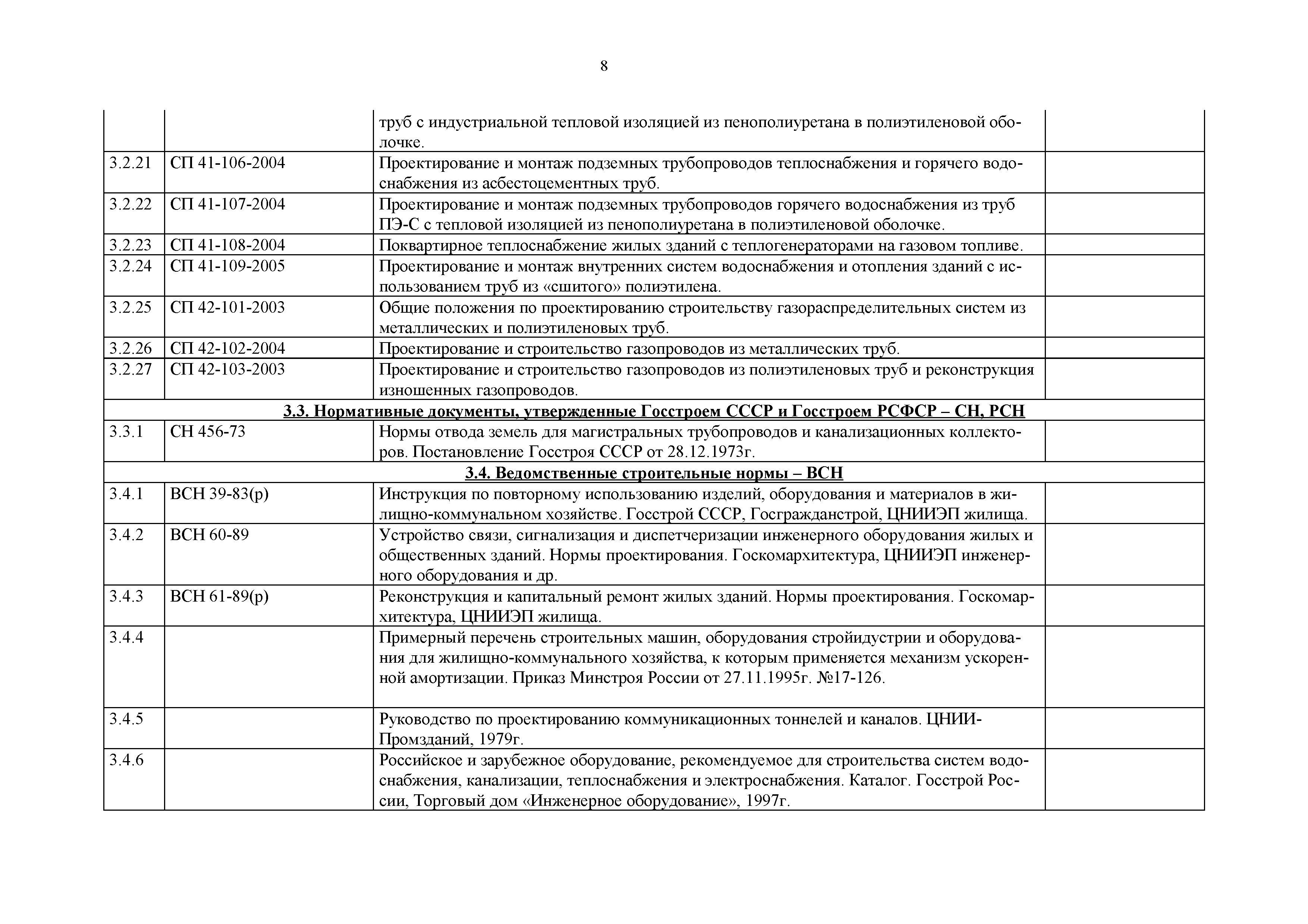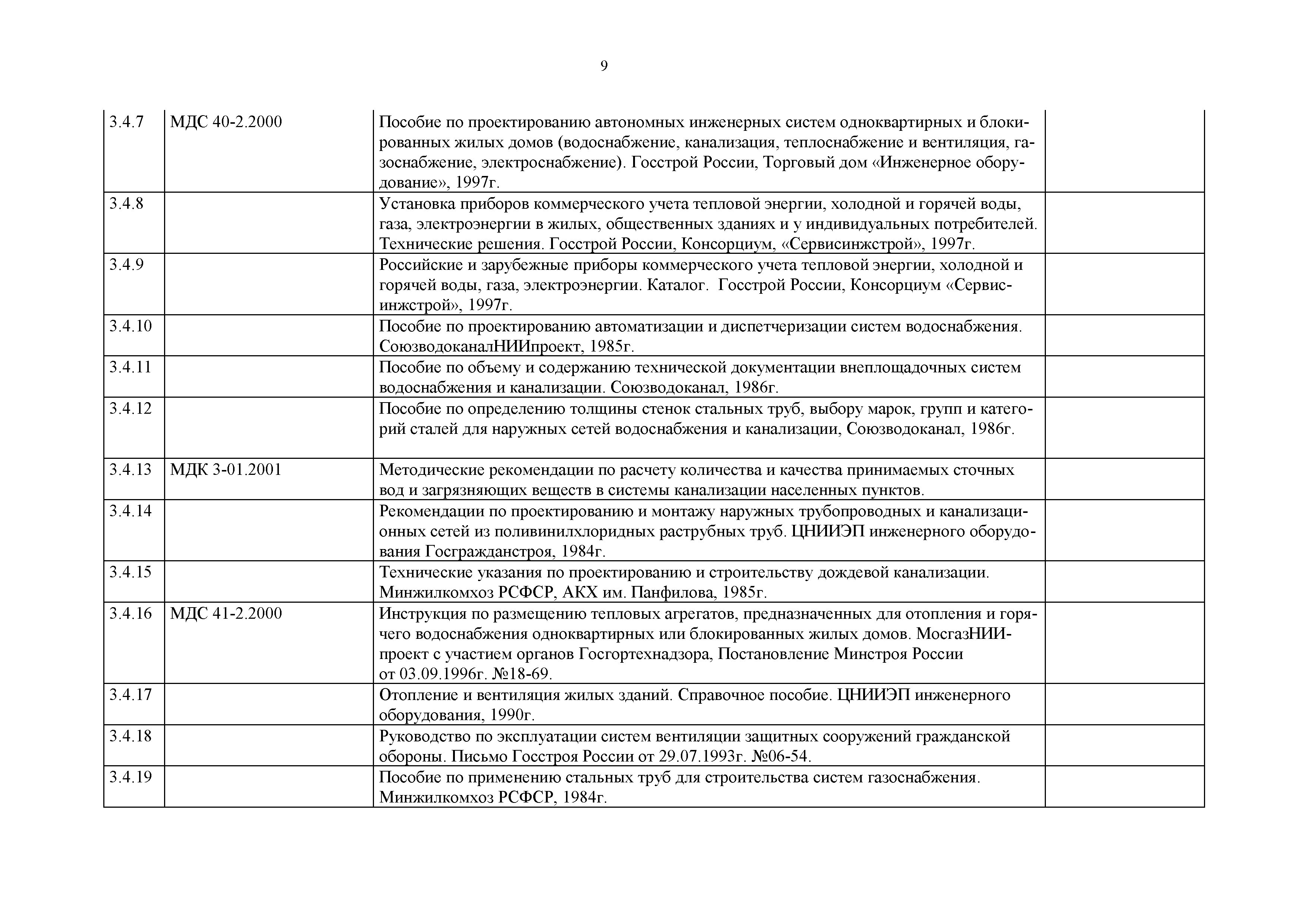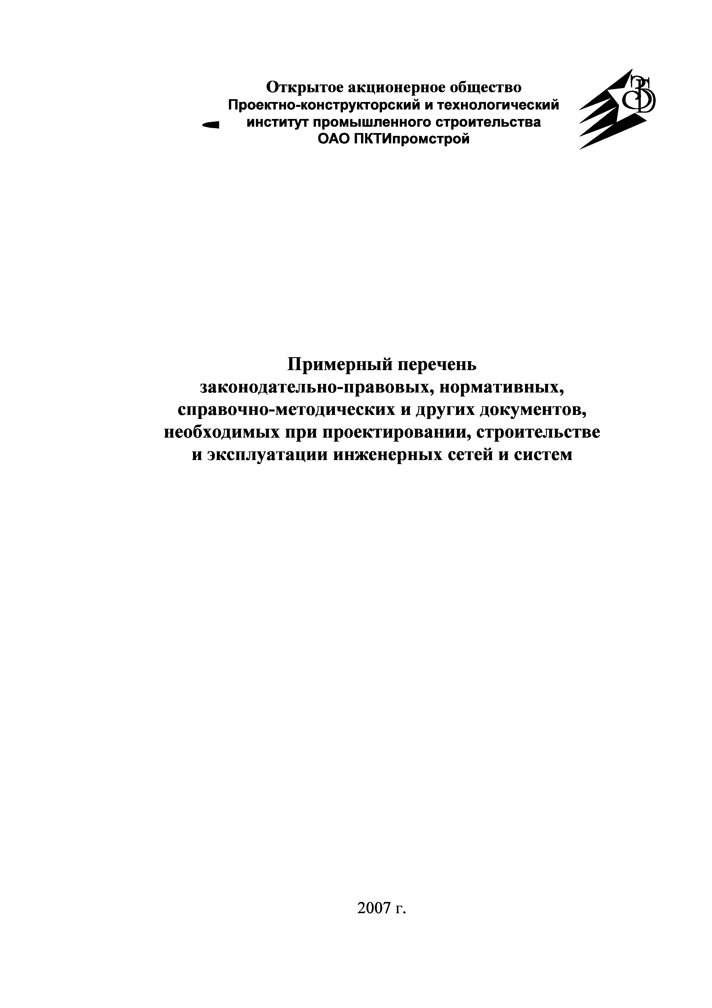 Примерный перечень законодательно-правовых, нормативных, справочно-методических и других документов, необходимых при проектировании, строительстве и эксплуатации инженерных сетей и систем| Статус: | действует | | Название рус.: | Примерный перечень законодательно-правовых, нормативных, справочно-методических и других документов, необходимых при проектировании, строительстве и эксплуатации инженерных сетей и систем | | Дата добавления в базу: | 01.09.2013 | | Дата актуализации: | 01.01.2021 | | Оглавление: | Общая часть 1. Законодательные, правовые акты РФ, регулирующие строительную деятельность 1.1 Законы Российской Федерации 1.2 Указы Президента Российской Федерации 1.3 Постановления Правительства Российской Федерации 2. Документы министерств и ведомств РФ, регулирующие строительную деятельность 2.1 Документы Госстроя России 2.2 Документы Минтопэнерго России 2.3 Документы Минздрава России 3. Нормативные и рекомендательные документы по вопросам строительства 3.1 Строительные нормы и правила - СНиП 3.2 Своды правил по проектированию и строительству - СП 3.3 Нормативные документы, утвержденные Госстроем СССР и Госстроем РСФСР -СН, РСН 3.4 Ведомственные строительные нормы - ВСН 3.5 Документы жилищно-коммунального комплекса 3.6 Документы Госгортехнадзора России 3.7 Документы Минтруда России 4. Сметы. Ценообразование. Экономика 5. Материальные и трудовые ресурсы 6. Государственные стандарты 7. Документы правительства Москвы и мэрии | | Разработан: | ОАО ПКТИпромстрой