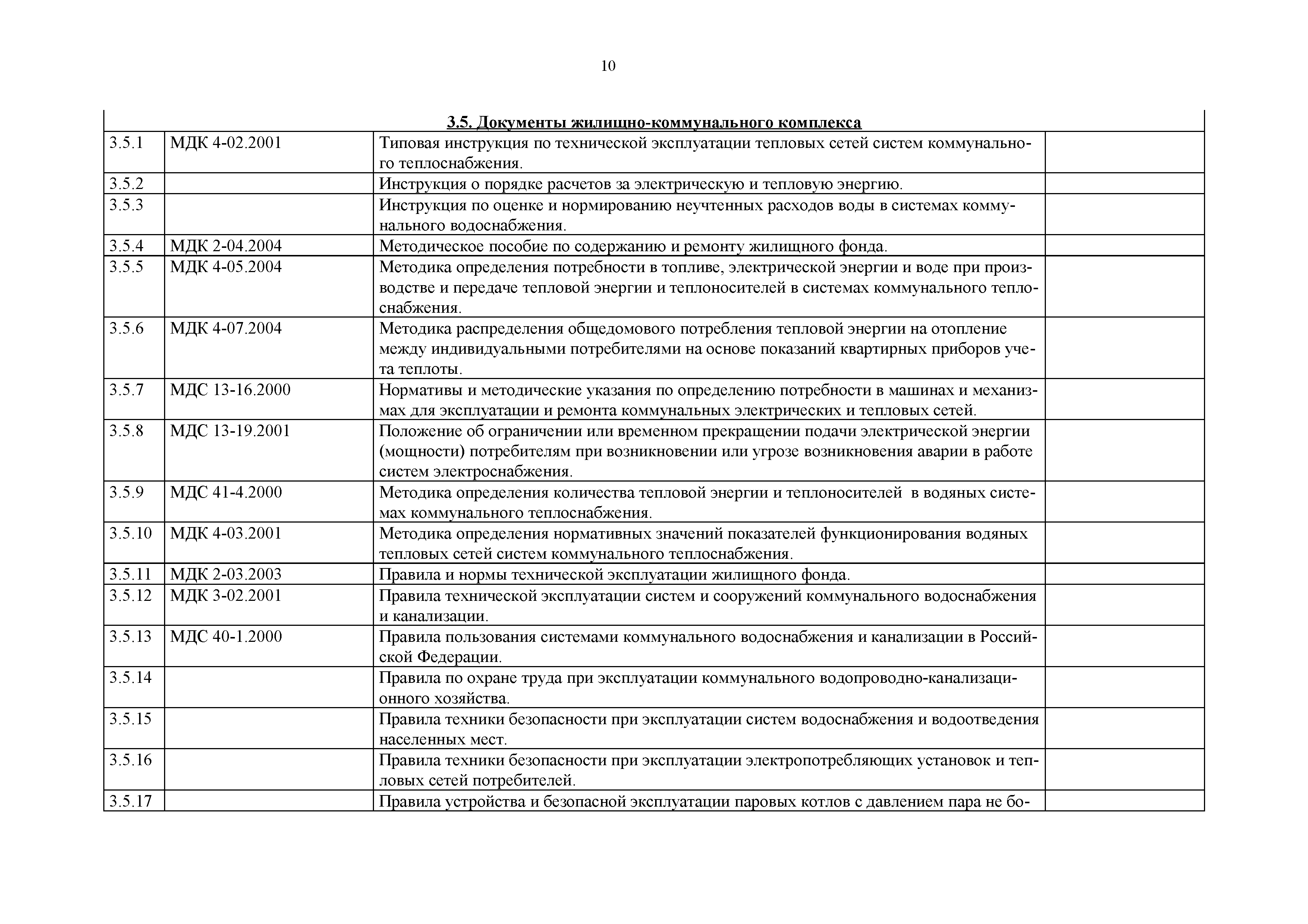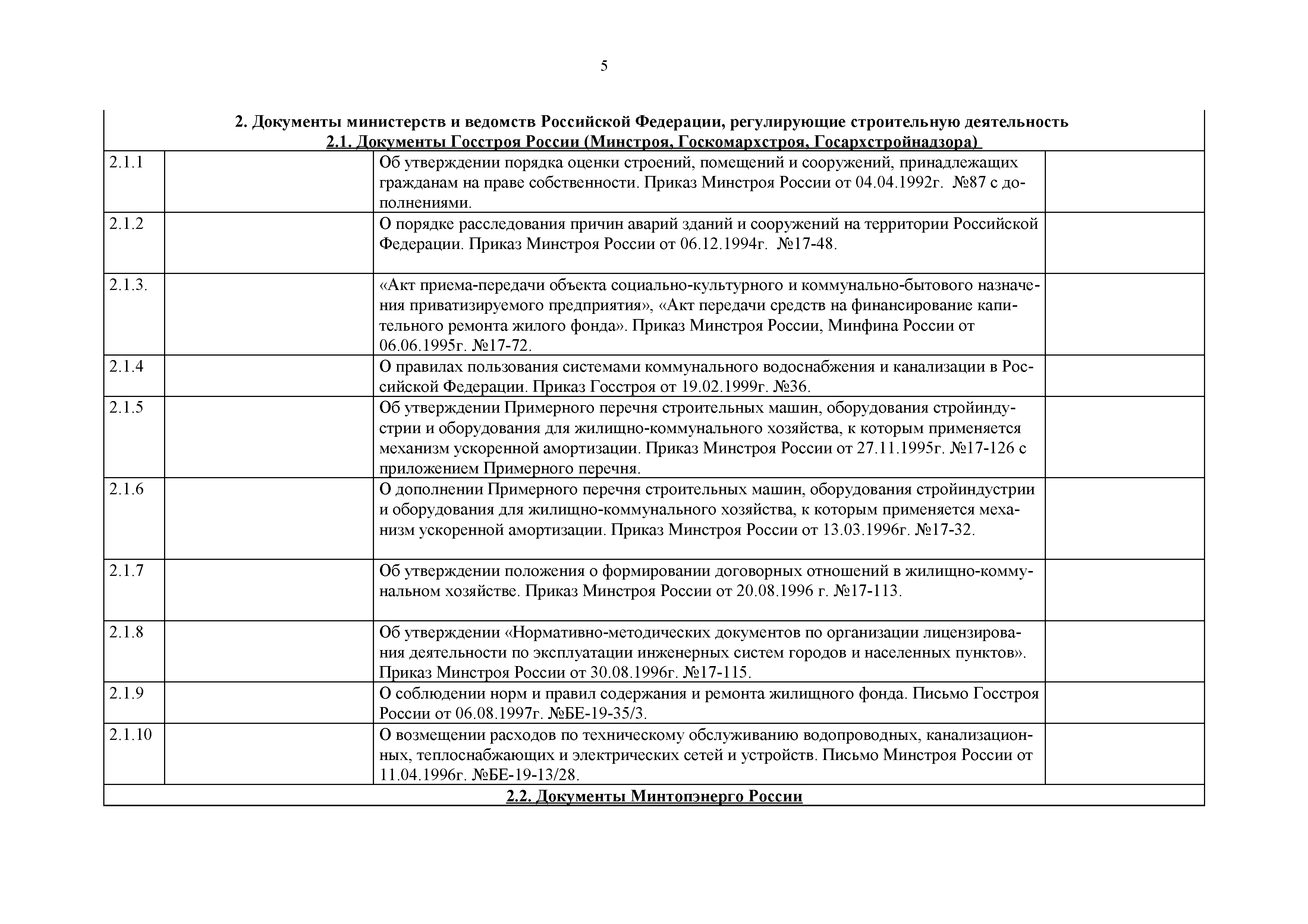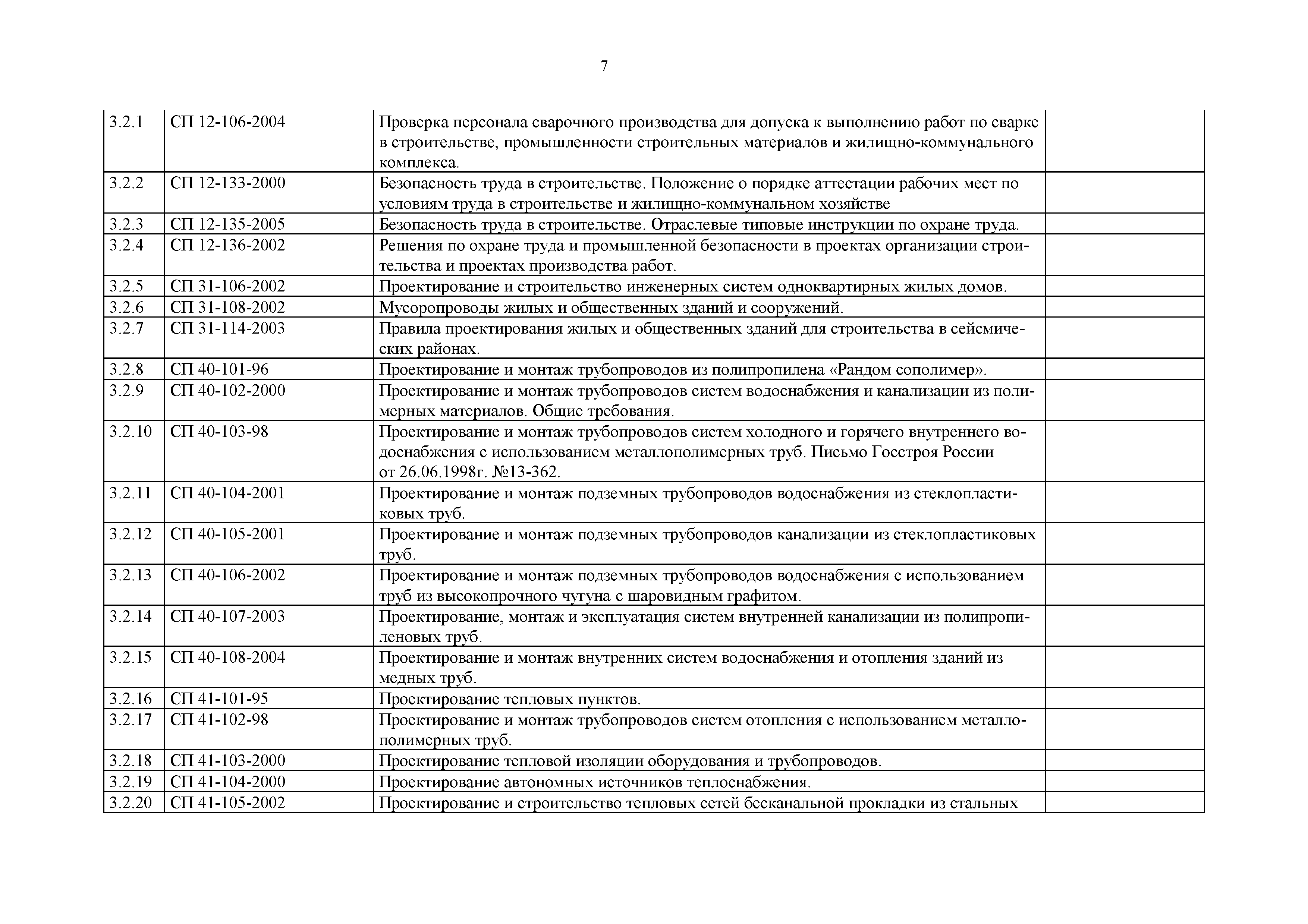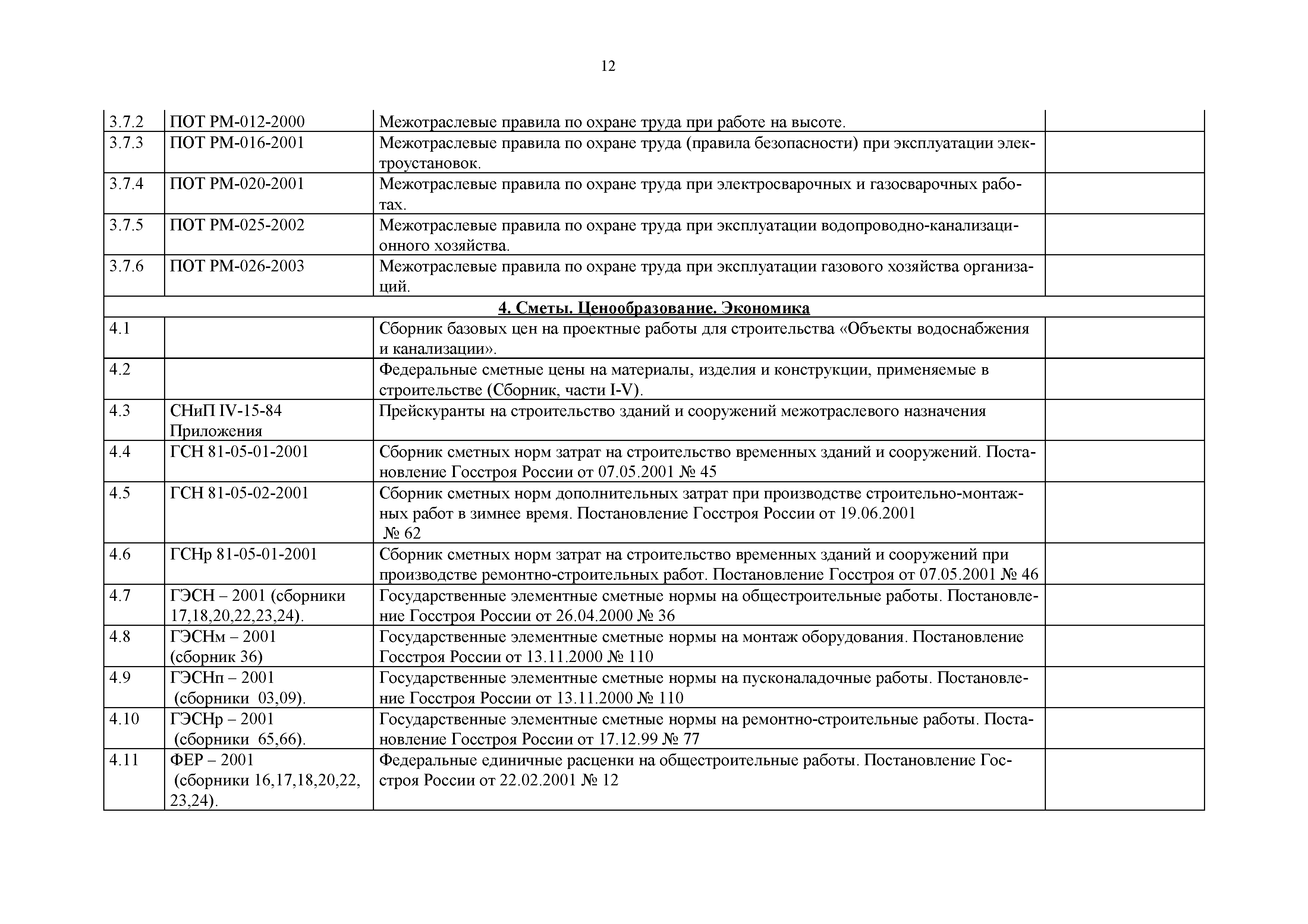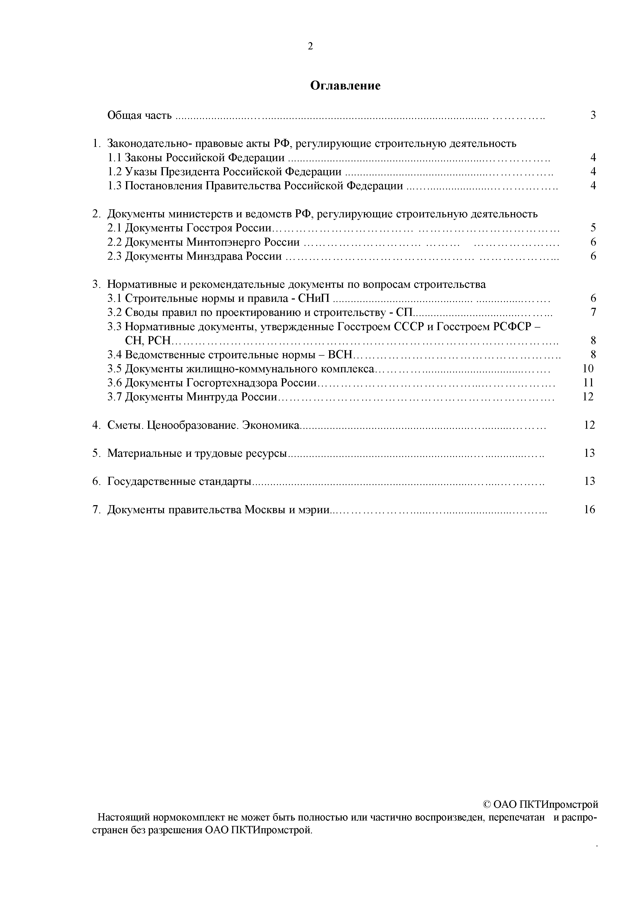 Примерный перечень законодательно-правовых, нормативных, справочно-методических и других документов, необходимых при проектировании, строительстве и эксплуатации инженерных сетей и систем| Статус: | действует | | Название рус.: | Примерный перечень законодательно-правовых, нормативных, справочно-методических и других документов, необходимых при проектировании, строительстве и эксплуатации инженерных сетей и систем | | Дата добавления в базу: | 01.09.2013 | | Дата актуализации: | 01.01.2021 | | Оглавление: | Общая часть 1. Законодательные, правовые акты РФ, регулирующие строительную деятельность 1.1 Законы Российской Федерации 1.2 Указы Президента Российской Федерации 1.3 Постановления Правительства Российской Федерации 2. Документы министерств и ведомств РФ, регулирующие строительную деятельность 2.1 Документы Госстроя России 2.2 Документы Минтопэнерго России 2.3 Документы Минздрава России 3. Нормативные и рекомендательные документы по вопросам строительства 3.1 Строительные нормы и правила - СНиП 3.2 Своды правил по проектированию и строительству - СП 3.3 Нормативные документы, утвержденные Госстроем СССР и Госстроем РСФСР -СН, РСН 3.4 Ведомственные строительные нормы - ВСН 3.5 Документы жилищно-коммунального комплекса 3.6 Документы Госгортехнадзора России 3.7 Документы Минтруда России 4. Сметы. Ценообразование. Экономика 5. Материальные и трудовые ресурсы 6. Государственные стандарты 7. Документы правительства Москвы и мэрии | | Разработан: | ОАО ПКТИпромстрой