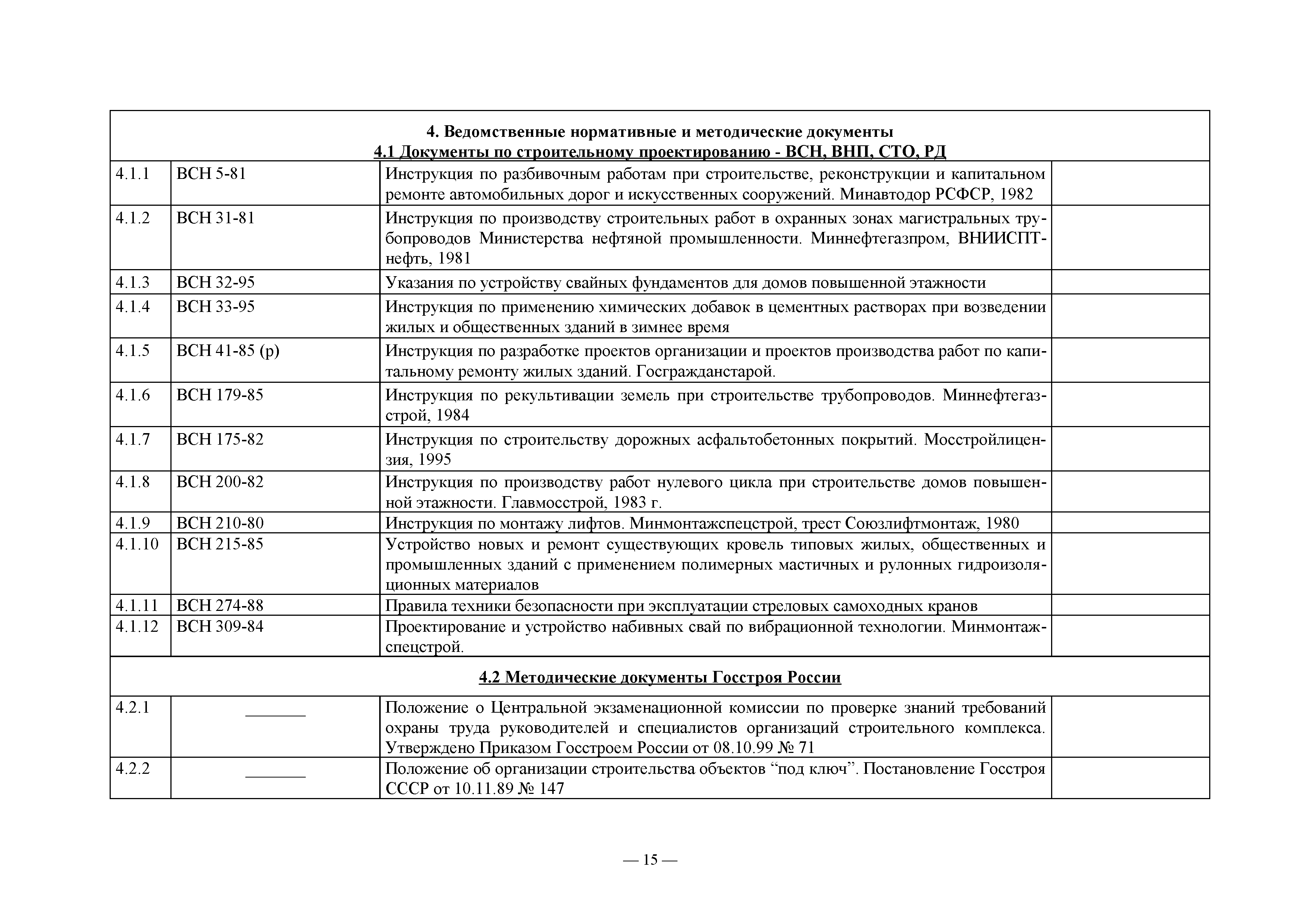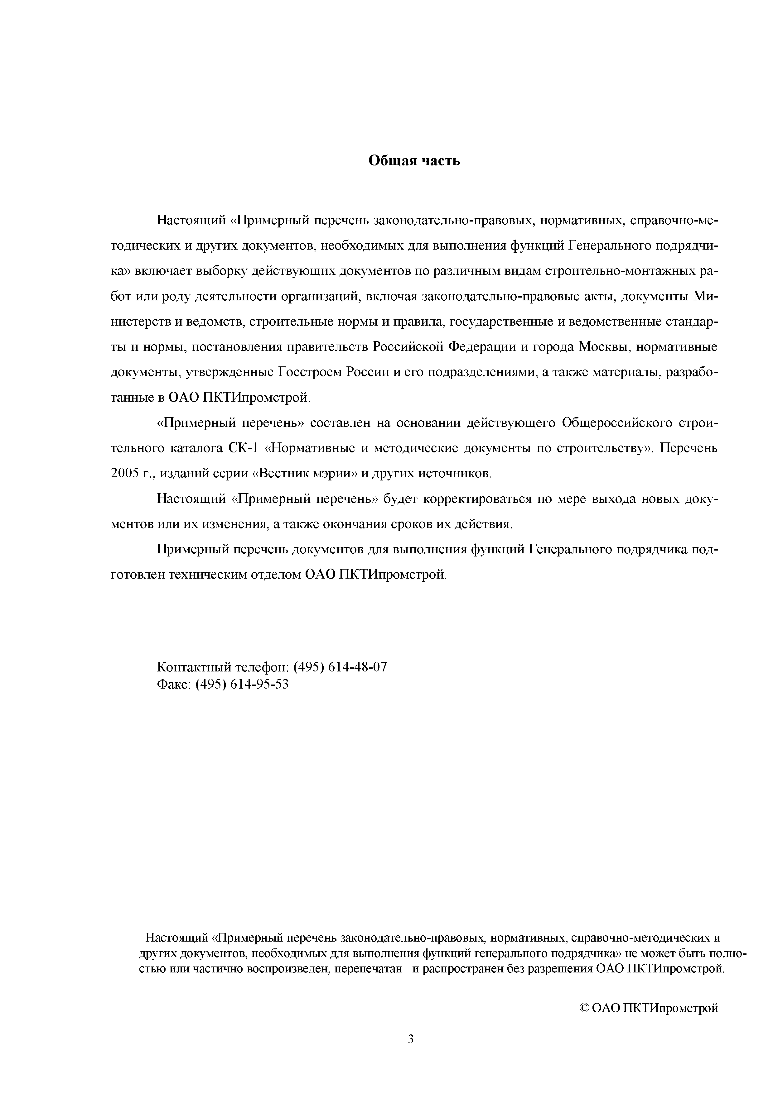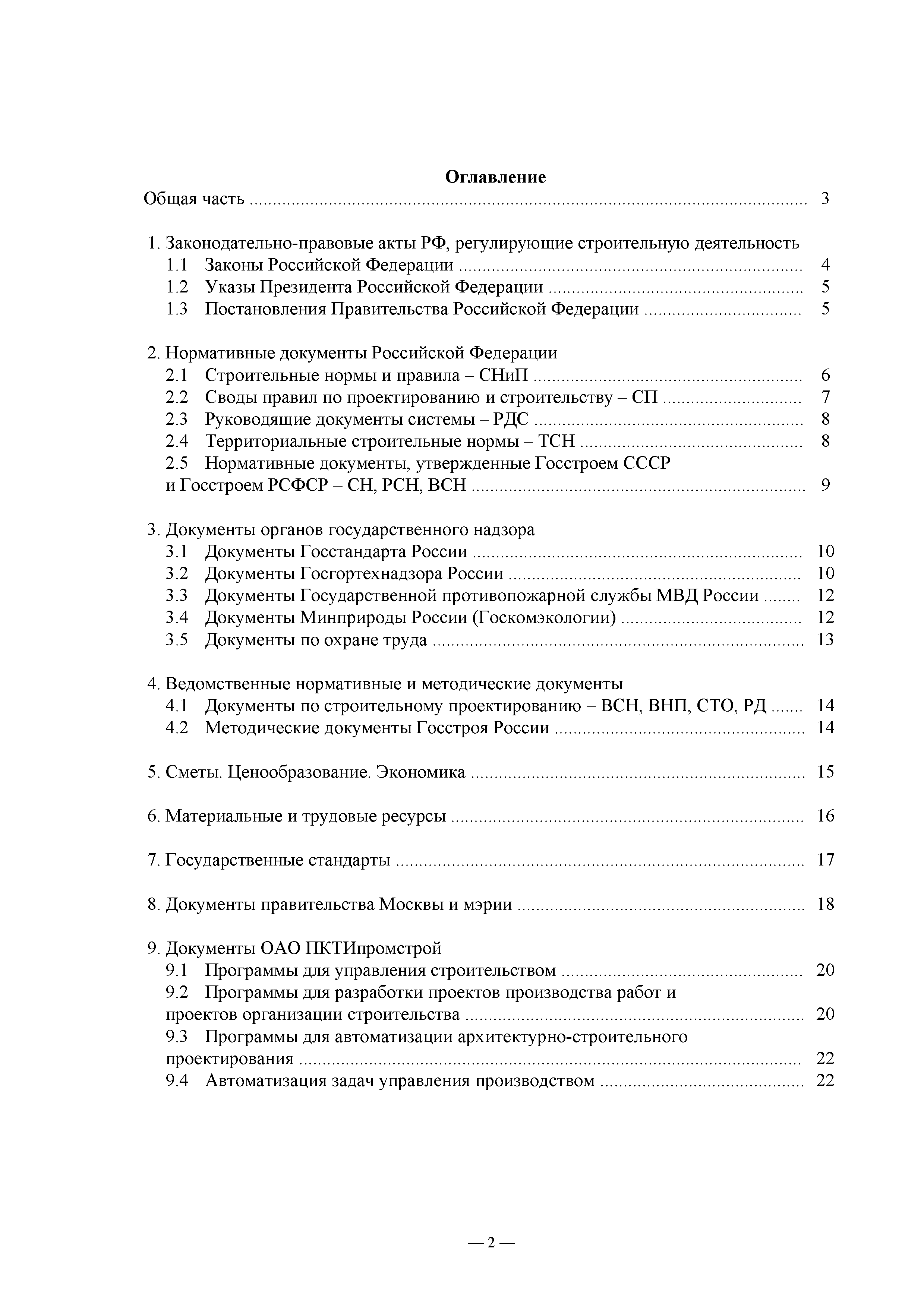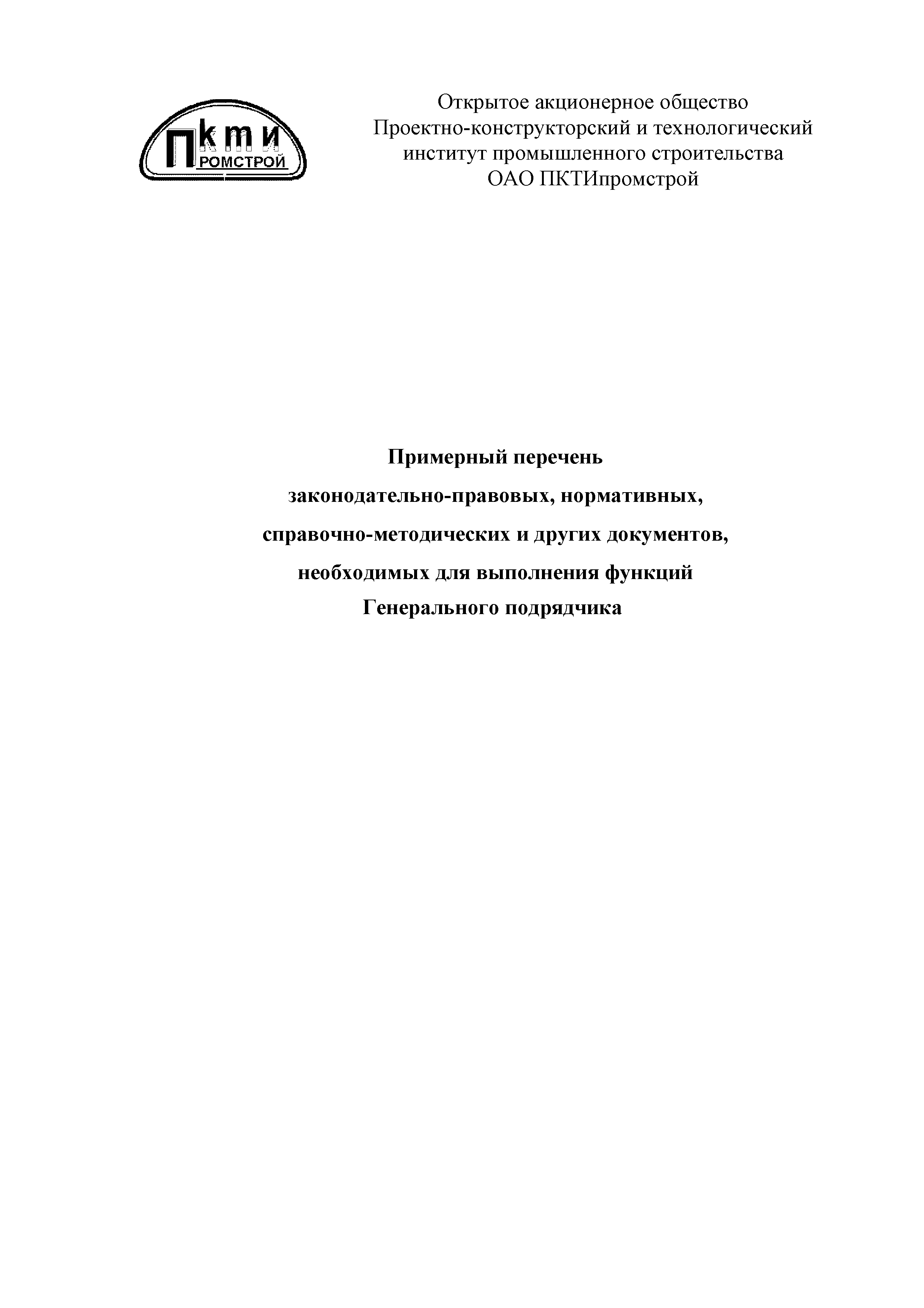 Примерный перечень законодательно-правовых, нормативных, справочно-методических и других документов, необходимых для выполнения функций Генерального подрядчика| Статус: | действует | | Название рус.: | Примерный перечень законодательно-правовых, нормативных, справочно-методических и других документов, необходимых для выполнения функций Генерального подрядчика | | Дата добавления в базу: | 01.09.2013 | | Дата актуализации: | 01.01.2021 | | Оглавление: | Общая часть 1. Законодательные, правовые акты РФ, регулирующие строительную деятельность 1.1 Законы Российской Федерации 1.2 Указы Президента Российской Федерации 1.3 Постановления Правительства Российской Федерации 2. Нормативные документы Российской Федерации 2.1 Строительные нормы и правила - СНиП 2.2 Своды правил по проектированию и строительству - СП 2.3 Руководящие документы системы - РДС 2.4 Территориальные строительные нормы - ТСН 2.5 Документы, утвержденные Госстроем СССР и Госстроем РСФСР -СН, РСН, ВСН 3. Документы органов государственного надзора 3.1 Документы Госстандарта России 3.2 Документы Госгортехнадзора России 3.3 Документы Государственной противопожарной службы 3.4 Документы Минприроды России (Госкомэкологии) 3.5 Документы по охране труда 4. Ведомственные нормативные и методические документы 4.1 Документы по строительному проектированию - ВСН, ВНП, СТО, РД 4.2 Методические документы Госстроя России 5. Сметы. Ценообразование. Экономика 6. Материальные и трудовые ресурсы 7. Государственные стандарты 8. Документы Правительства Москвы и мэрии 9. Документы ОАО ПКТИпромстрой 9.1 Программы для управления строительством 9.2 Программы для разработки проектов производства работ и проектов организаций строительства 9.3 Программы для автоматизации архитектурно-строительного проектирования 9.4 Автоматизация задач управления производством | | Разработан: | ОАО ПКТИпромстрой