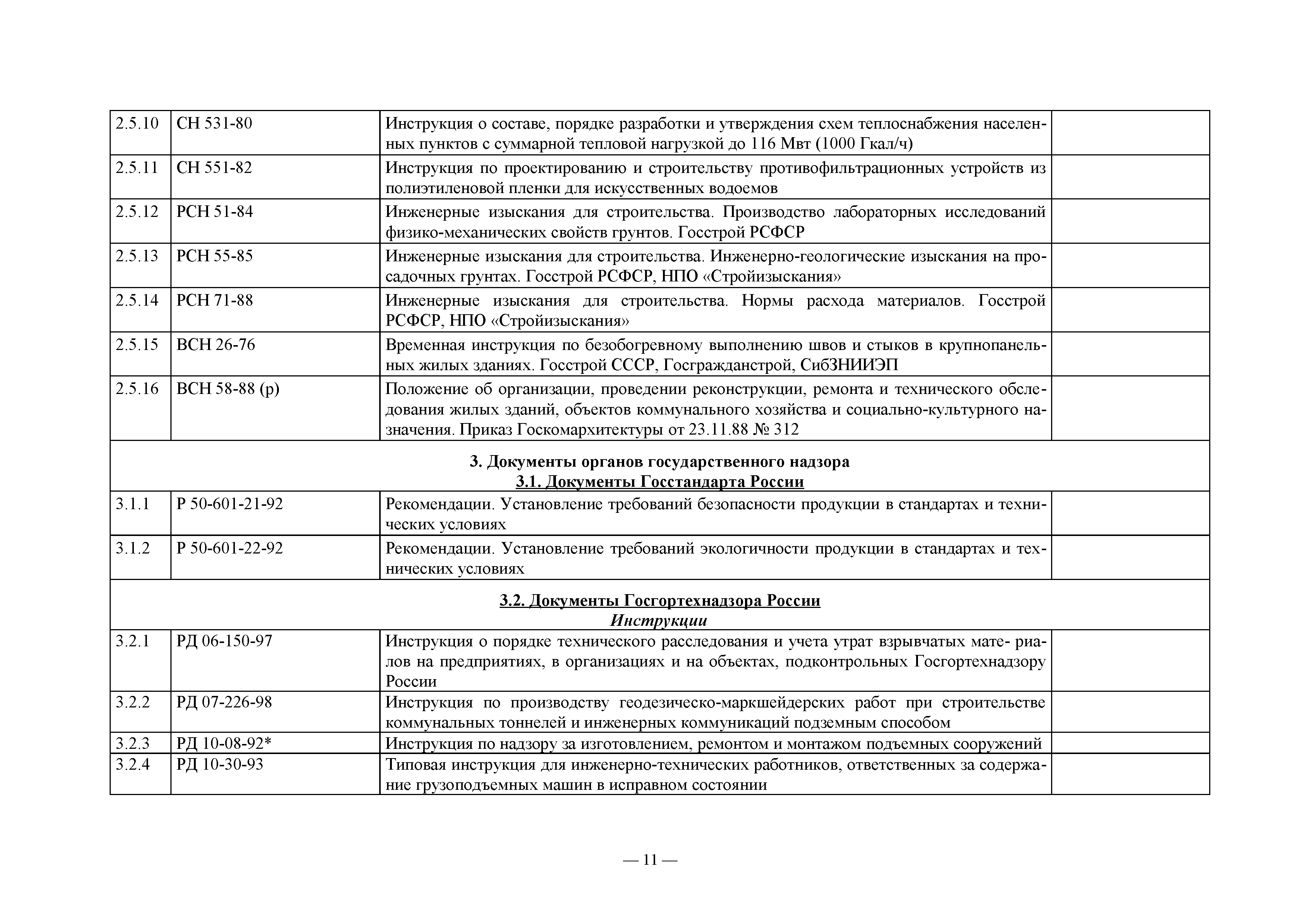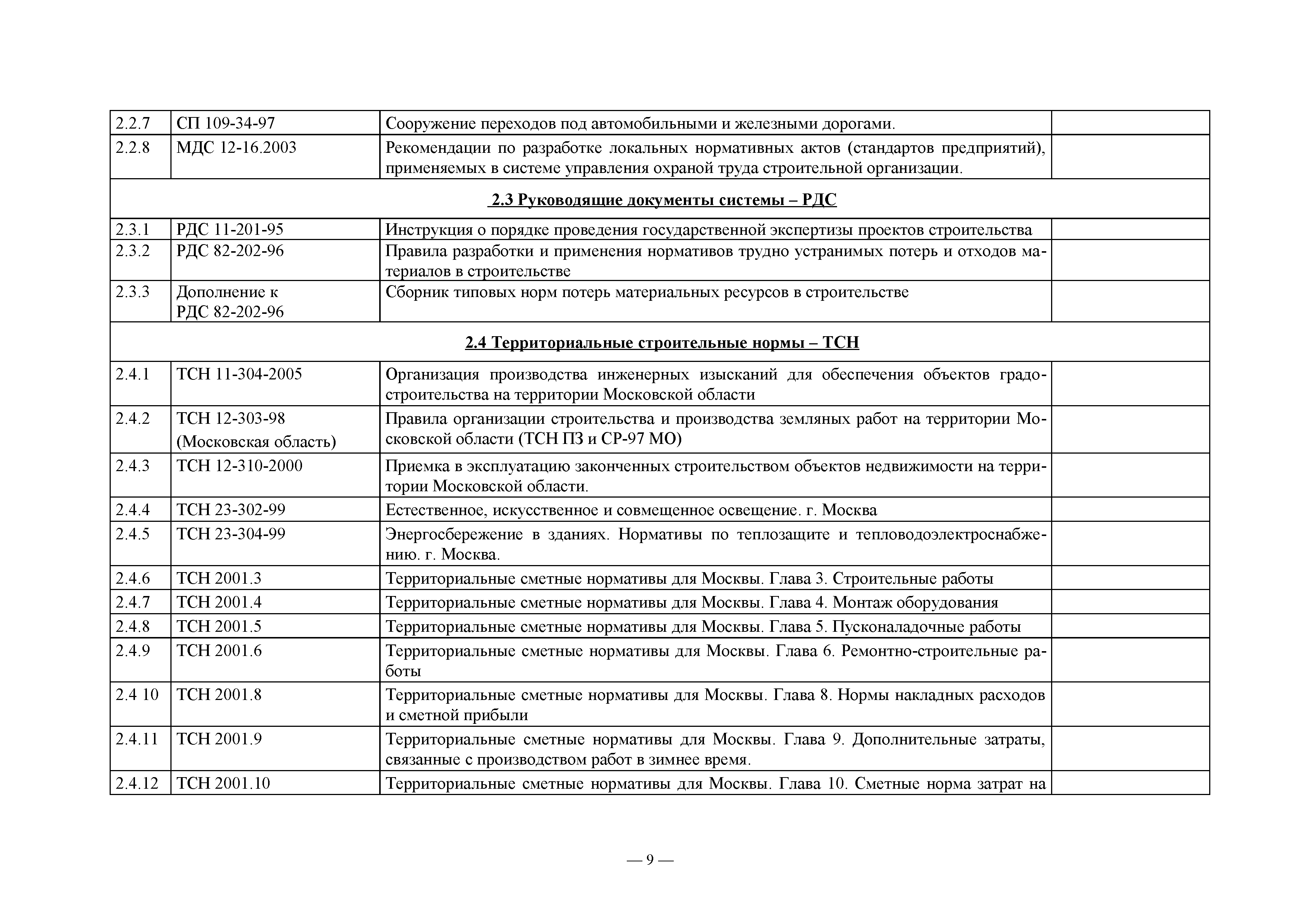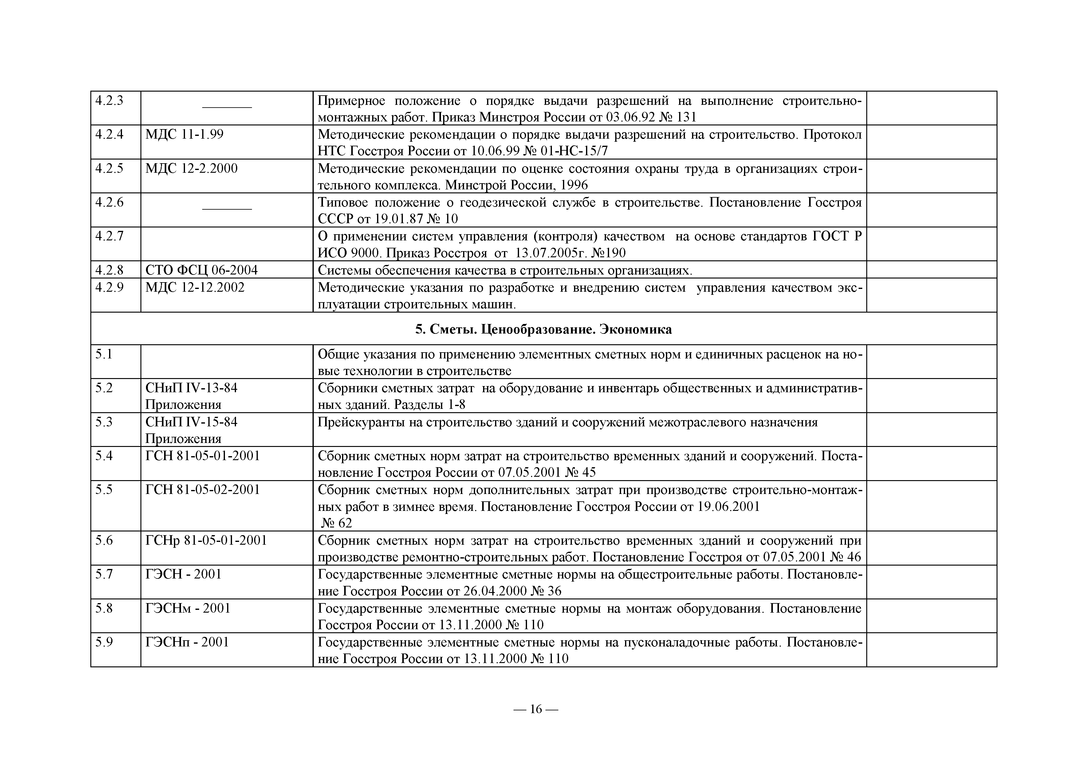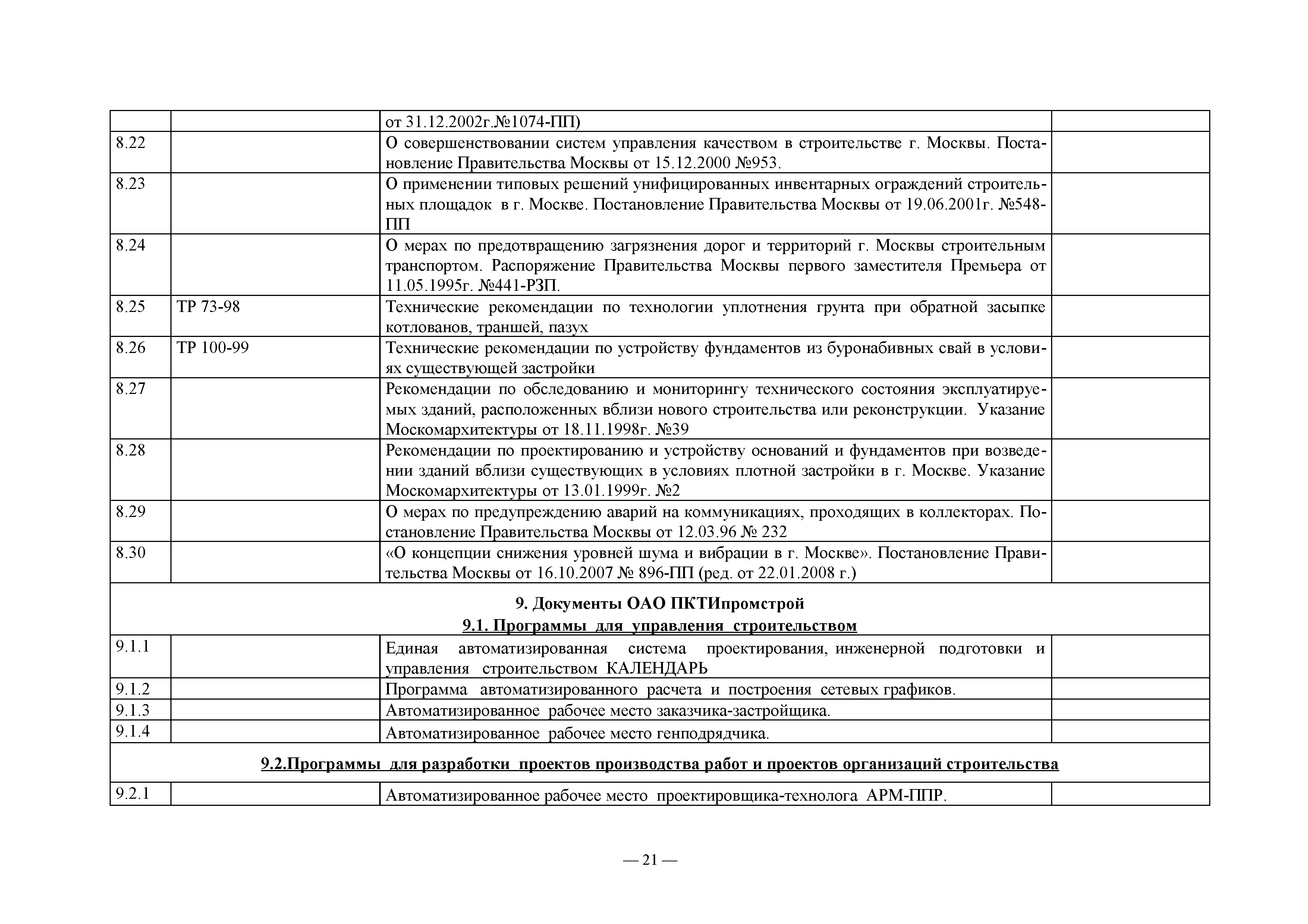 Примерный перечень законодательно-правовых, нормативных, справочно-методических и других документов, необходимых для выполнения функций Генерального подрядчика| Статус: | действует | | Название рус.: | Примерный перечень законодательно-правовых, нормативных, справочно-методических и других документов, необходимых для выполнения функций Генерального подрядчика | | Дата добавления в базу: | 01.09.2013 | | Дата актуализации: | 01.01.2021 | | Оглавление: | Общая часть 1. Законодательные, правовые акты РФ, регулирующие строительную деятельность 1.1 Законы Российской Федерации 1.2 Указы Президента Российской Федерации 1.3 Постановления Правительства Российской Федерации 2. Нормативные документы Российской Федерации 2.1 Строительные нормы и правила - СНиП 2.2 Своды правил по проектированию и строительству - СП 2.3 Руководящие документы системы - РДС 2.4 Территориальные строительные нормы - ТСН 2.5 Документы, утвержденные Госстроем СССР и Госстроем РСФСР -СН, РСН, ВСН 3. Документы органов государственного надзора 3.1 Документы Госстандарта России 3.2 Документы Госгортехнадзора России 3.3 Документы Государственной противопожарной службы 3.4 Документы Минприроды России (Госкомэкологии) 3.5 Документы по охране труда 4. Ведомственные нормативные и методические документы 4.1 Документы по строительному проектированию - ВСН, ВНП, СТО, РД 4.2 Методические документы Госстроя России 5. Сметы. Ценообразование. Экономика 6. Материальные и трудовые ресурсы 7. Государственные стандарты 8. Документы Правительства Москвы и мэрии 9. Документы ОАО ПКТИпромстрой 9.1 Программы для управления строительством 9.2 Программы для разработки проектов производства работ и проектов организаций строительства 9.3 Программы для автоматизации архитектурно-строительного проектирования 9.4 Автоматизация задач управления производством | | Разработан: | ОАО ПКТИпромстрой