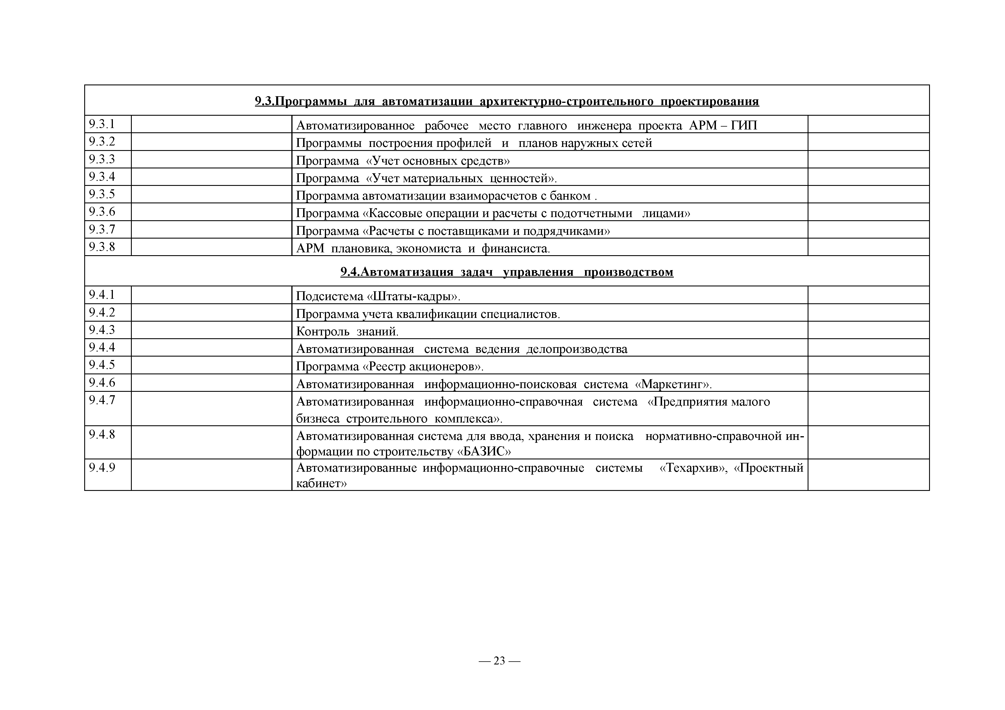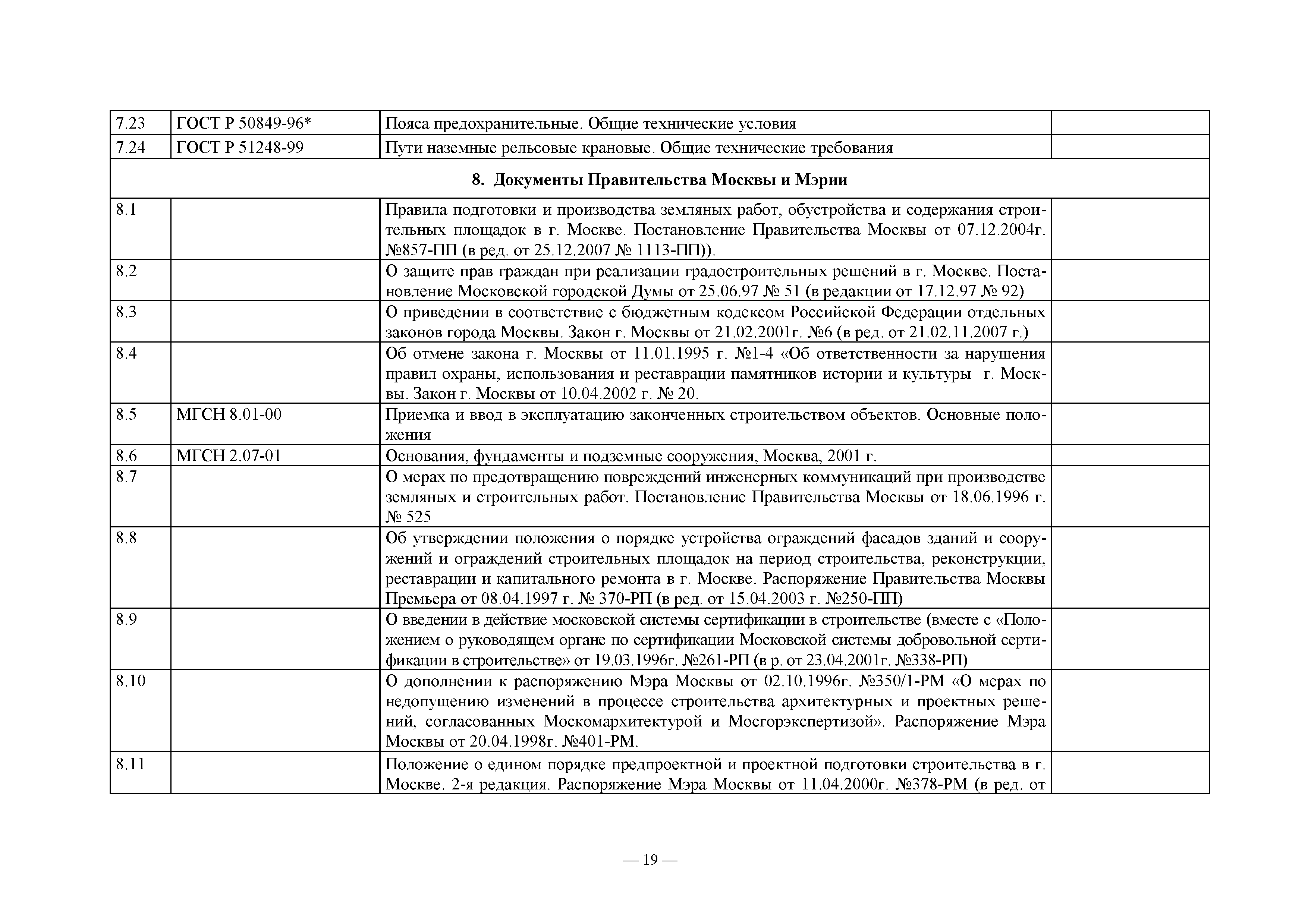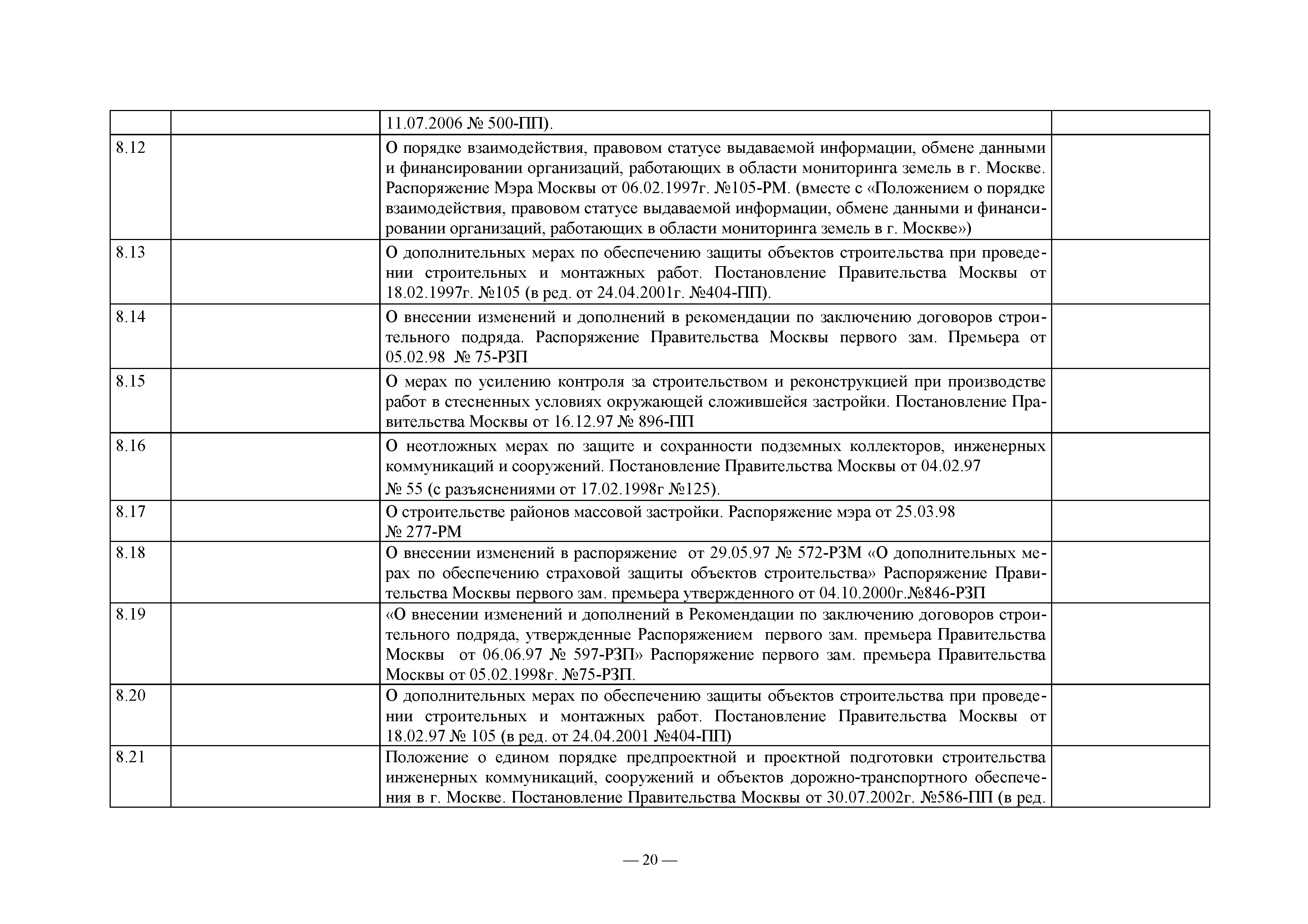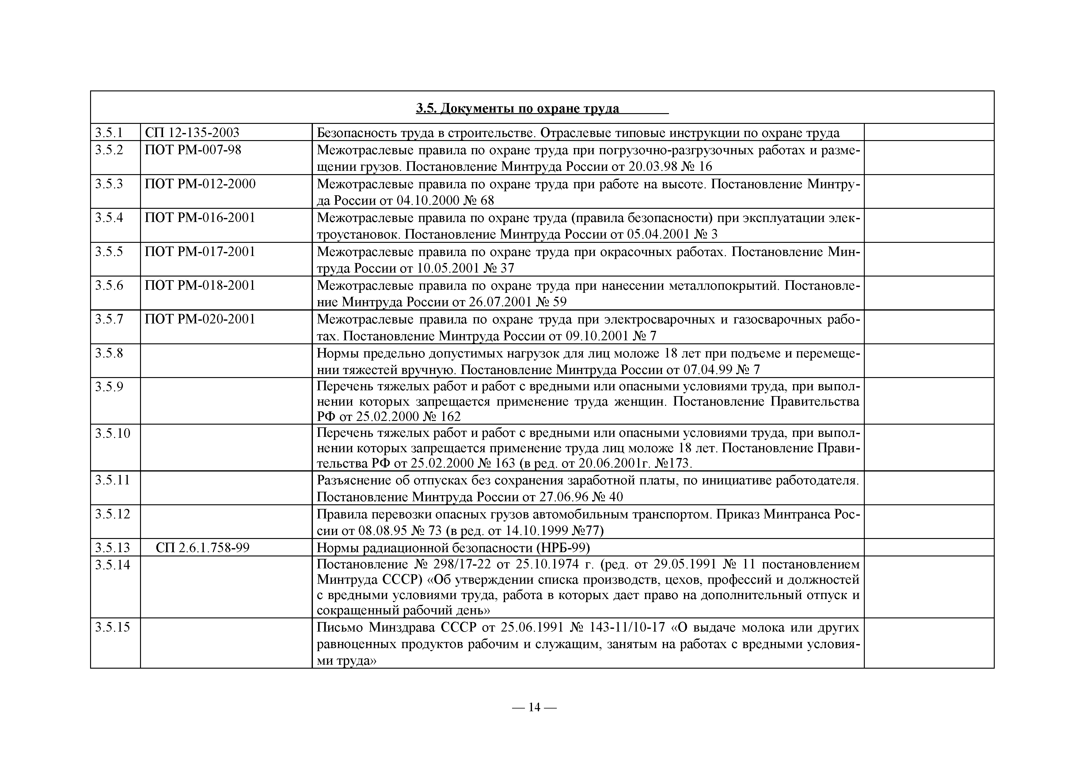 Примерный перечень законодательно-правовых, нормативных, справочно-методических и других документов, необходимых для выполнения функций Генерального подрядчика| Статус: | действует | | Название рус.: | Примерный перечень законодательно-правовых, нормативных, справочно-методических и других документов, необходимых для выполнения функций Генерального подрядчика | | Дата добавления в базу: | 01.09.2013 | | Дата актуализации: | 01.01.2021 | | Оглавление: | Общая часть 1. Законодательные, правовые акты РФ, регулирующие строительную деятельность 1.1 Законы Российской Федерации 1.2 Указы Президента Российской Федерации 1.3 Постановления Правительства Российской Федерации 2. Нормативные документы Российской Федерации 2.1 Строительные нормы и правила - СНиП 2.2 Своды правил по проектированию и строительству - СП 2.3 Руководящие документы системы - РДС 2.4 Территориальные строительные нормы - ТСН 2.5 Документы, утвержденные Госстроем СССР и Госстроем РСФСР -СН, РСН, ВСН 3. Документы органов государственного надзора 3.1 Документы Госстандарта России 3.2 Документы Госгортехнадзора России 3.3 Документы Государственной противопожарной службы 3.4 Документы Минприроды России (Госкомэкологии) 3.5 Документы по охране труда 4. Ведомственные нормативные и методические документы 4.1 Документы по строительному проектированию - ВСН, ВНП, СТО, РД 4.2 Методические документы Госстроя России 5. Сметы. Ценообразование. Экономика 6. Материальные и трудовые ресурсы 7. Государственные стандарты 8. Документы Правительства Москвы и мэрии 9. Документы ОАО ПКТИпромстрой 9.1 Программы для управления строительством 9.2 Программы для разработки проектов производства работ и проектов организаций строительства 9.3 Программы для автоматизации архитектурно-строительного проектирования 9.4 Автоматизация задач управления производством | | Разработан: | ОАО ПКТИпромстрой