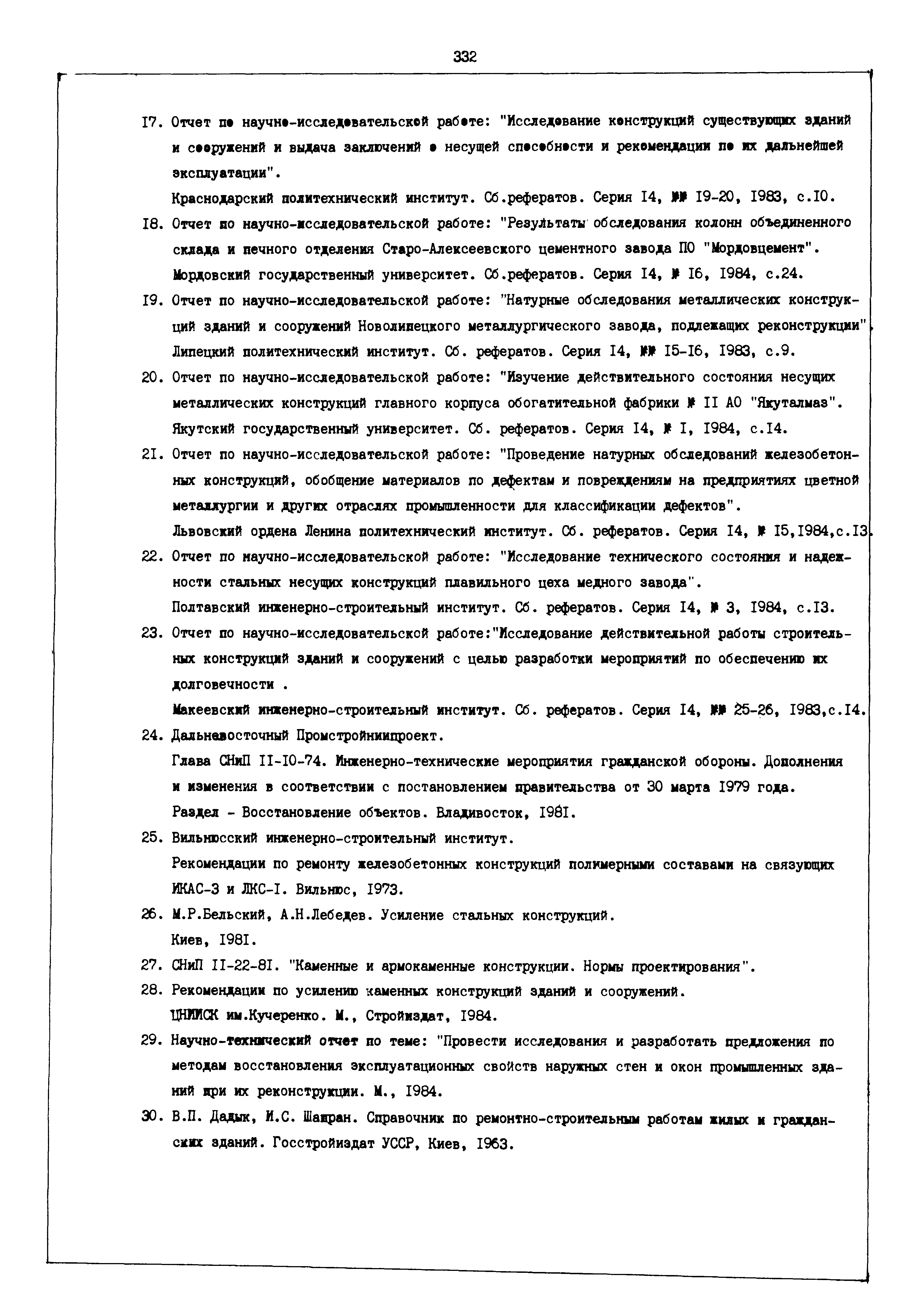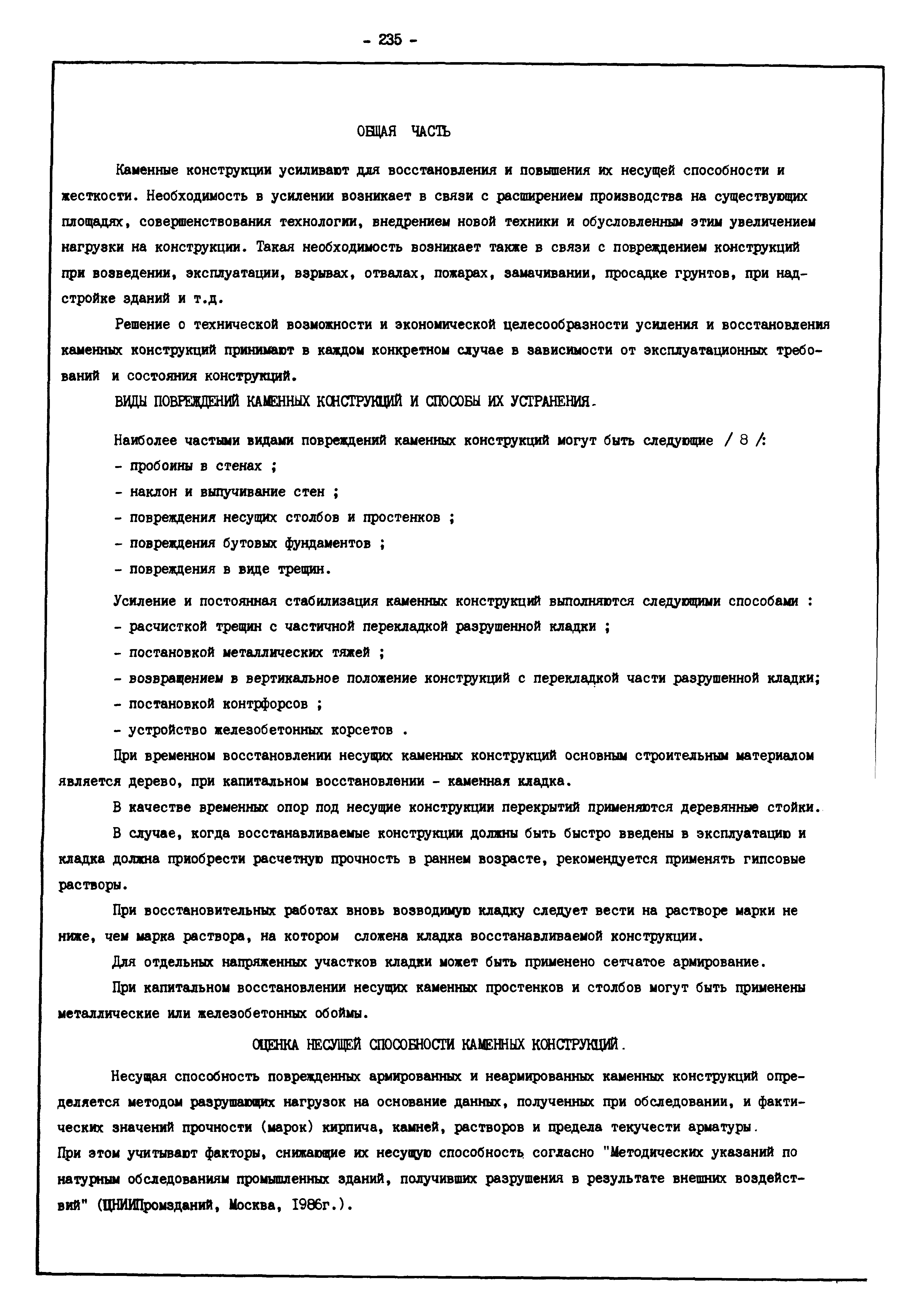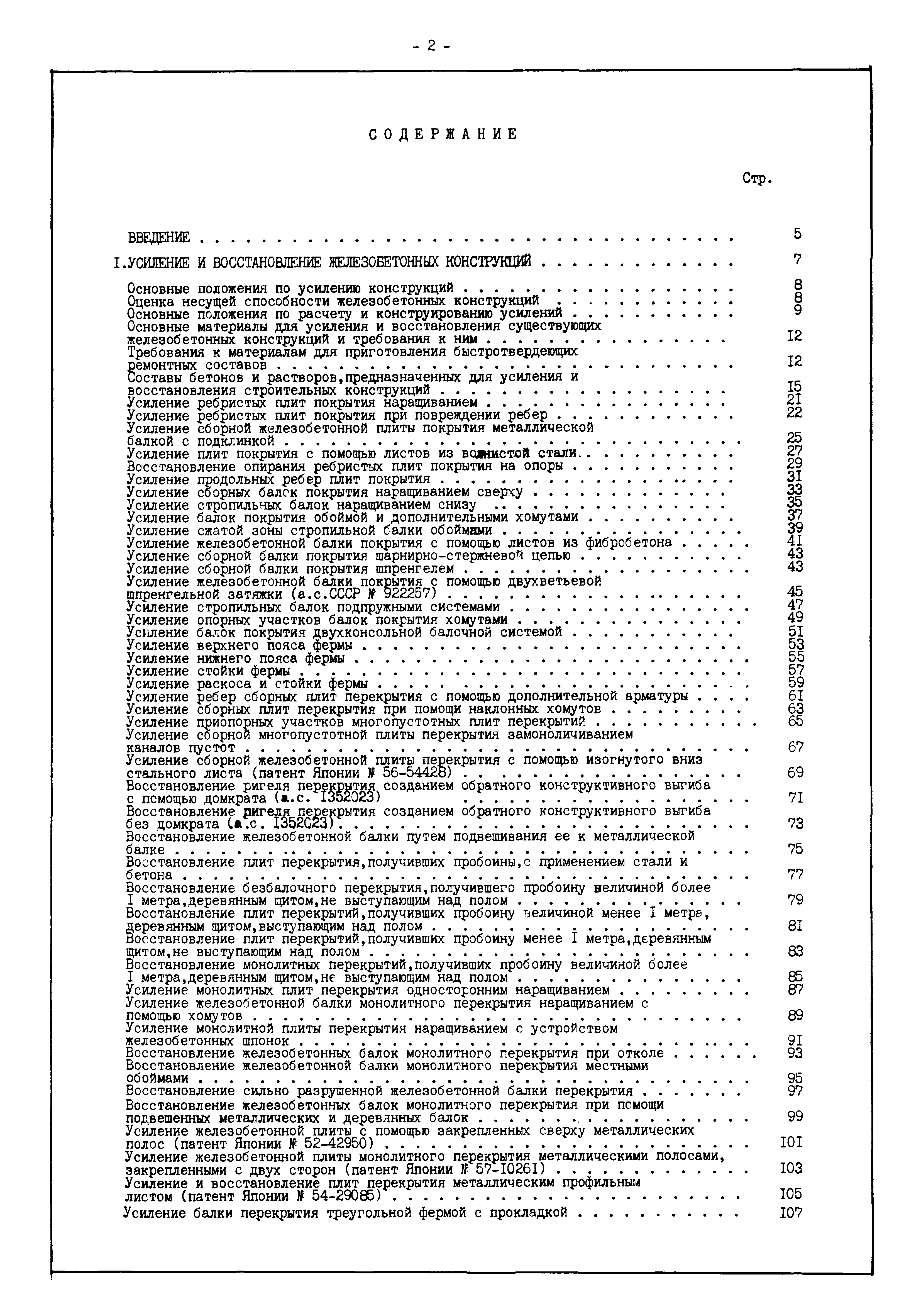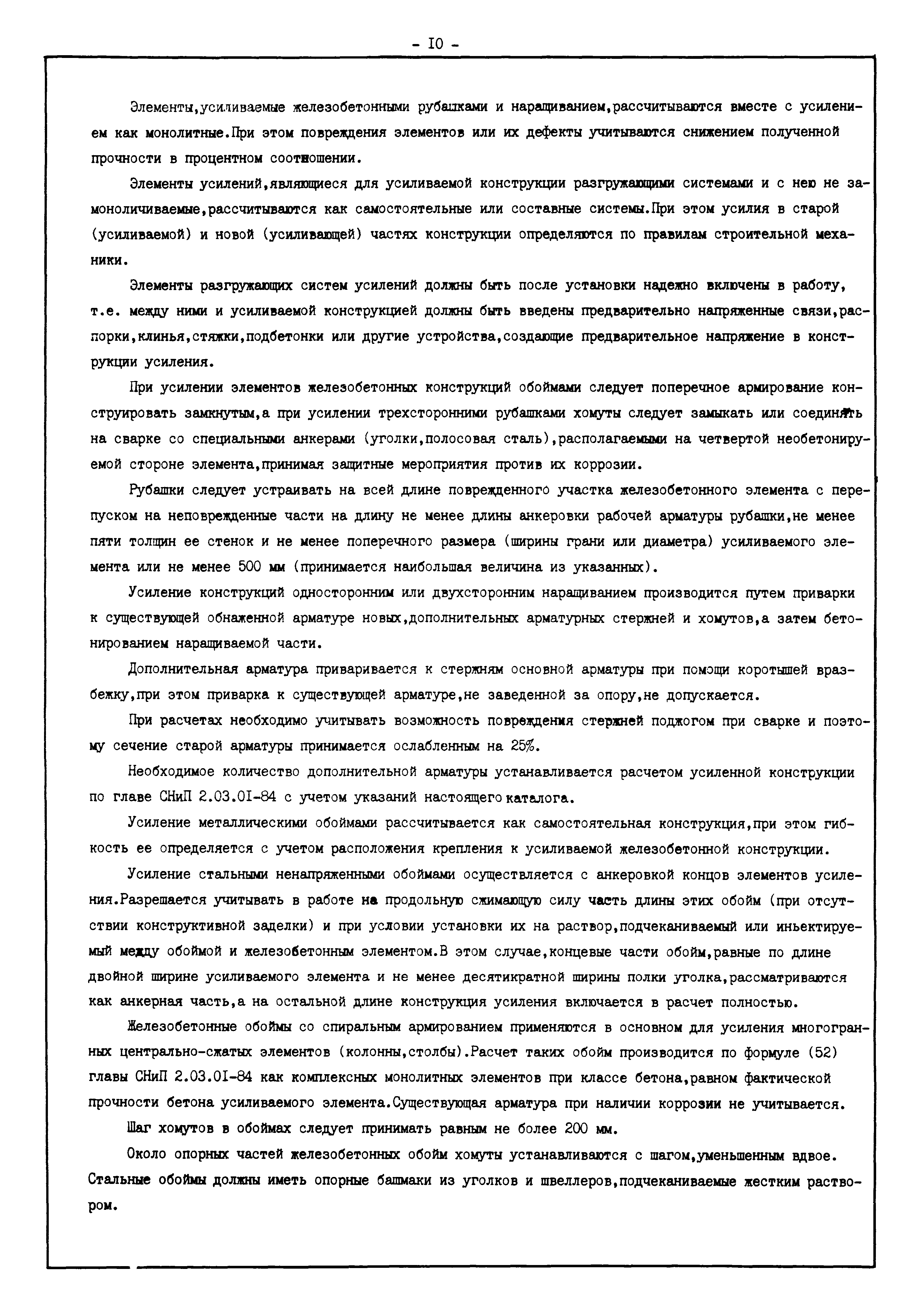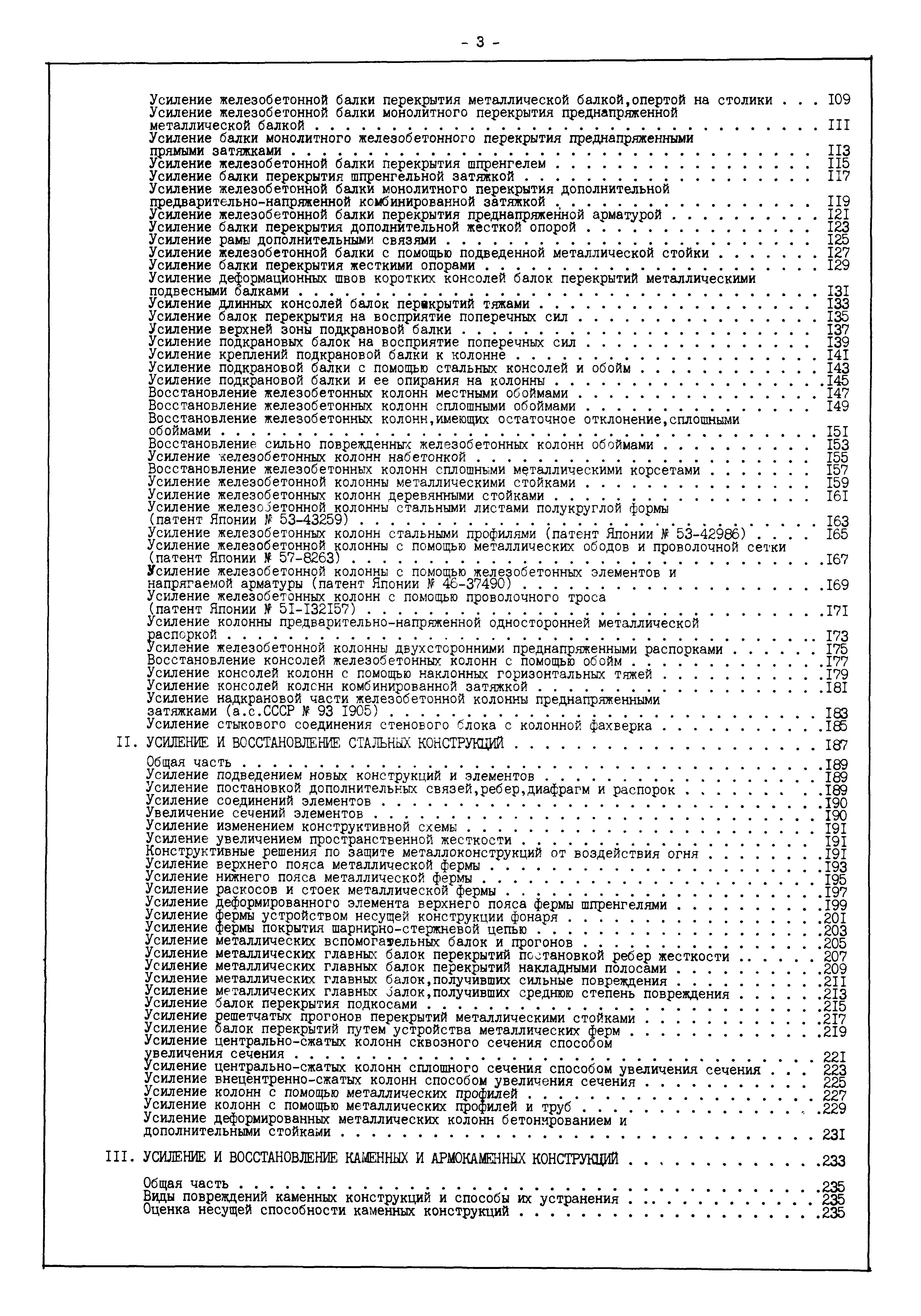 | Оглавление: | Введение I. Усиление и восстановление железобетонных конструкций Основные положения по усилению конструкций Оценка несущей способности железобетонных конструкций Основные положения по расчету и конструированию усилений Основные материалы для усиления и восстановления существующих железобетонных конструкций и требования к ним Требования к материалам для приготовления быстротвердеющих ремонтных составов Составы бетонов и растворов, предназначенных для усиления и восстановления строительных конструкций Усиление ребристых плит покрытия наращиванием Усиление ребристых плит покрытия при повреждении ребер Усиление сборной железобетонной плиты покрытия металлической балкой с подклинкой Усиление плит покрытия с помощью листов из волнистой стали Восстановление опирания ребристых плит покрытия на опоры Усиление продольных ребер плит покрытия Усиление сборных балок покрытия наращиванием сверху Усиление стропильных балок наращиванием снизу Усиление балок покрытия обоймой и дополнительными хомутами Усиление сжатой зоны стропильной балки обоймами Усиление железобетонной балки покрытия с помощью листов из фибробетона Усиление сборной балки покрытия шарнирно-стержневой цепью Усиление сборной балки покрытия шпренгелем Усиление железобетонной балки покрытия с помощью двухветьевой шпренгельной затяжки (а.с. СССР N 922257) Усиление стропильных балок подпружными системами Усиление опорных участков балок покрытия хомутами Усиление балок покрытия двухконсольной балочной системой Усиление верхнего пояса фермы Усиление нижнего пояса фермы Усиление стойки фермы Усиление раскоса и стойки фермы Усиление ребер сборных плит перекрытия с помощью дополнительной арматуры Усиление сборных плит перекрытия при помощи наклонных хомутов Усиление приопорных участков многопустотных плит перекрытий Усиление сборной многопустотной плиты перекрытия замоноличиванием каналов пустот Усиление сборной железобетонной плиты перекрытия с помощью изогнутого вниз стального листа (патент Японии N 56-54428) Восстановление ригеля перекрытия созданием обратного конструктивного выгиба с помощью домкрата (а.с. 1352023) Восстановление ригеля перекрытия созданием обратного конструктивного выгиба без домкрата (а.с. 1352023) Восстановление железобетонной балки путем подвешивания ее к металлической балке Восстановление плит перекрытия, получивших пробоины, с применением стали и бетона Восстановление безбалочного перекрытия, получившего пробоину величиной более 1 метра, деревянным щитом, не выступающим над полом Восстановление плит перекрытий, получивших пробоину величиной менее 1 метра, деревянным щитом, выступающим над полом Восстановление плит перекрытий, получивших пробоину менее 1 метра, деревянным щитом, не выступающим над полом Восстановление монолитных перекрытий, получивших пробоину величиной более 1 метра, деревянным щитом, не выступающим над полом Усиление монолитных плит перекрытия односторонним наращиванием Усиление железобетонной балки монолитного перекрытия наращиванием с помощью хомутов Усиление монолитной плиты перекрытия наращиванием с устройством железобетонных шпонок Восстановление железобетонных балок монолитного перекрытия при отколе Восстановление железбетонной балки монолитного перекрыти