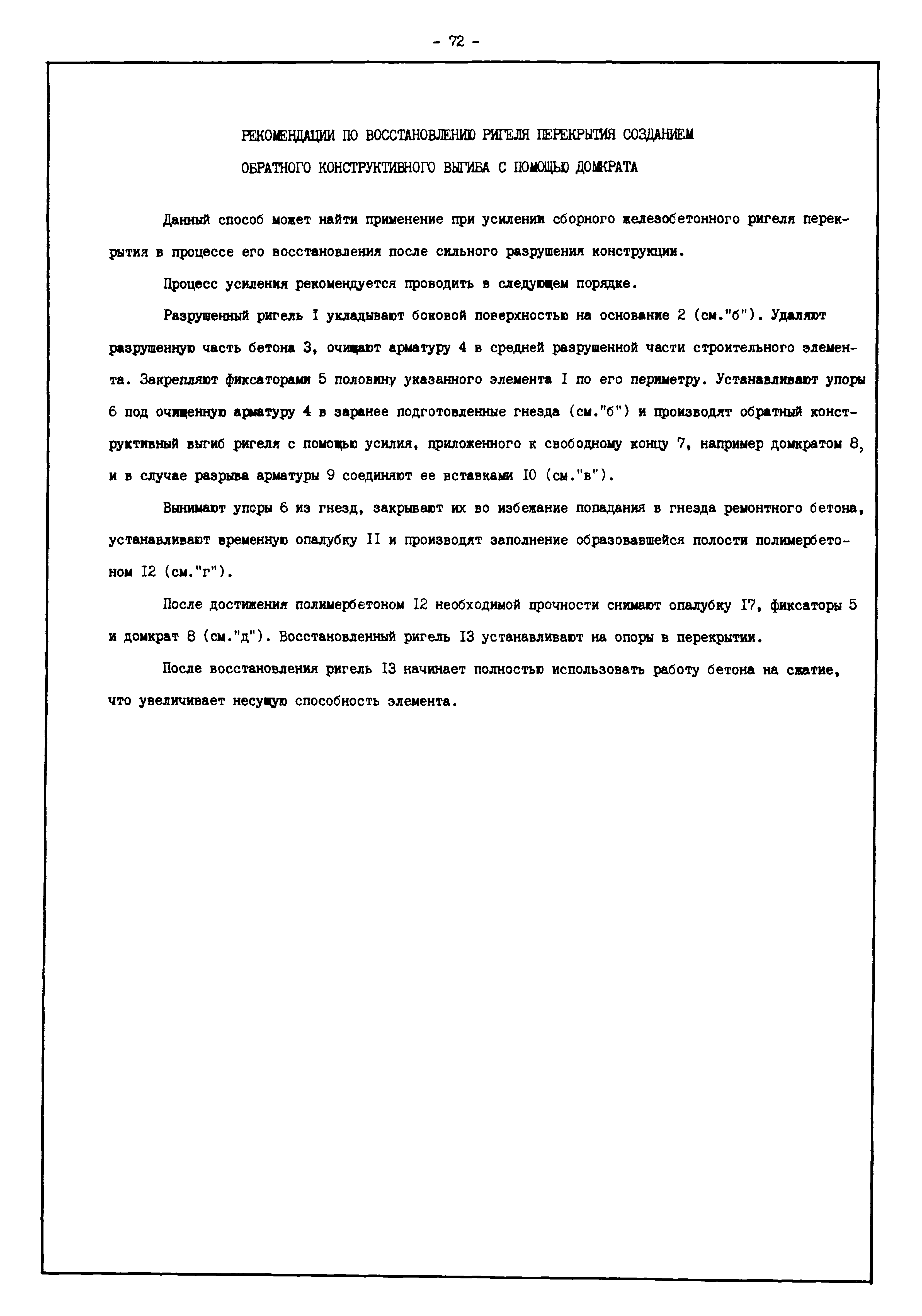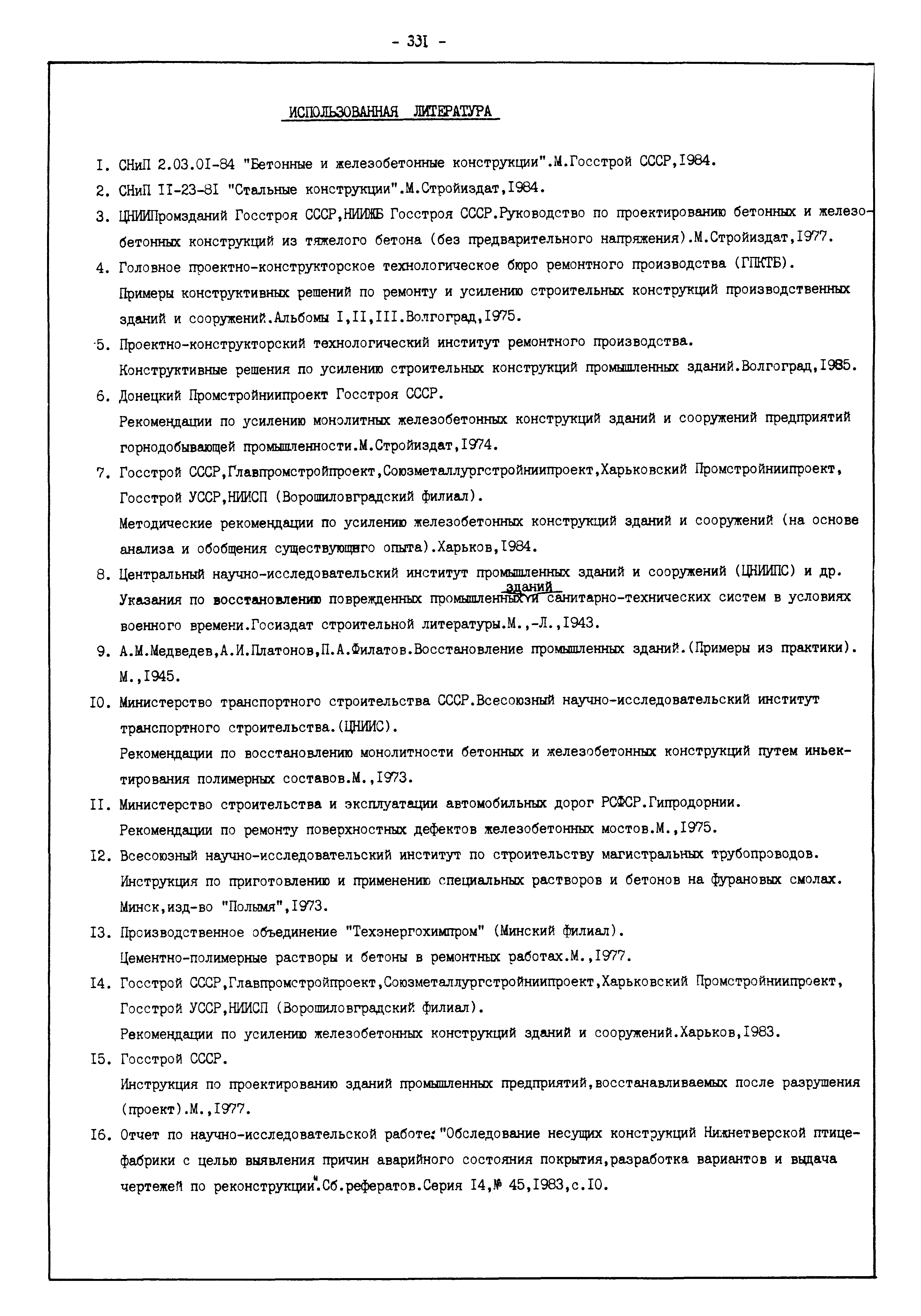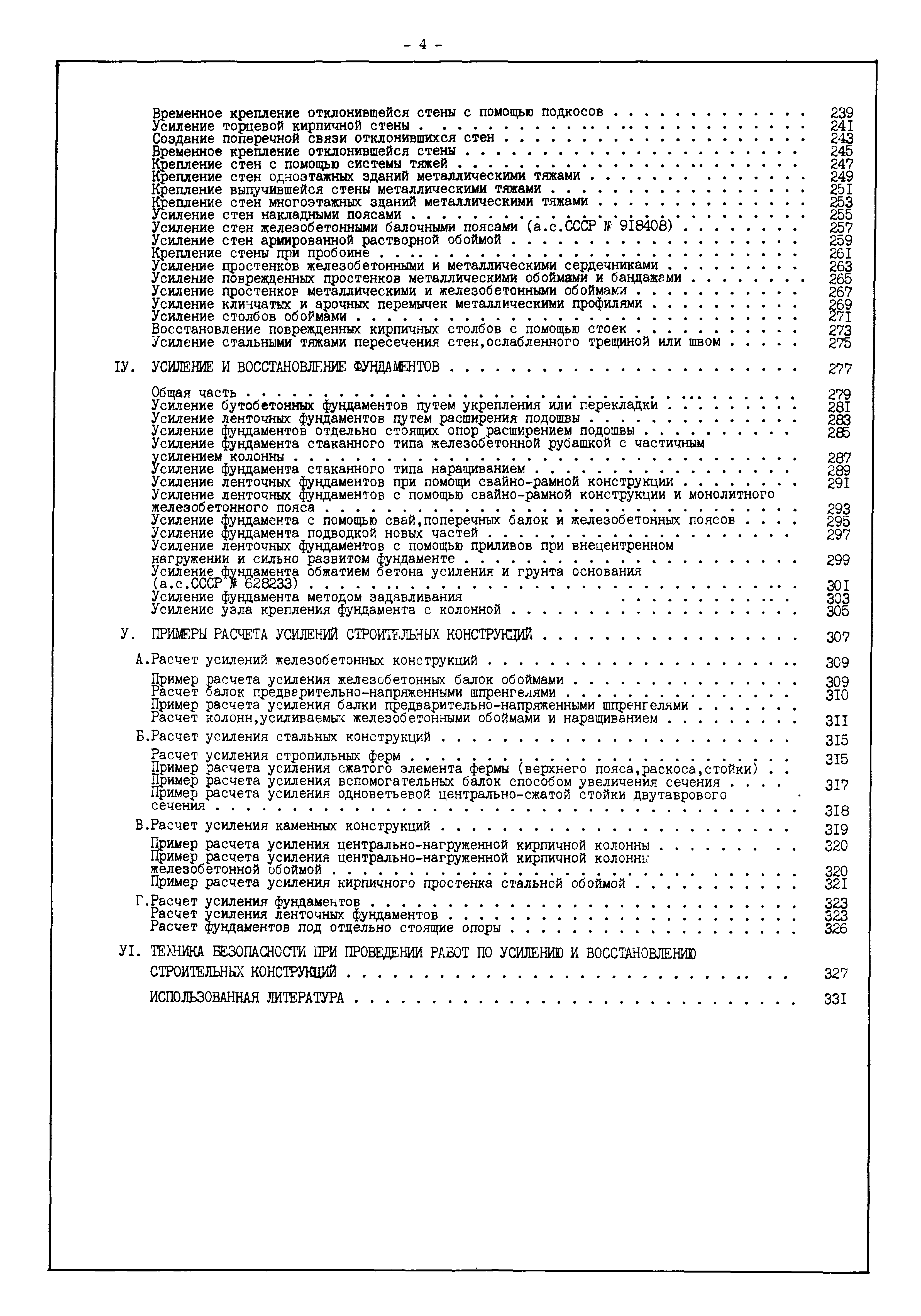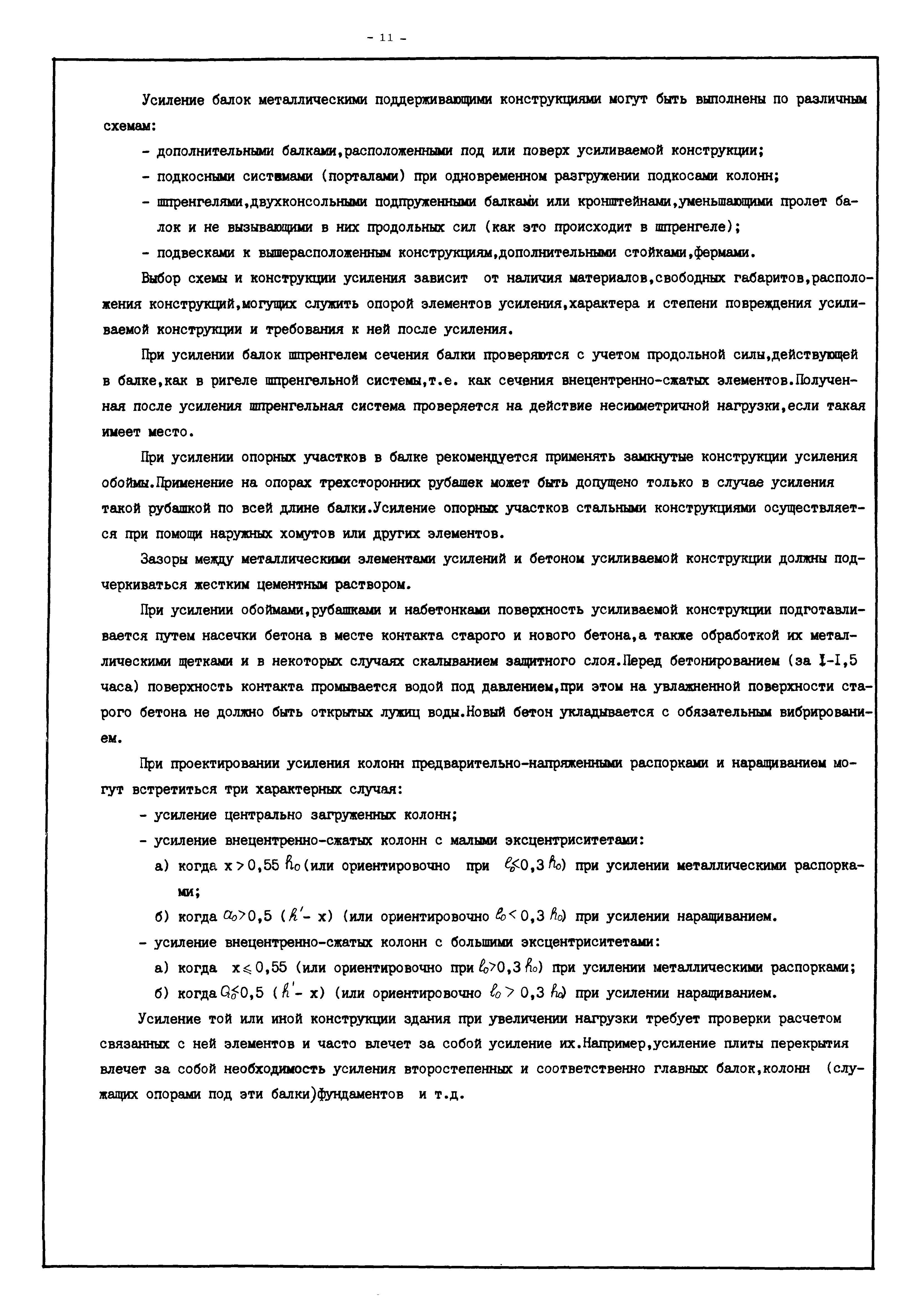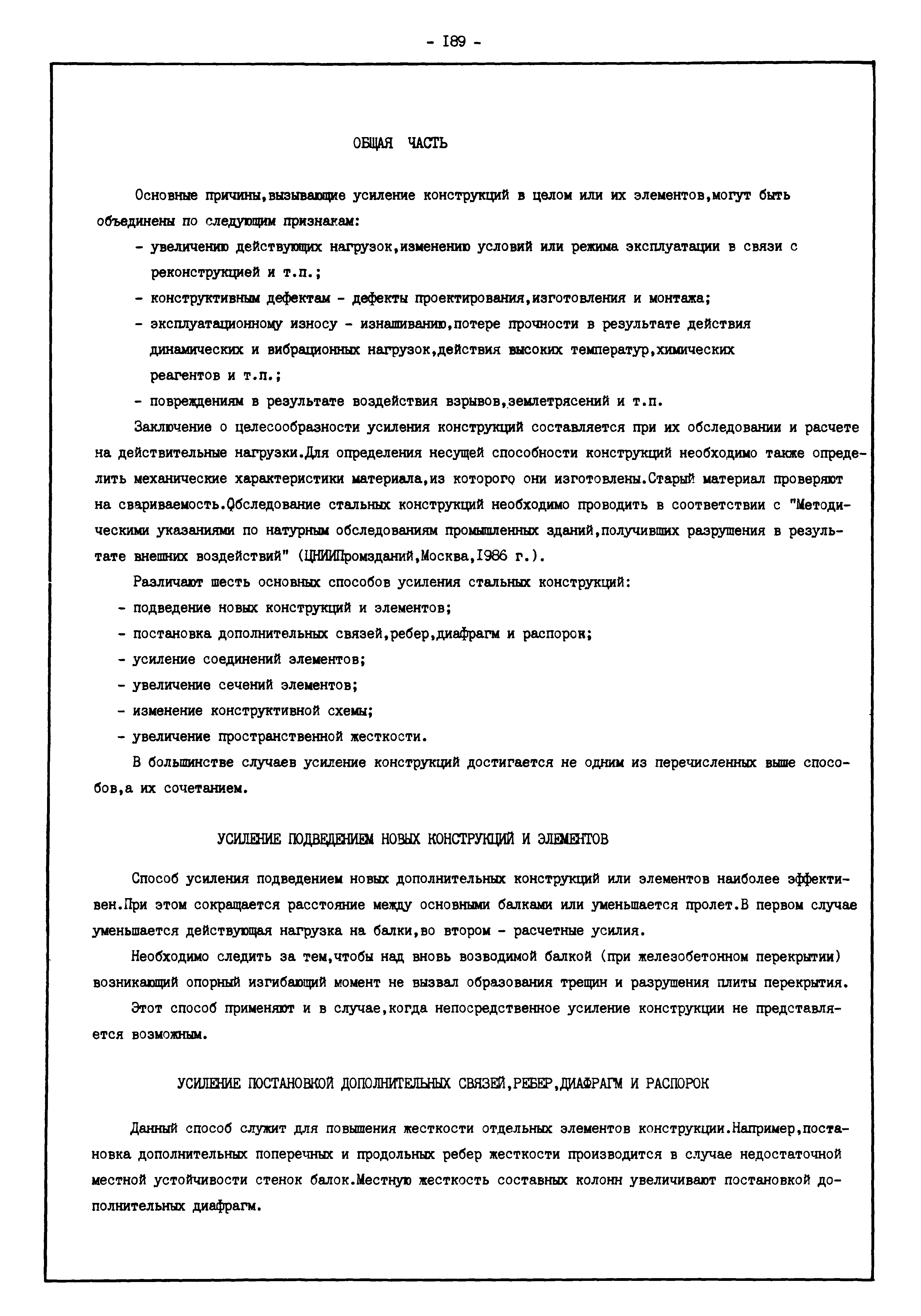 | Оглавление: | Введение I. Усиление и восстановление железобетонных конструкций Основные положения по усилению конструкций Оценка несущей способности железобетонных конструкций Основные положения по расчету и конструированию усилений Основные материалы для усиления и восстановления существующих железобетонных конструкций и требования к ним Требования к материалам для приготовления быстротвердеющих ремонтных составов Составы бетонов и растворов, предназначенных для усиления и восстановления строительных конструкций Усиление ребристых плит покрытия наращиванием Усиление ребристых плит покрытия при повреждении ребер Усиление сборной железобетонной плиты покрытия металлической балкой с подклинкой Усиление плит покрытия с помощью листов из волнистой стали Восстановление опирания ребристых плит покрытия на опоры Усиление продольных ребер плит покрытия Усиление сборных балок покрытия наращиванием сверху Усиление стропильных балок наращиванием снизу Усиление балок покрытия обоймой и дополнительными хомутами Усиление сжатой зоны стропильной балки обоймами Усиление железобетонной балки покрытия с помощью листов из фибробетона Усиление сборной балки покрытия шарнирно-стержневой цепью Усиление сборной балки покрытия шпренгелем Усиление железобетонной балки покрытия с помощью двухветьевой шпренгельной затяжки (а.с. СССР N 922257) Усиление стропильных балок подпружными системами Усиление опорных участков балок покрытия хомутами Усиление балок покрытия двухконсольной балочной системой Усиление верхнего пояса фермы Усиление нижнего пояса фермы Усиление стойки фермы Усиление раскоса и стойки фермы Усиление ребер сборных плит перекрытия с помощью дополнительной арматуры Усиление сборных плит перекрытия при помощи наклонных хомутов Усиление приопорных участков многопустотных плит перекрытий Усиление сборной многопустотной плиты перекрытия замоноличиванием каналов пустот Усиление сборной железобетонной плиты перекрытия с помощью изогнутого вниз стального листа (патент Японии N 56-54428) Восстановление ригеля перекрытия созданием обратного конструктивного выгиба с помощью домкрата (а.с. 1352023) Восстановление ригеля перекрытия созданием обратного конструктивного выгиба без домкрата (а.с. 1352023) Восстановление железобетонной балки путем подвешивания ее к металлической балке Восстановление плит перекрытия, получивших пробоины, с применением стали и бетона Восстановление безбалочного перекрытия, получившего пробоину величиной более 1 метра, деревянным щитом, не выступающим над полом Восстановление плит перекрытий, получивших пробоину величиной менее 1 метра, деревянным щитом, выступающим над полом Восстановление плит перекрытий, получивших пробоину менее 1 метра, деревянным щитом, не выступающим над полом Восстановление монолитных перекрытий, получивших пробоину величиной более 1 метра, деревянным щитом, не выступающим над полом Усиление монолитных плит перекрытия односторонним наращиванием Усиление железобетонной балки монолитного перекрытия наращиванием с помощью хомутов Усиление монолитной плиты перекрытия наращиванием с устройством железобетонных шпонок Восстановление железобетонных балок монолитного перекрытия при отколе Восстановление железбетонной балки монолитного перекрыти