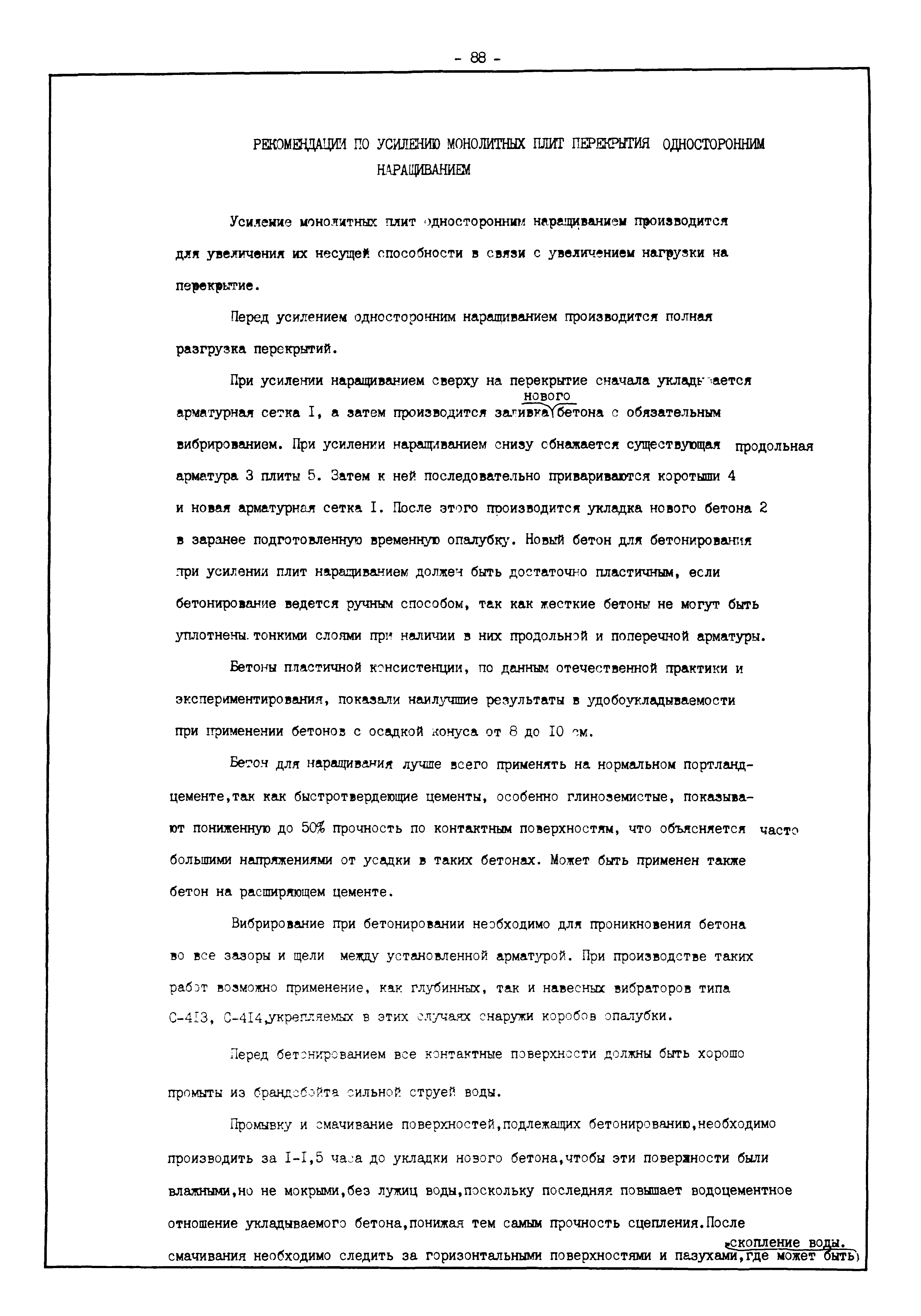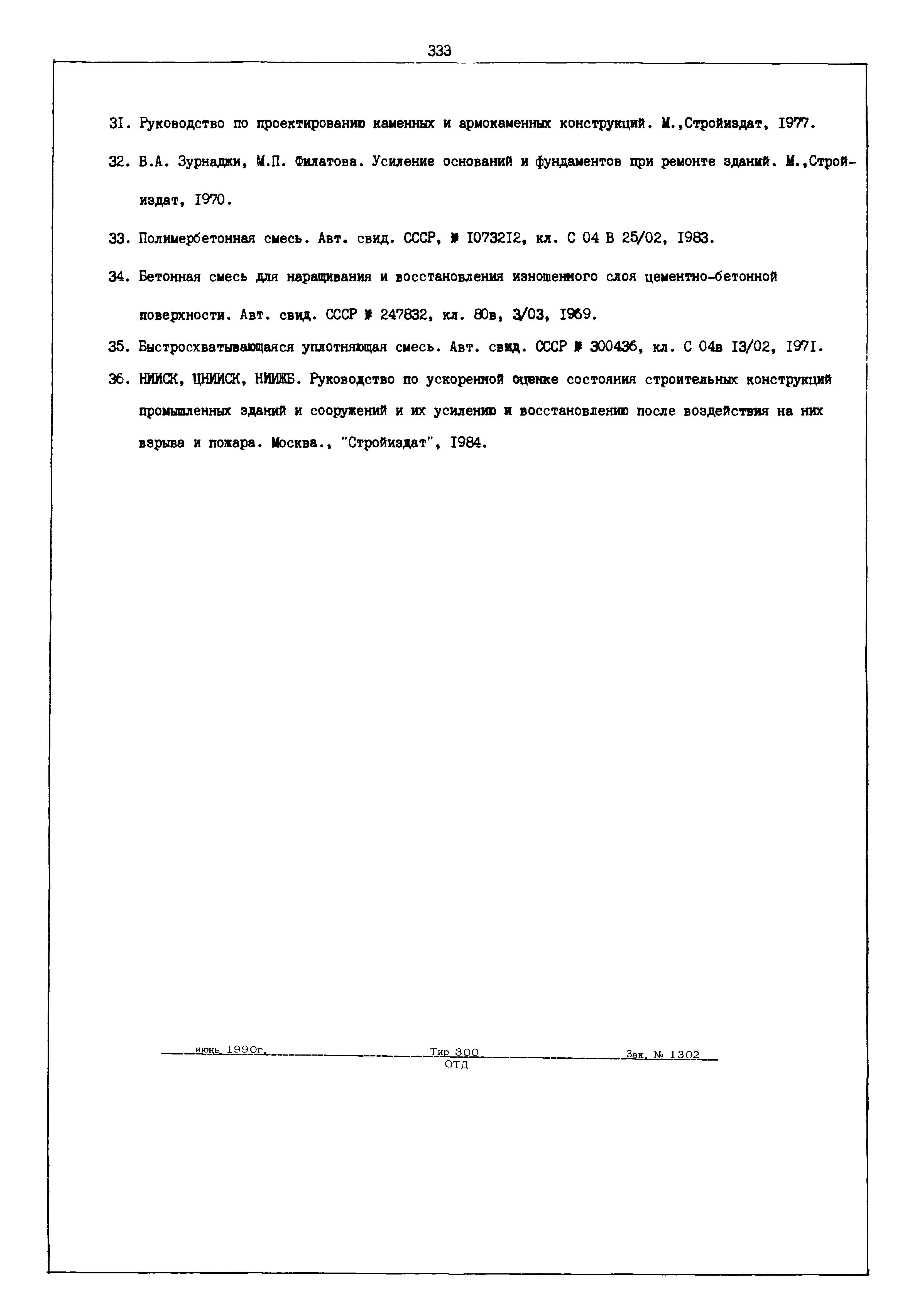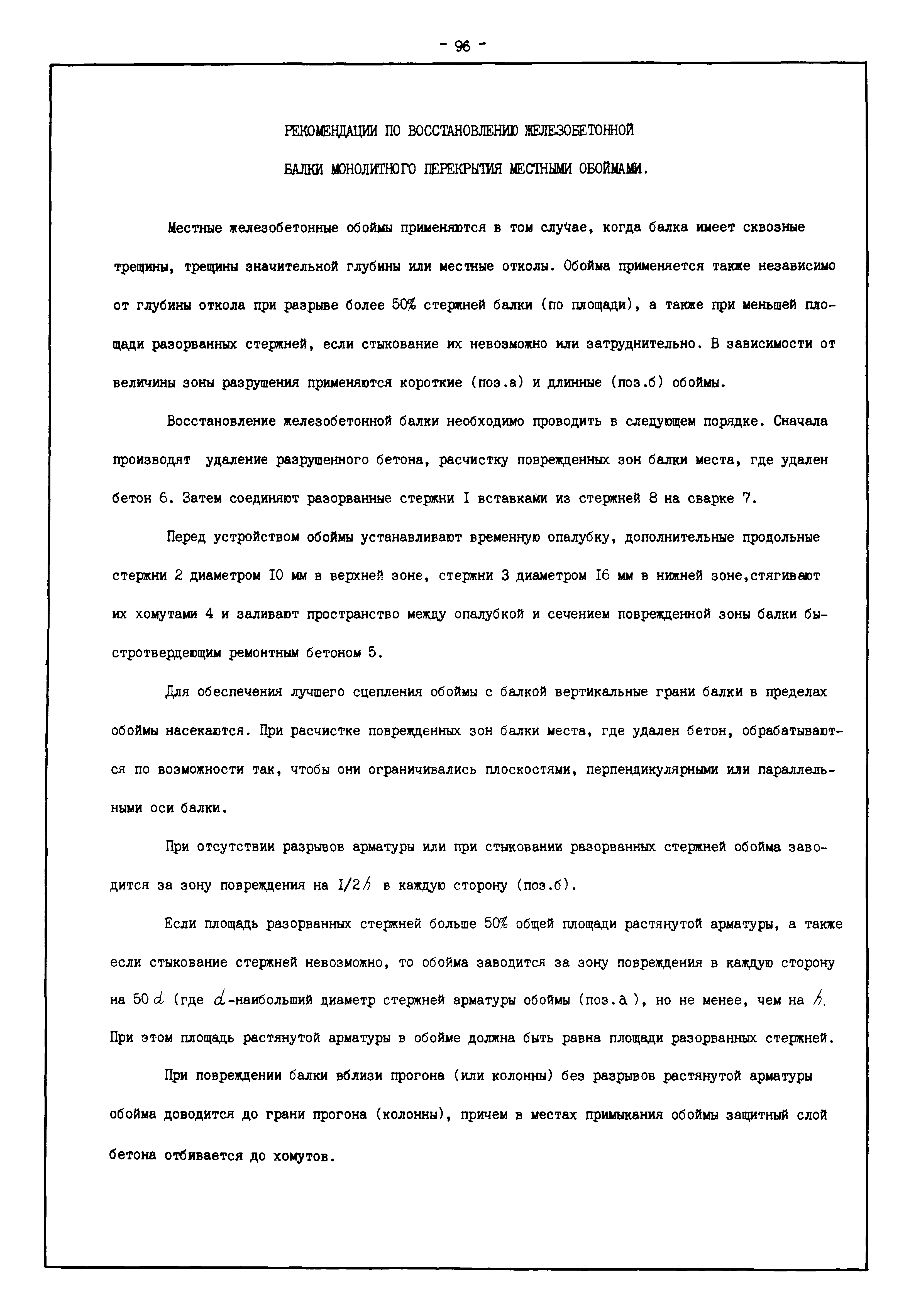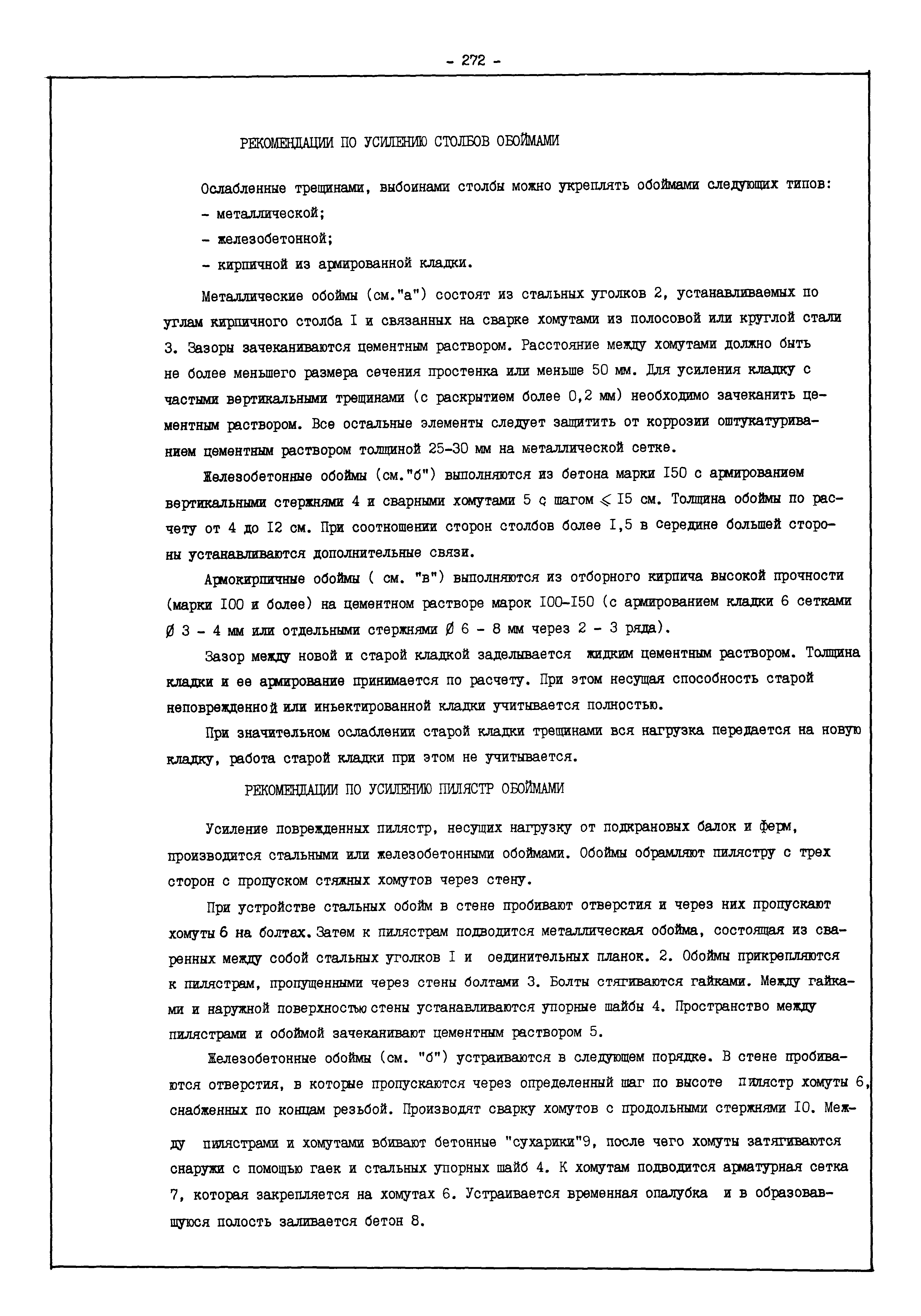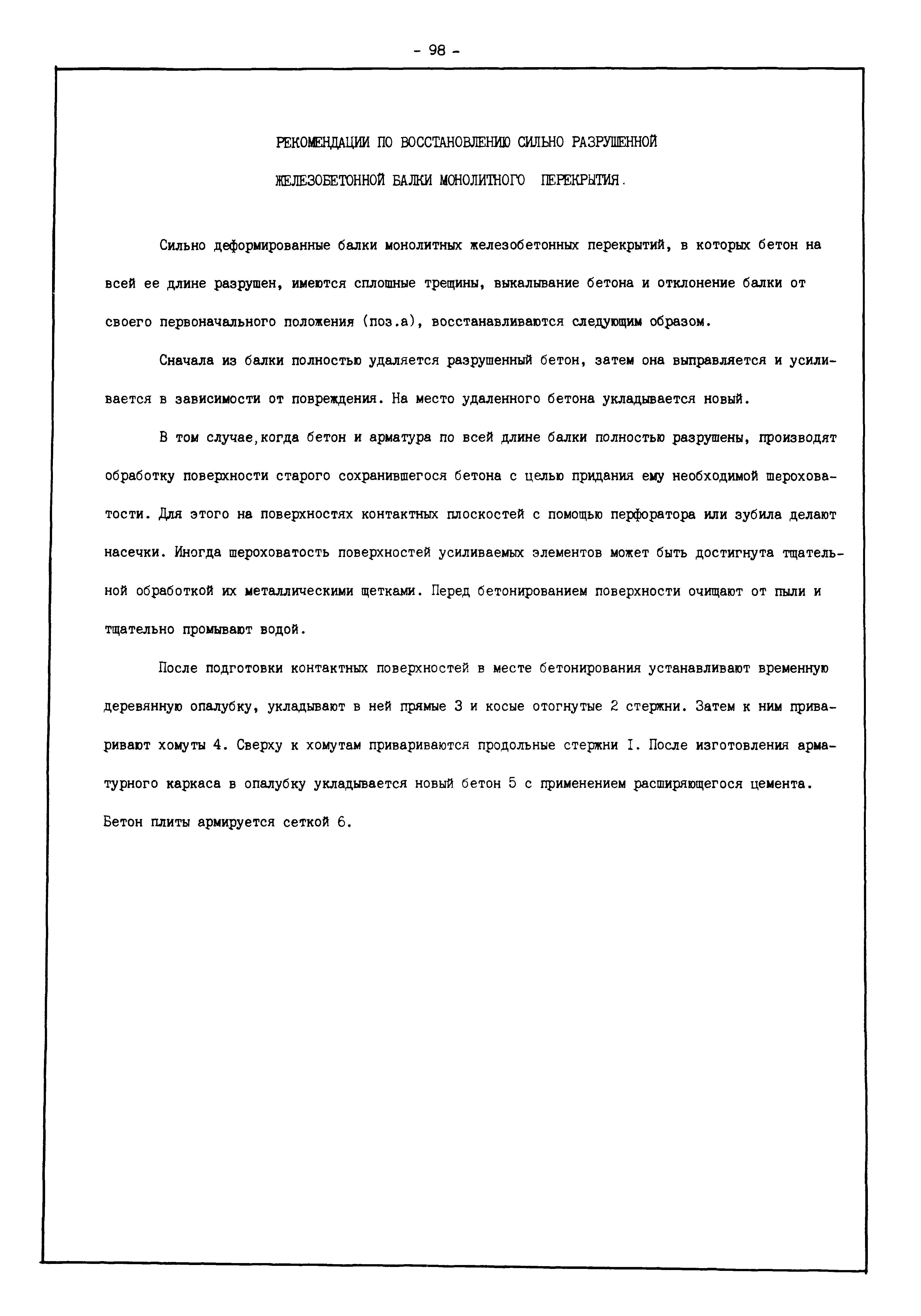 | Оглавление: | Введение I. Усиление и восстановление железобетонных конструкций Основные положения по усилению конструкций Оценка несущей способности железобетонных конструкций Основные положения по расчету и конструированию усилений Основные материалы для усиления и восстановления существующих железобетонных конструкций и требования к ним Требования к материалам для приготовления быстротвердеющих ремонтных составов Составы бетонов и растворов, предназначенных для усиления и восстановления строительных конструкций Усиление ребристых плит покрытия наращиванием Усиление ребристых плит покрытия при повреждении ребер Усиление сборной железобетонной плиты покрытия металлической балкой с подклинкой Усиление плит покрытия с помощью листов из волнистой стали Восстановление опирания ребристых плит покрытия на опоры Усиление продольных ребер плит покрытия Усиление сборных балок покрытия наращиванием сверху Усиление стропильных балок наращиванием снизу Усиление балок покрытия обоймой и дополнительными хомутами Усиление сжатой зоны стропильной балки обоймами Усиление железобетонной балки покрытия с помощью листов из фибробетона Усиление сборной балки покрытия шарнирно-стержневой цепью Усиление сборной балки покрытия шпренгелем Усиление железобетонной балки покрытия с помощью двухветьевой шпренгельной затяжки (а.с. СССР N 922257) Усиление стропильных балок подпружными системами Усиление опорных участков балок покрытия хомутами Усиление балок покрытия двухконсольной балочной системой Усиление верхнего пояса фермы Усиление нижнего пояса фермы Усиление стойки фермы Усиление раскоса и стойки фермы Усиление ребер сборных плит перекрытия с помощью дополнительной арматуры Усиление сборных плит перекрытия при помощи наклонных хомутов Усиление приопорных участков многопустотных плит перекрытий Усиление сборной многопустотной плиты перекрытия замоноличиванием каналов пустот Усиление сборной железобетонной плиты перекрытия с помощью изогнутого вниз стального листа (патент Японии N 56-54428) Восстановление ригеля перекрытия созданием обратного конструктивного выгиба с помощью домкрата (а.с. 1352023) Восстановление ригеля перекрытия созданием обратного конструктивного выгиба без домкрата (а.с. 1352023) Восстановление железобетонной балки путем подвешивания ее к металлической балке Восстановление плит перекрытия, получивших пробоины, с применением стали и бетона Восстановление безбалочного перекрытия, получившего пробоину величиной более 1 метра, деревянным щитом, не выступающим над полом Восстановление плит перекрытий, получивших пробоину величиной менее 1 метра, деревянным щитом, выступающим над полом Восстановление плит перекрытий, получивших пробоину менее 1 метра, деревянным щитом, не выступающим над полом Восстановление монолитных перекрытий, получивших пробоину величиной более 1 метра, деревянным щитом, не выступающим над полом Усиление монолитных плит перекрытия односторонним наращиванием Усиление железобетонной балки монолитного перекрытия наращиванием с помощью хомутов Усиление монолитной плиты перекрытия наращиванием с устройством железобетонных шпонок Восстановление железобетонных балок монолитного перекрытия при отколе Восстановление железбетонной балки монолитного перекрыти