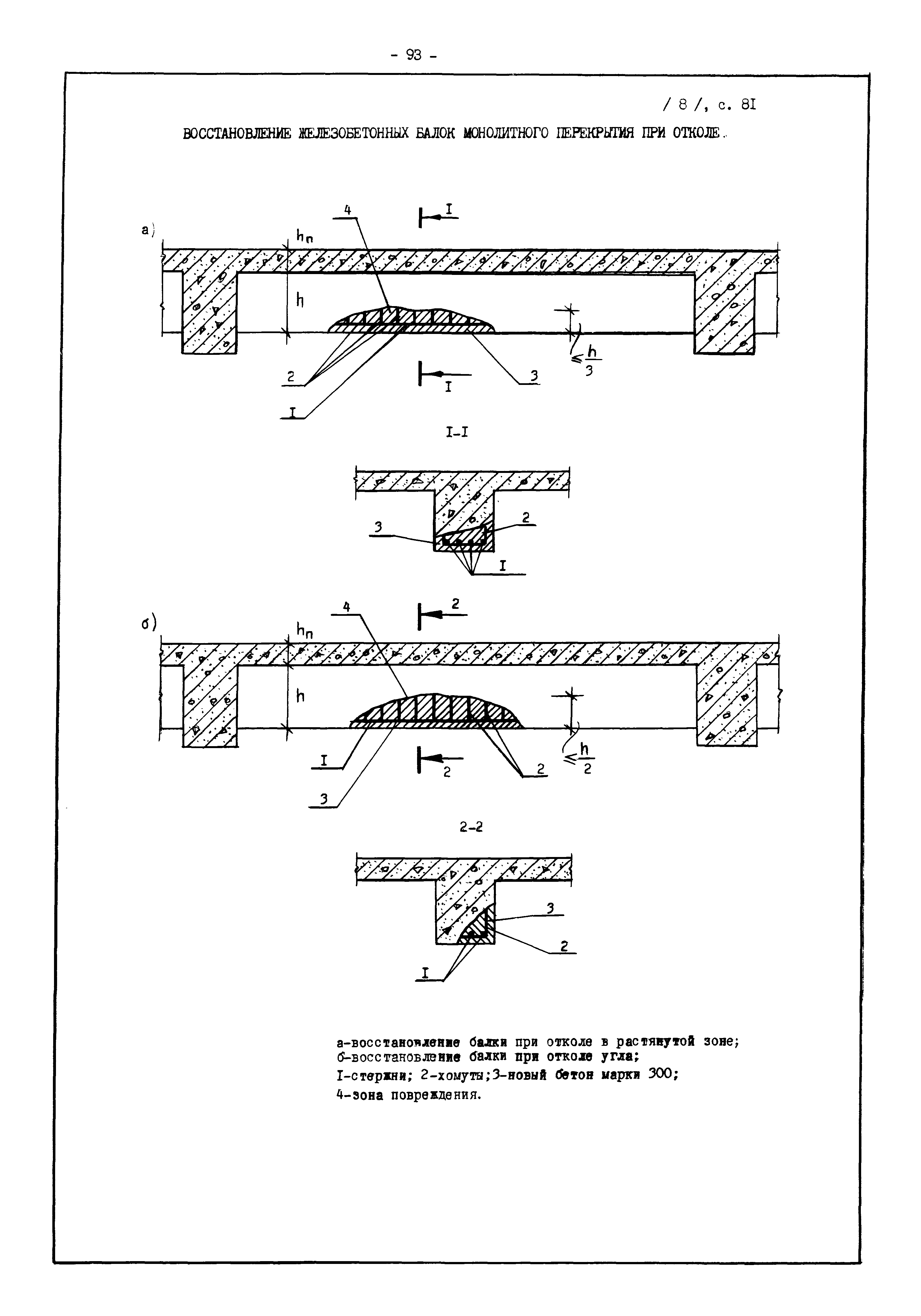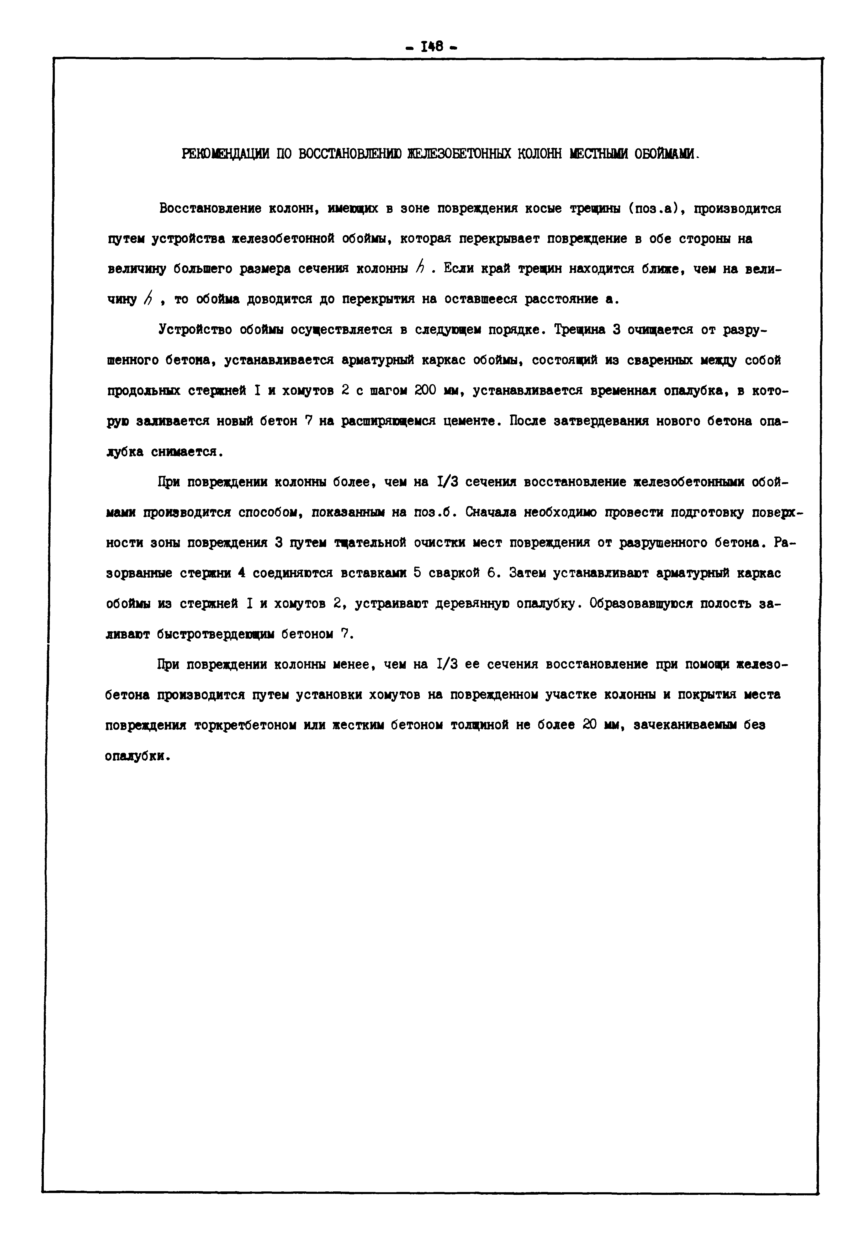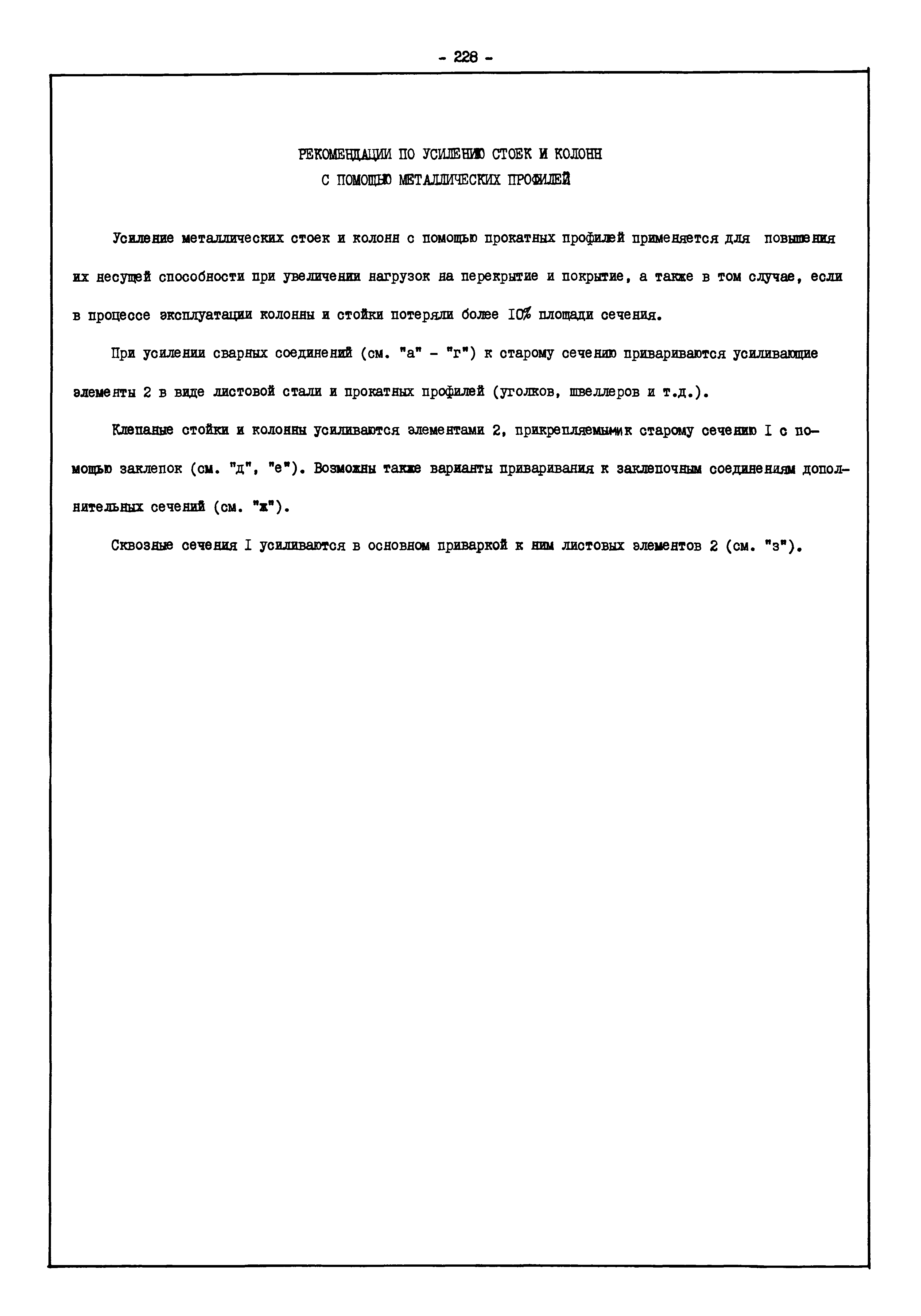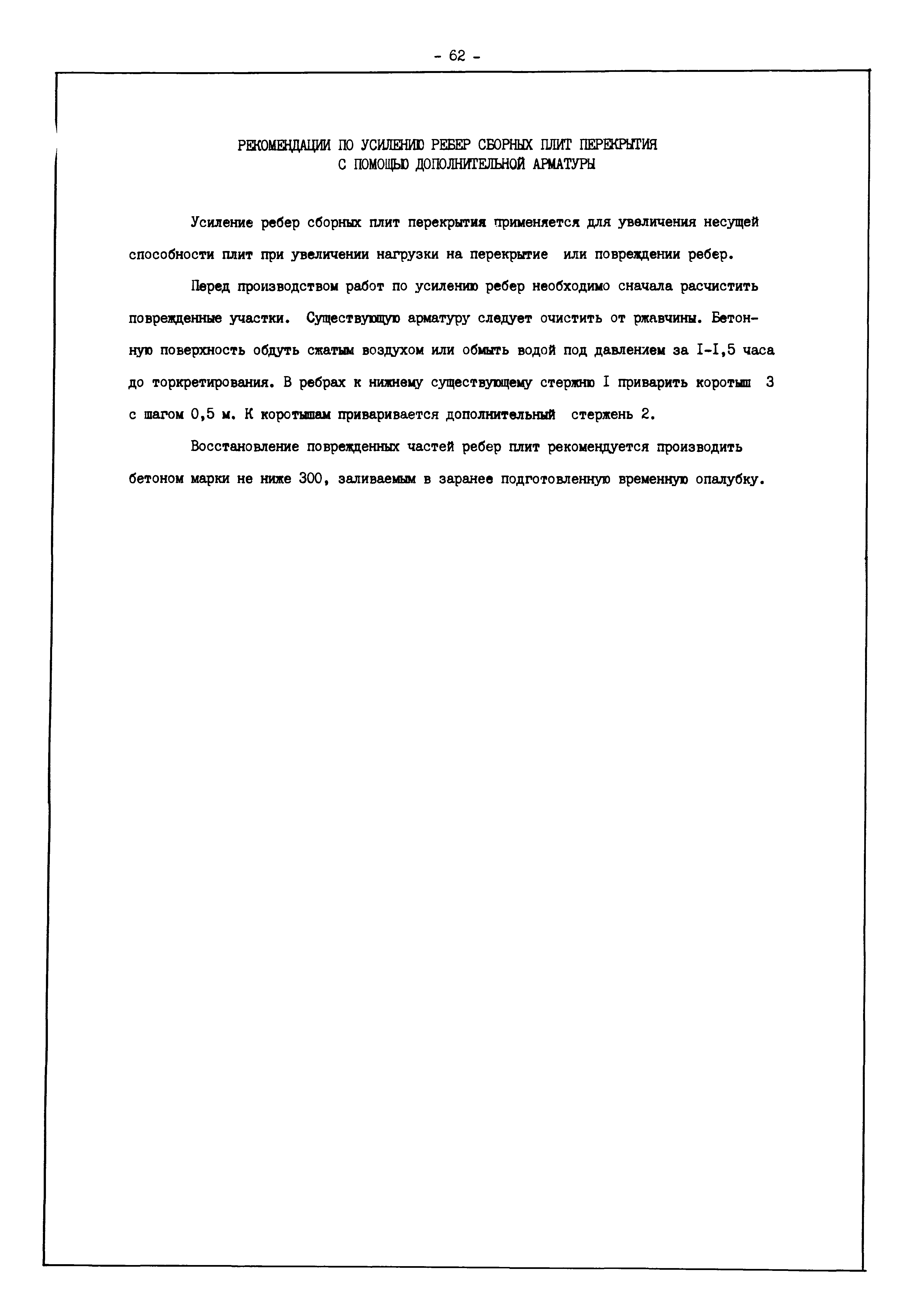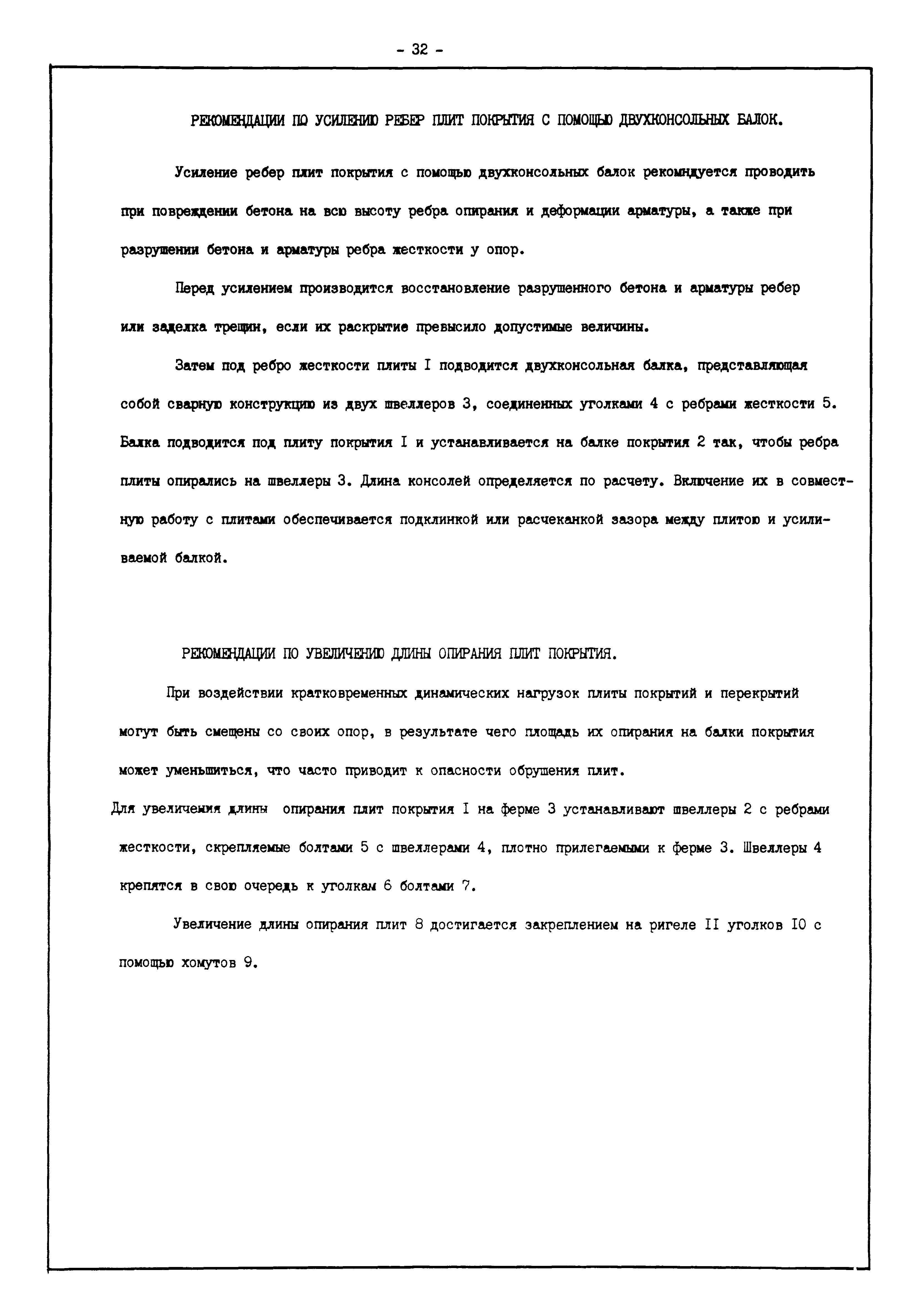 | Оглавление: | Введение I. Усиление и восстановление железобетонных конструкций Основные положения по усилению конструкций Оценка несущей способности железобетонных конструкций Основные положения по расчету и конструированию усилений Основные материалы для усиления и восстановления существующих железобетонных конструкций и требования к ним Требования к материалам для приготовления быстротвердеющих ремонтных составов Составы бетонов и растворов, предназначенных для усиления и восстановления строительных конструкций Усиление ребристых плит покрытия наращиванием Усиление ребристых плит покрытия при повреждении ребер Усиление сборной железобетонной плиты покрытия металлической балкой с подклинкой Усиление плит покрытия с помощью листов из волнистой стали Восстановление опирания ребристых плит покрытия на опоры Усиление продольных ребер плит покрытия Усиление сборных балок покрытия наращиванием сверху Усиление стропильных балок наращиванием снизу Усиление балок покрытия обоймой и дополнительными хомутами Усиление сжатой зоны стропильной балки обоймами Усиление железобетонной балки покрытия с помощью листов из фибробетона Усиление сборной балки покрытия шарнирно-стержневой цепью Усиление сборной балки покрытия шпренгелем Усиление железобетонной балки покрытия с помощью двухветьевой шпренгельной затяжки (а.с. СССР N 922257) Усиление стропильных балок подпружными системами Усиление опорных участков балок покрытия хомутами Усиление балок покрытия двухконсольной балочной системой Усиление верхнего пояса фермы Усиление нижнего пояса фермы Усиление стойки фермы Усиление раскоса и стойки фермы Усиление ребер сборных плит перекрытия с помощью дополнительной арматуры Усиление сборных плит перекрытия при помощи наклонных хомутов Усиление приопорных участков многопустотных плит перекрытий Усиление сборной многопустотной плиты перекрытия замоноличиванием каналов пустот Усиление сборной железобетонной плиты перекрытия с помощью изогнутого вниз стального листа (патент Японии N 56-54428) Восстановление ригеля перекрытия созданием обратного конструктивного выгиба с помощью домкрата (а.с. 1352023) Восстановление ригеля перекрытия созданием обратного конструктивного выгиба без домкрата (а.с. 1352023) Восстановление железобетонной балки путем подвешивания ее к металлической балке Восстановление плит перекрытия, получивших пробоины, с применением стали и бетона Восстановление безбалочного перекрытия, получившего пробоину величиной более 1 метра, деревянным щитом, не выступающим над полом Восстановление плит перекрытий, получивших пробоину величиной менее 1 метра, деревянным щитом, выступающим над полом Восстановление плит перекрытий, получивших пробоину менее 1 метра, деревянным щитом, не выступающим над полом Восстановление монолитных перекрытий, получивших пробоину величиной более 1 метра, деревянным щитом, не выступающим над полом Усиление монолитных плит перекрытия односторонним наращиванием Усиление железобетонной балки монолитного перекрытия наращиванием с помощью хомутов Усиление монолитной плиты перекрытия наращиванием с устройством железобетонных шпонок Восстановление железобетонных балок монолитного перекрытия при отколе Восстановление железбетонной балки монолитного перекрыти